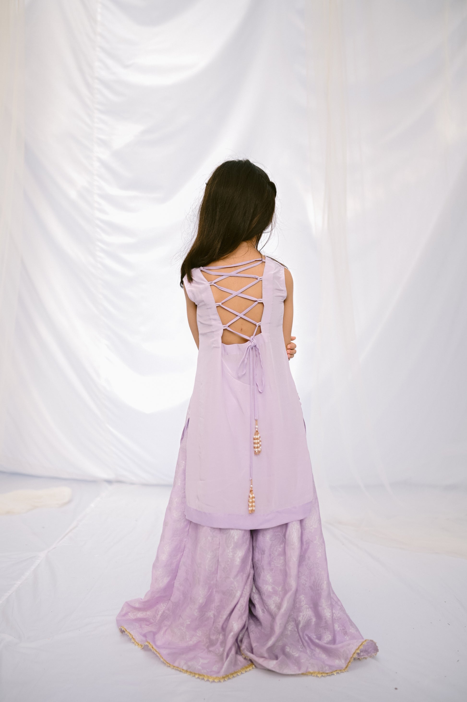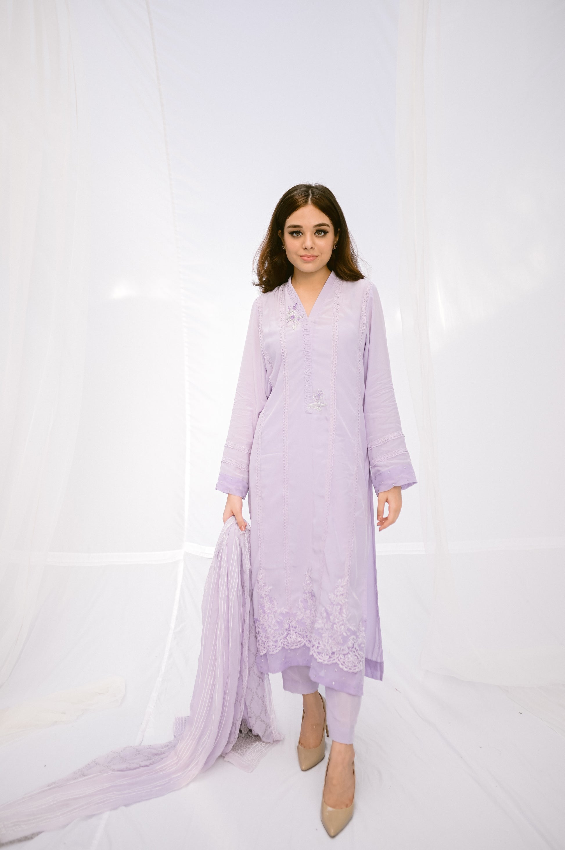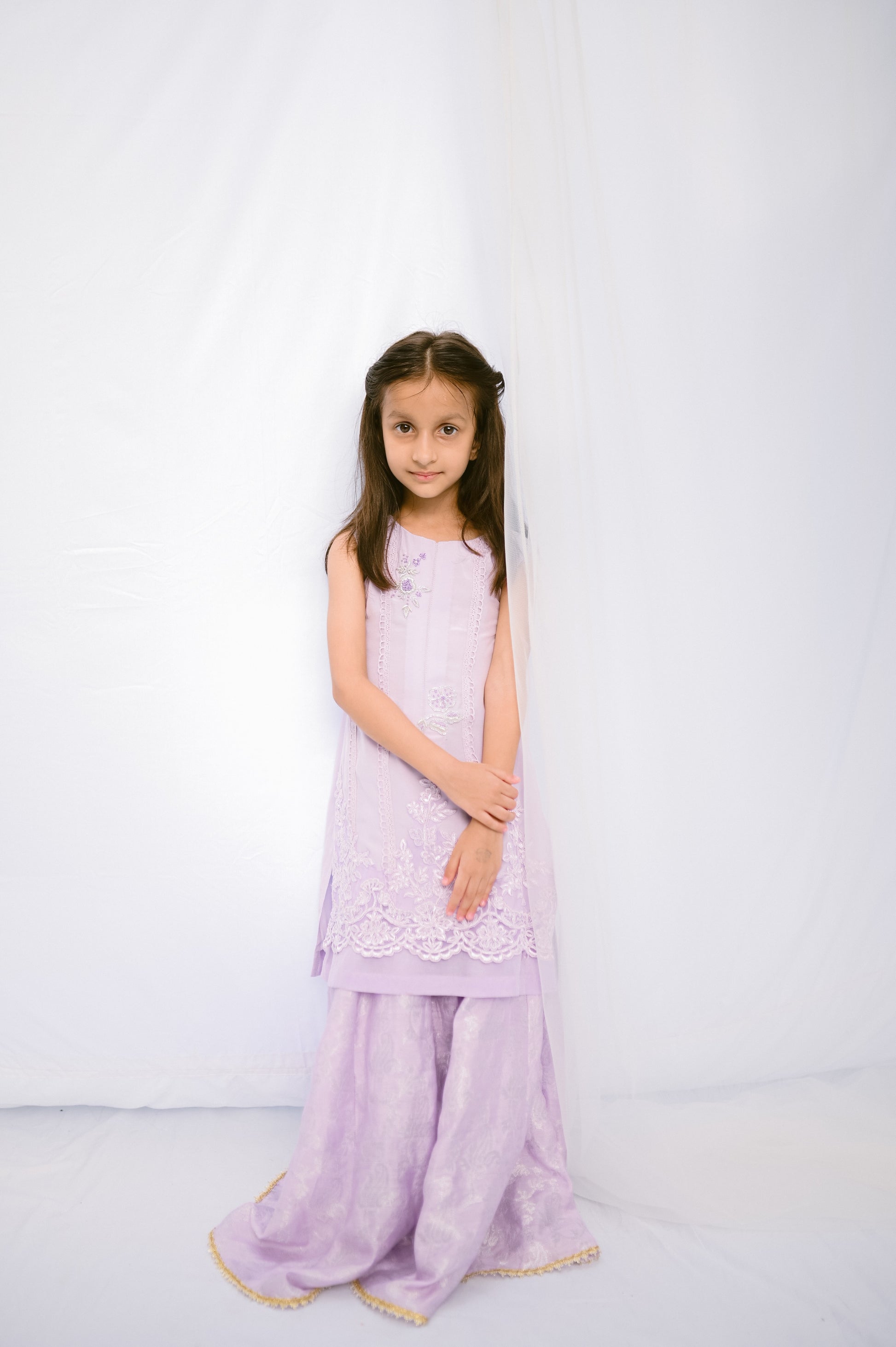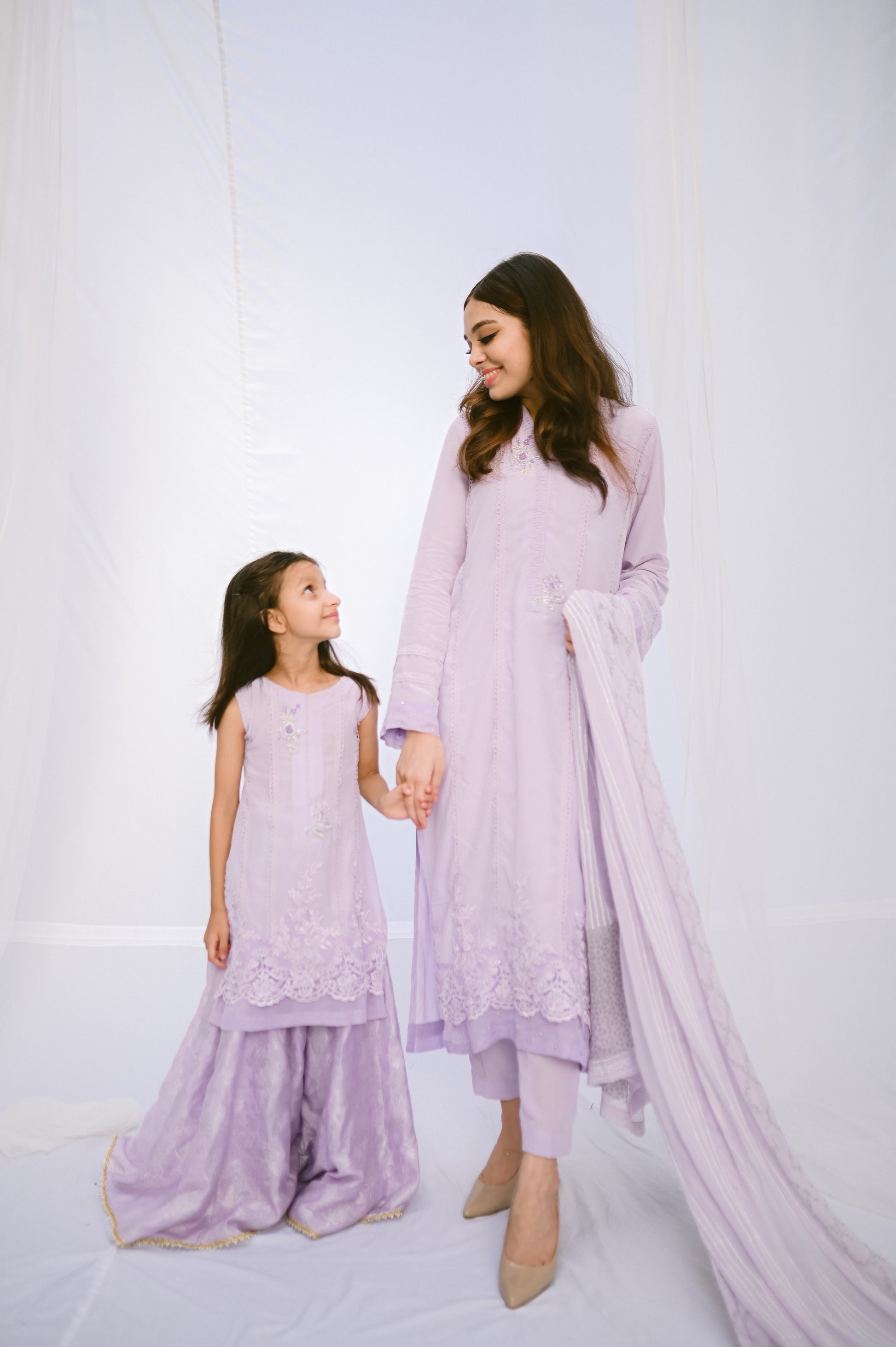 Add a touch of elegance to your wardrobe with our lilac crepe gorgette long shirt embellished with intricate laces and hand embroidered motifs on the neckline. Paired with a stunning block printed dupatta, this outfit is perfect for any occasion. Don't forget to check out our matching mother-daughter set featuring a beautiful cotton net front open flair with separate inner and pants for your little one!