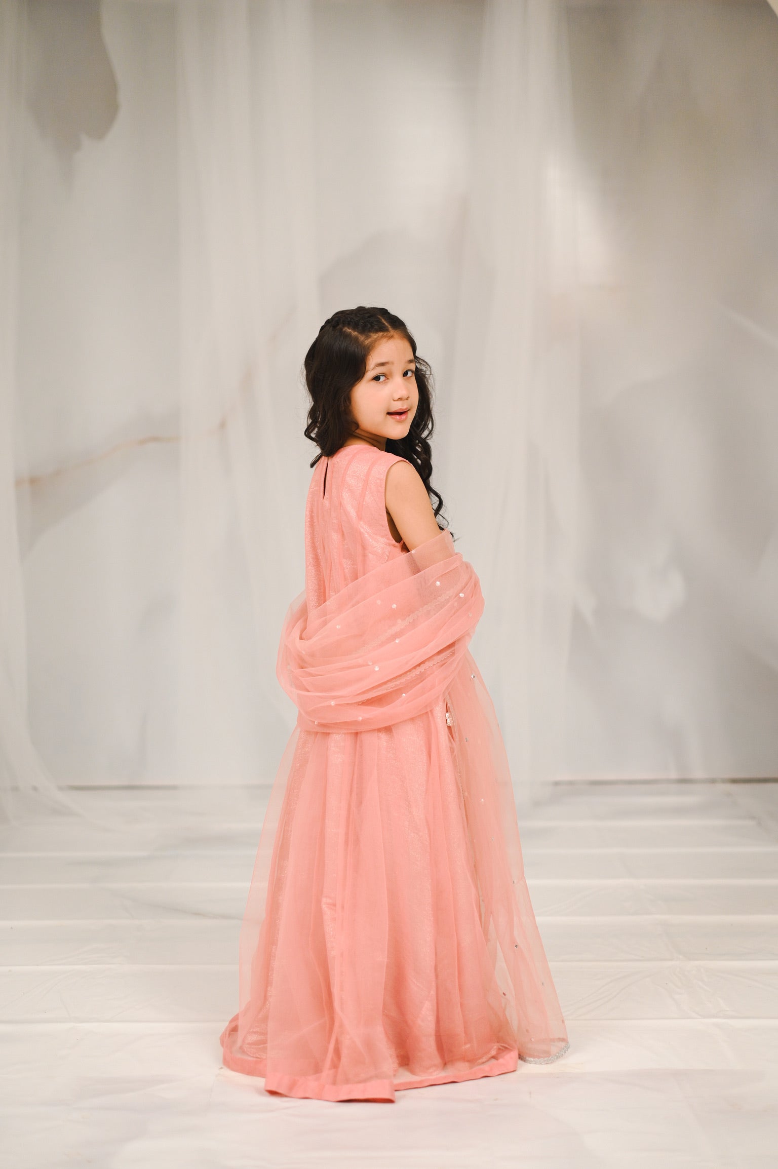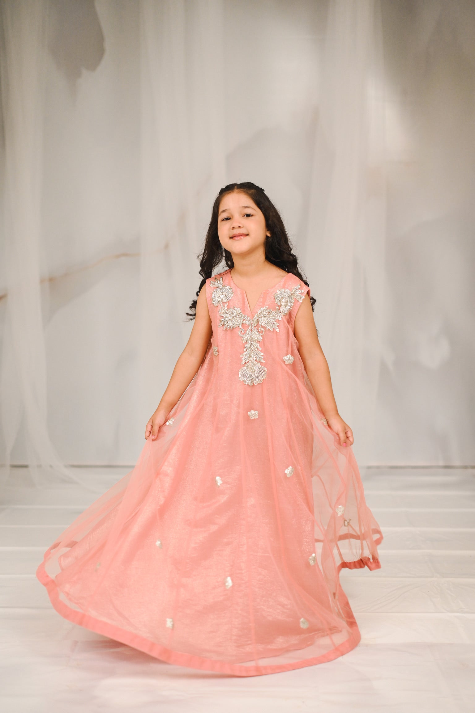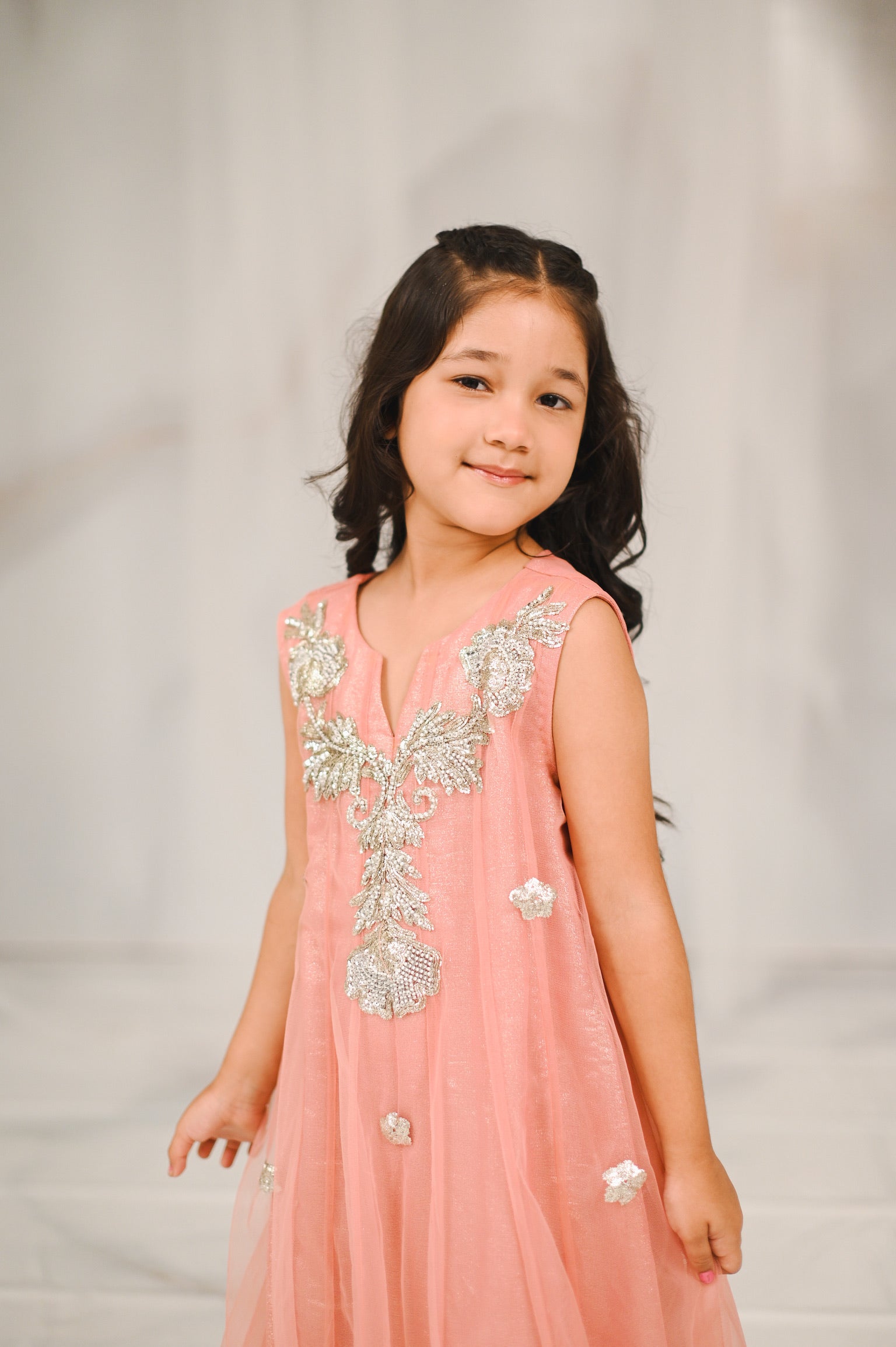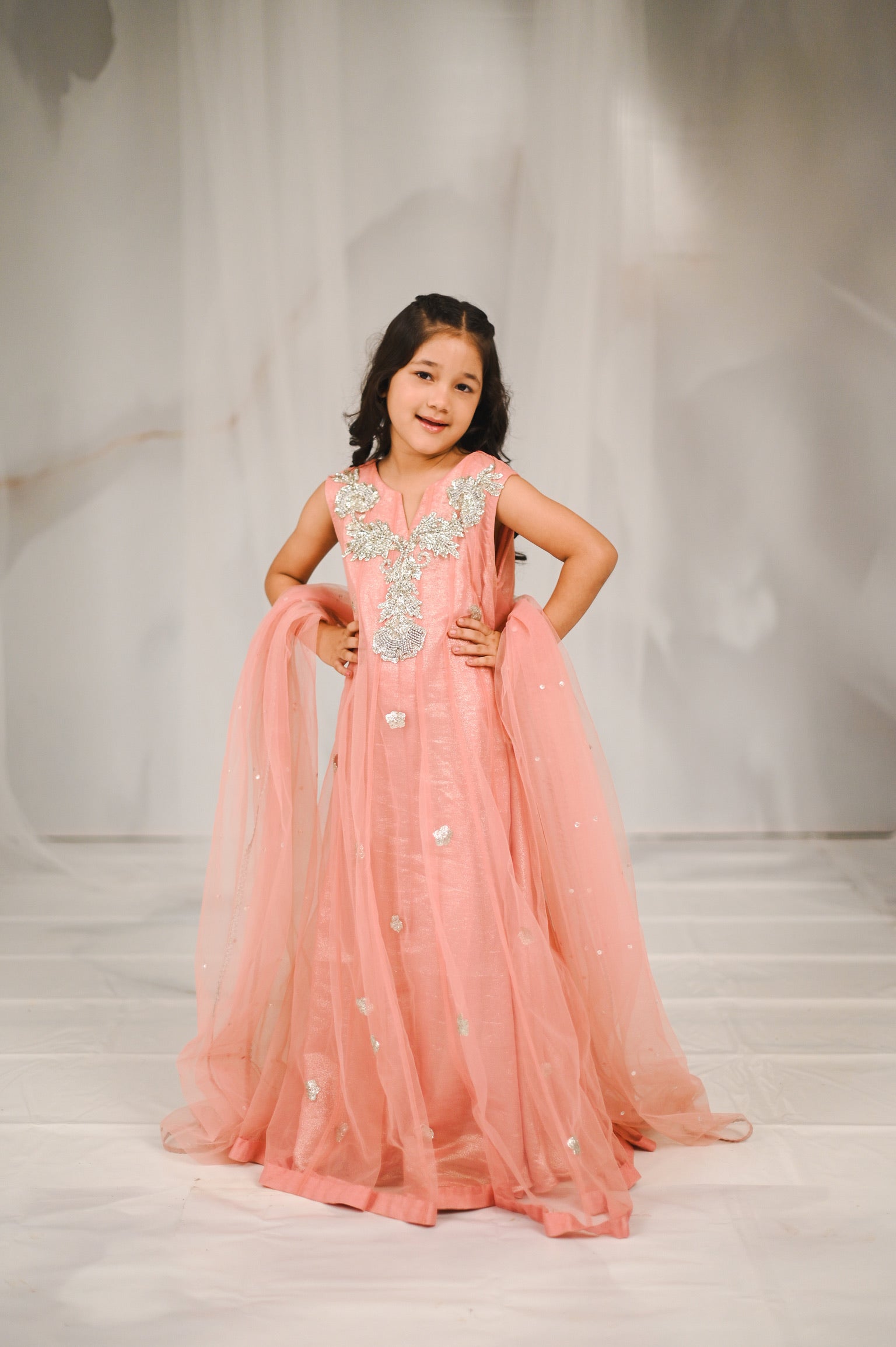 Elevate your little one's wedding wardrobe with our stunning Kids Eastern Wedding Wear! This enchanting coral net flair dress features exquisite nakshi and pearl work on the neckline, making it a perfect choice for festive celebrations. The delicate net dupatta adds a touch of grace, ensuring your child steals the spotlight at any event. Crafted for comfort and style, this outfit is ideal for those special family gatherings. Shop now to give your child the perfect blend of tradition and elegance!