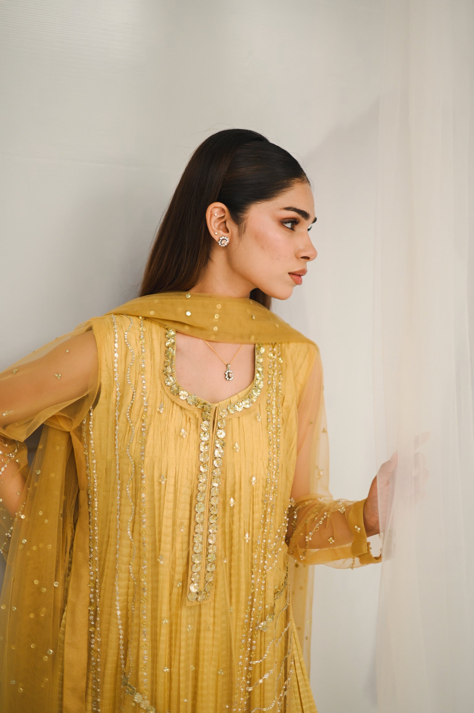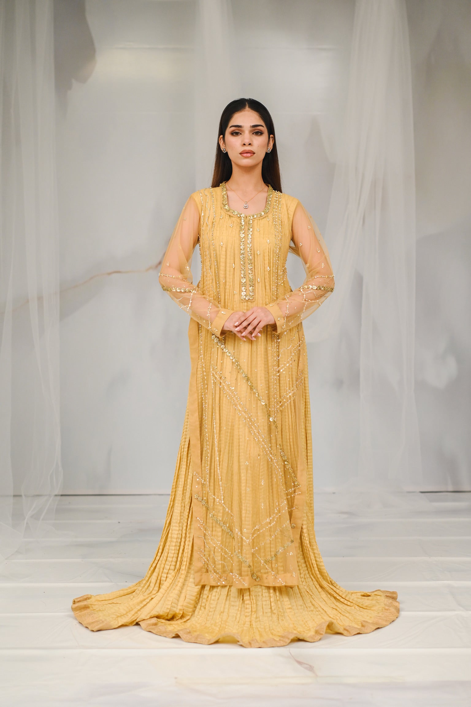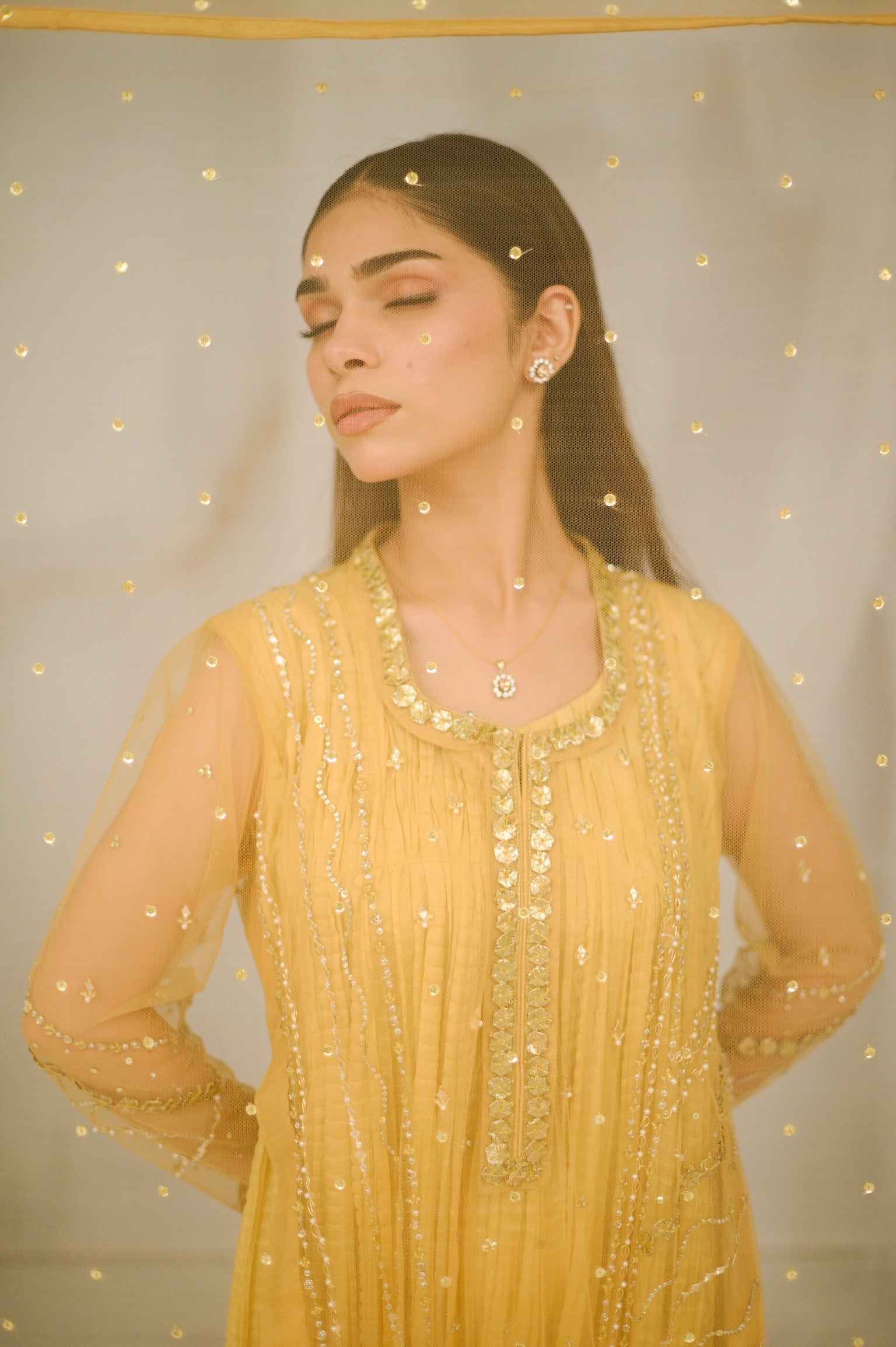 Discover the elegance of Pakistani Eastern wear for women and girls with our stunning collection featuring a yellow crushed silk inner and intricately designed net shirt adorned with Gota, sequins, and kora work in geometric patterns. Our exquisite ensembles are beautifully paired with a delicate net dupatta, enhancing your festive look. Shop now to elevate your wardrobe with timeless craftsmanship and contemporary style!