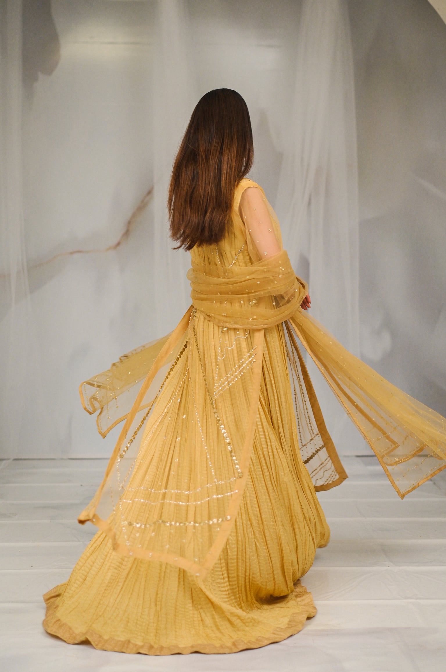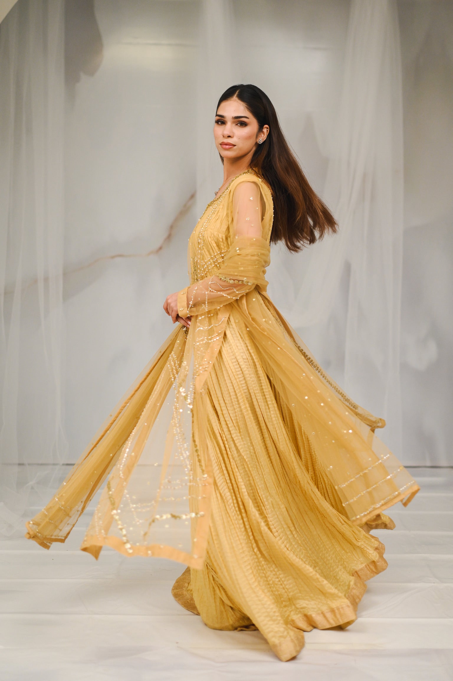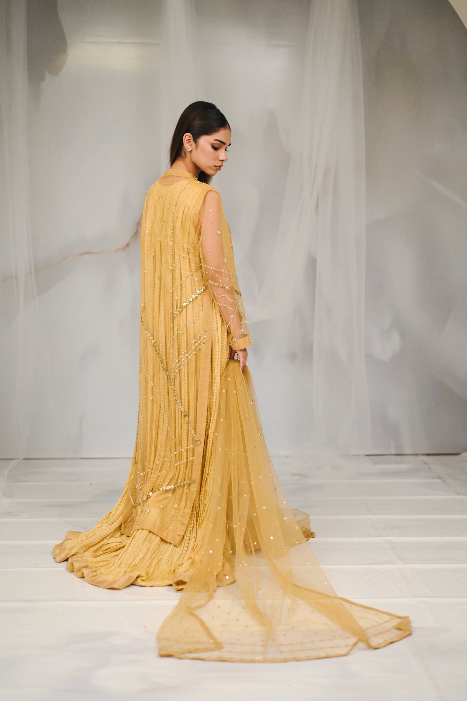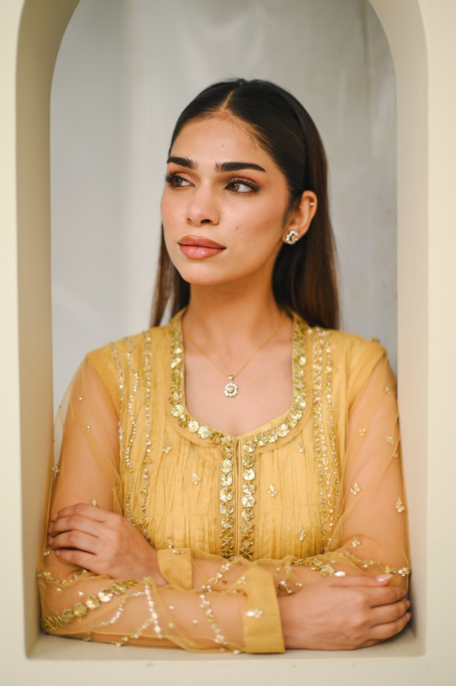 Discover the elegance of Pakistani Eastern wear for women and girls with our stunning collection featuring a yellow crushed silk inner and intricately designed net shirt adorned with Gota, sequins, and kora work in geometric patterns. Our exquisite ensembles are beautifully paired with a delicate net dupatta, enhancing your festive look. Shop now to elevate your wardrobe with timeless craftsmanship and contemporary style!