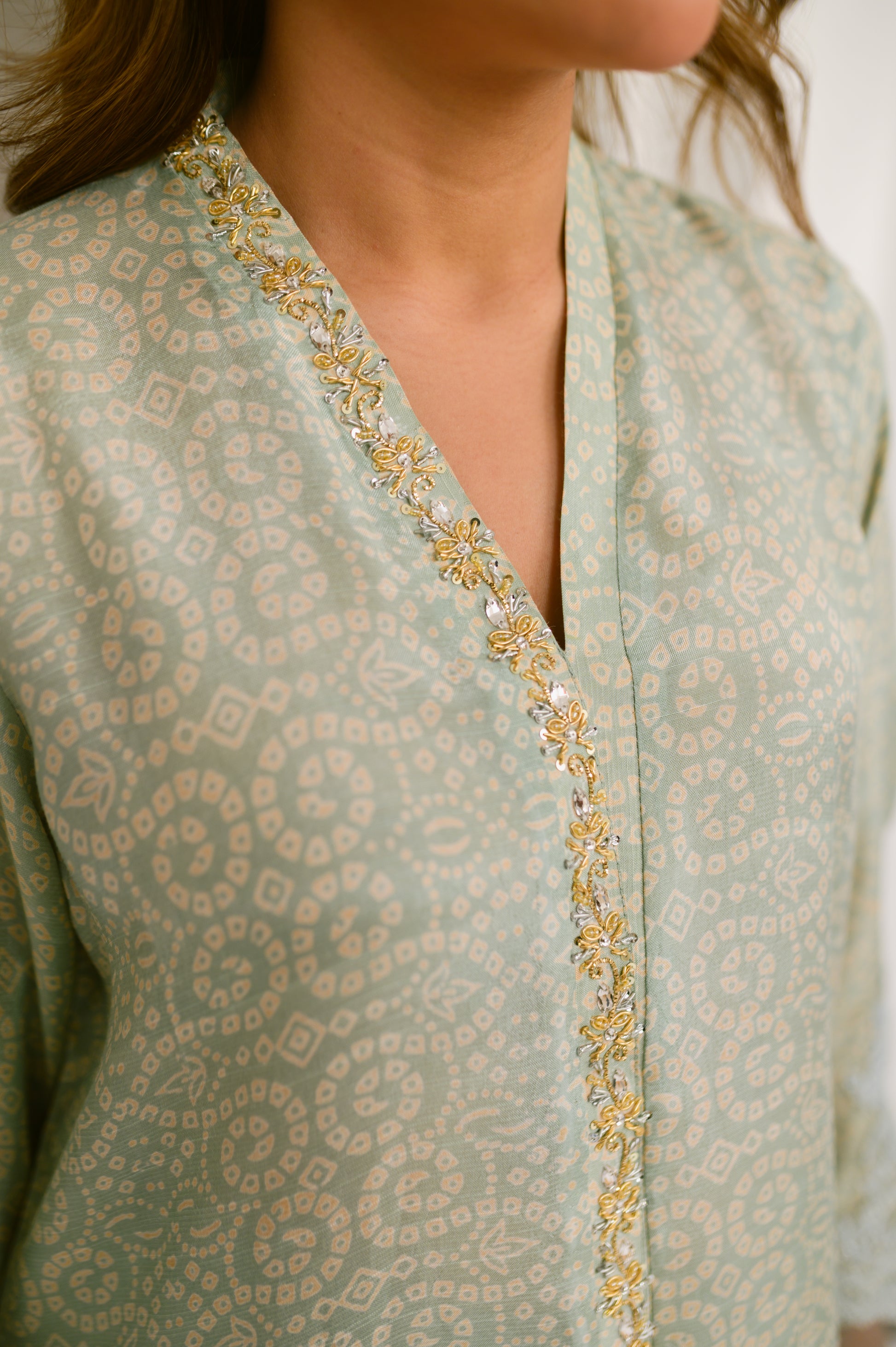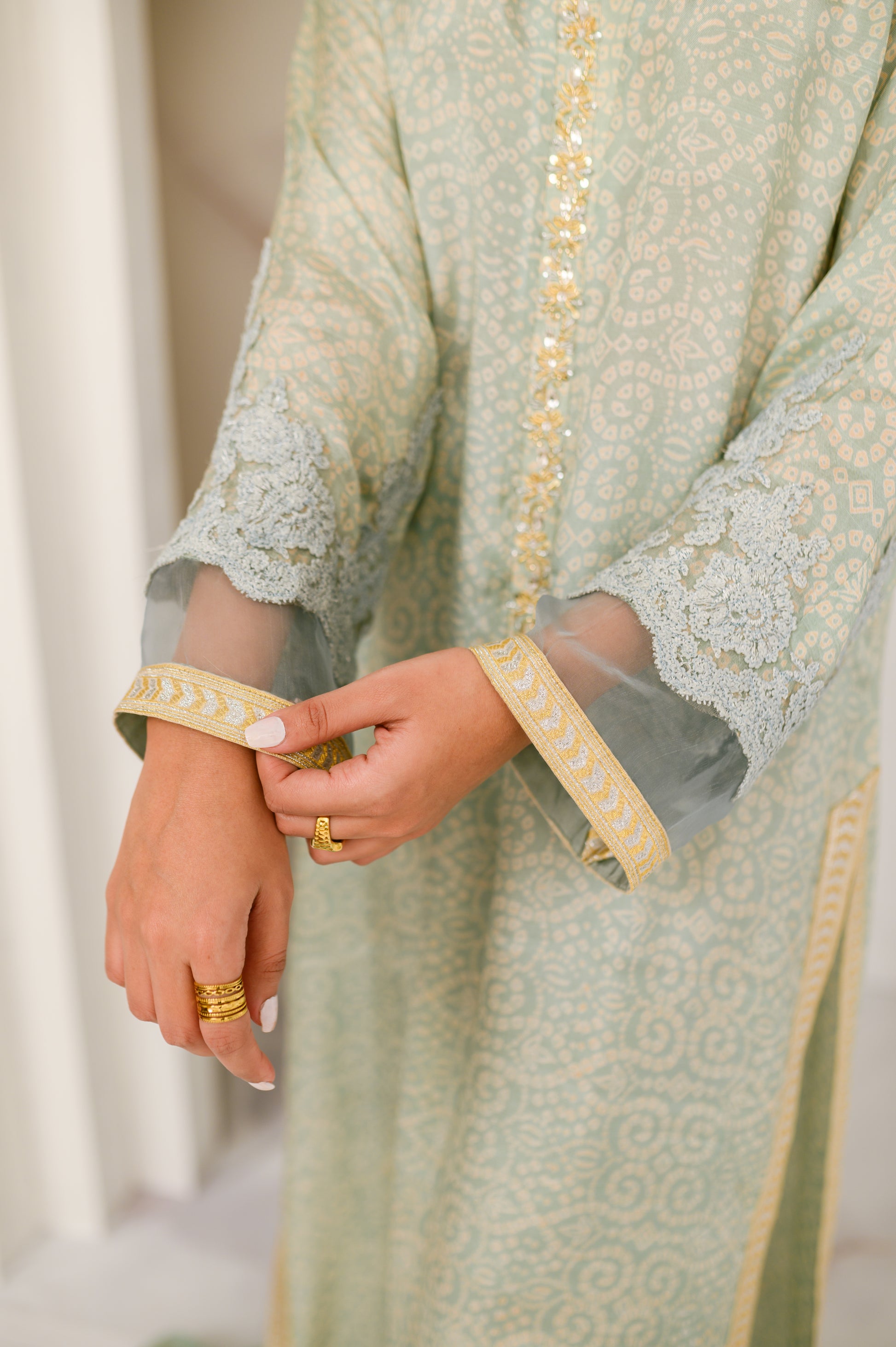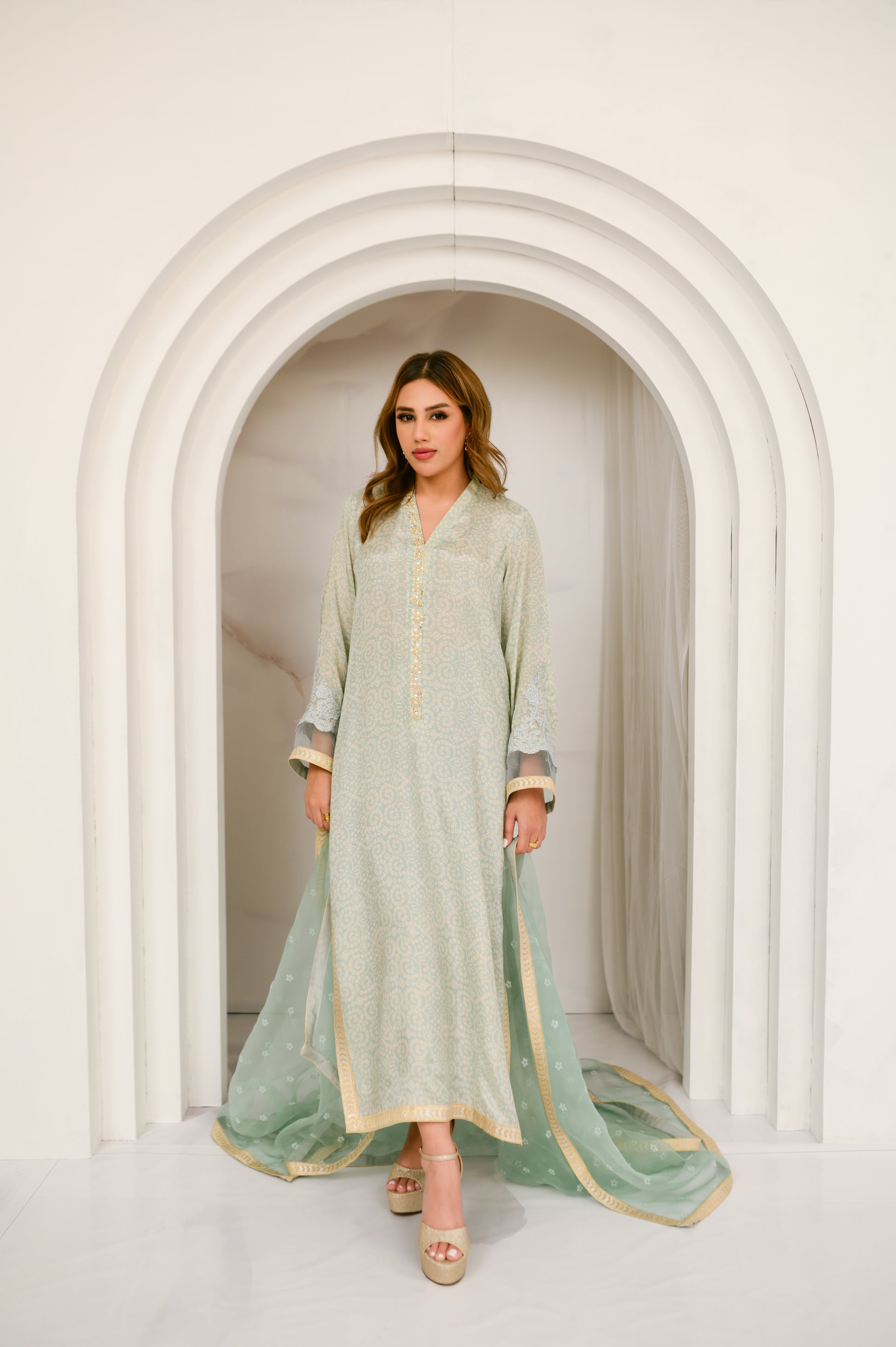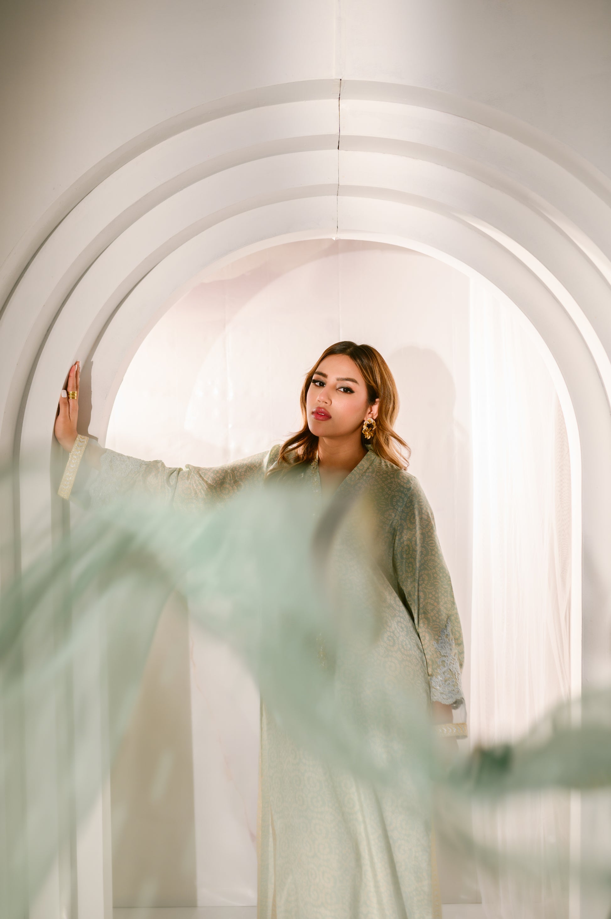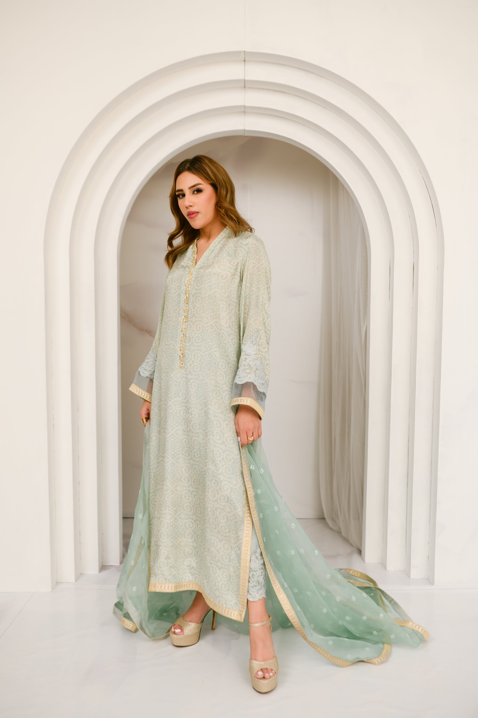 Introducing Aqua, a stunning mint green silk long shirt adorned with exquisite block printing and delicate handwork on the neckline. This elegant piece is complemented by Dhaka pants featuring intricate lace detailing and sleeves embellished with lace and organza trimmings. The look is complete with a pure organza dupatta showcasing beautiful floral motif embroidery, perfect for Eid mornings