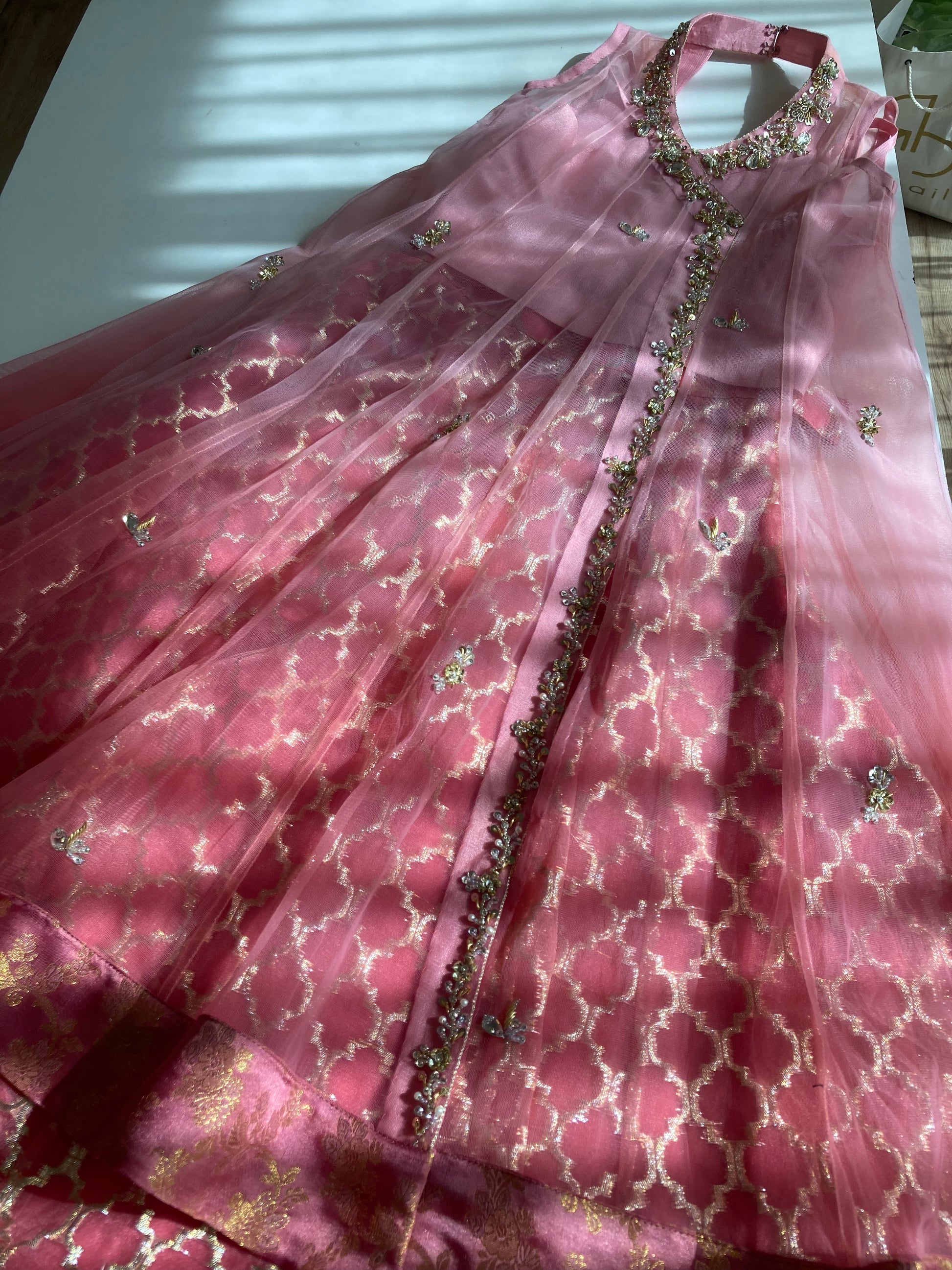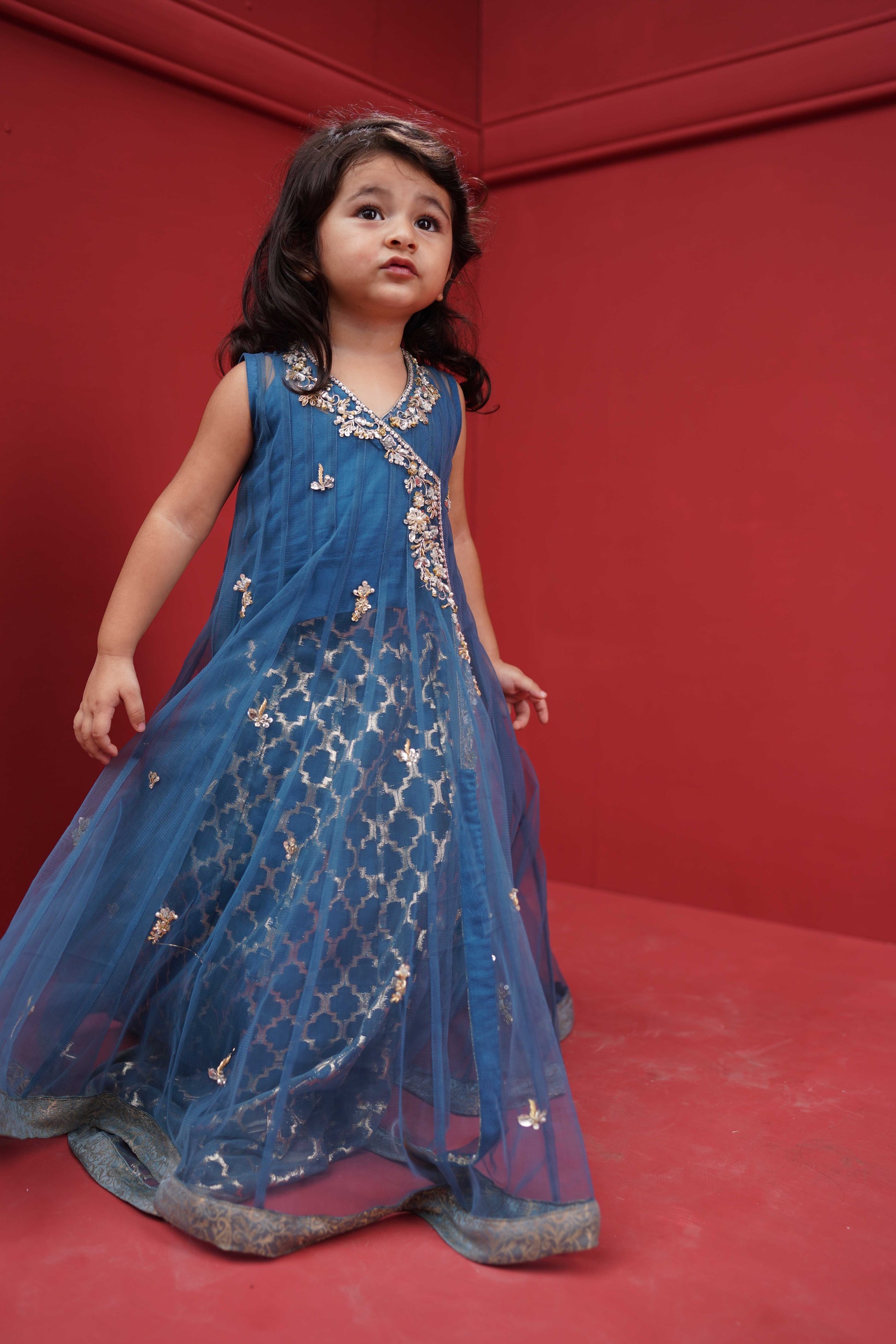 Aqua Net Front open Angarkha for girls is a stunning ensemble crafted with exquisite handwork on the front. The beautiful detailing on the angarkha adds a touch of elegance and finesse to the attire, making it perfect for special occasions and celebrations. Paired with a plain choli, this ensemble creates a harmonious blend of tradition and contemporary fashion. The shimmer sharara adds an element of glamour to the outfit, making it a standout choice for any event. Designed with precision and attention to detail, the Aqua Net Front Angarkha is a must-have for young fashion enthusiasts seeking a unique and stylish ensemble.