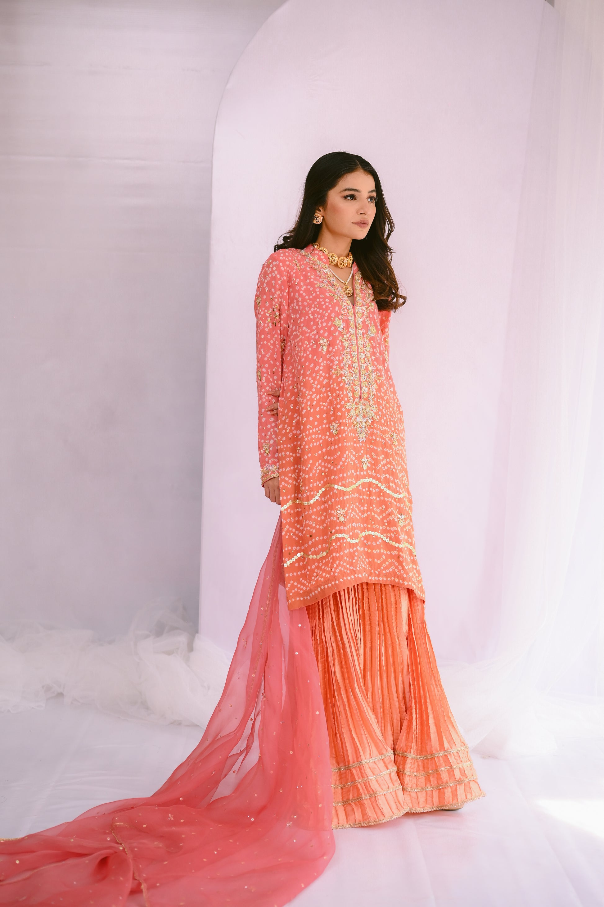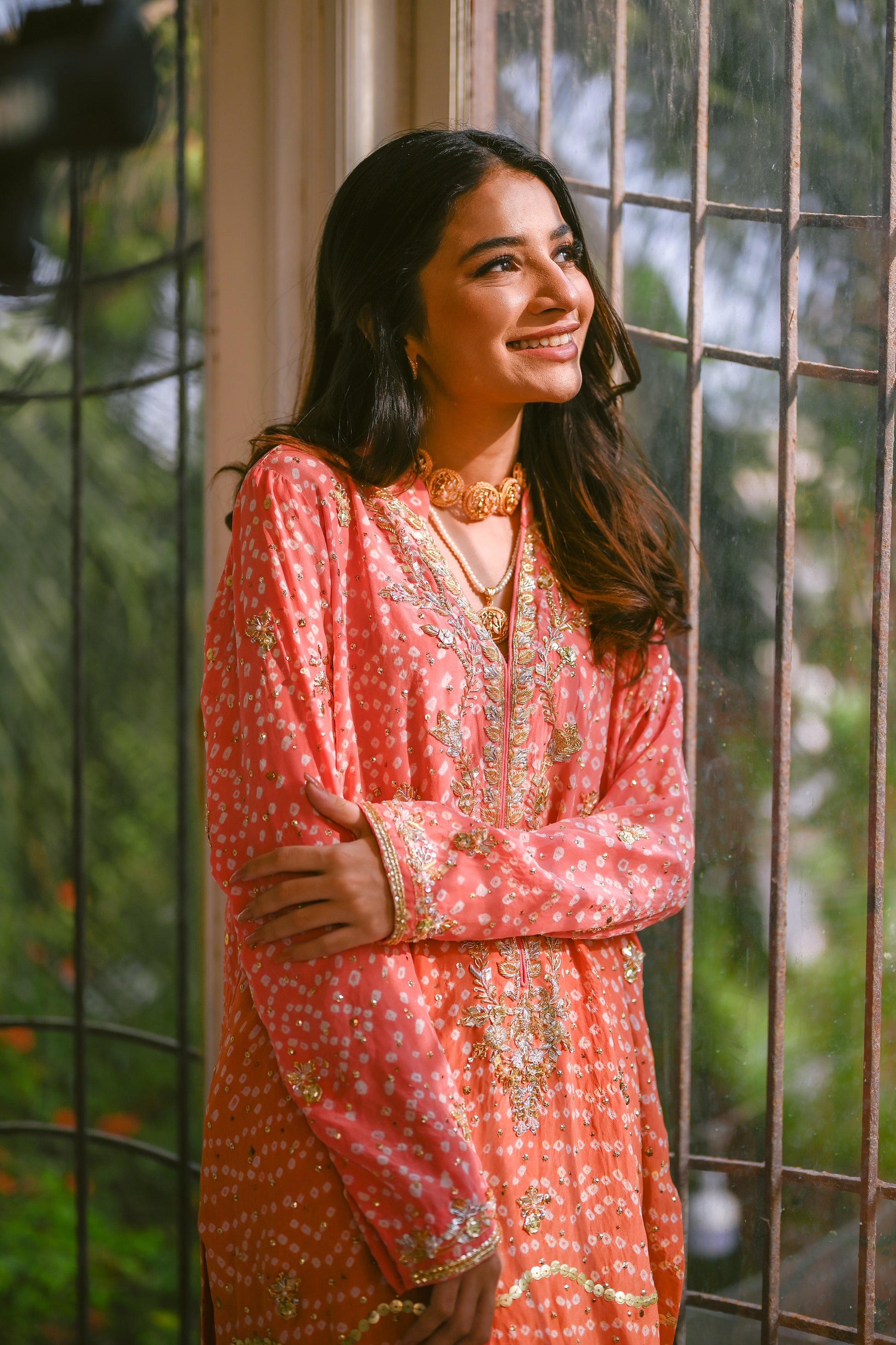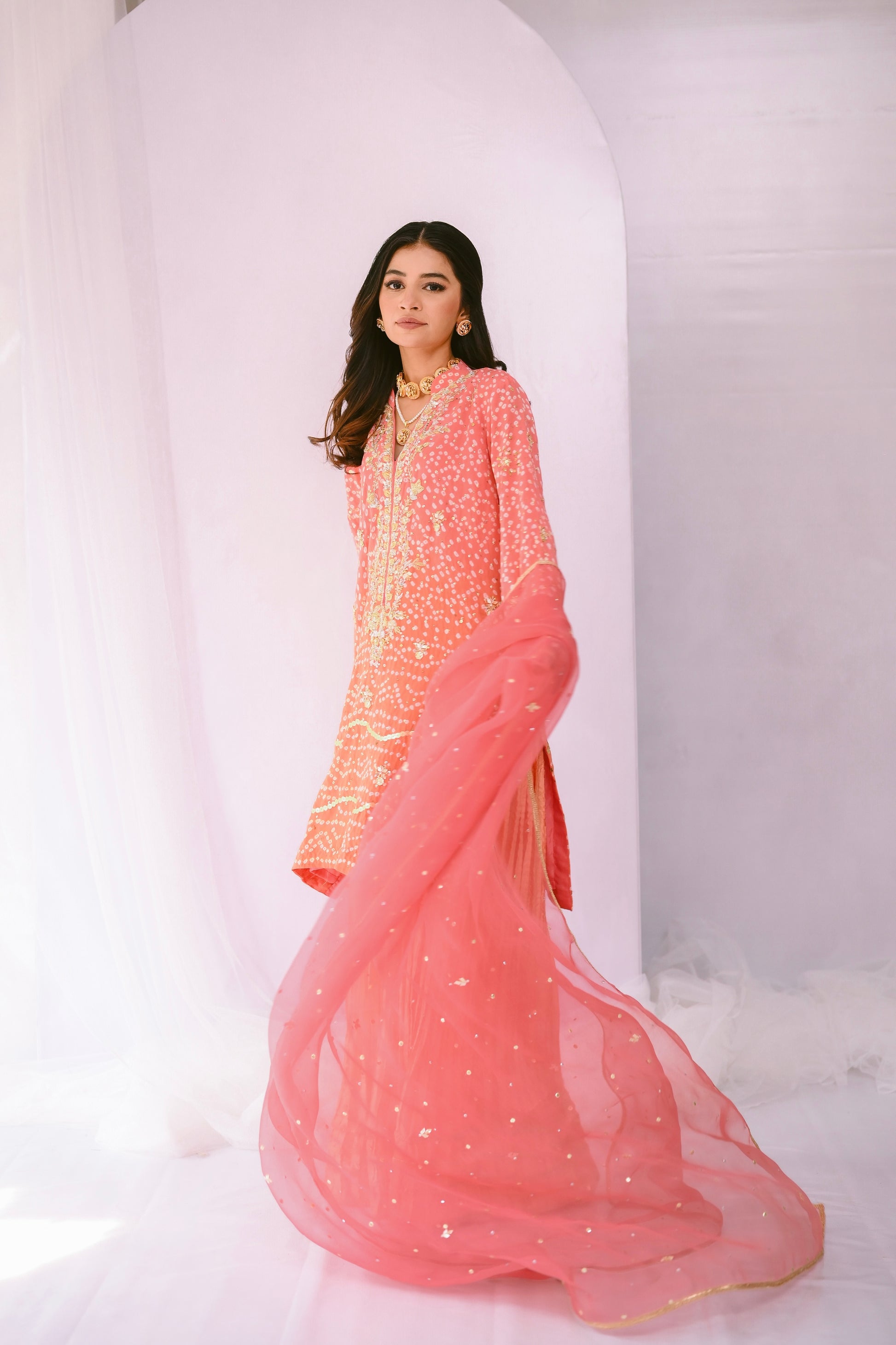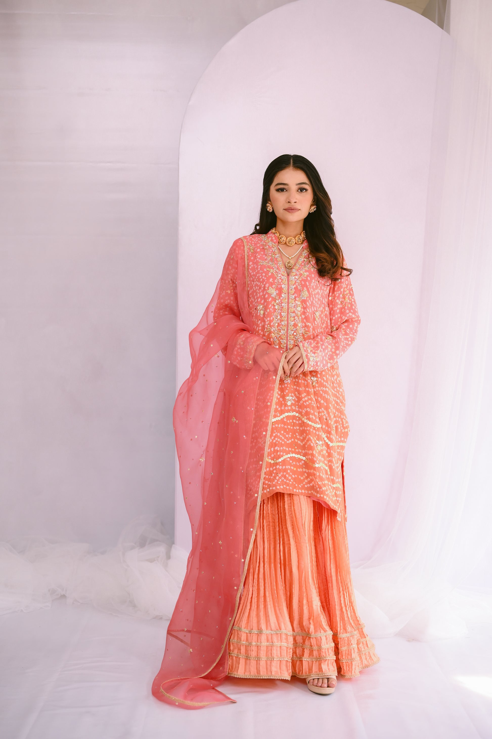 Make a statement in our coral Chundri Shirt, featuring intricate Zardozi embroidery that radiates elegance. Complemented by crushed Dhaka pants and a flowing pure organza dupatta, this ensemble offers a perfect fusion of rich tradition and modern sophistication