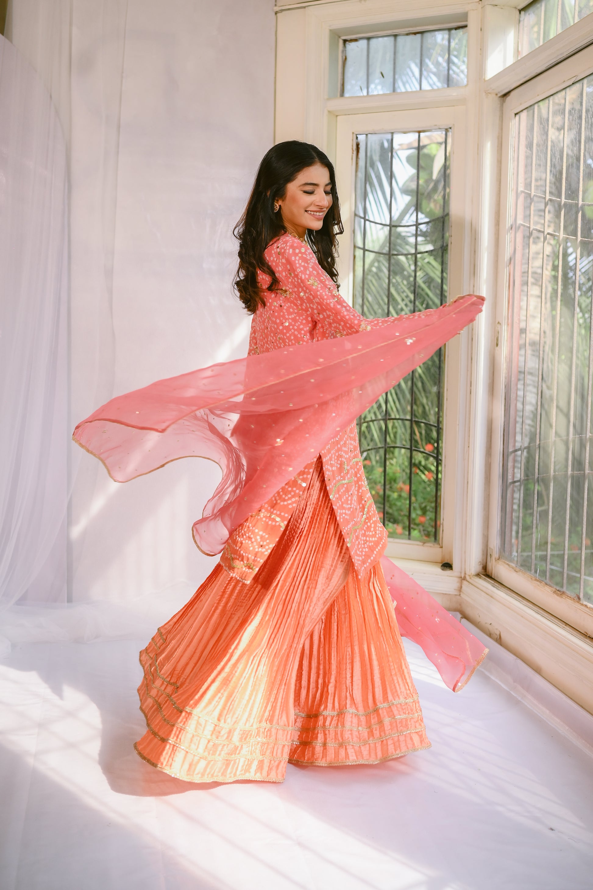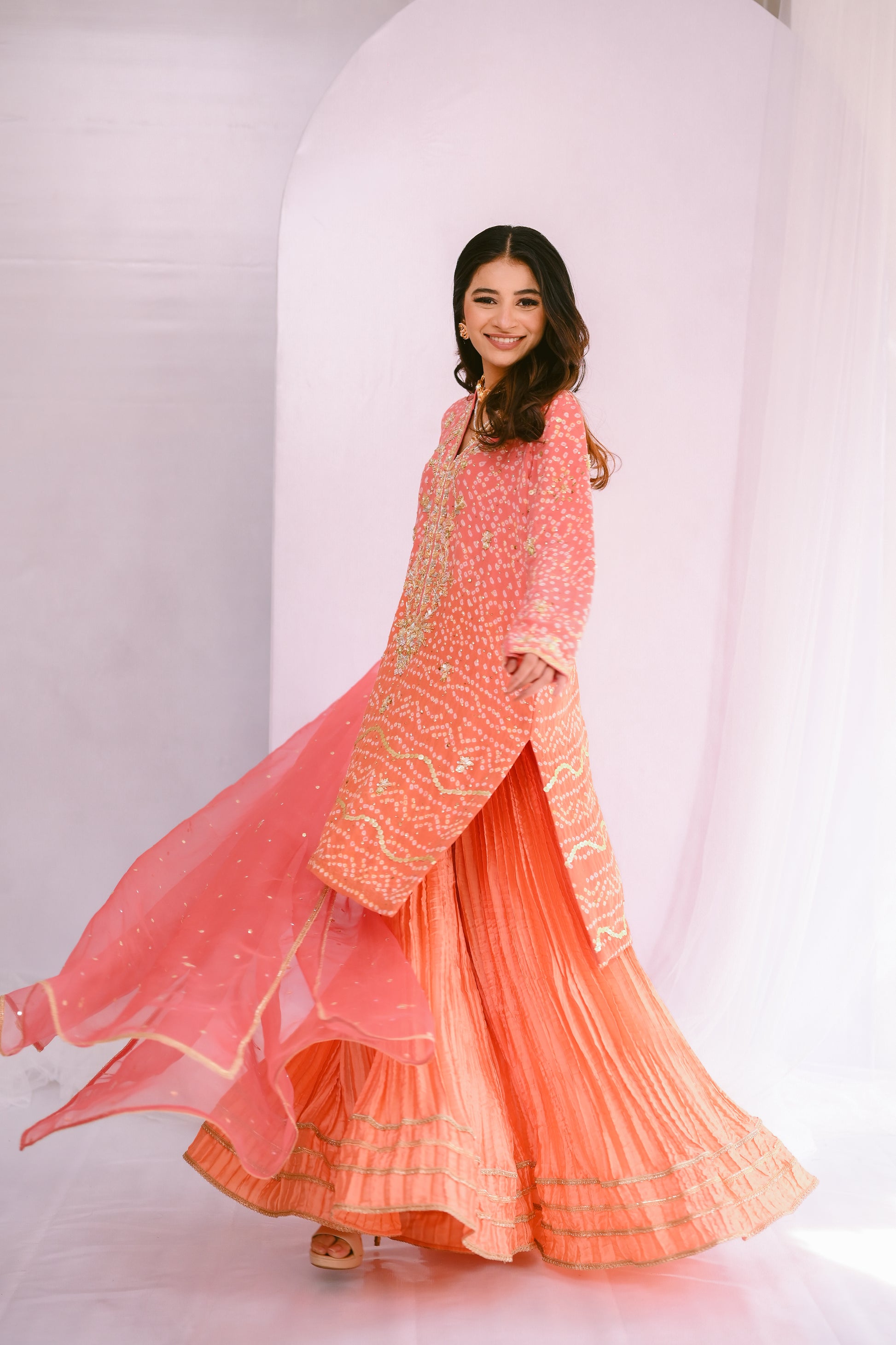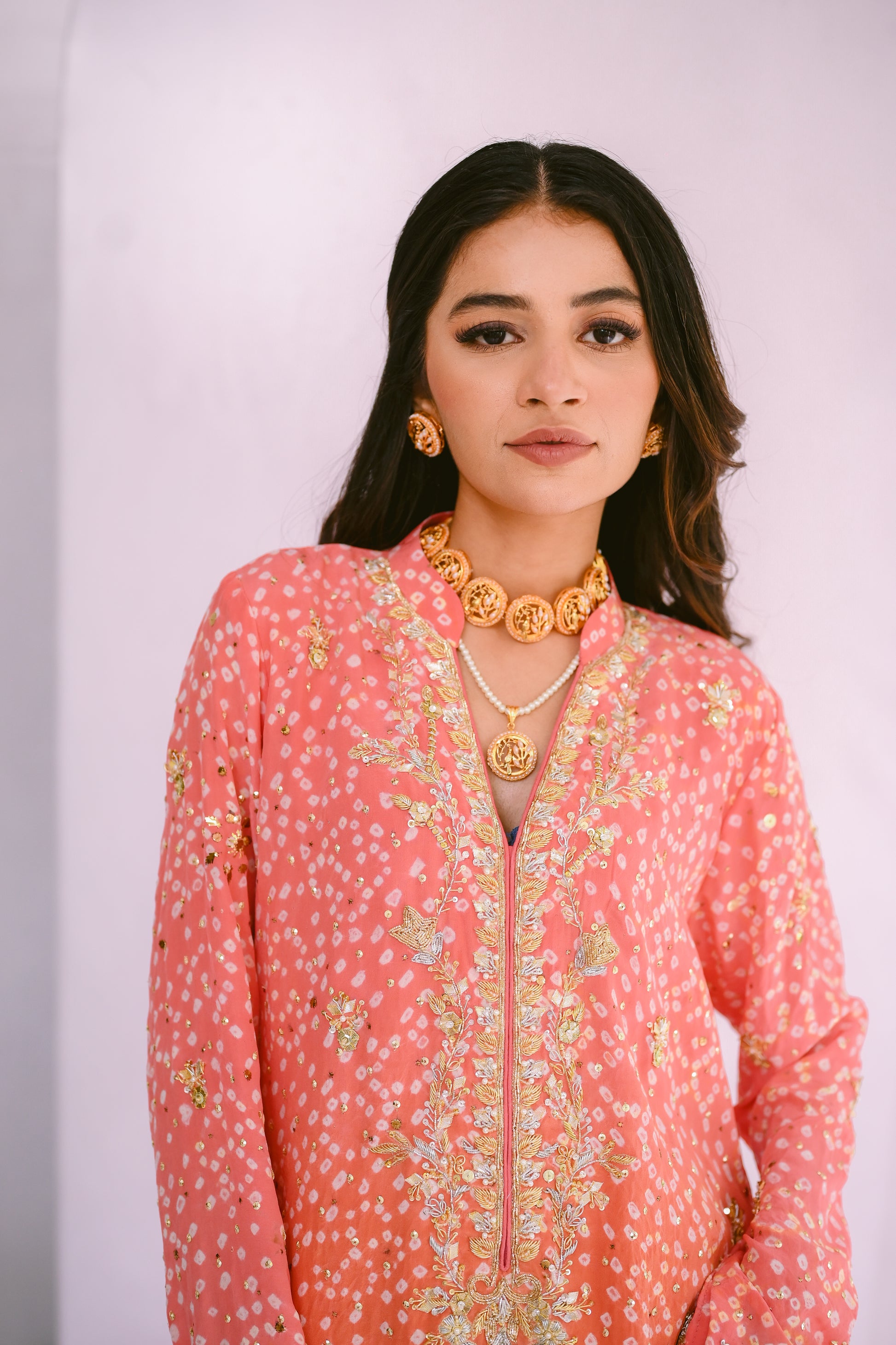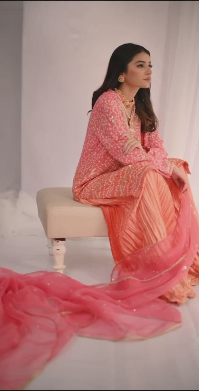 Make a statement in our coral Chundri Shirt, featuring intricate Zardozi embroidery that radiates elegance. Complemented by crushed Dhaka pants and a flowing pure organza dupatta, this ensemble offers a perfect fusion of rich tradition and modern sophistication