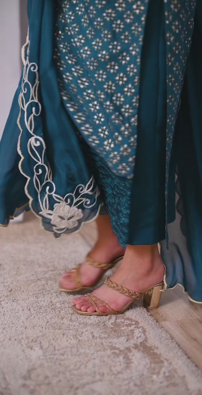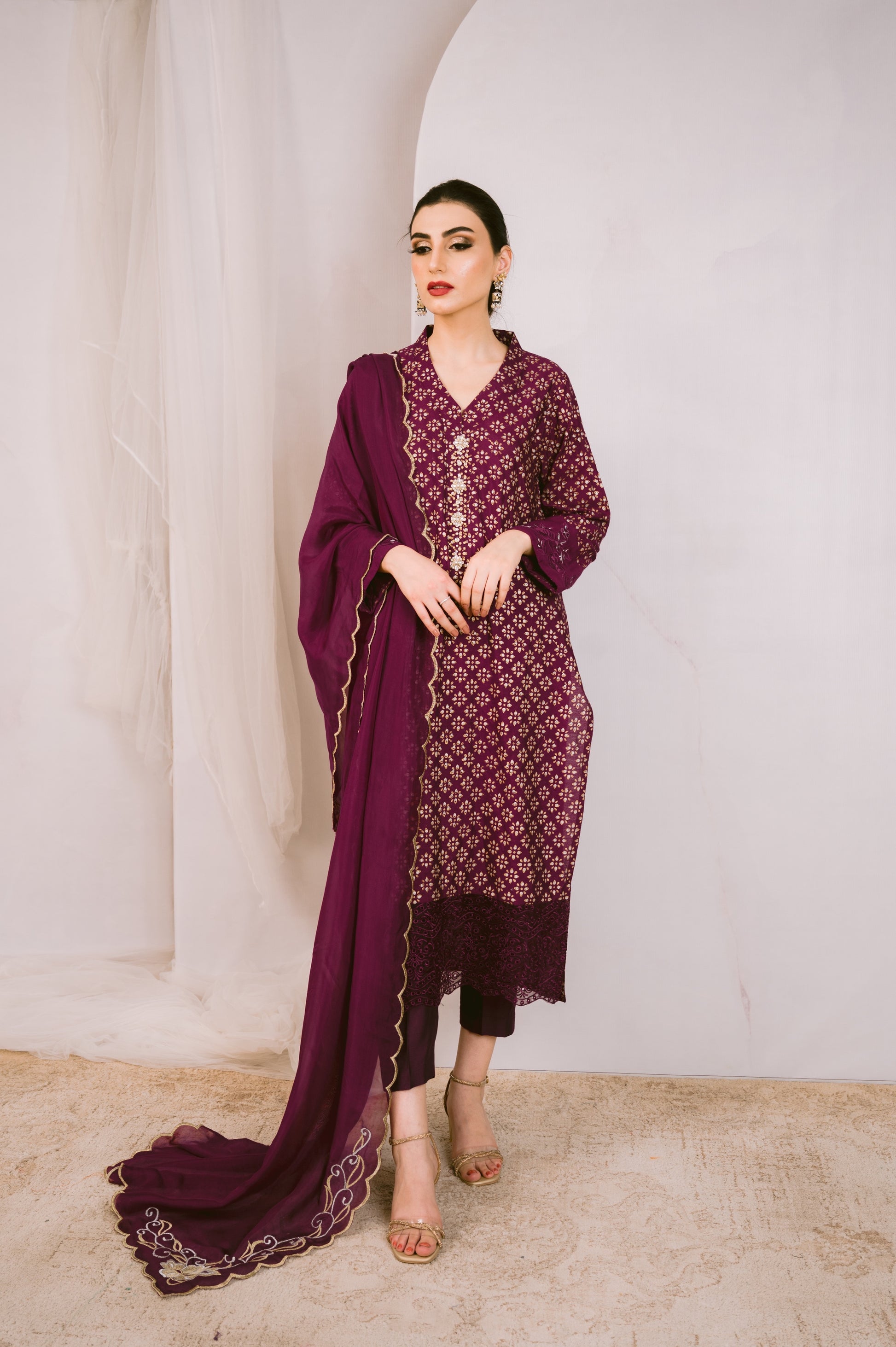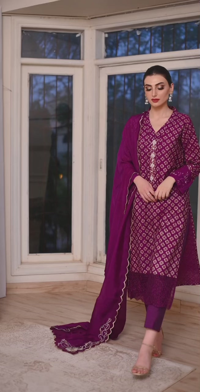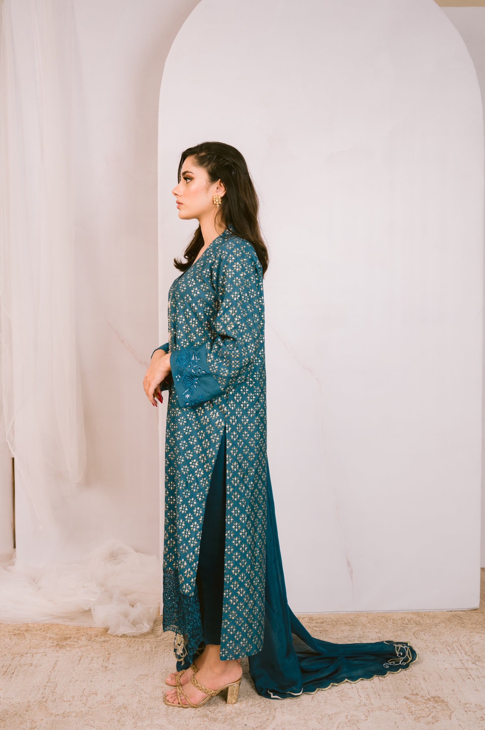 Cotton net kurta with a touch of elegance and timeless appeal. Adorned with mesmerizing silver and gold block print, it boasts a unique design that will surely turn heads. The sleeves feature intricate machine embroidery that adds a touch of sophistication. The kurta is further enhanced with delicate cutwork detailing, showcasing fine craftsmanship. Paired with plain pants, it exudes a classic and modern fusion. To complete the look, we have included a silk dupatta intricately embroidered with pearl and swarovski embellishments, providing a stunning finish. Indulge in luxury with this stunning ensemble and make a lasting impression.
