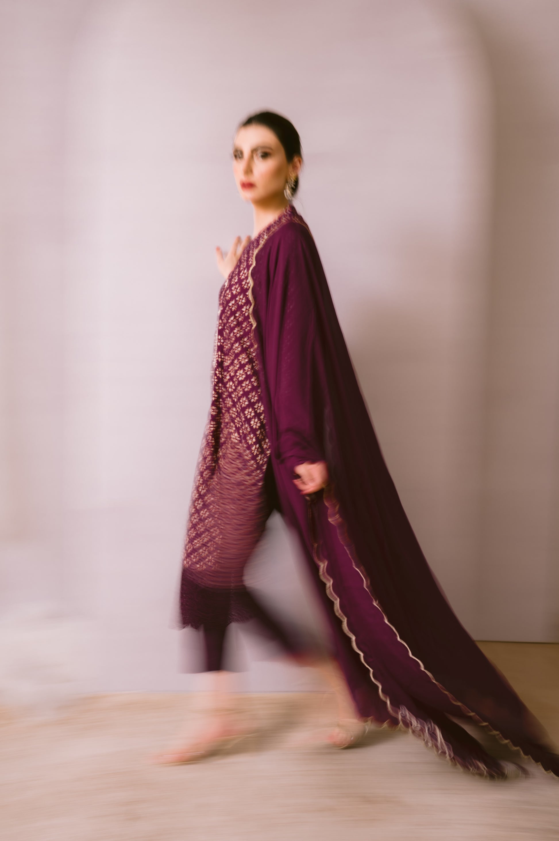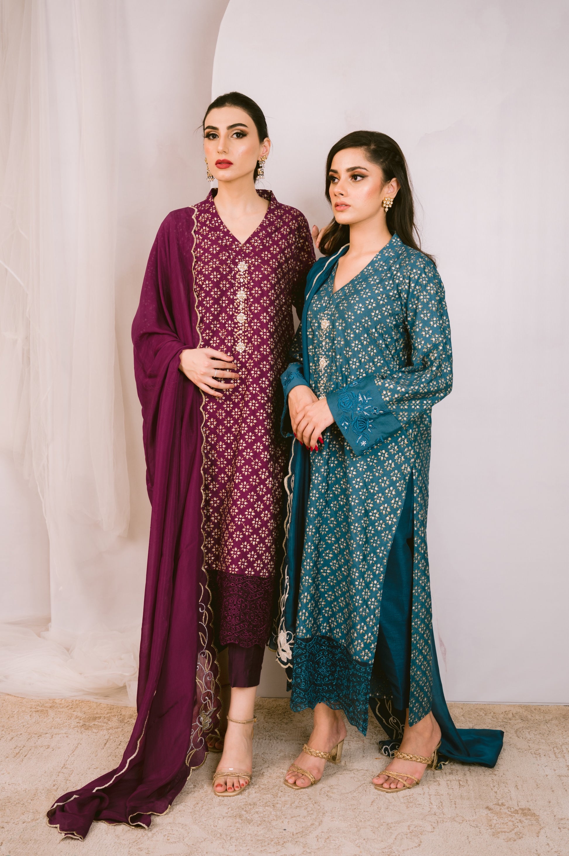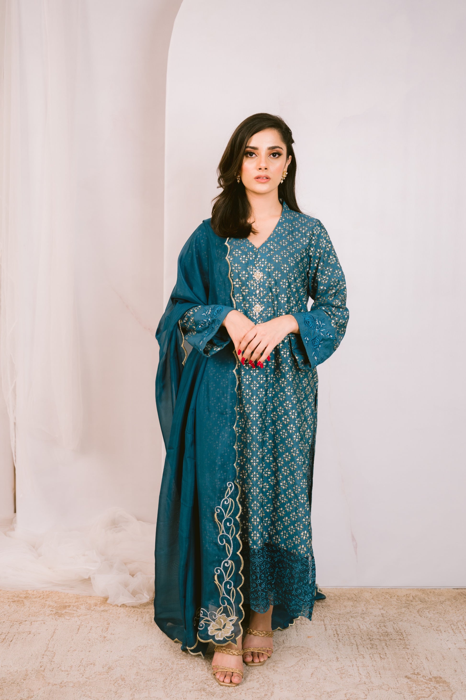 Cotton net kurta with a touch of elegance and timeless appeal. Adorned with mesmerizing silver and gold block print, it boasts a unique design that will surely turn heads. The sleeves feature intricate machine embroidery that adds a touch of sophistication. The kurta is further enhanced with delicate cutwork detailing, showcasing fine craftsmanship. Paired with plain pants, it exudes a classic and modern fusion. To complete the look, we have included a silk dupatta intricately embroidered with pearl and swarovski embellishments, providing a stunning finish. Indulge in luxury with this stunning ensemble and make a lasting impression.