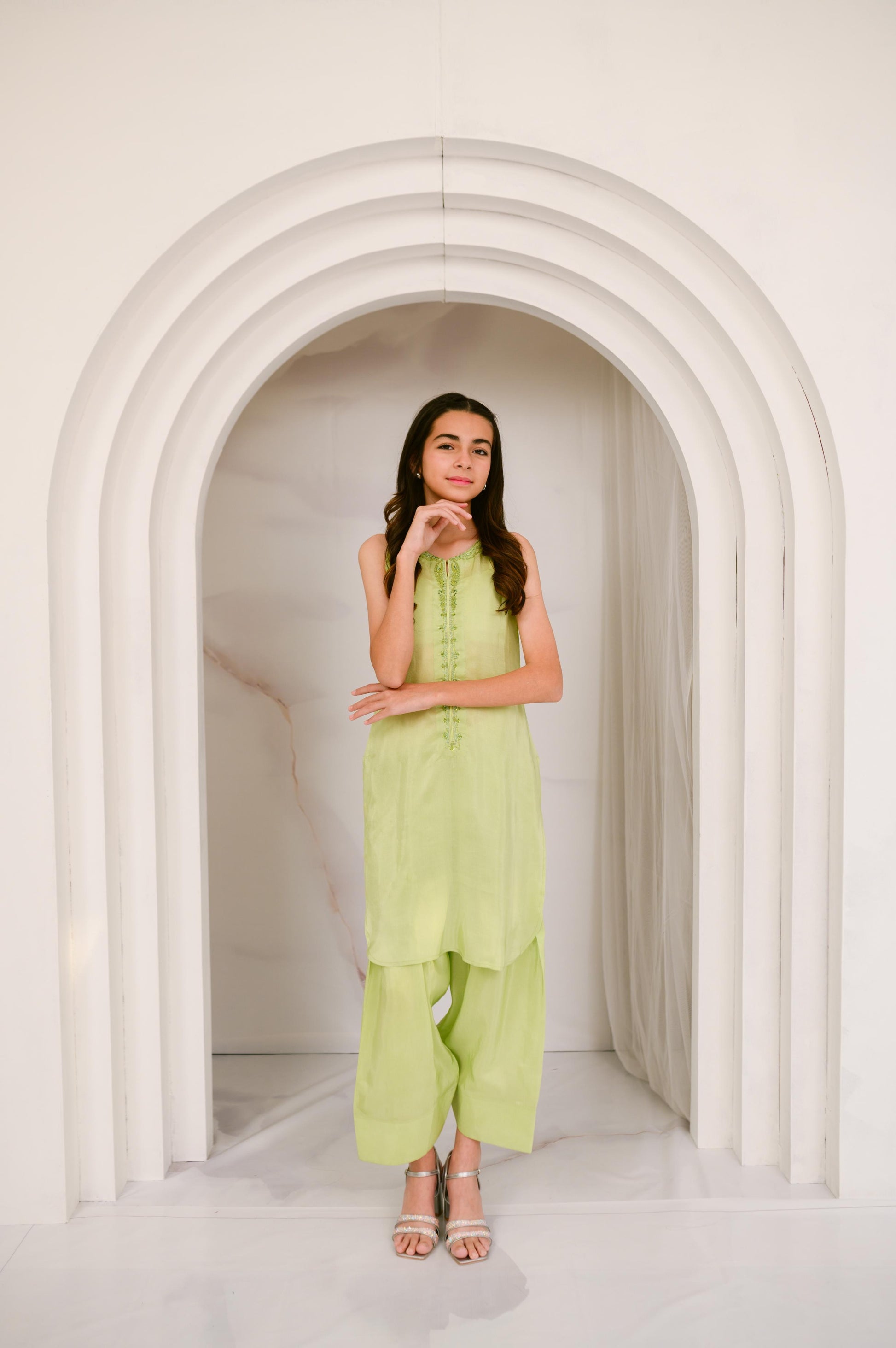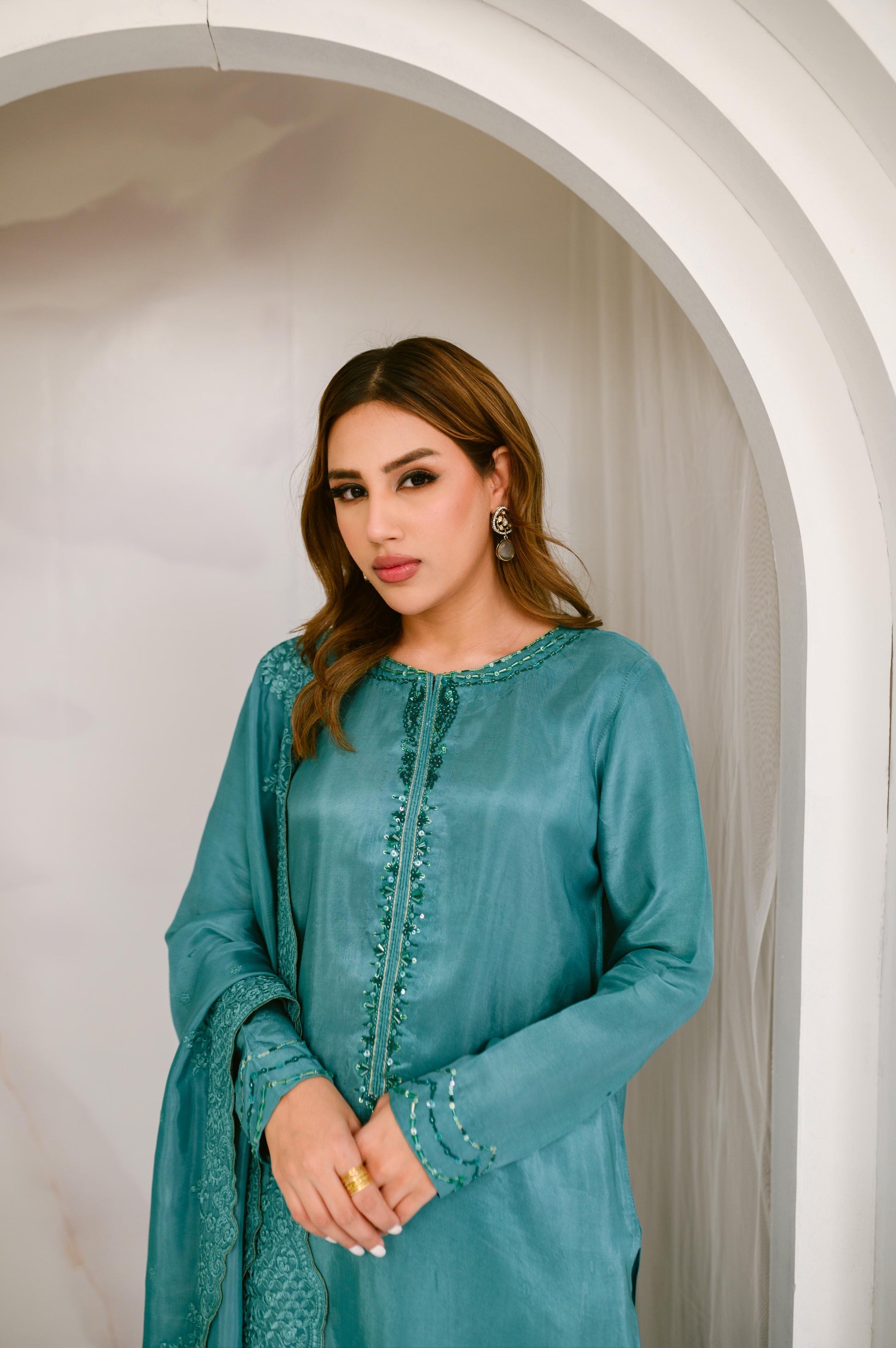 Introducing the Bloom Sheesha Silk Short Shirt, an elegant ensemble designed for sophistication. This stunning outfit features intricate handwork adorning the neckline, enhancing its allure. The complemented shalwar offers a perfect fit, while the shaded silk dupatta, embellished with embroidered borders, adds a graceful touch. Ideal for festive occasions, this ensemble beautifully combines tradition with contemporary style.