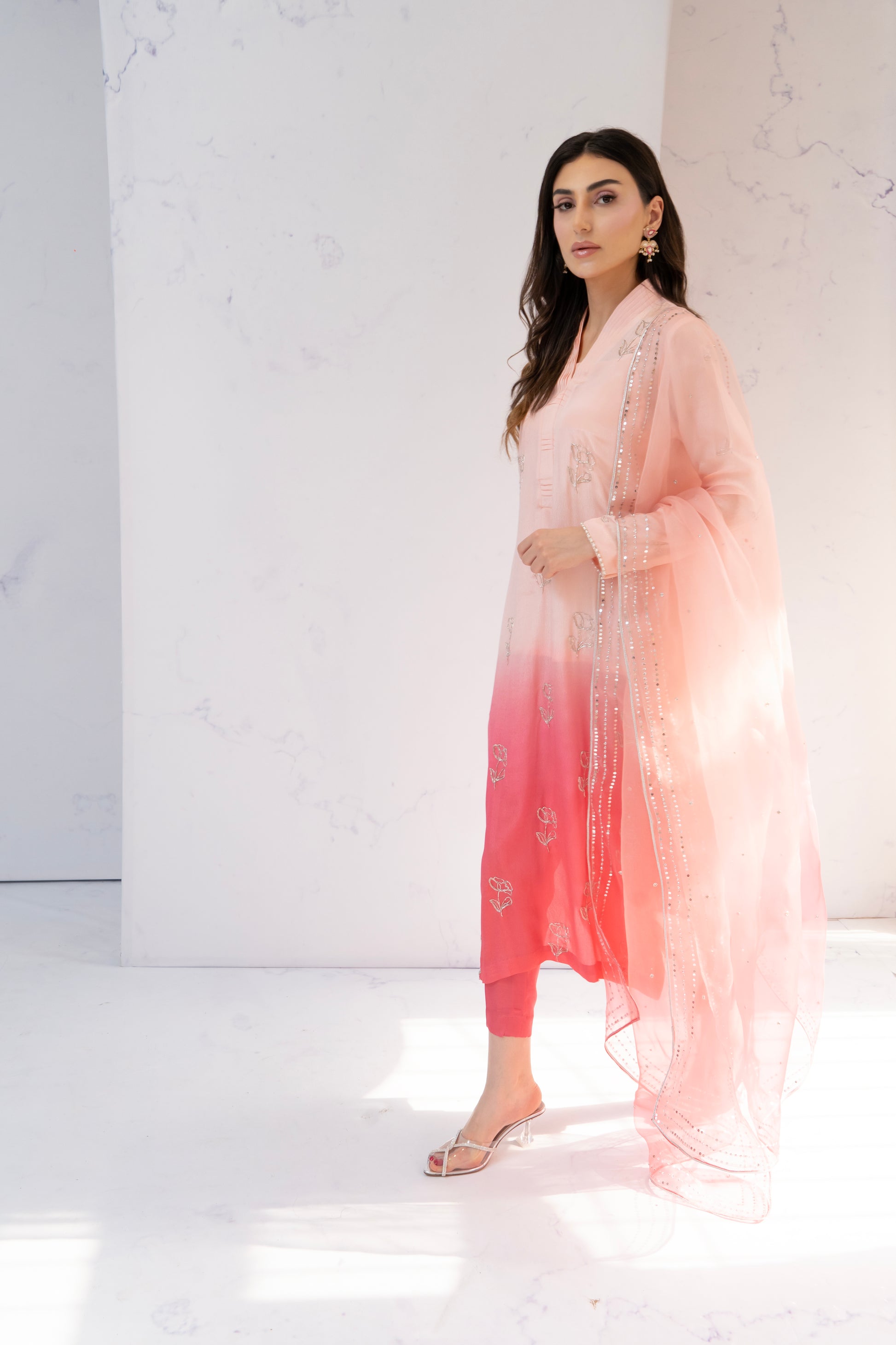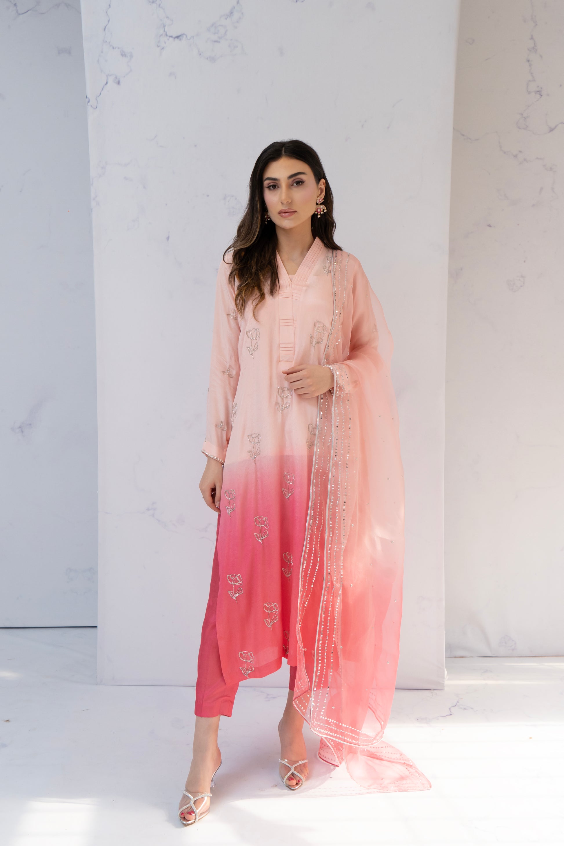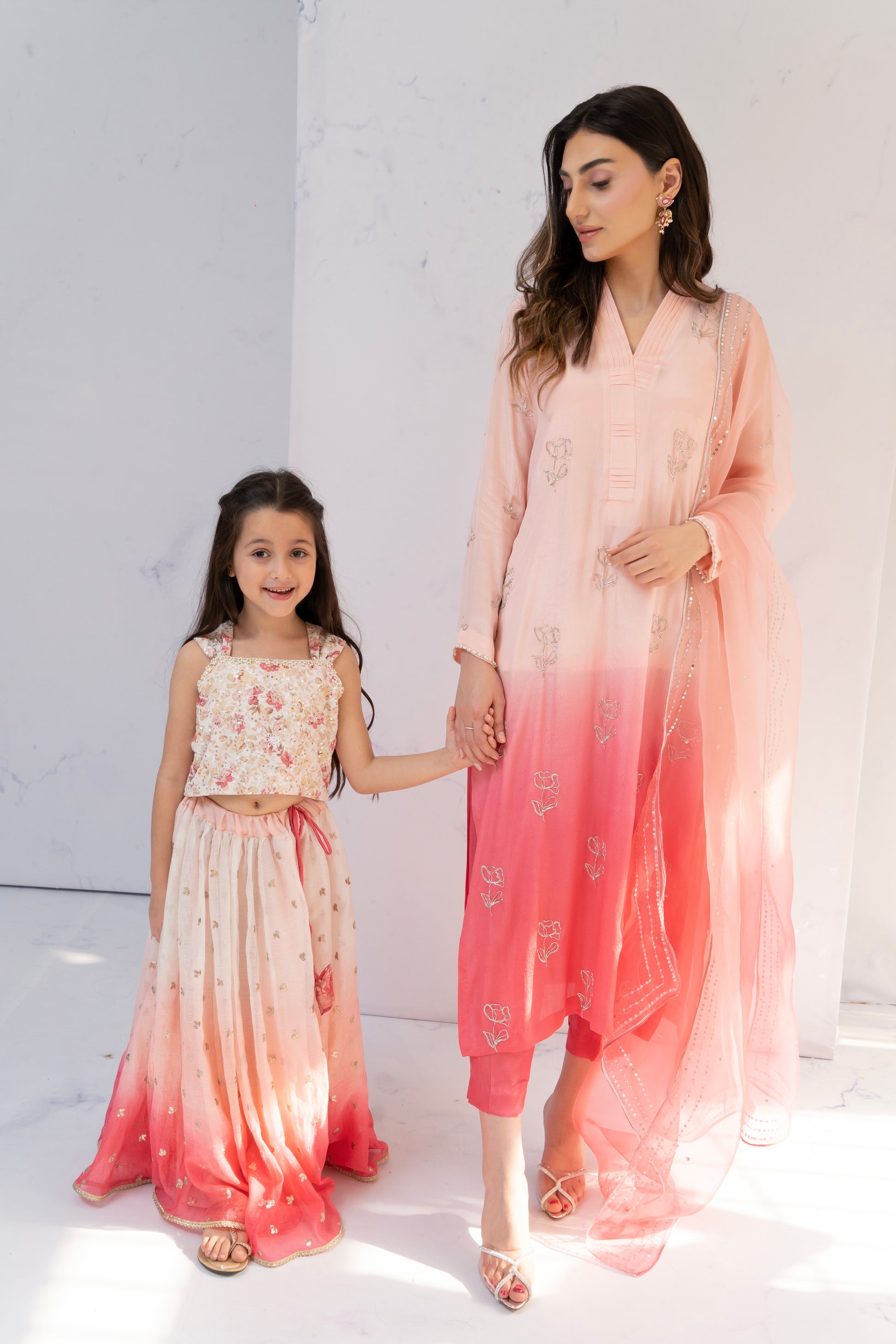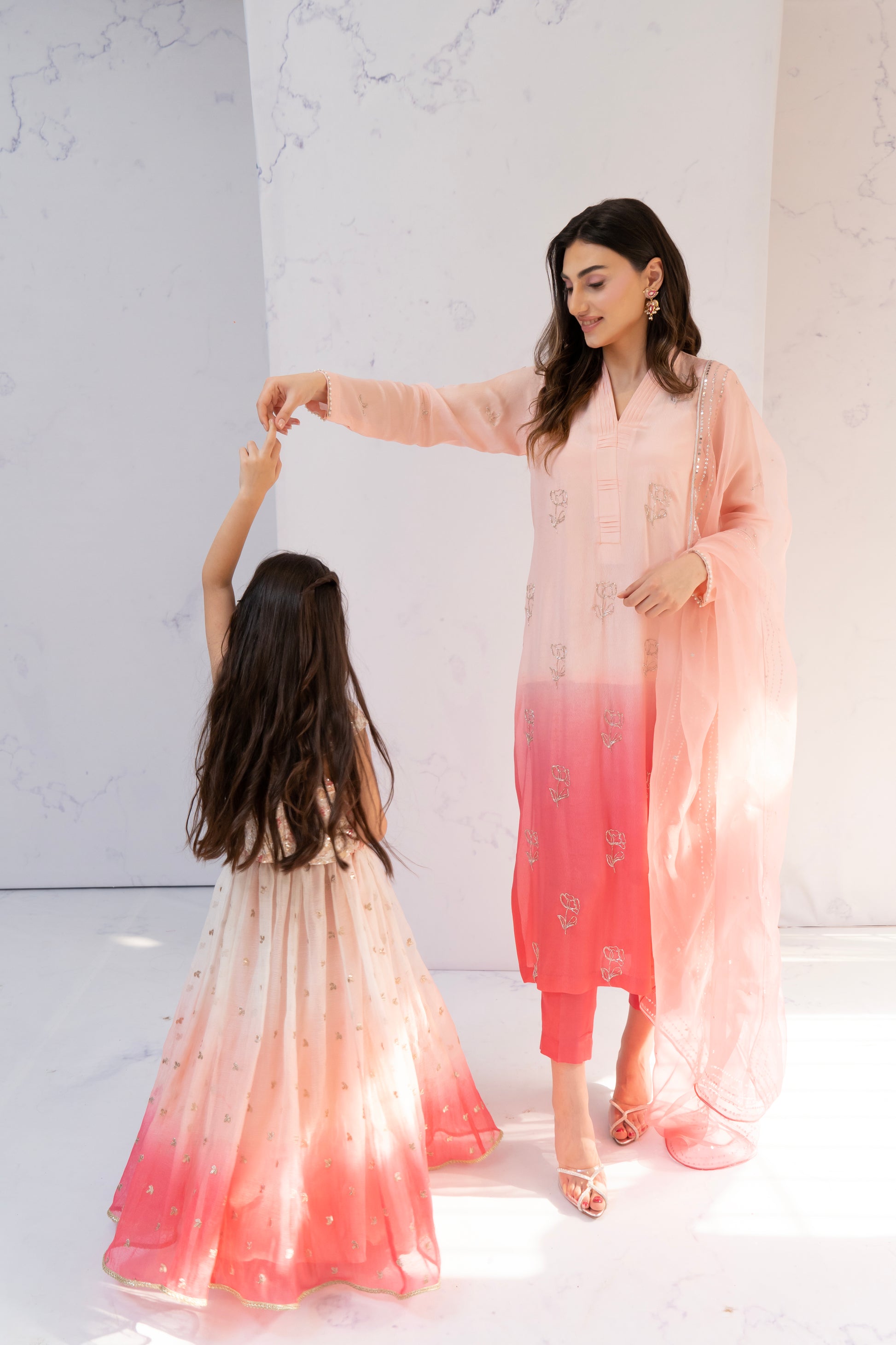 This crepe shaded silk shirt for women is adorned with exquisite handworked motifs all over, adding a touch of elegance and luxury to any outfit. The shirt features a flattering silhouette and is made from high-quality silk fabric, ensuring comfort and durability. It can be paired with the pure organza shaded dupatta which comes with beautiful borders, completing the outfit with a graceful touch. For girls, the ensemble includes a matching shaded sharara with a printed top and delicate pearl details, making it a perfect choice for special occasions or festive events.