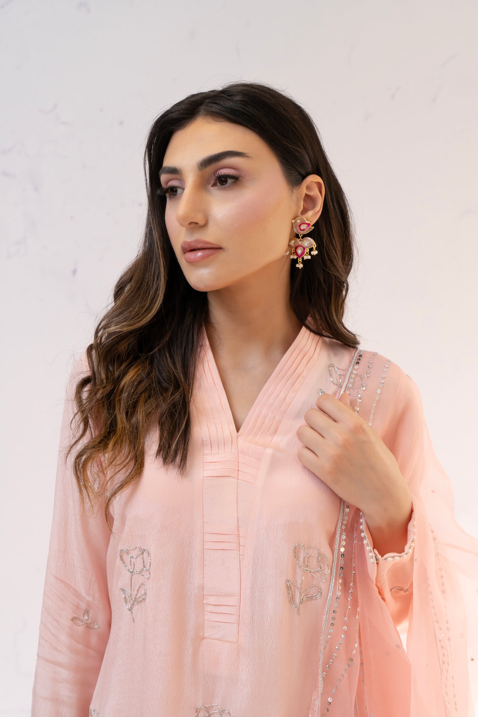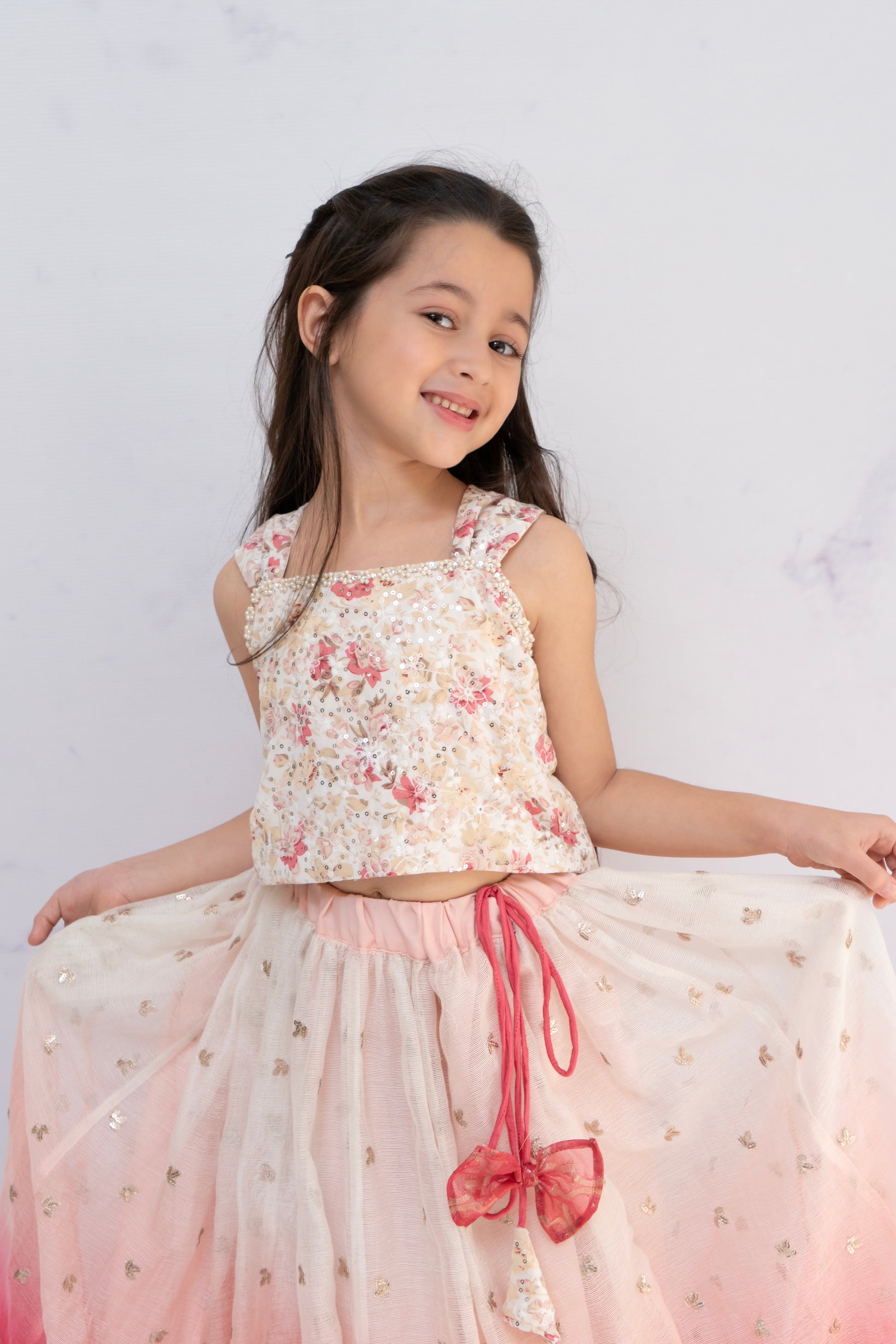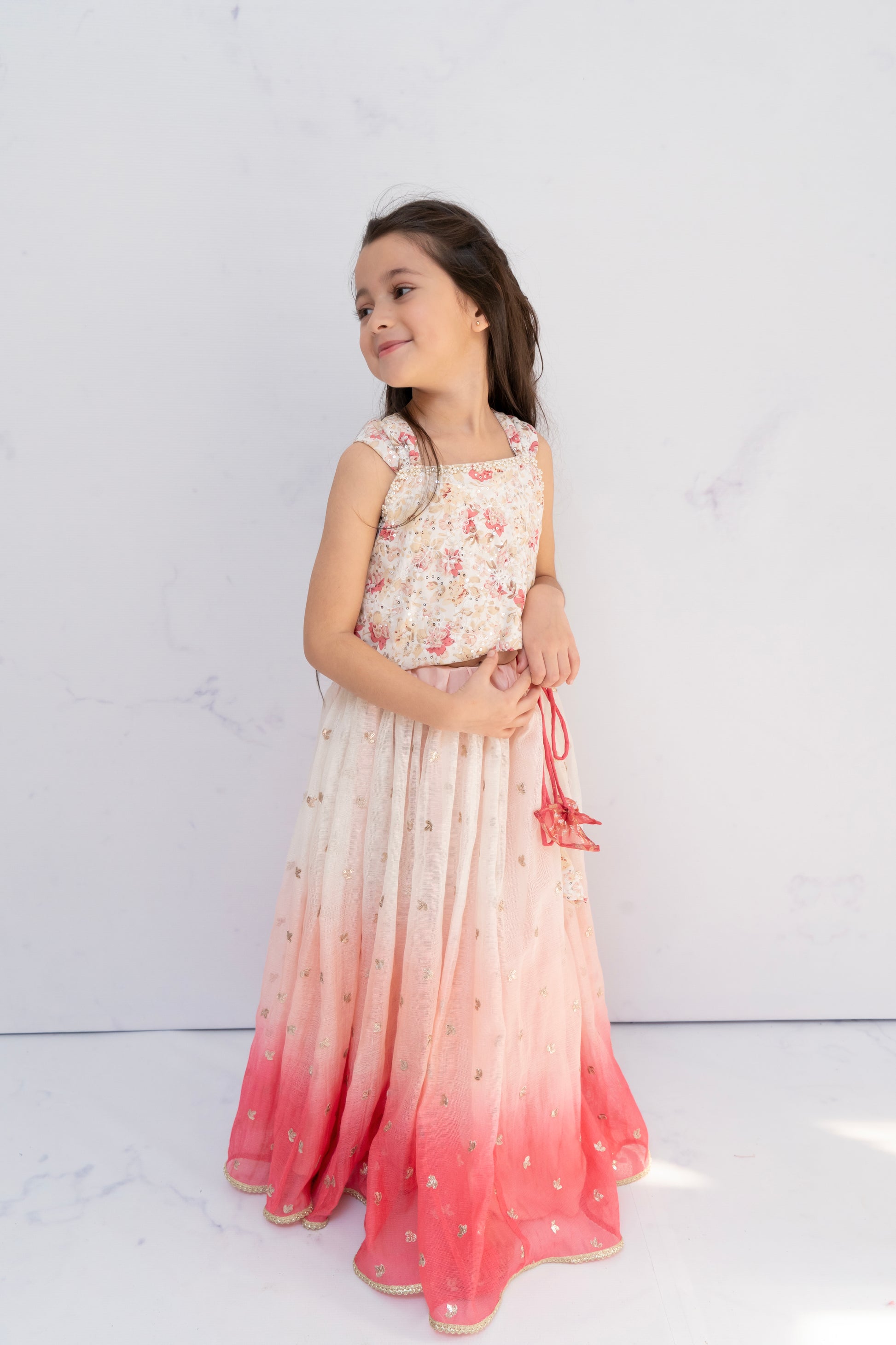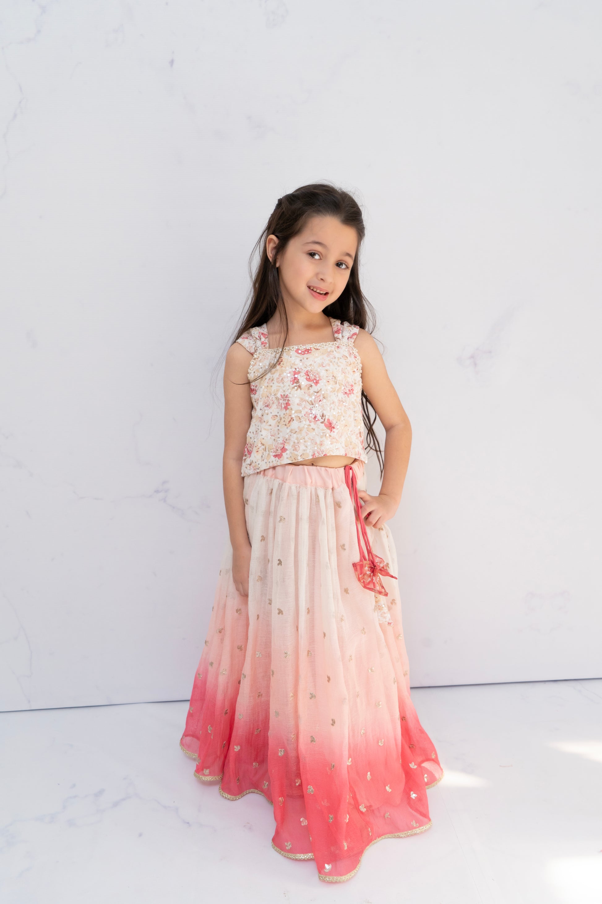 This crepe shaded silk shirt for women is adorned with exquisite handworked motifs all over, adding a touch of elegance and luxury to any outfit. The shirt features a flattering silhouette and is made from high-quality silk fabric, ensuring comfort and durability. It can be paired with the pure organza shaded dupatta which comes with beautiful borders, completing the outfit with a graceful touch. For girls, the ensemble includes a matching shaded sharara with a printed top and delicate pearl details, making it a perfect choice for special occasions or festive events.