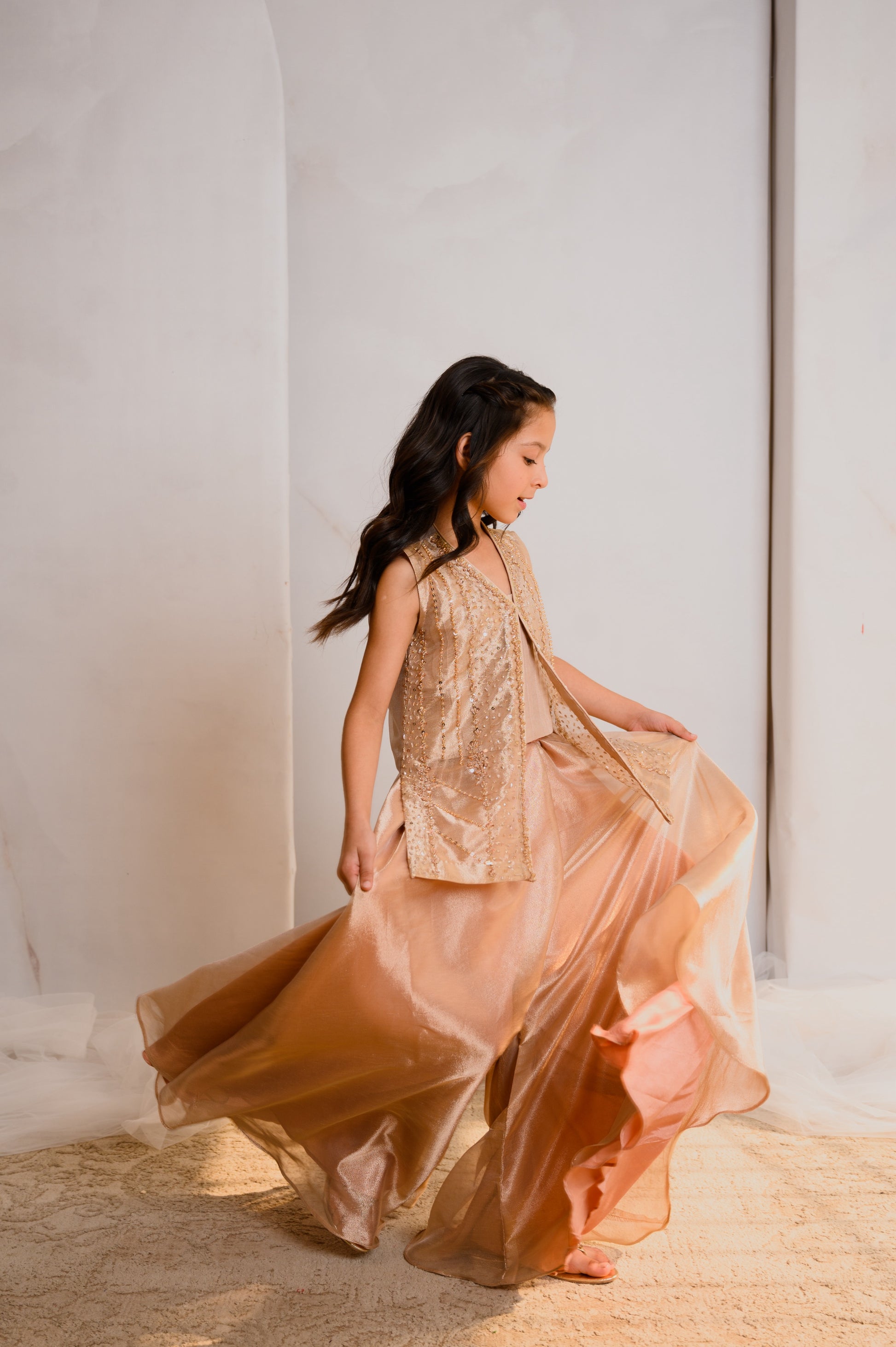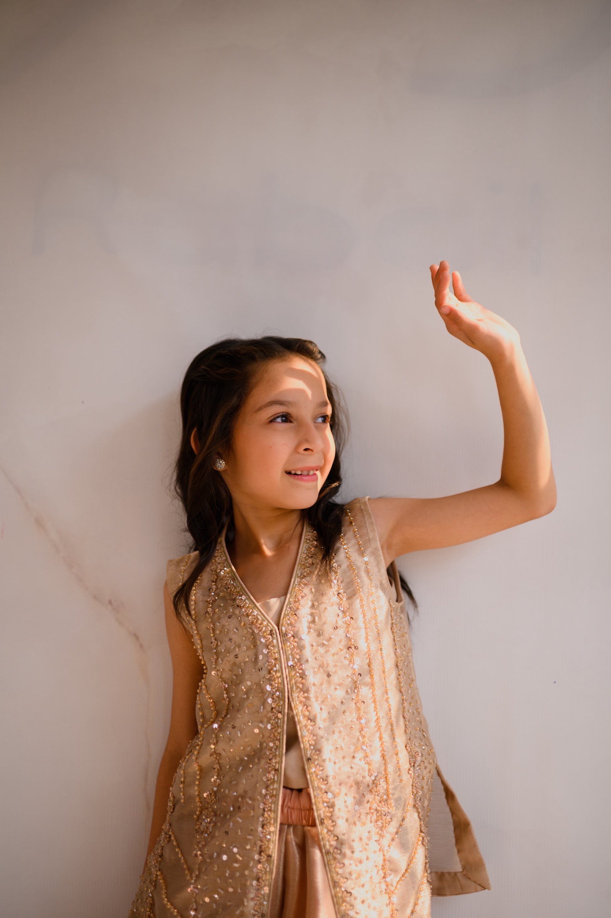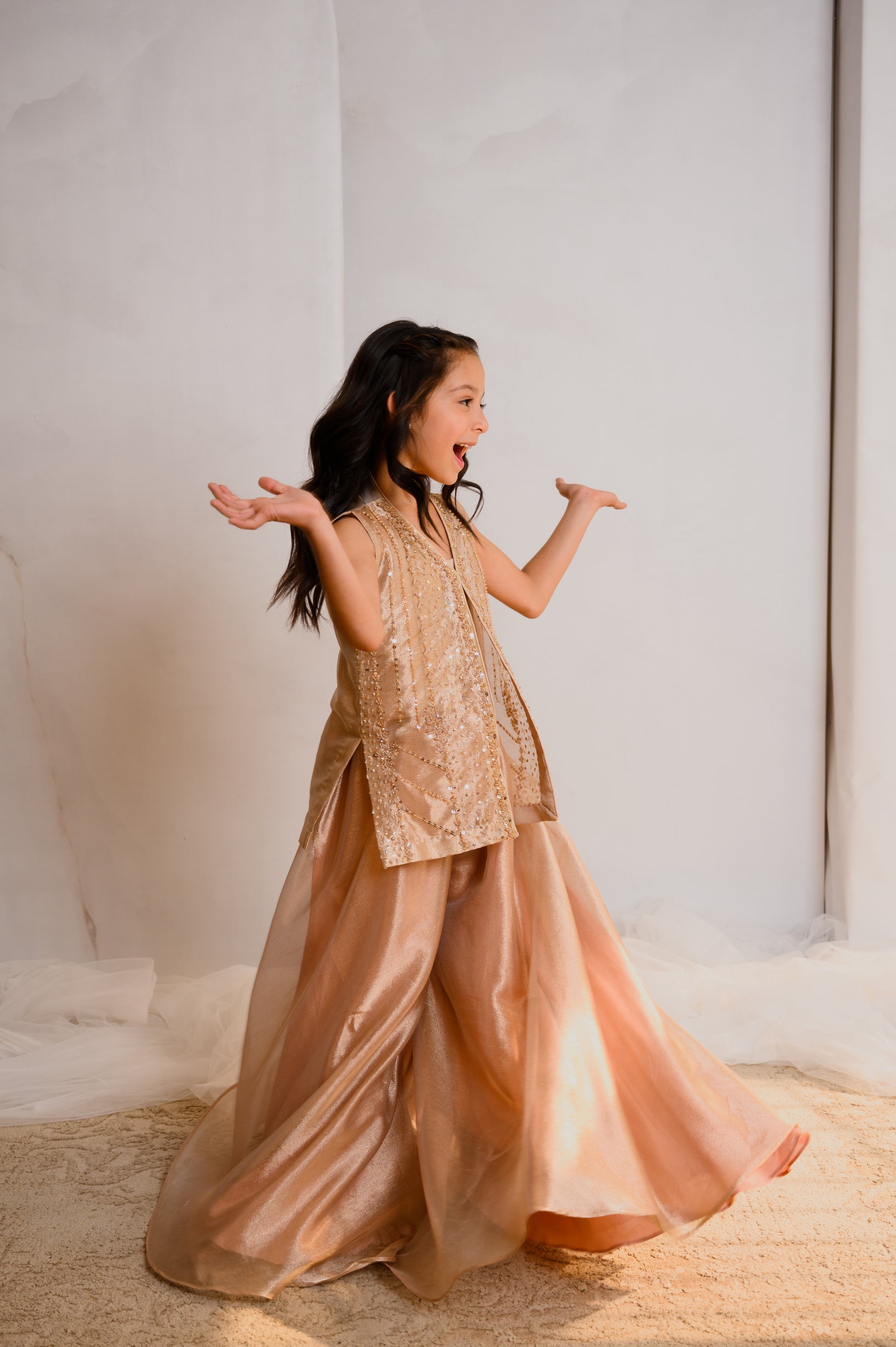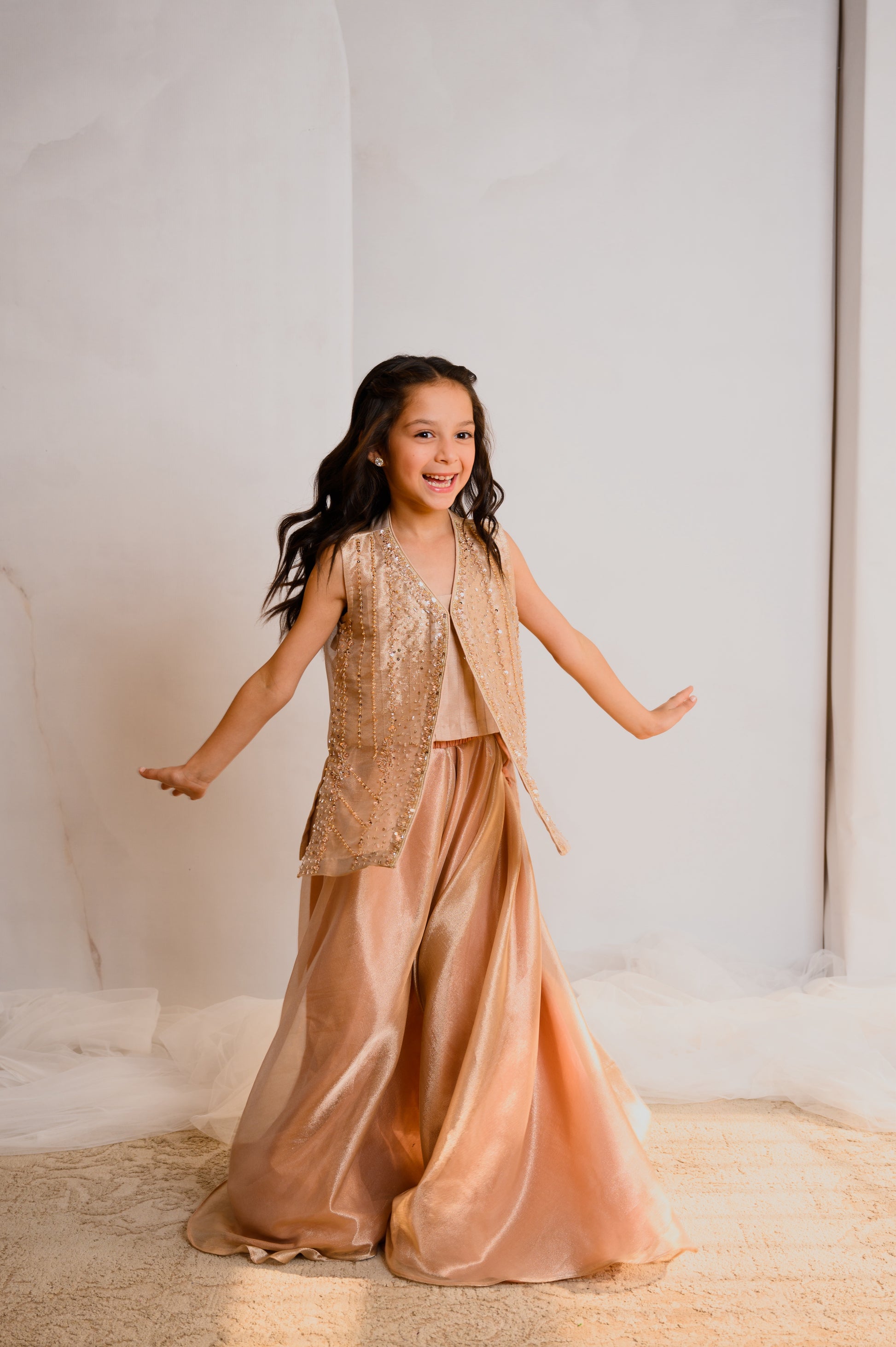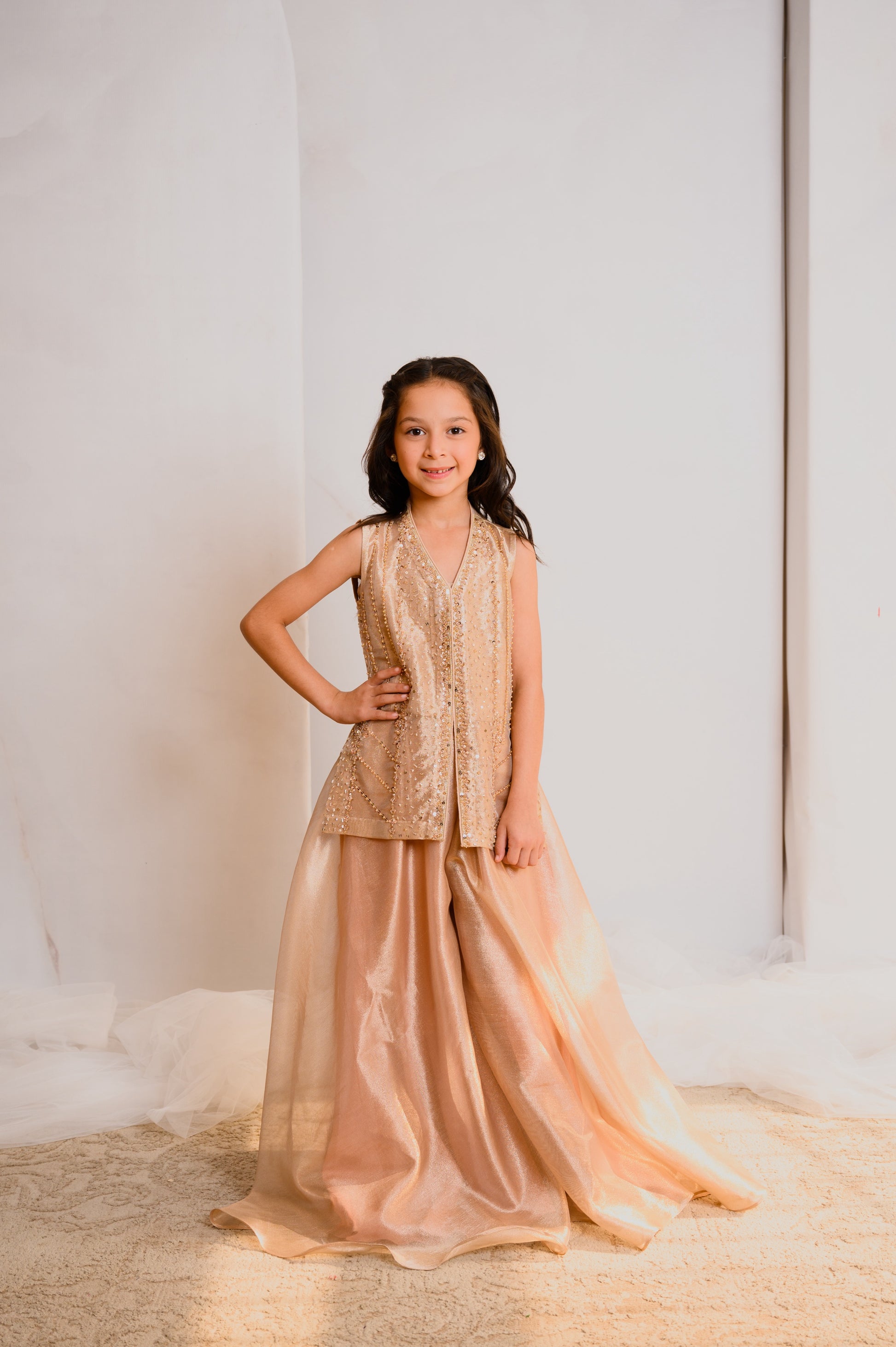 Adorn your little one in chic sophistication with this beige ensemble. The tissue jacket, embellished with Zardozi work, blends tradition and modernity. Stones and sequins add a touch of sparkle, creating a captivating charm. Paired with Dhaka pants, it's a fusion of comfort and elegance—a perfect blend for your little trendsetter