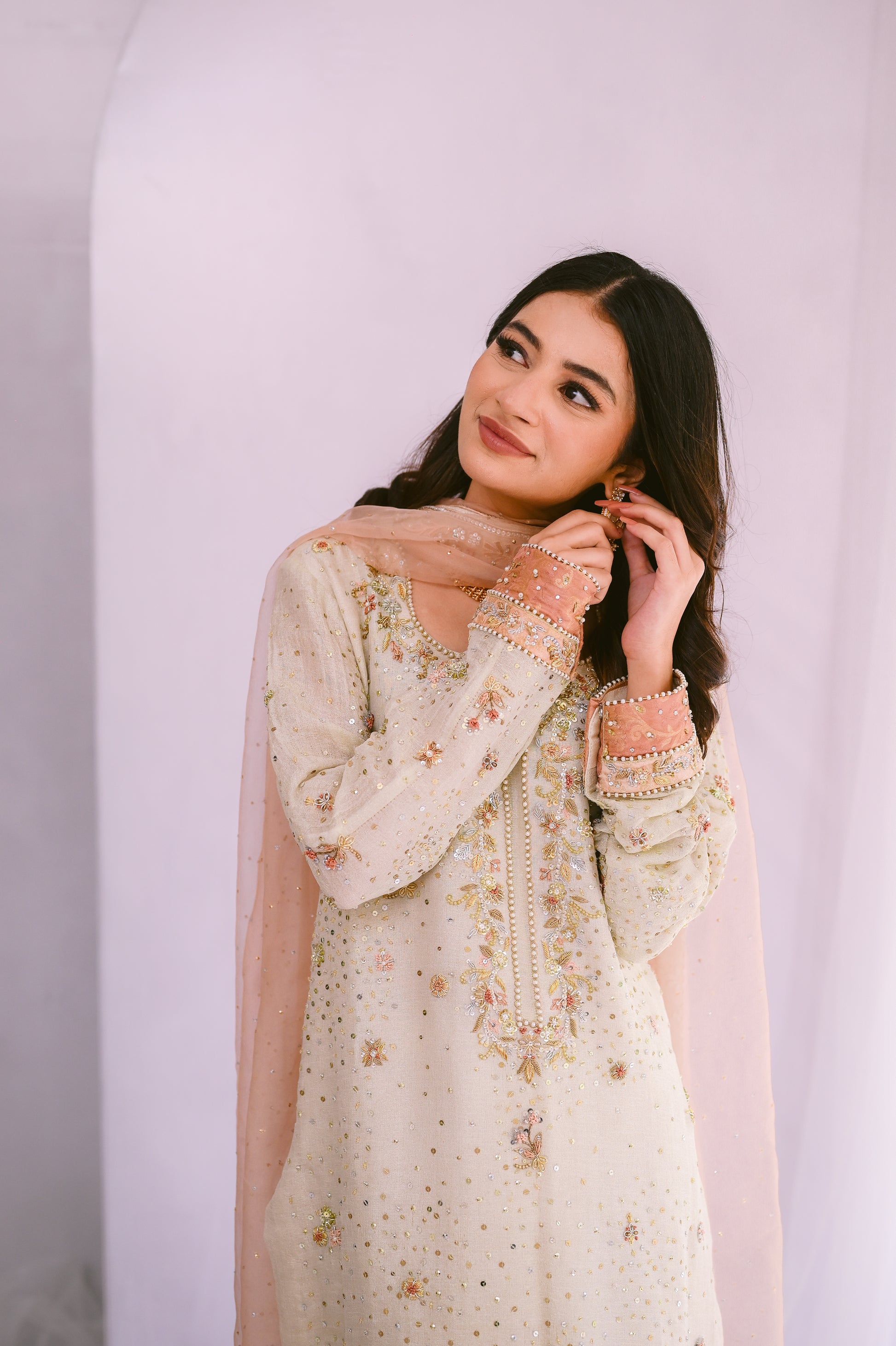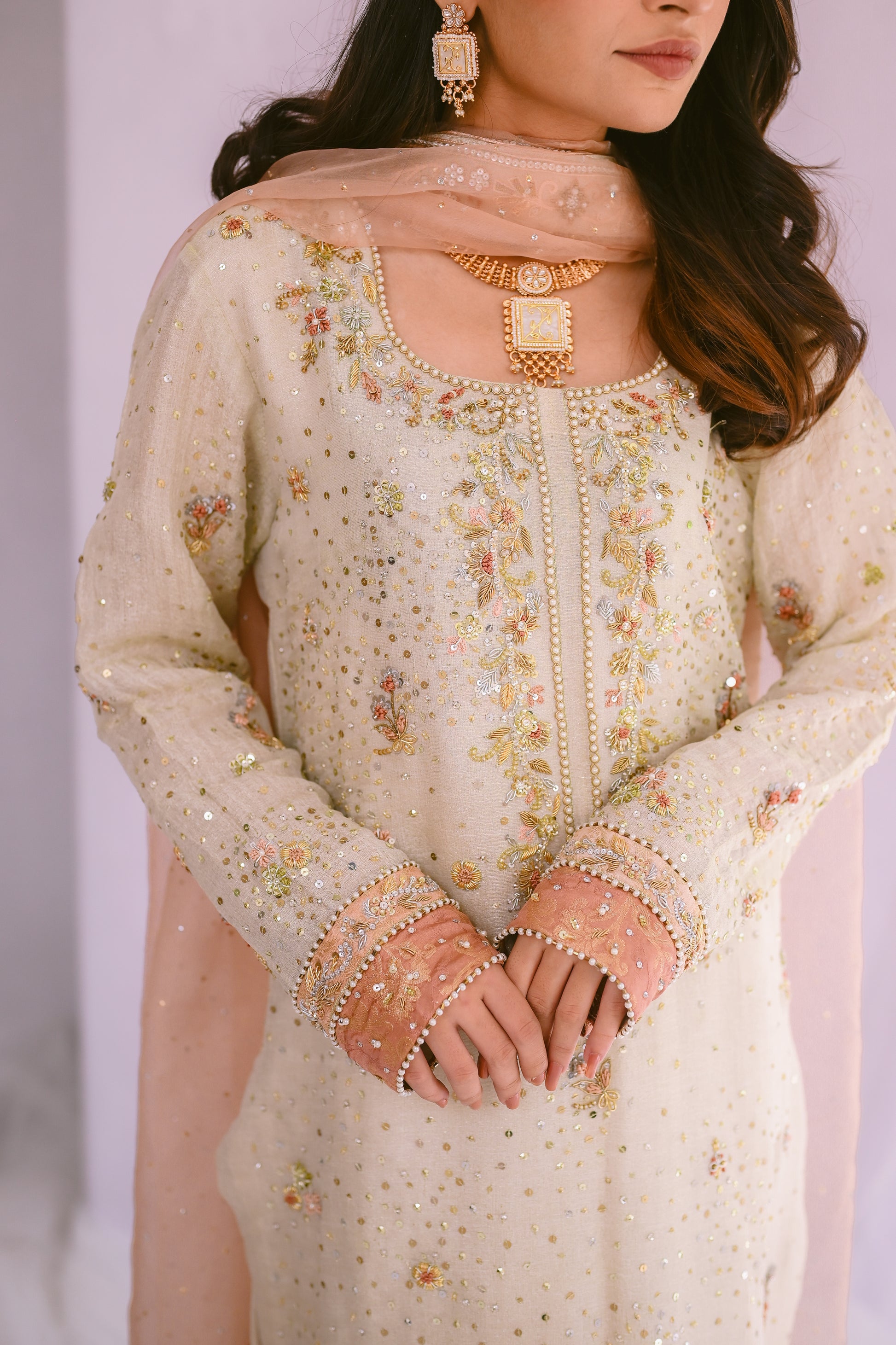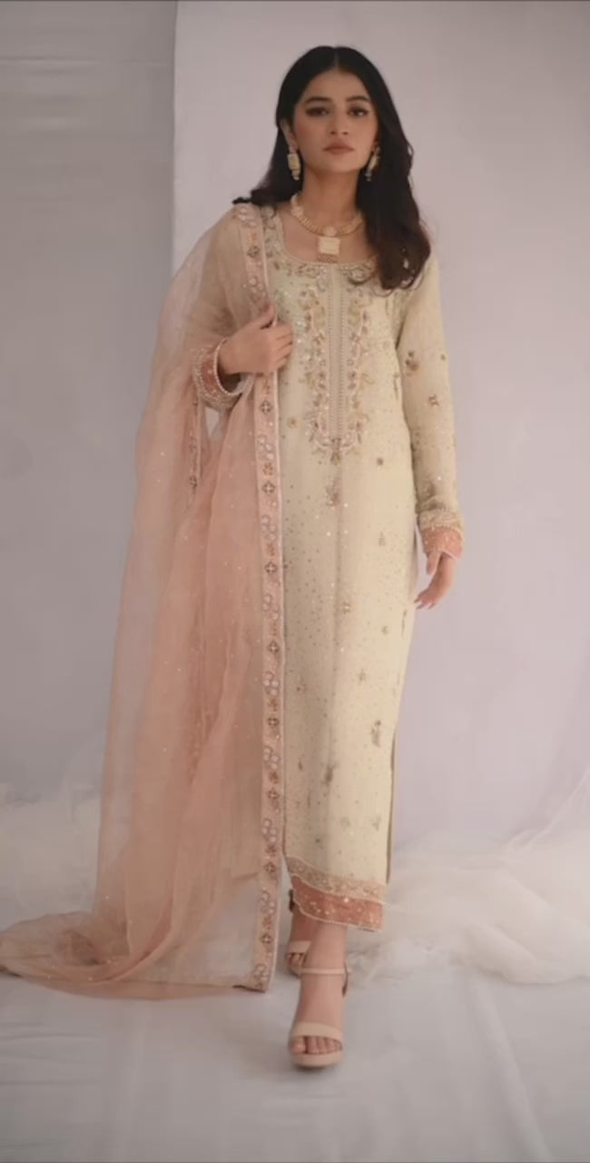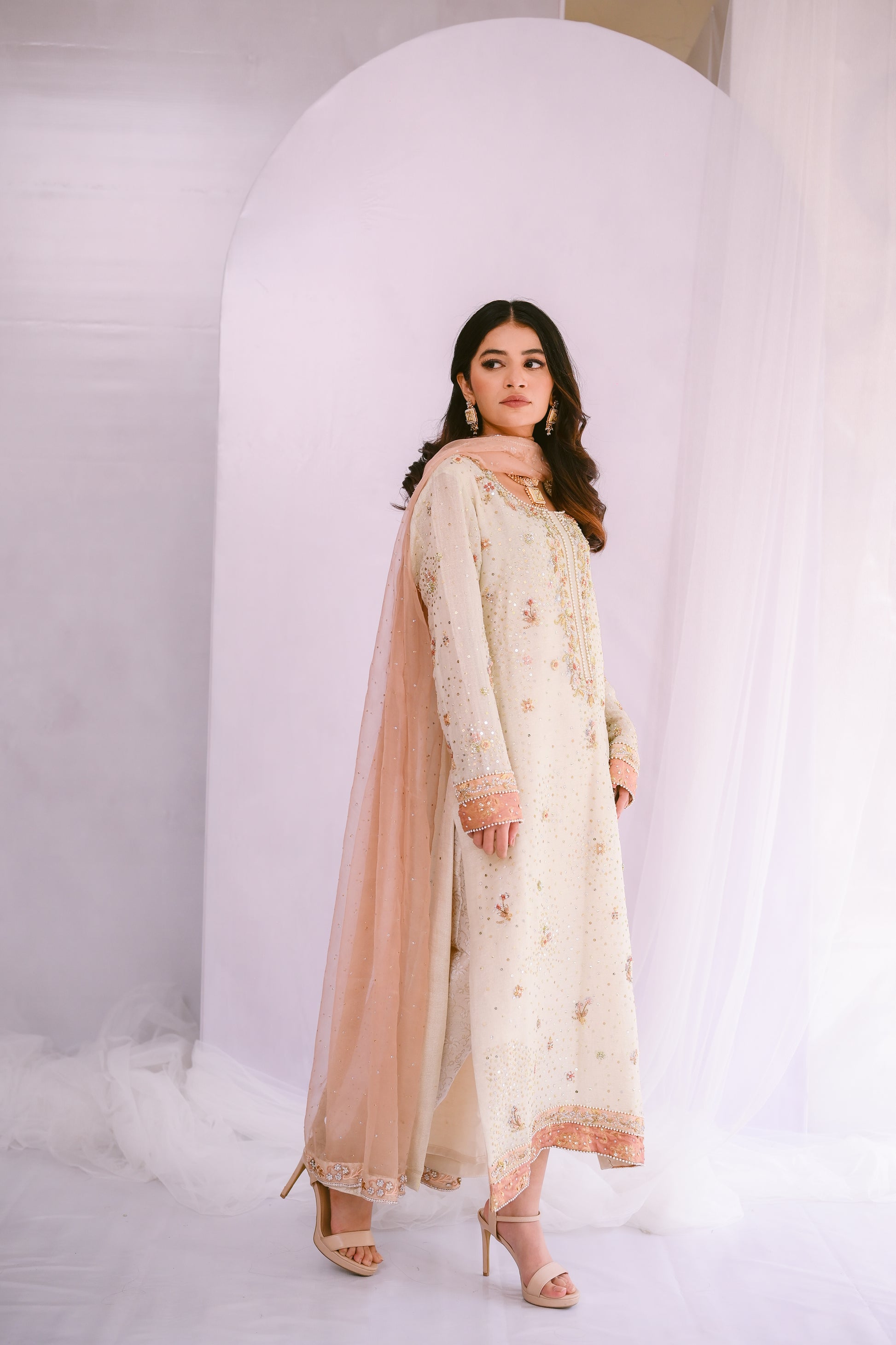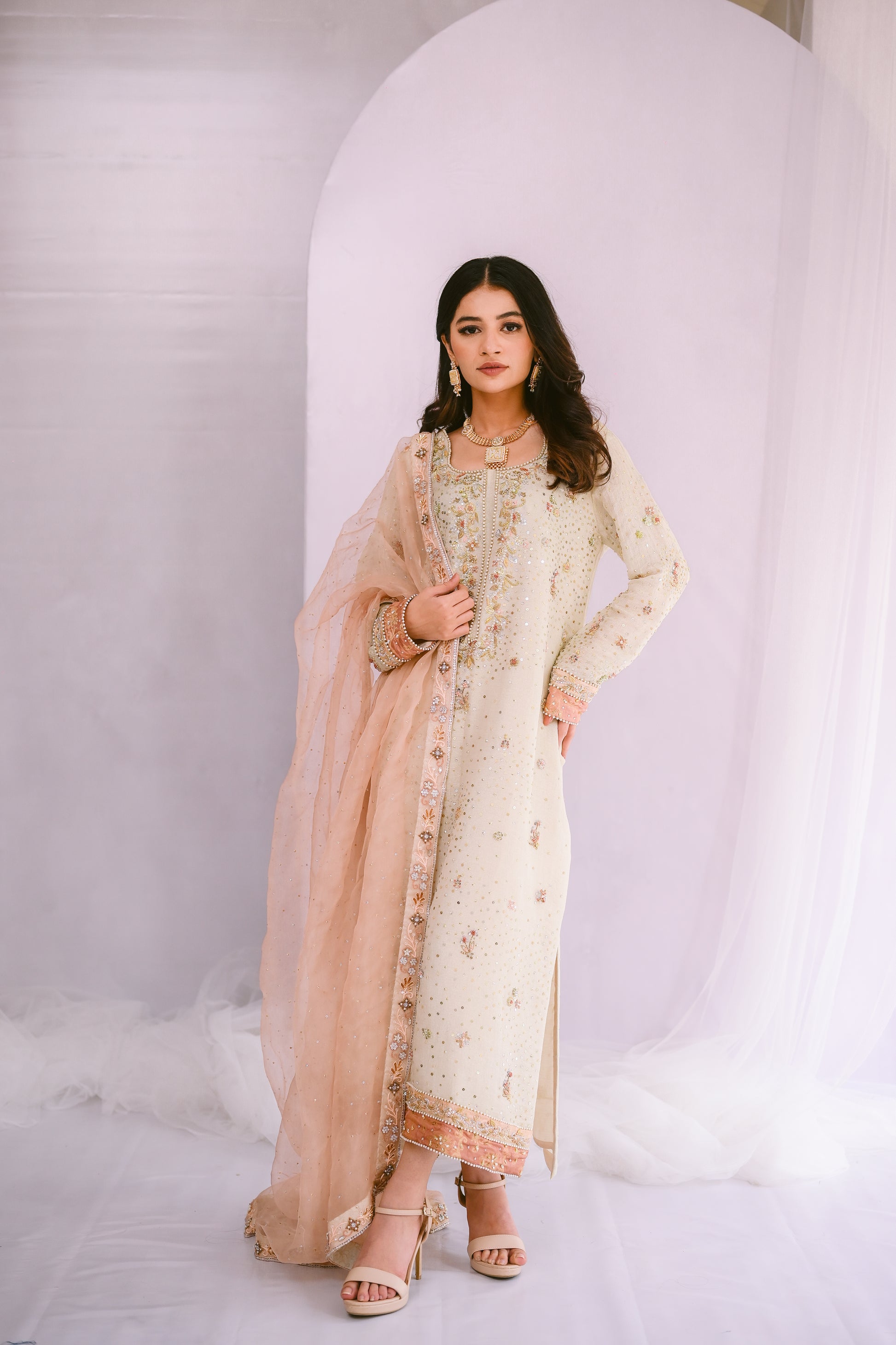 Radiate elegance in our Off-White and Peach Pure Maisoori Long Shirt, adorned with exquisite thread, sequins, zari, dabka, and stone work. The contrast pure organza dupatta, with its intricately worked borders and Chan detailing, adds a touch of sophistication and charm, making it perfect for any grand occasion