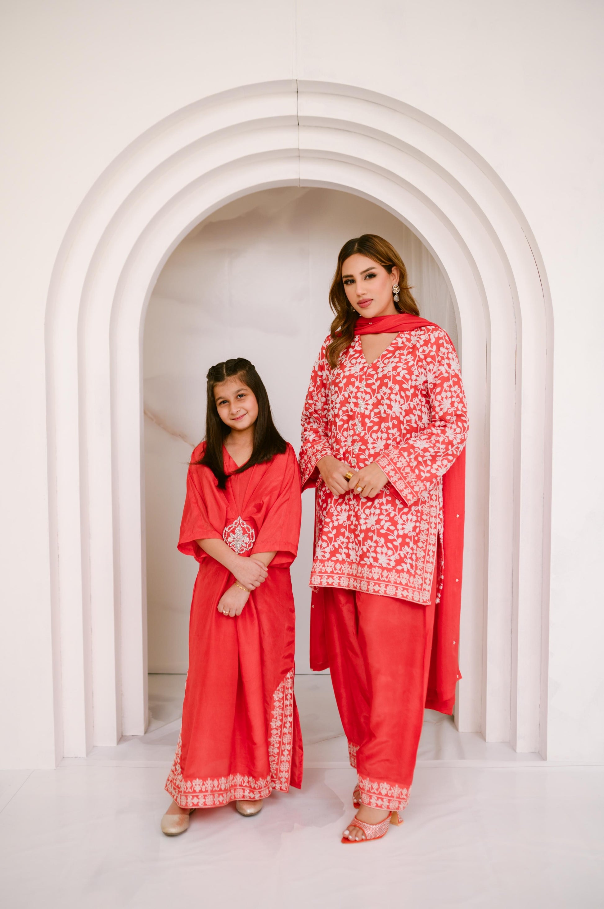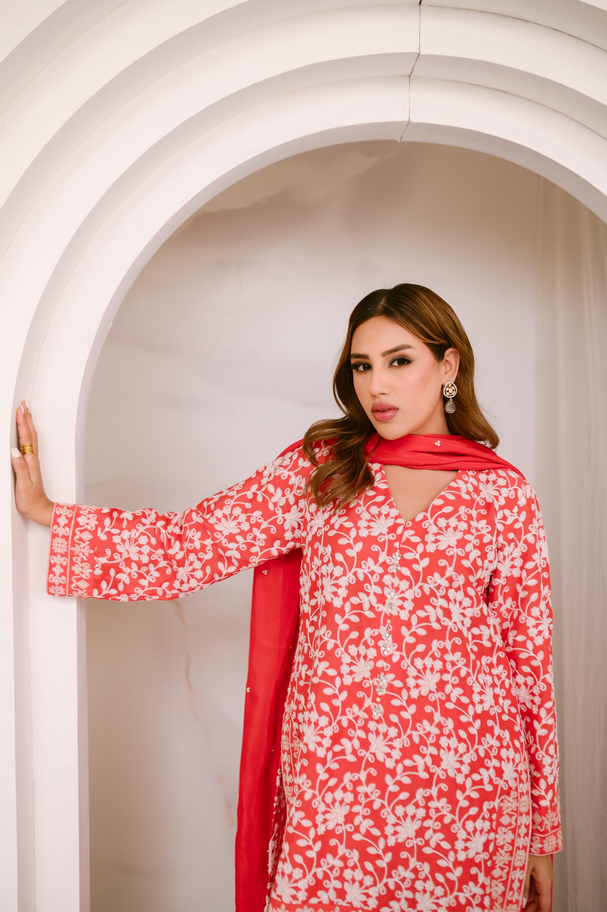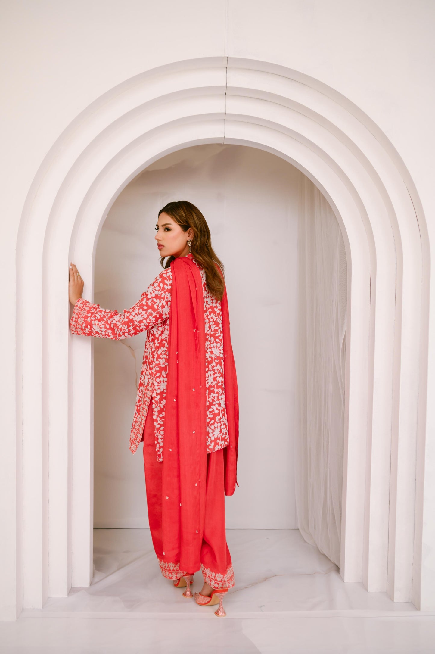 Introducing Coral – an exquisite orange silk ensemble featuring a stylish short shirt adorned with intricate machine Aari work all over. Paired with a beautifully crafted silk shalwar with elegant borders, this outfit also includes a luxurious silk dupatta embellished with pearls and stunning stone work trimmings along the neckline, making it a perfect choice for any festive occasion. Experience elegance and tradition with every wear!