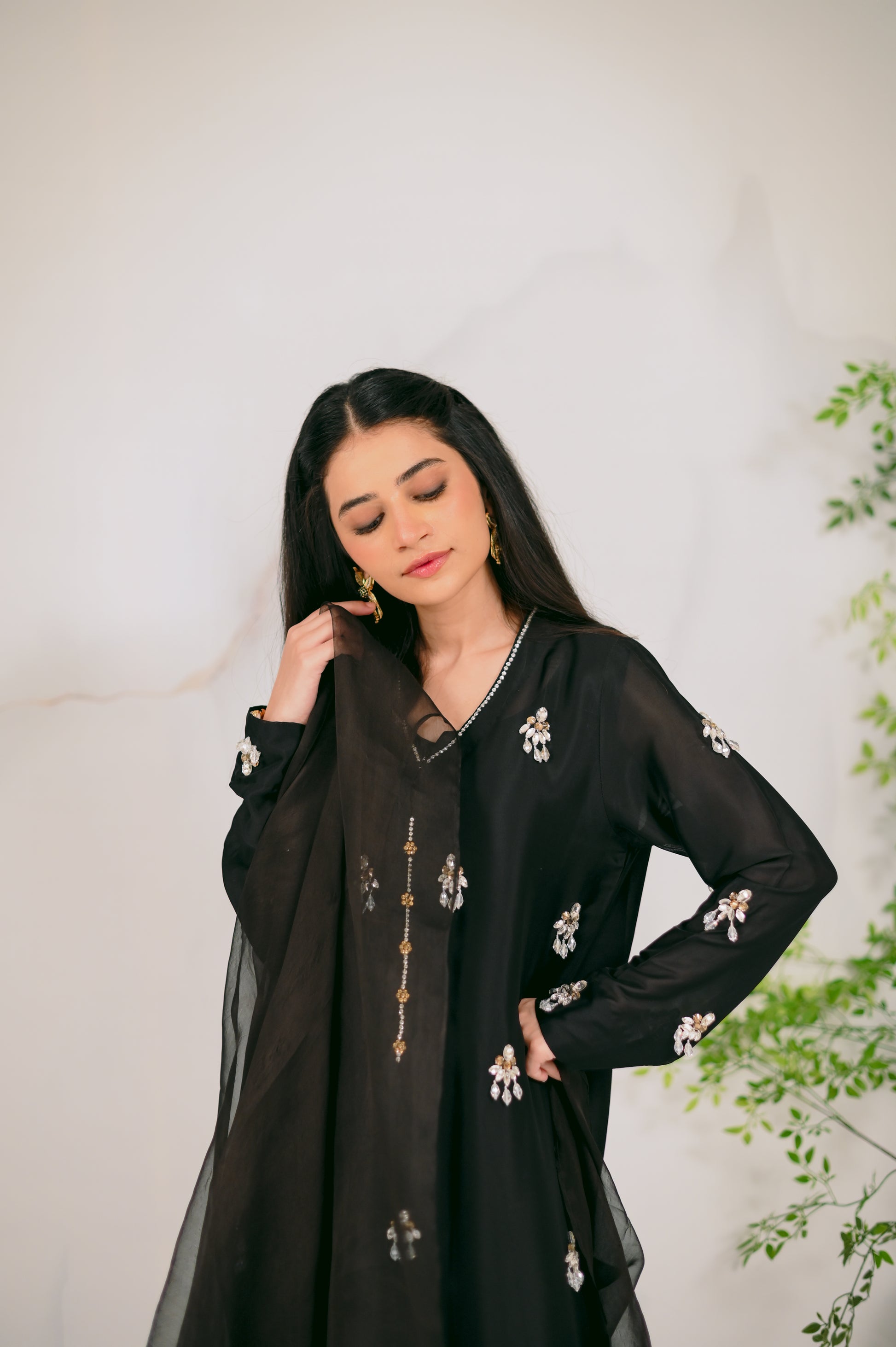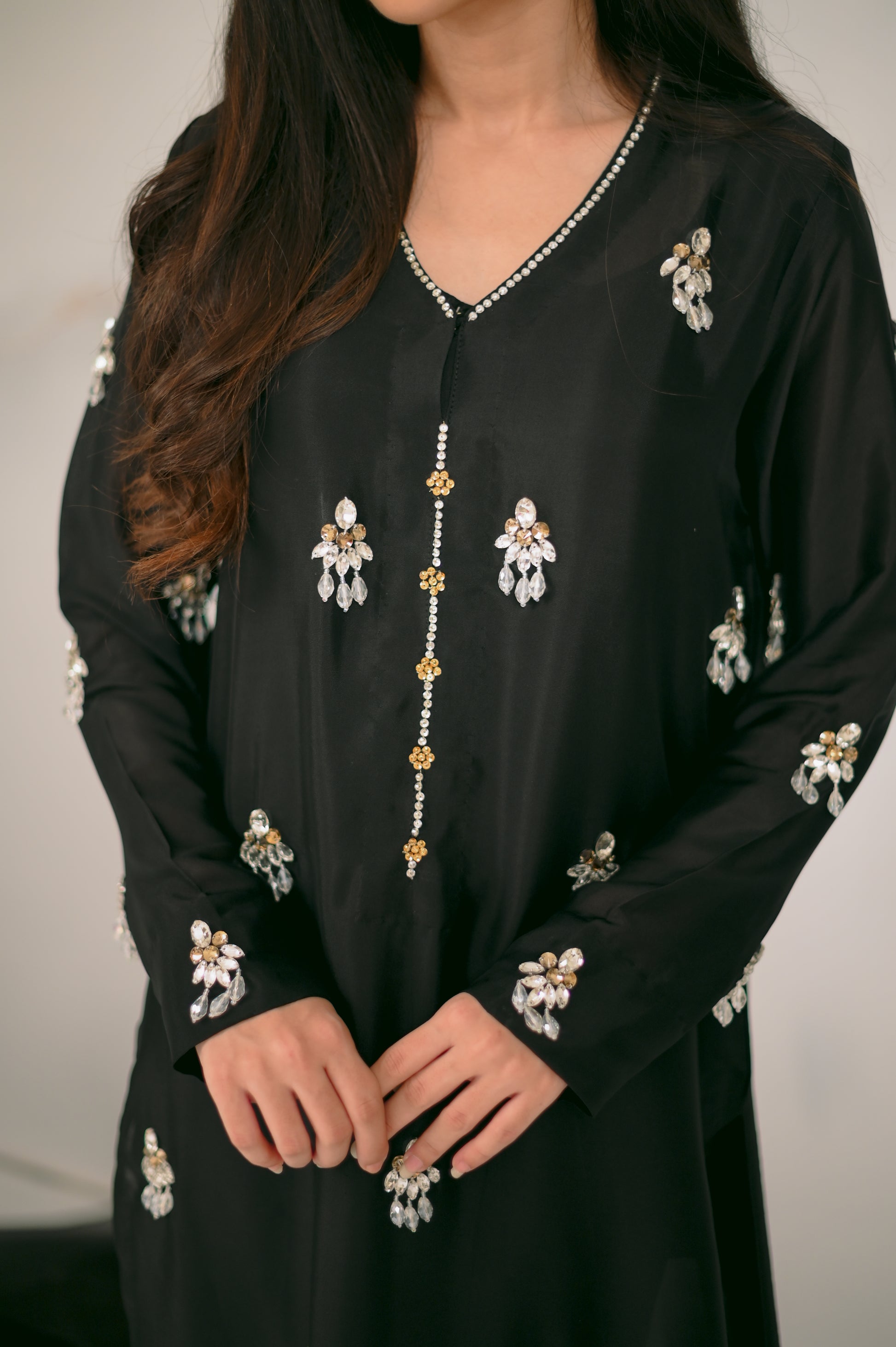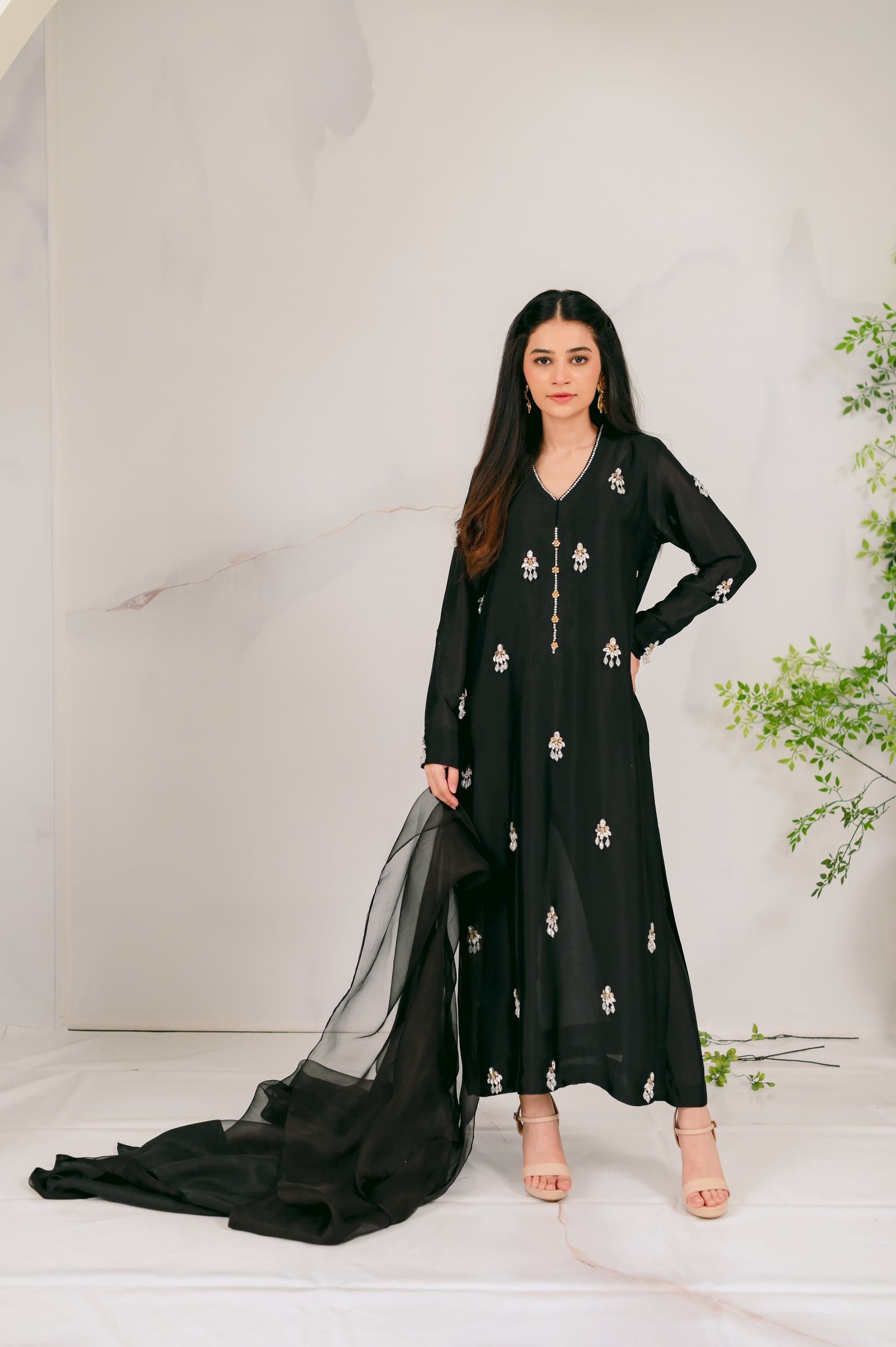 Elevate your festive wardrobe this Eid with our stunning black long Sheesha silk shirt, adorned with exquisite stone and crystal embellishments that catch the light beautifully. Its luxurious fabric offers a graceful drape, while the intricate detailing adds a touch of opulence. Paired with a plain organza dupatta, this ensemble is perfect for a sophisticated yet stylish look. Shop now to make a statement at your Eid celebrations!