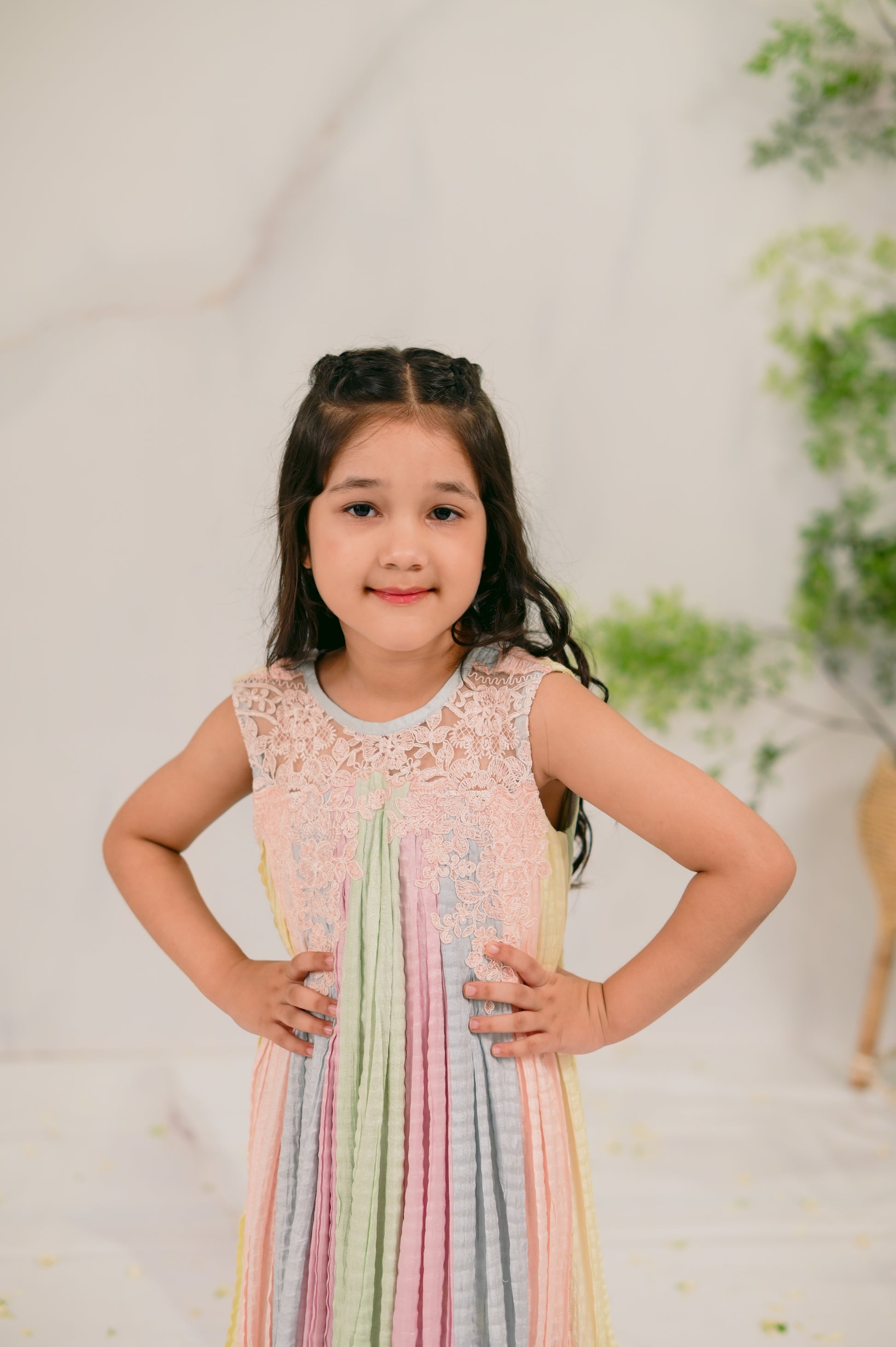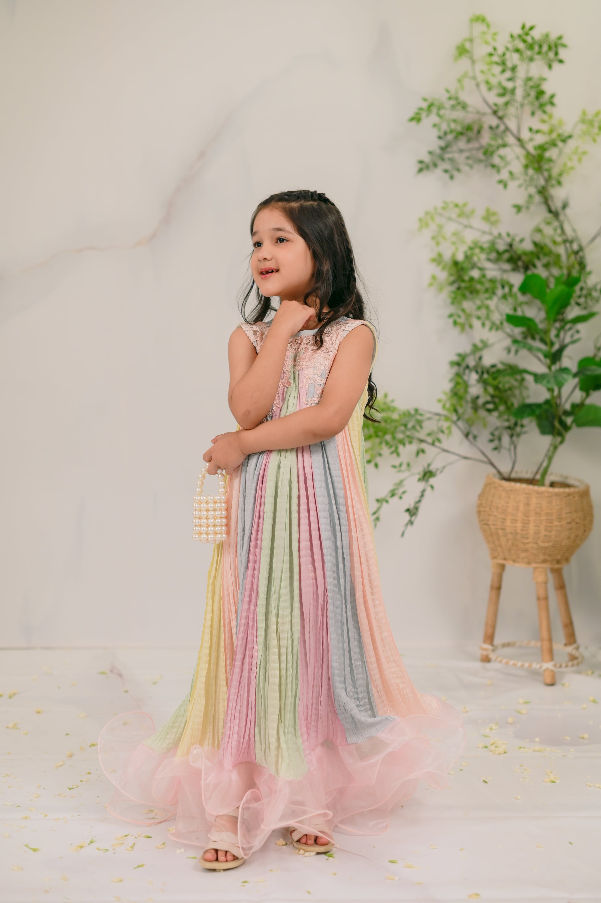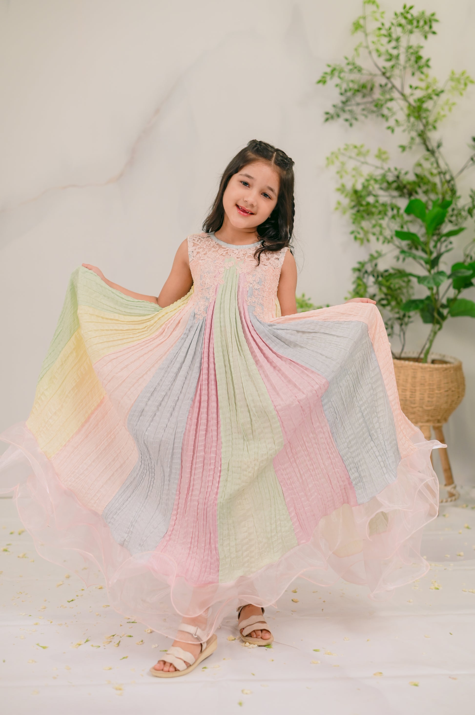Introducing Day Dream: a captivating kids' eastern wear piece designed for Eid celebrations. This enchanting one-piece outfit features a beautiful blend of five dreamy pastels, exuding charm and elegance. Delicate lace trimmings adorn the neckline, while playful frills at the bottom add a whimsical touch. Perfect for your little ones to shine during festive occasions, Day Dream combines comfort and style, making it an essential addition to their wardrobe. Shop now and let your kids embrace the magic of Eid in this stunning outfit!
