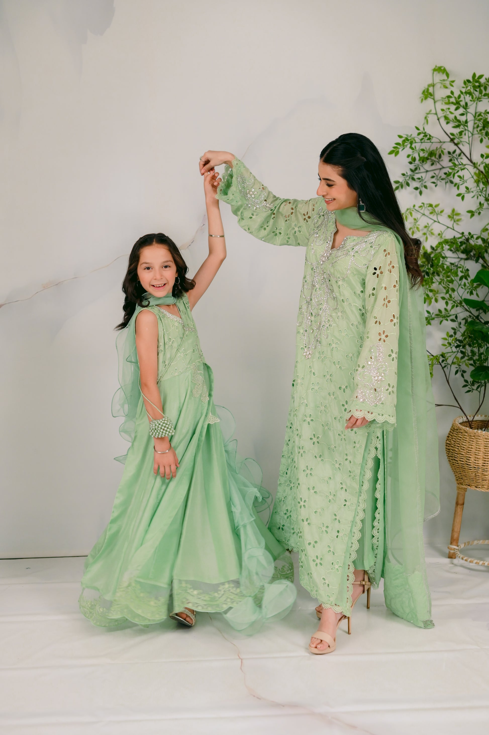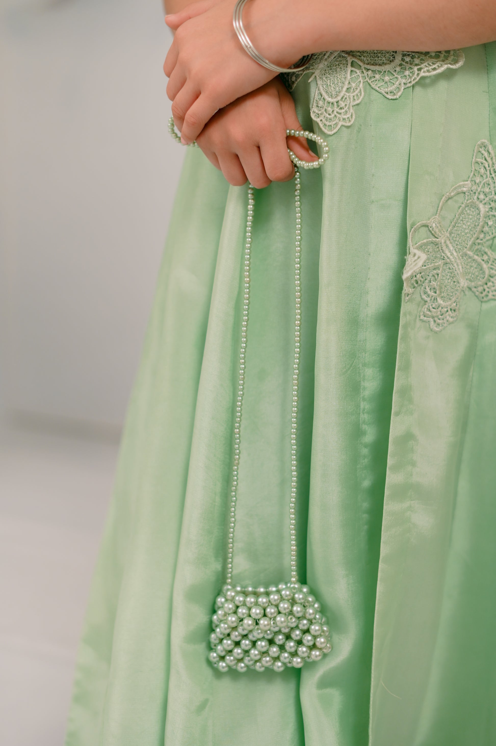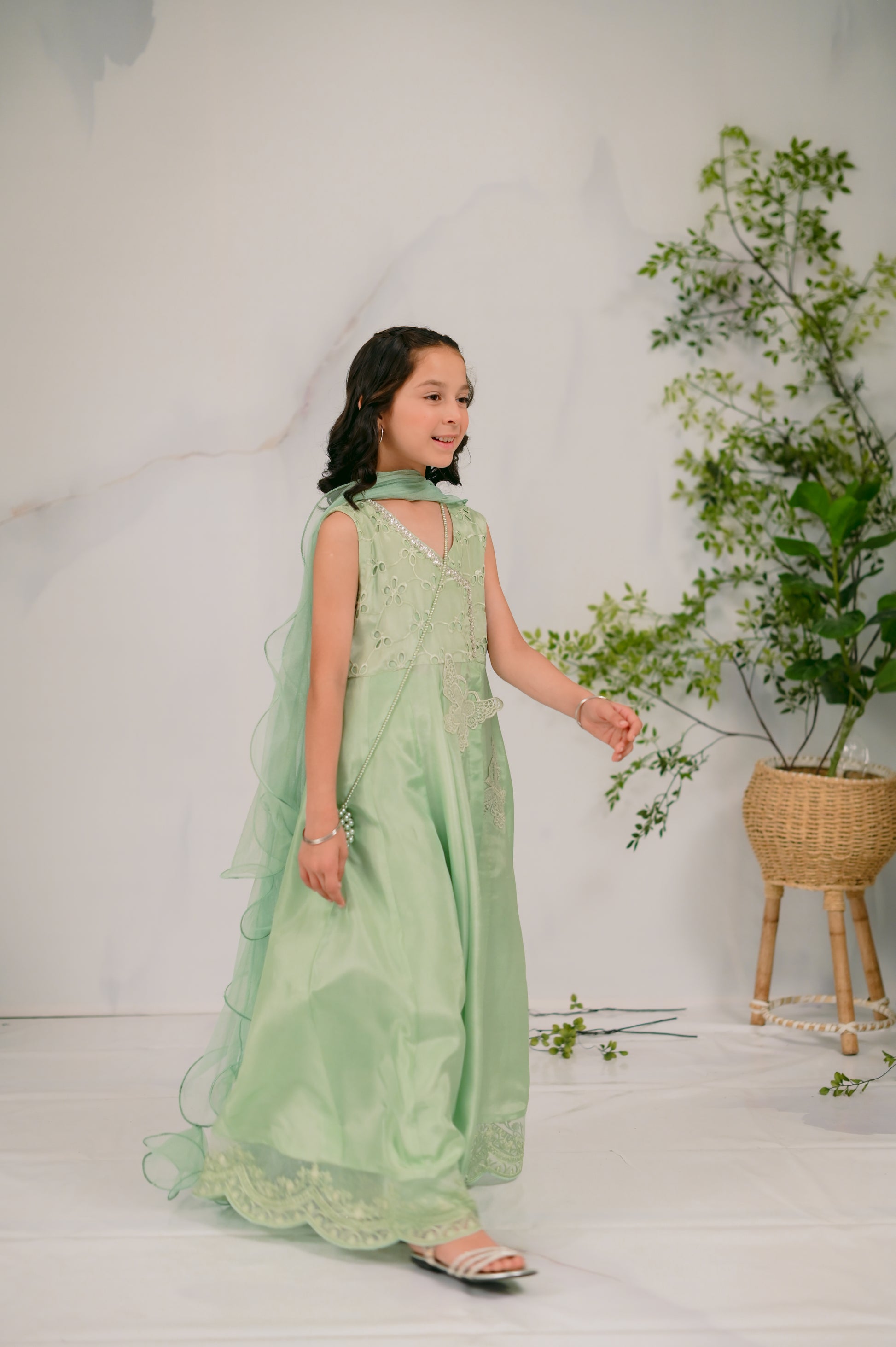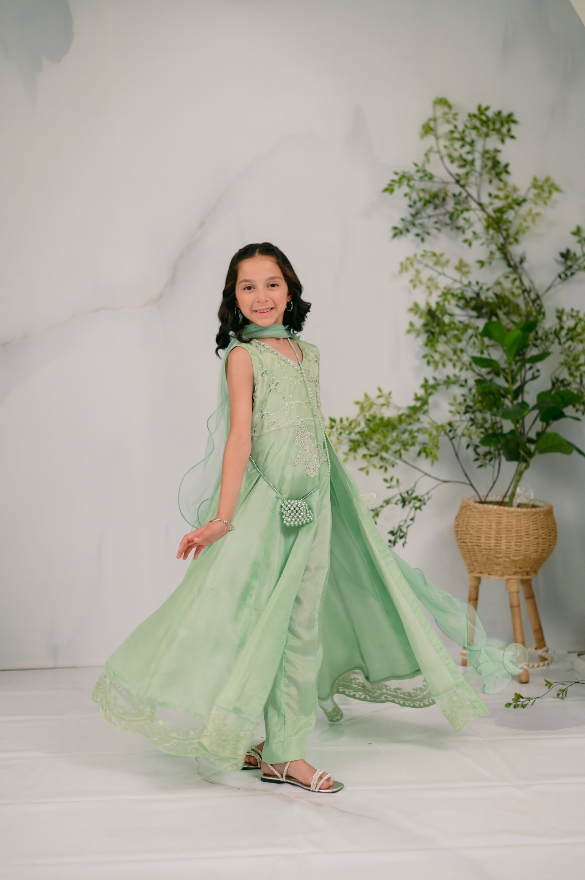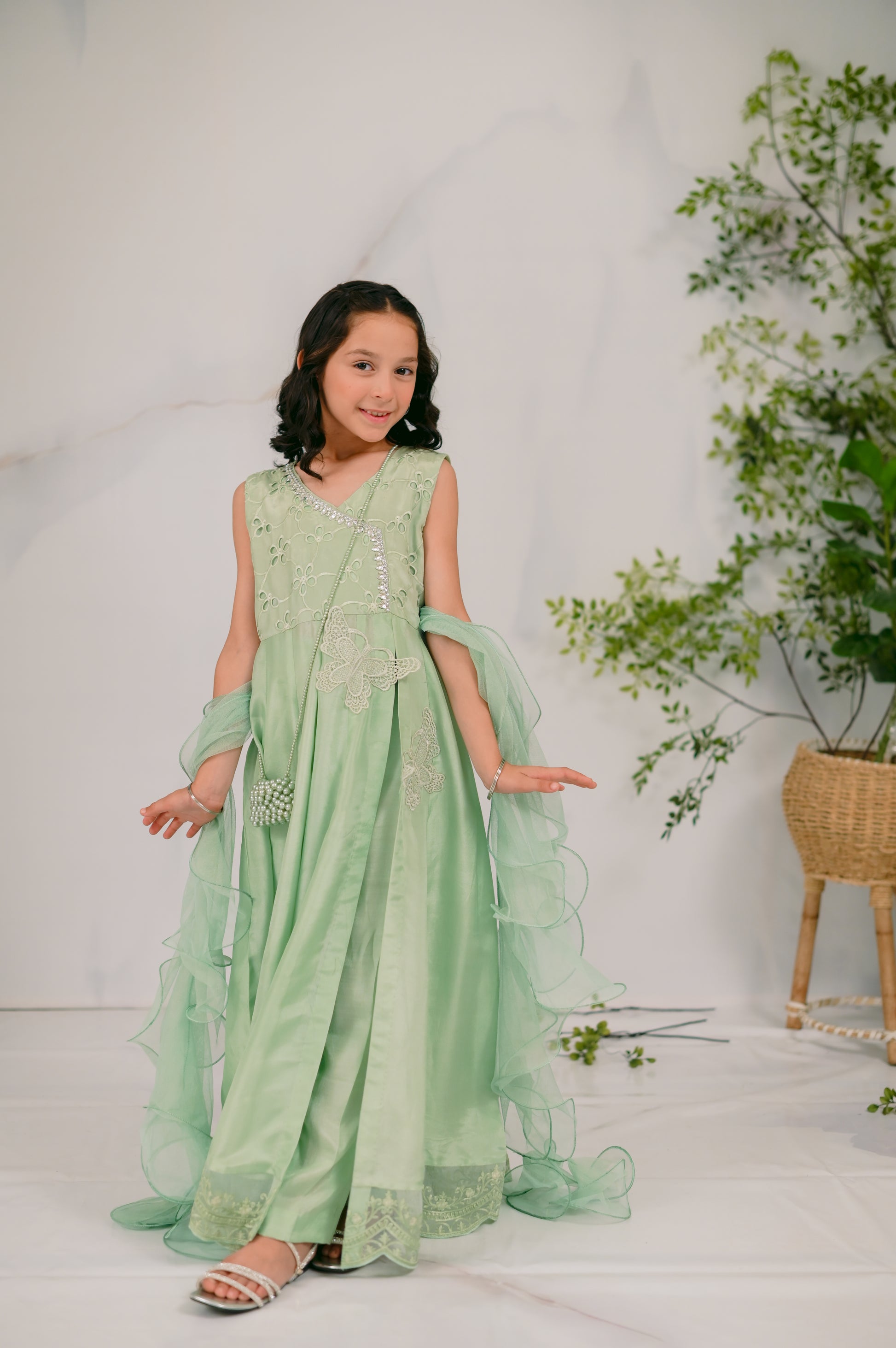 Elevate your ethnic wardrobe with our stunning Mint Green Angarkha, crafted from luxurious Sheesha silk. This exquisite piece features intricate cutwork on the body, complemented by a graceful silk flair adorned with delicate butterflies and a stylish lace border. The captivating neckline is embellished with elegant stone work for a touch of sophistication. Perfect for festive occasions or intimate gatherings, this Angarkha seamlessly blends tradition with modern design. Shop now for a timeless addition to your collection!