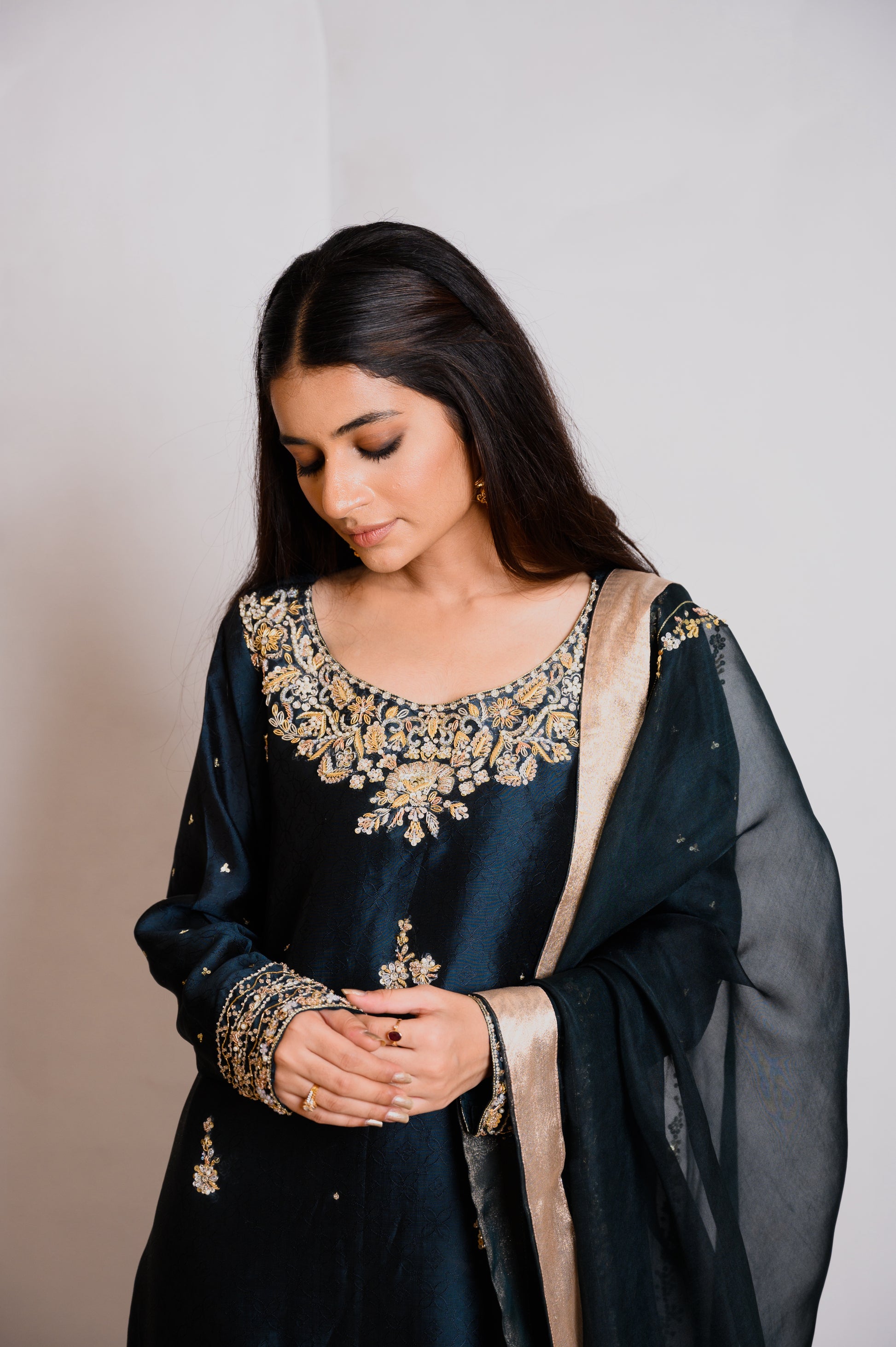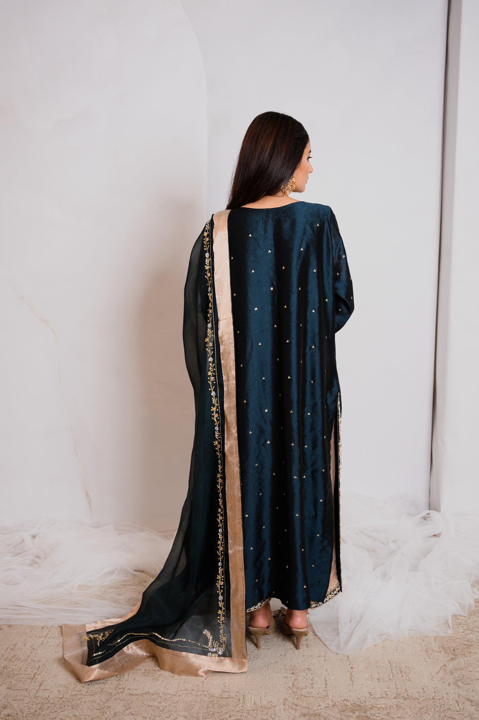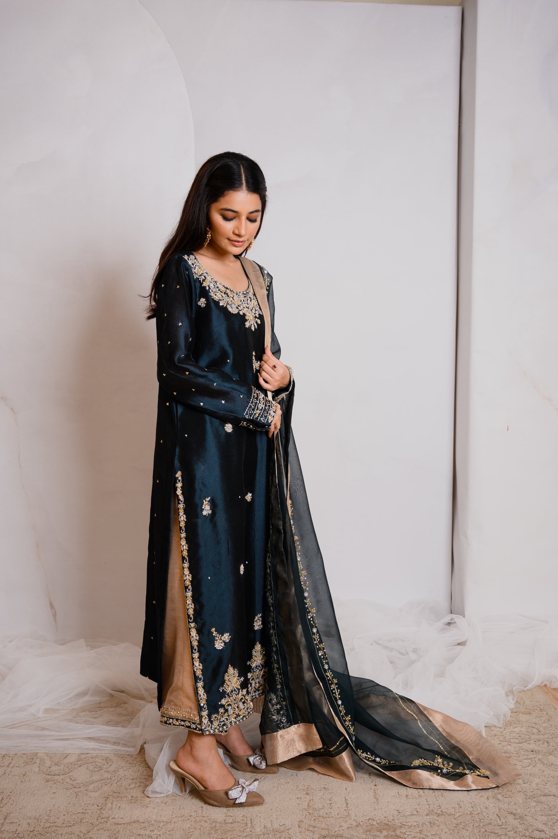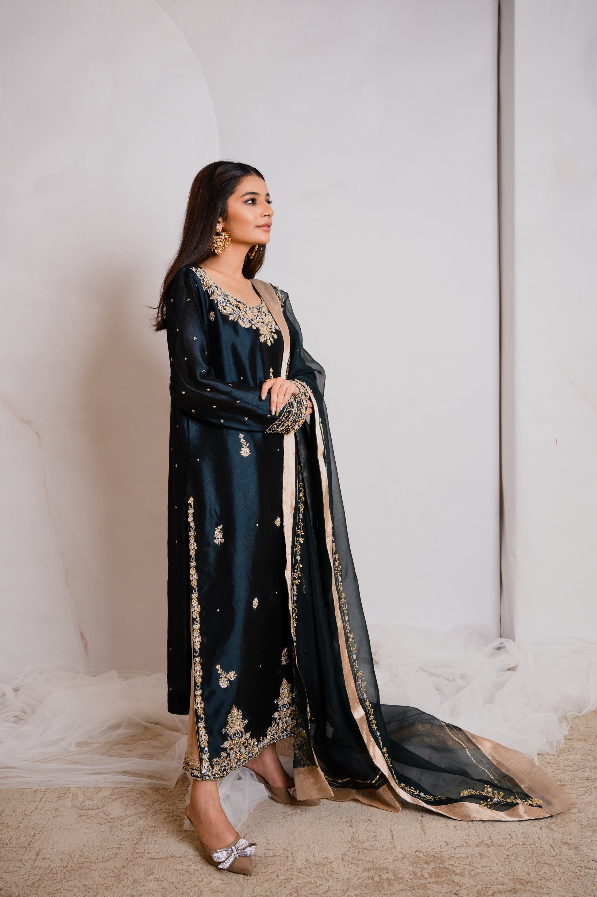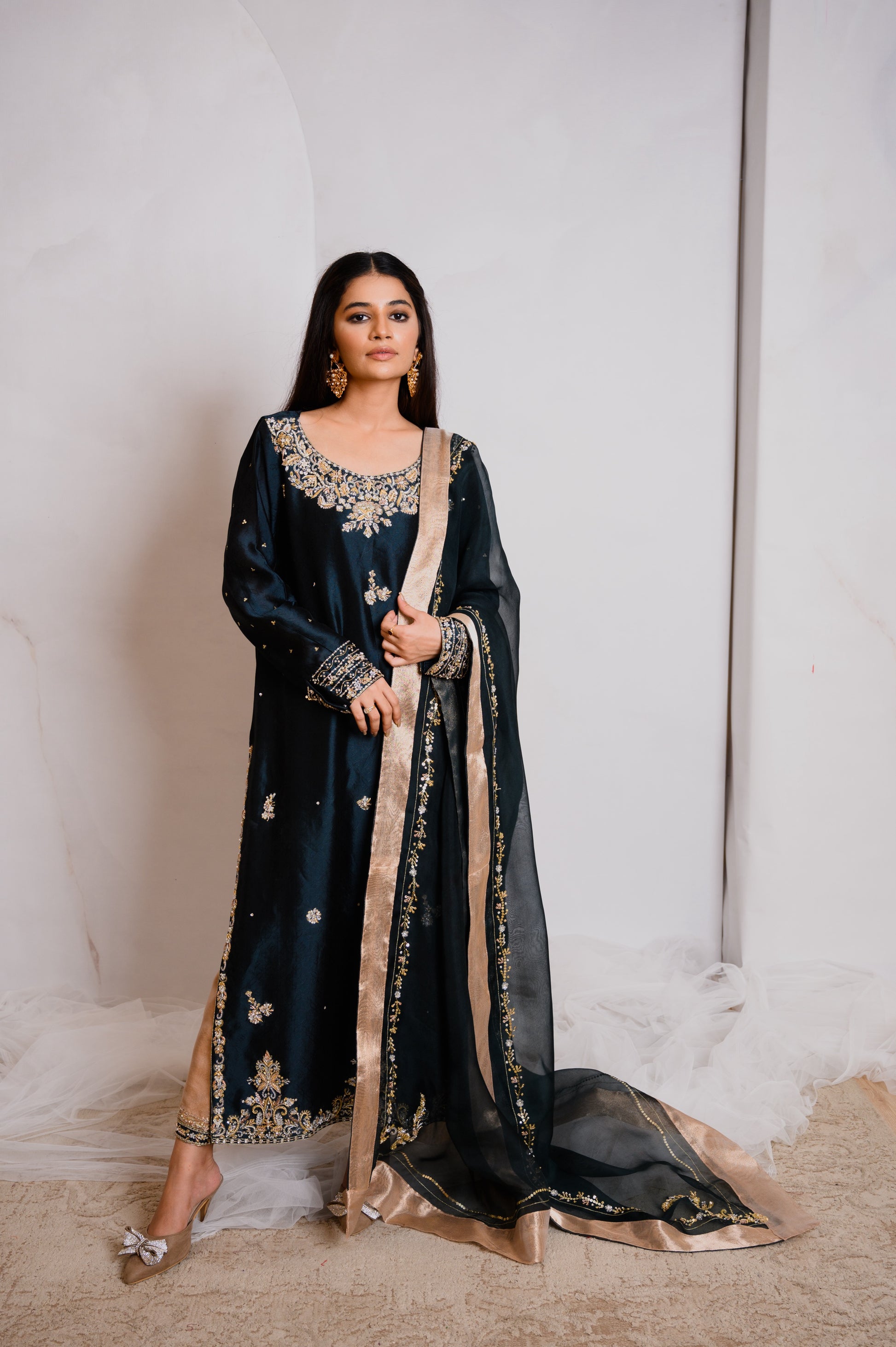 Our stunning Emerald Green Pure Sheesha Silk Shirt, a true embodiment of elegance and sophistication. With its unique design featuring open sides, this shirt is tailored to stand out from the crowd. The intricate handwork on the sleeves, neckline, daman, and sides with delicate sequins, pearls, and dabka, adding a touch of glamour to its already mesmerizing appeal. Paired with a crushed inner and a pure organza dupatta adorned with sequin waves, this ensemble exudes a regal aura and is perfect for any special occasion.