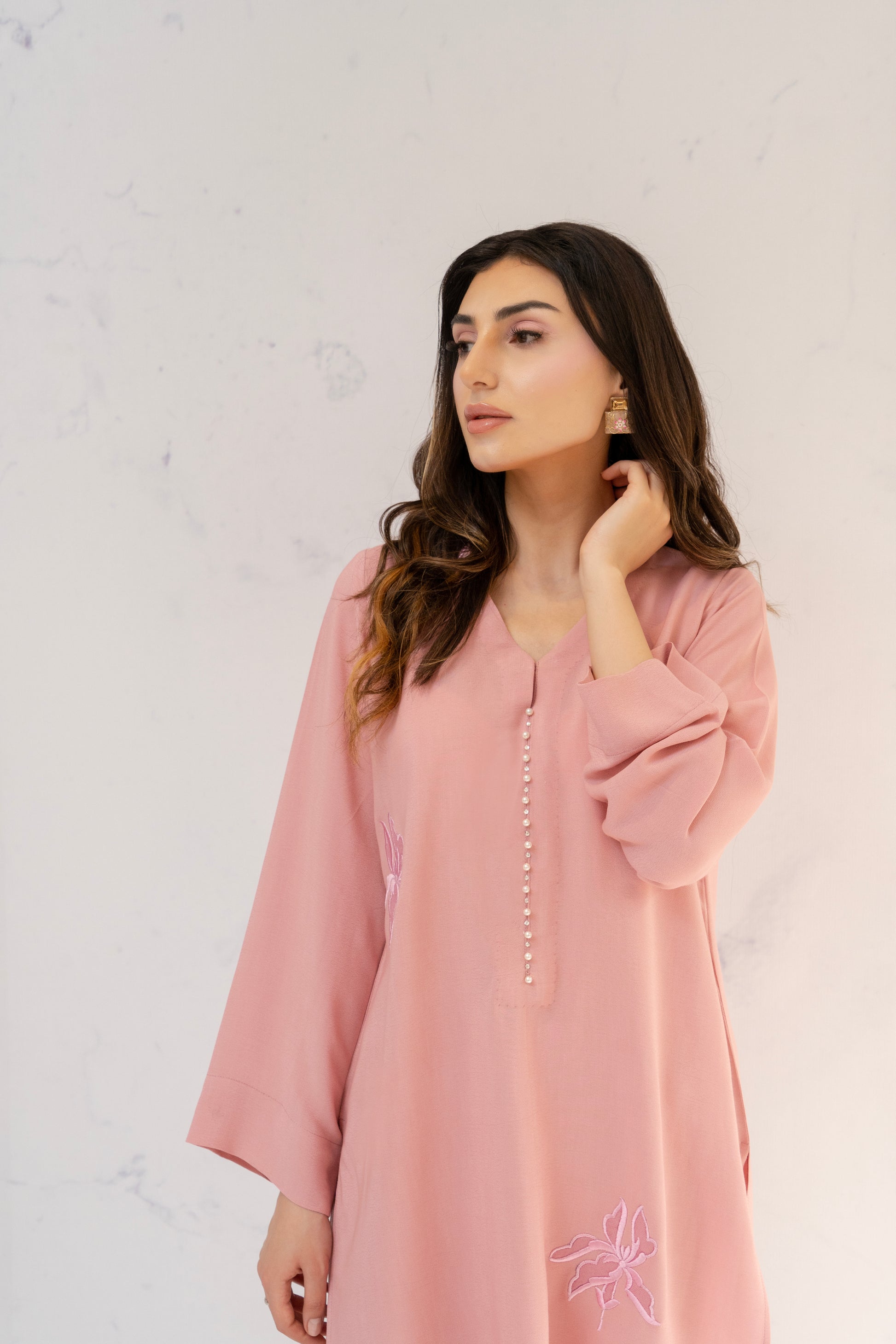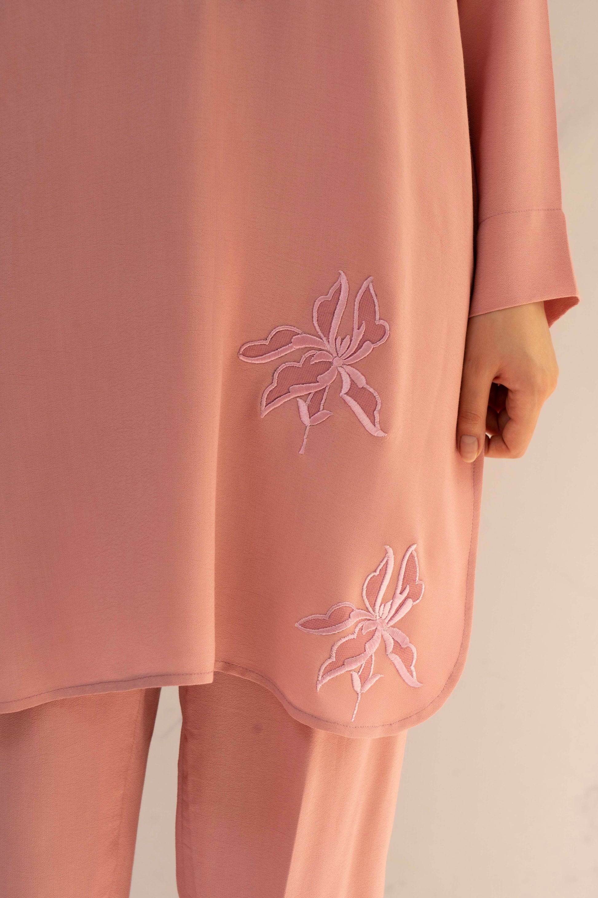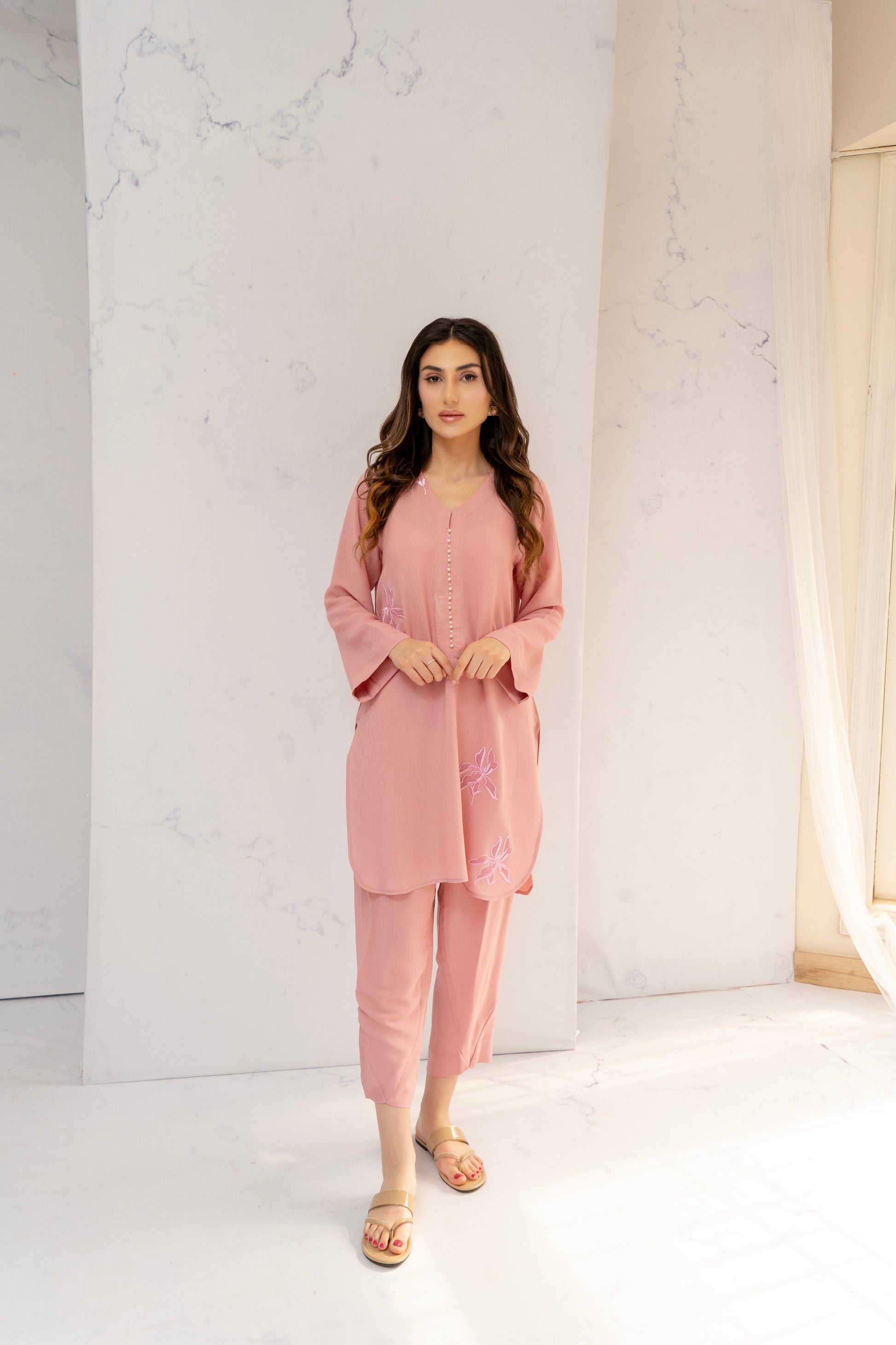 Indulge in the epitome of feminine allure with our captivating pink two-piece ensemble, featuring delicate floral embroidery and adorned with luminous white buttons. Embrace the allure of springtime and let your style bloom this festive season