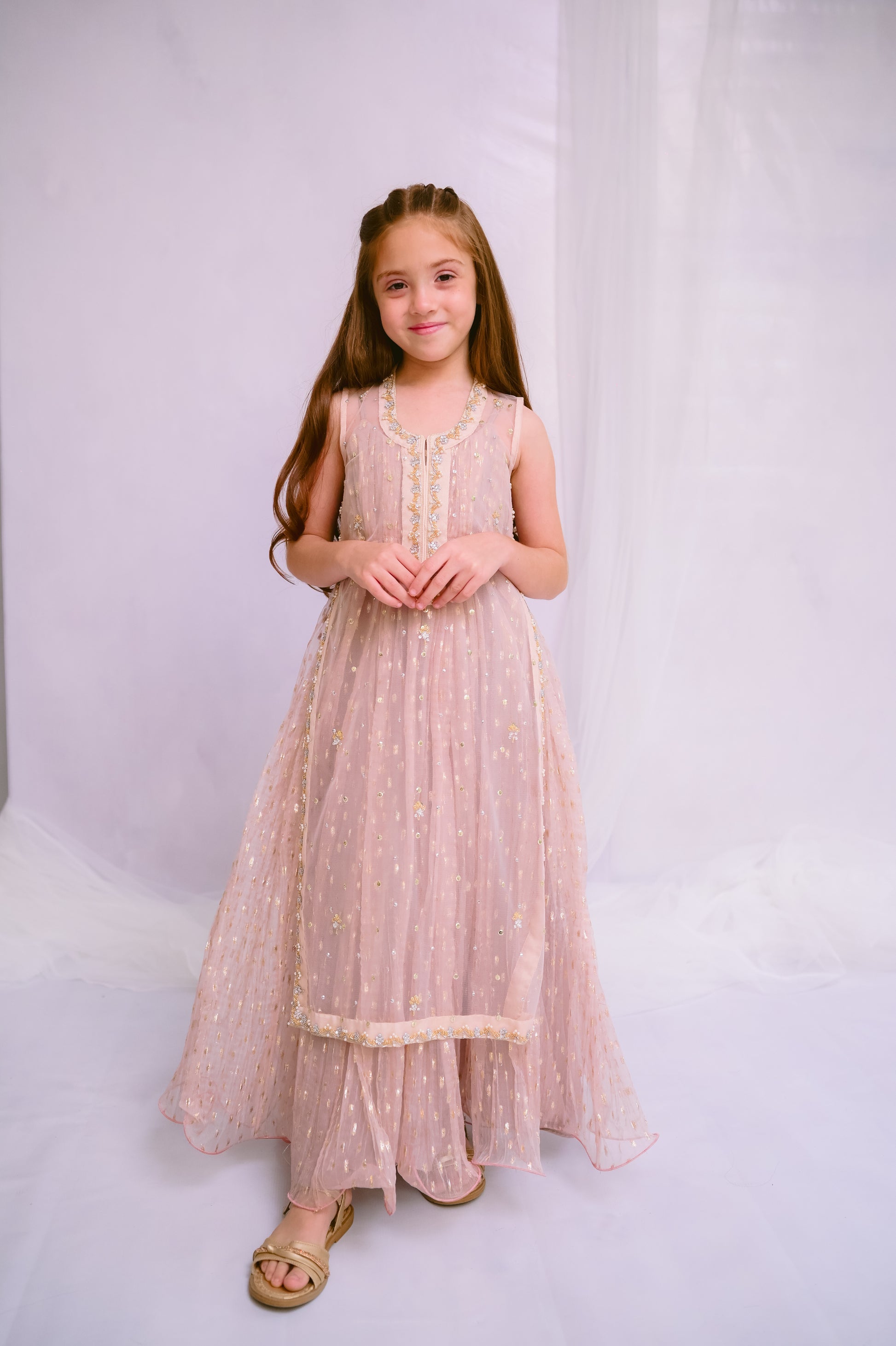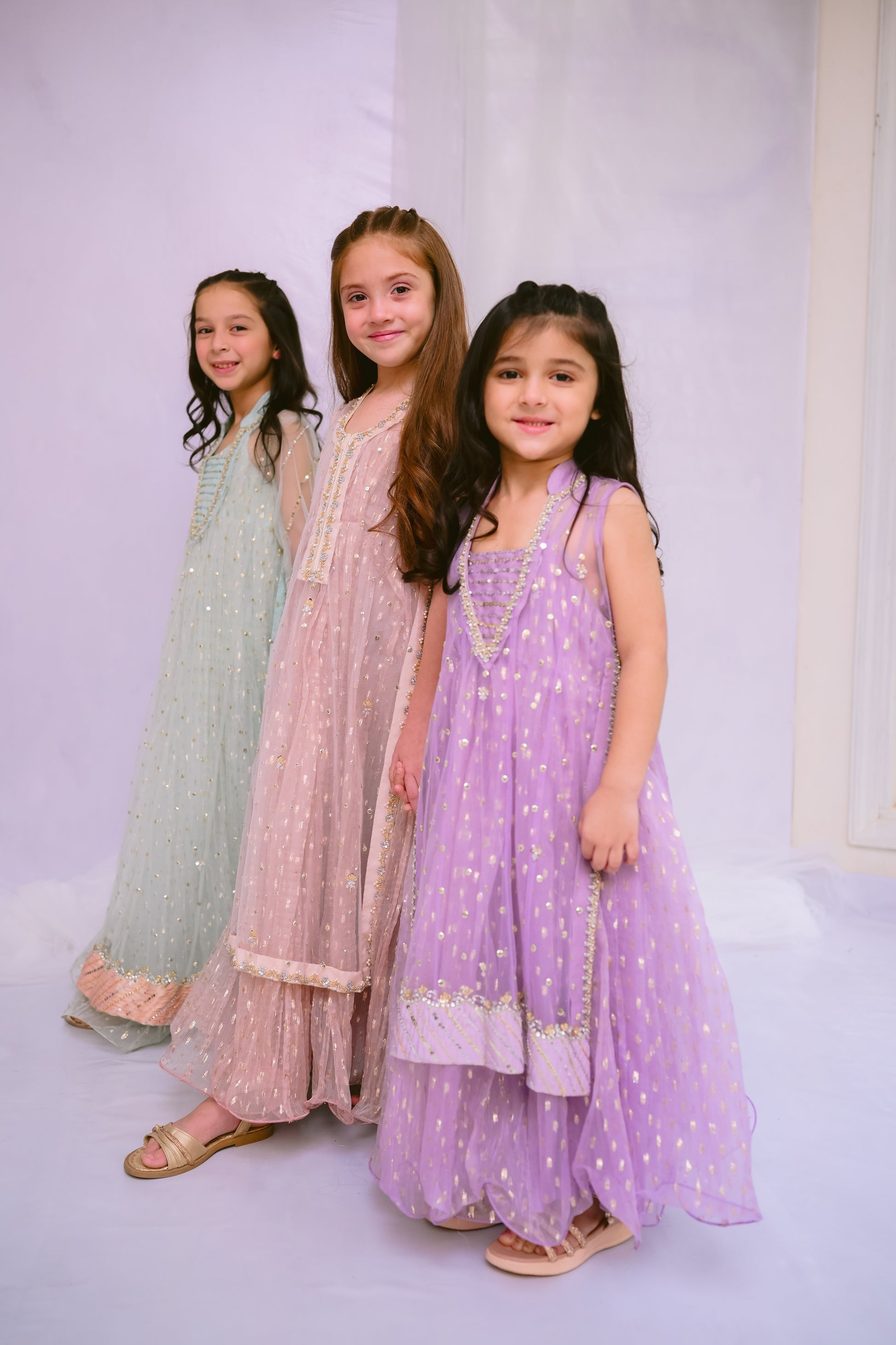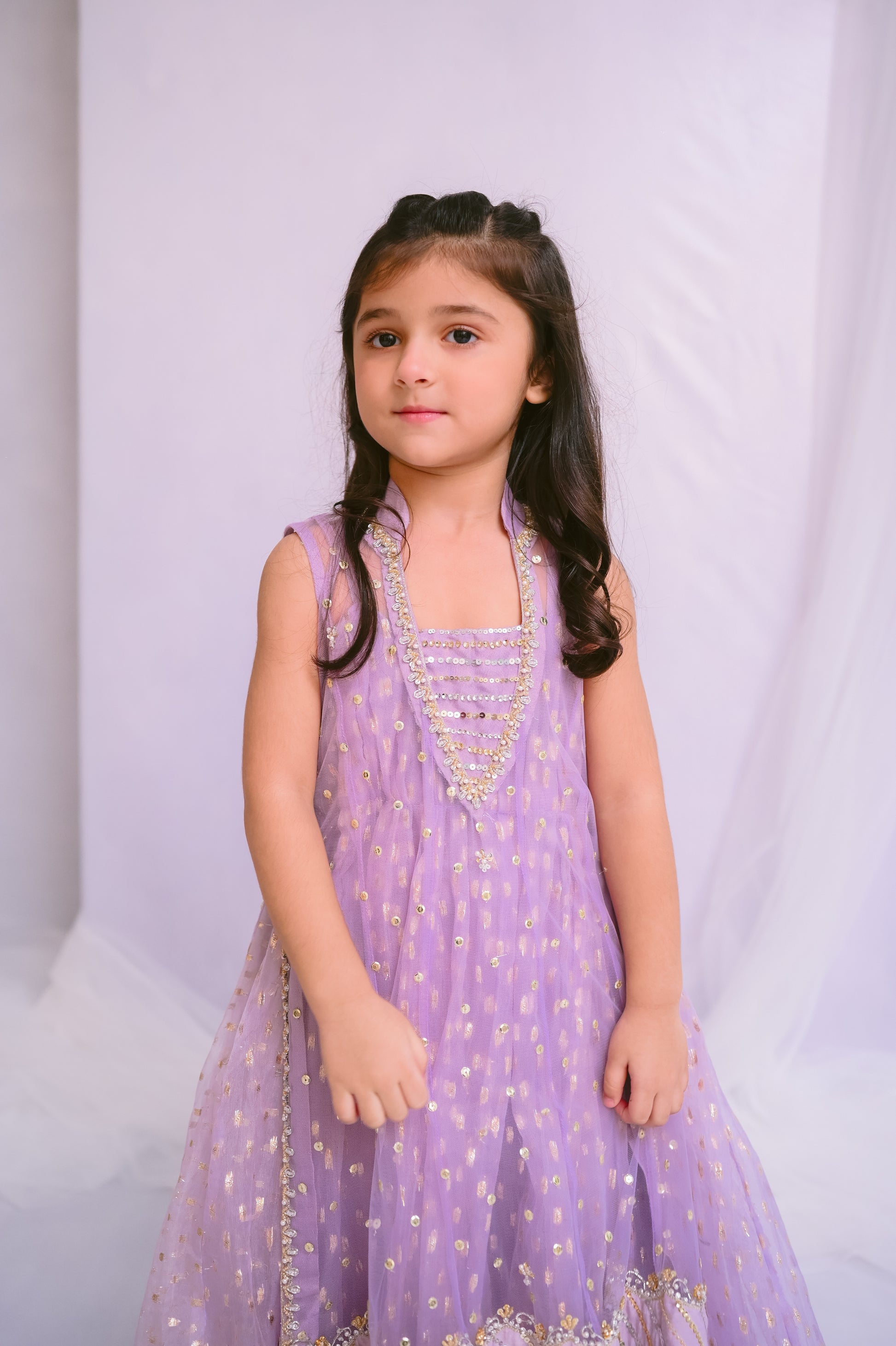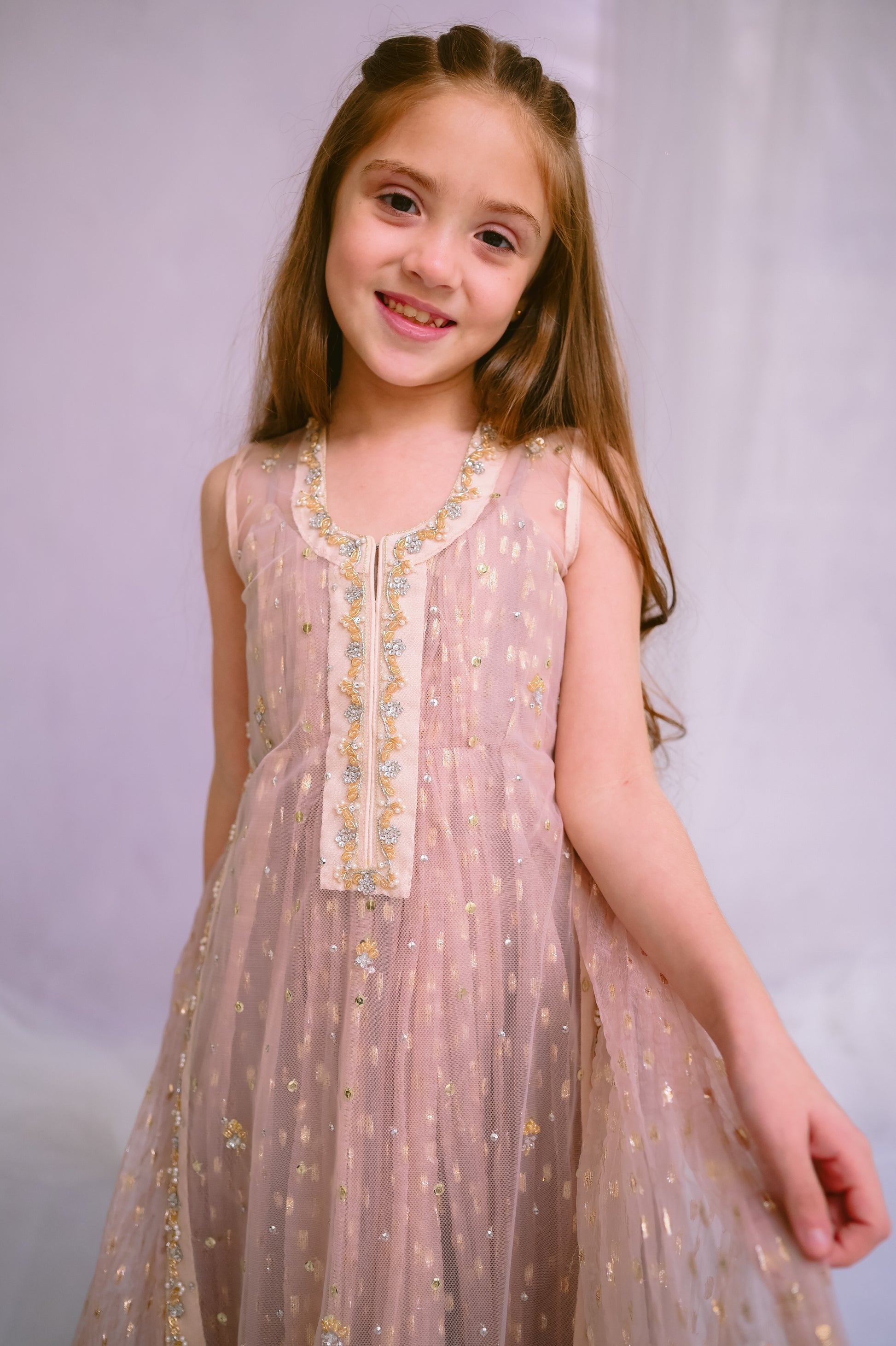 Make every occasion sparkle with this A-line long shirt for kids, featuring delicate handwork on net fabric and a charming Banarsi organza crushed inner. The perfect blend of elegance and fun for any special event.