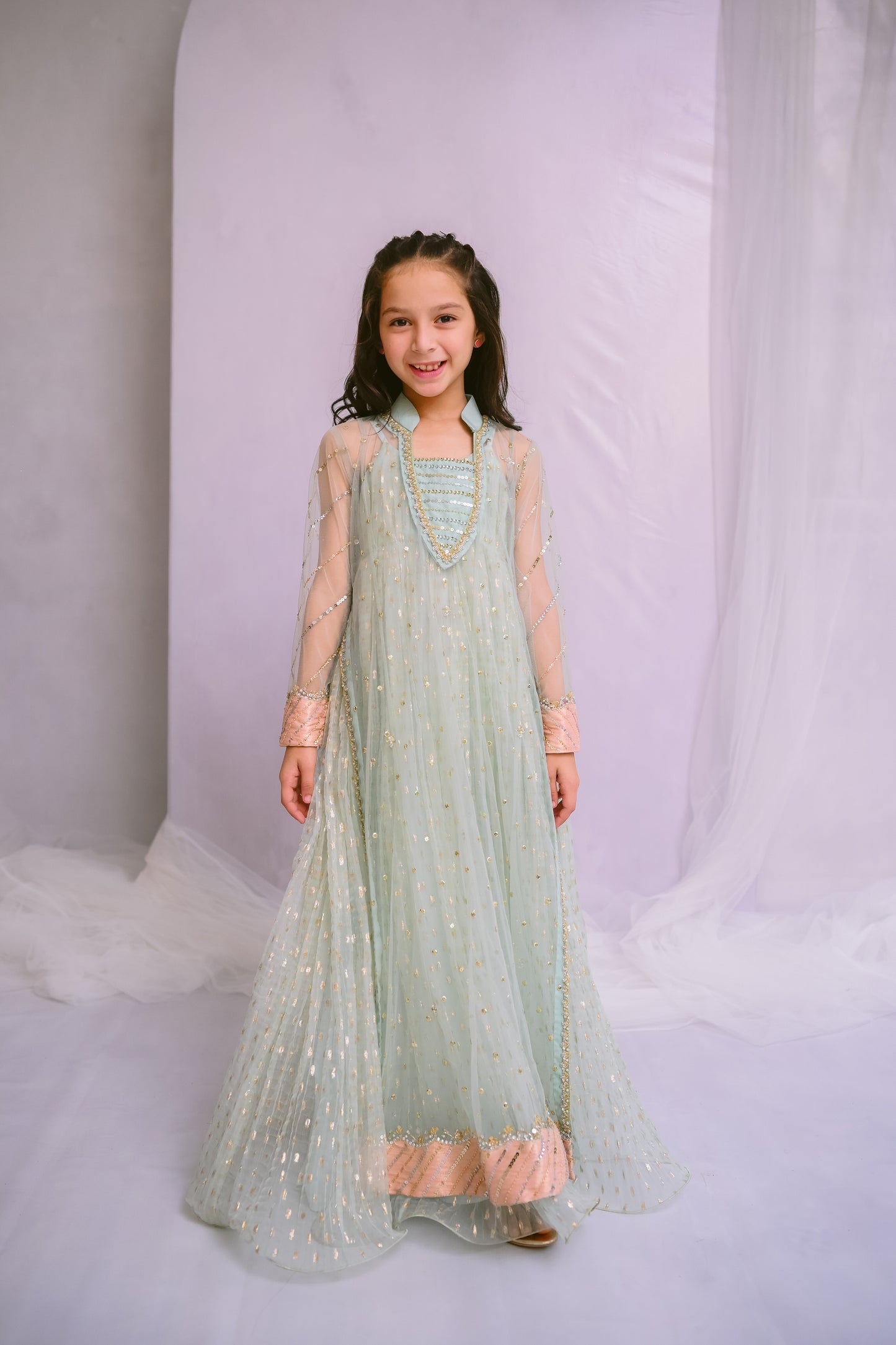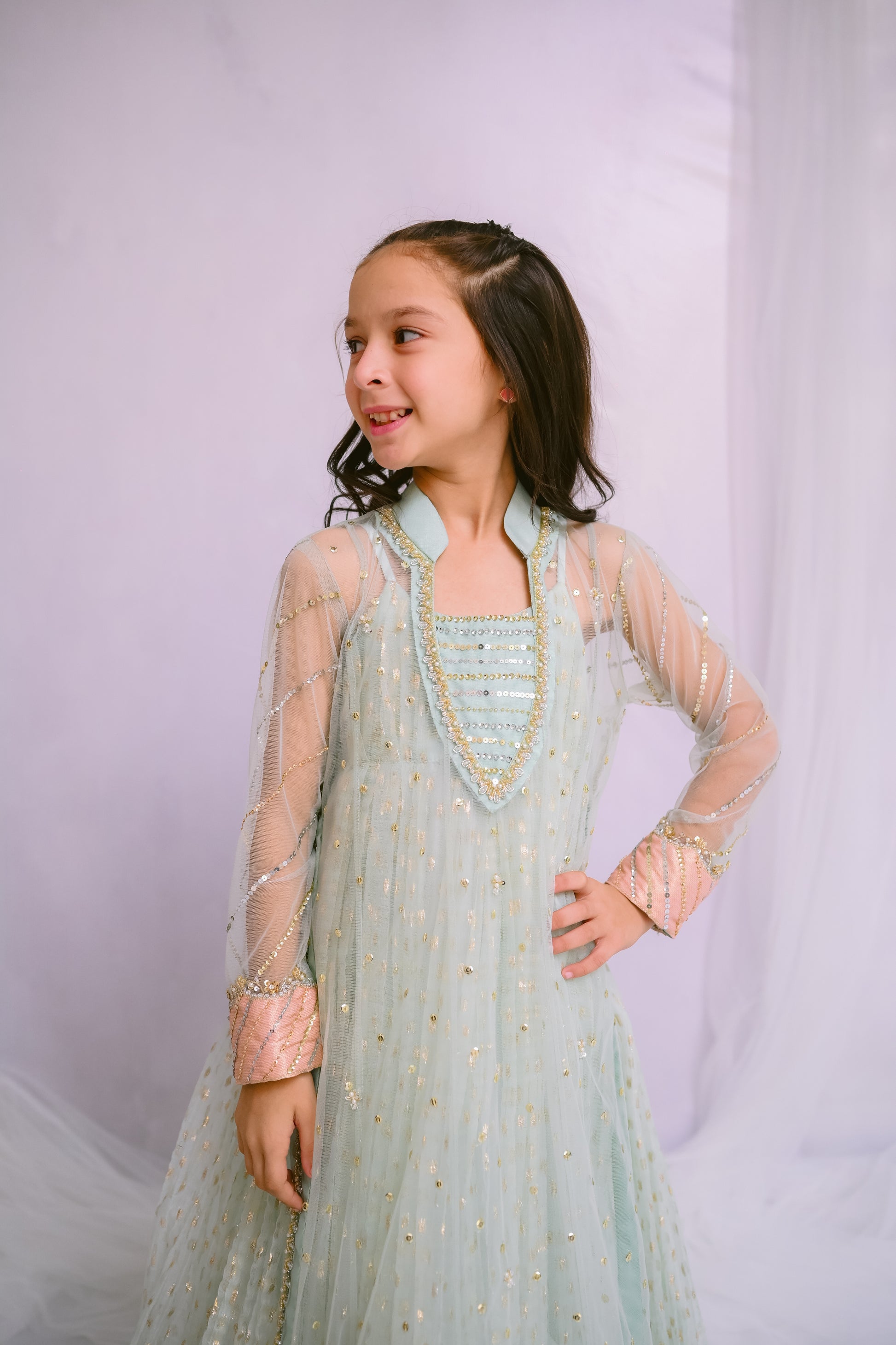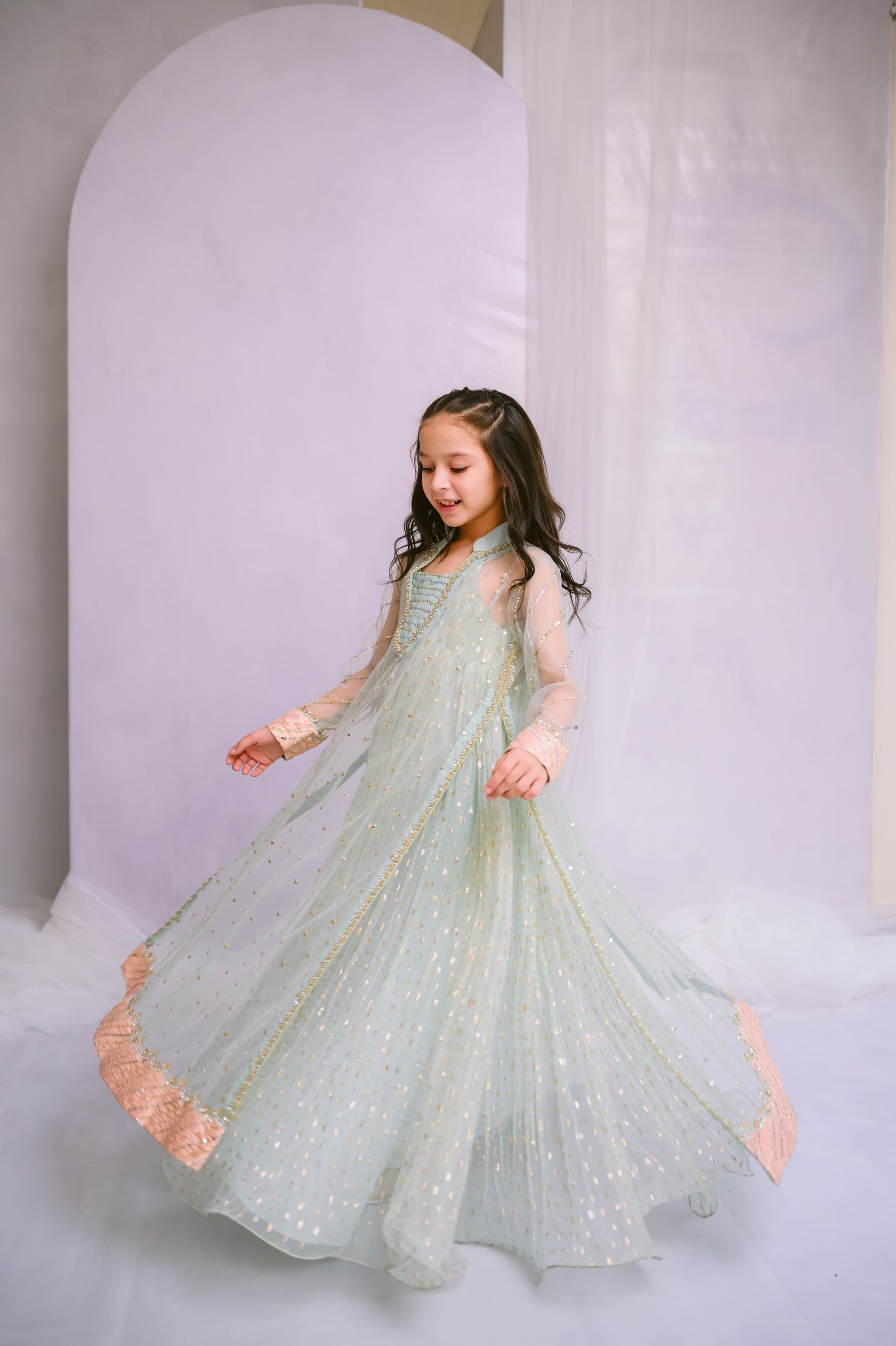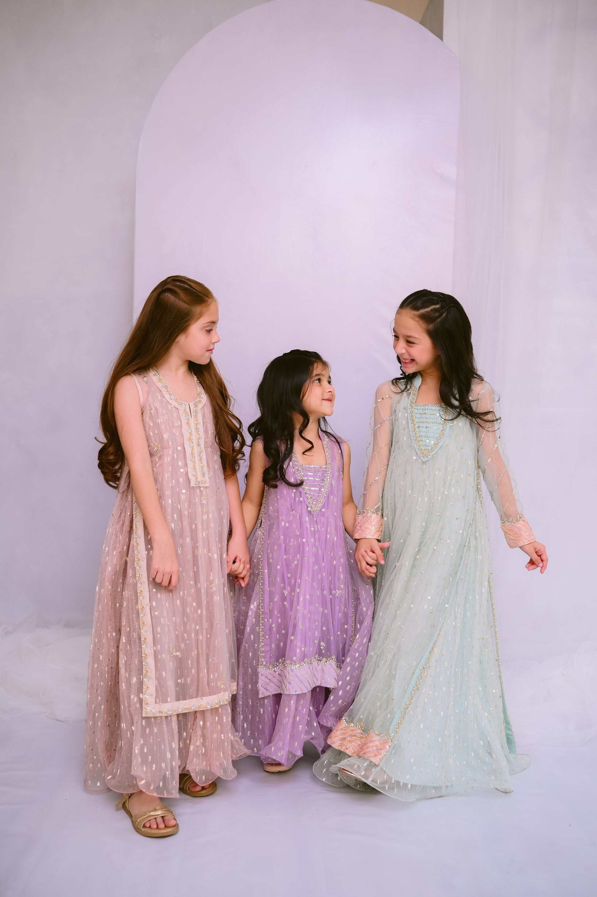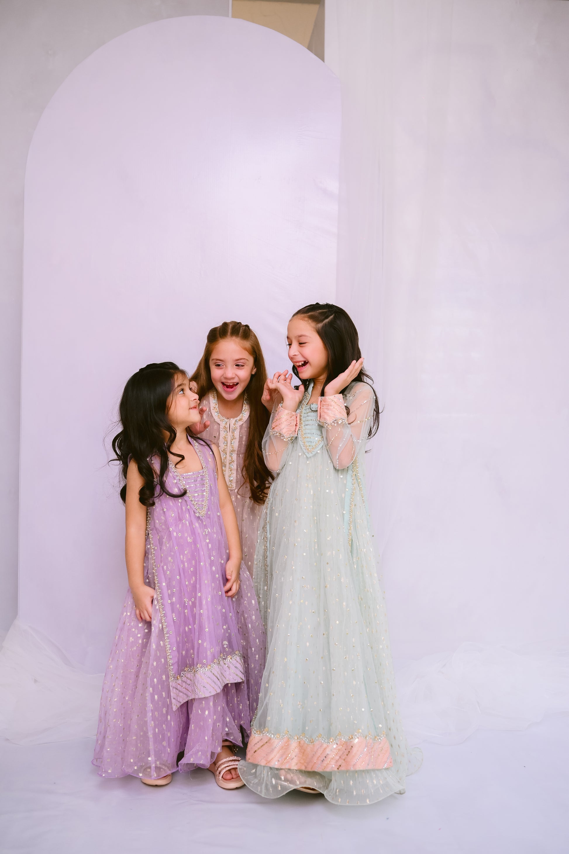 Make every occasion sparkle with this A-line long shirt for kids, featuring delicate handwork on net fabric and a charming Banarsi organza crushed inner. The perfect blend of elegance and fun for any special event.