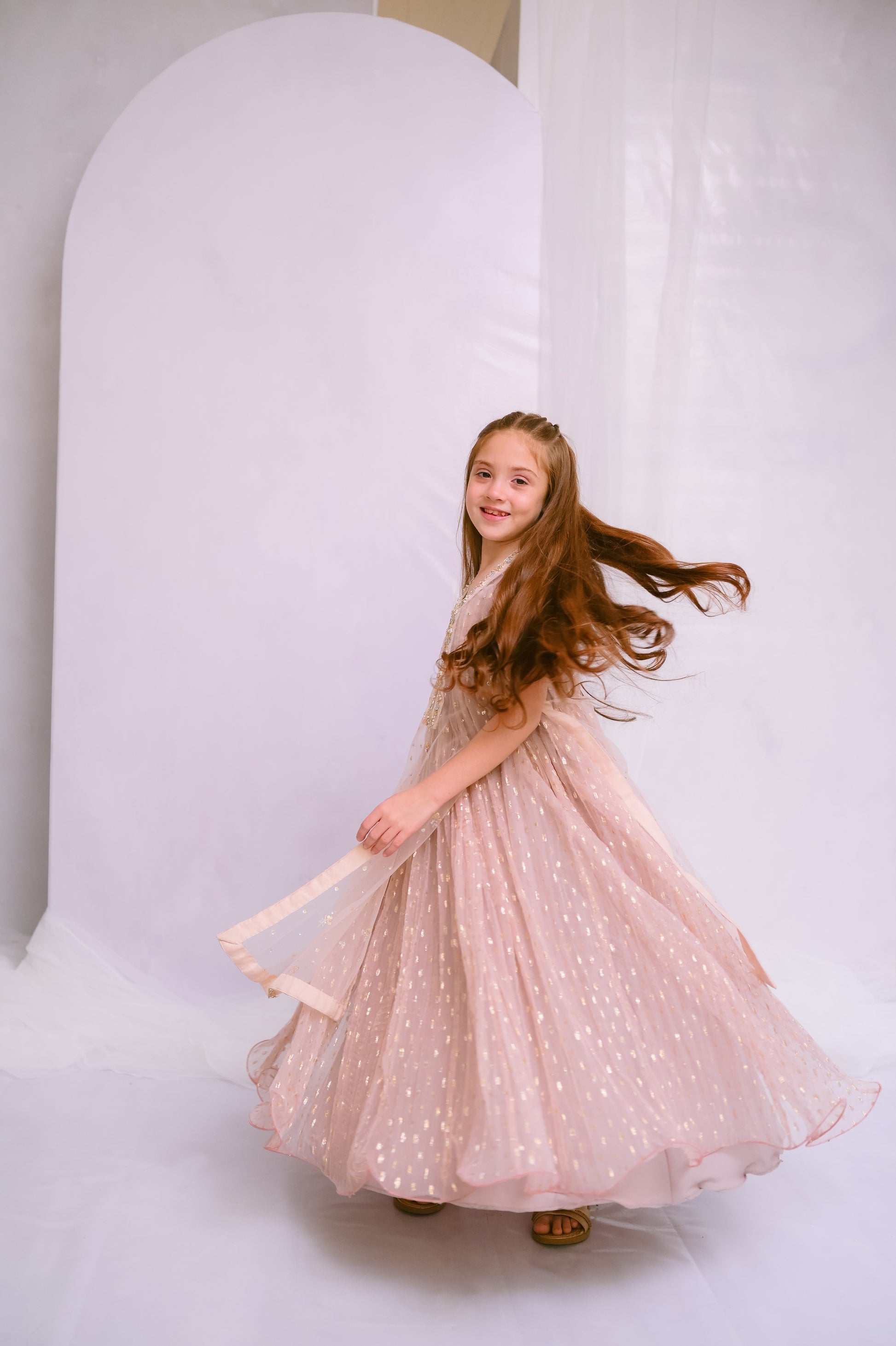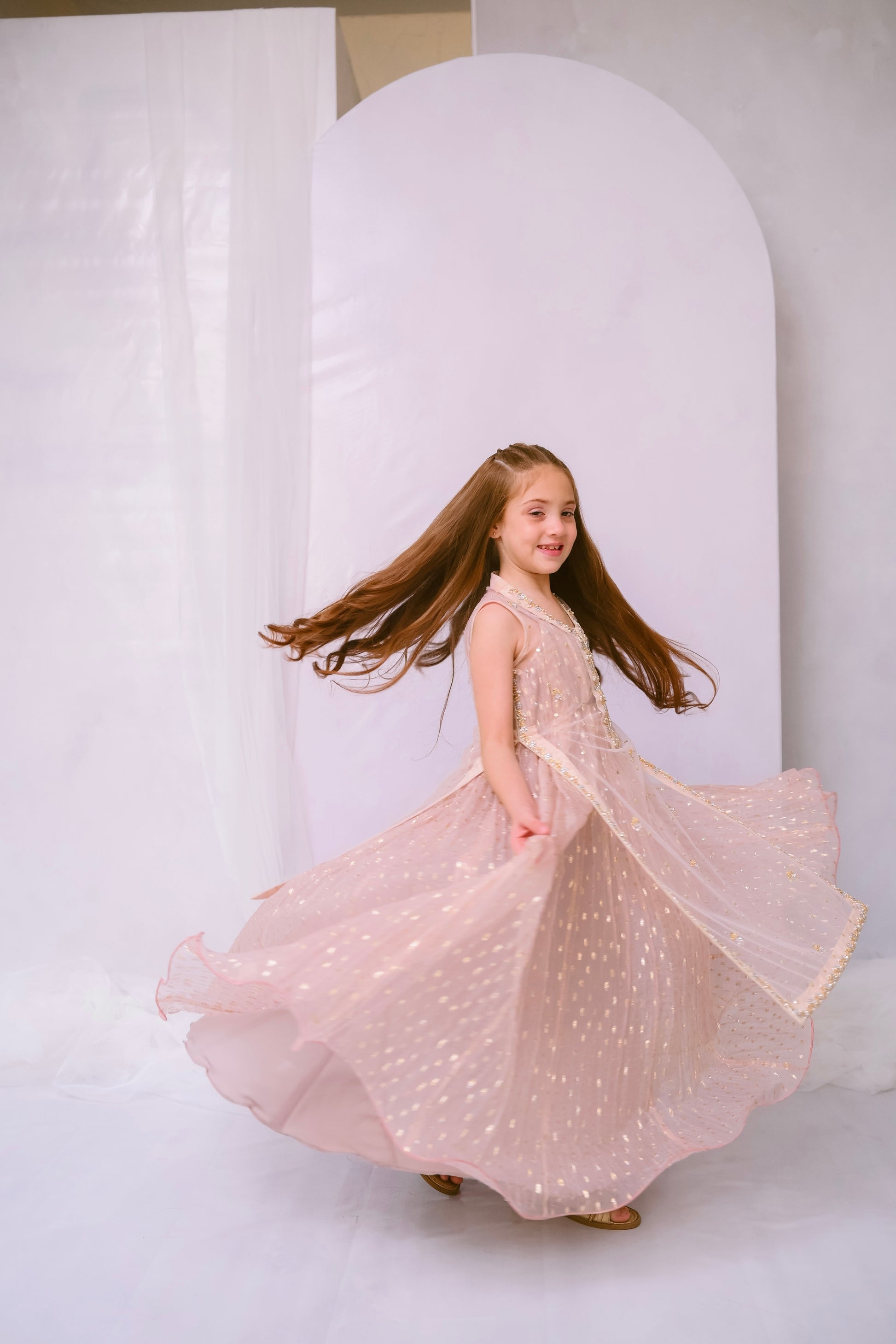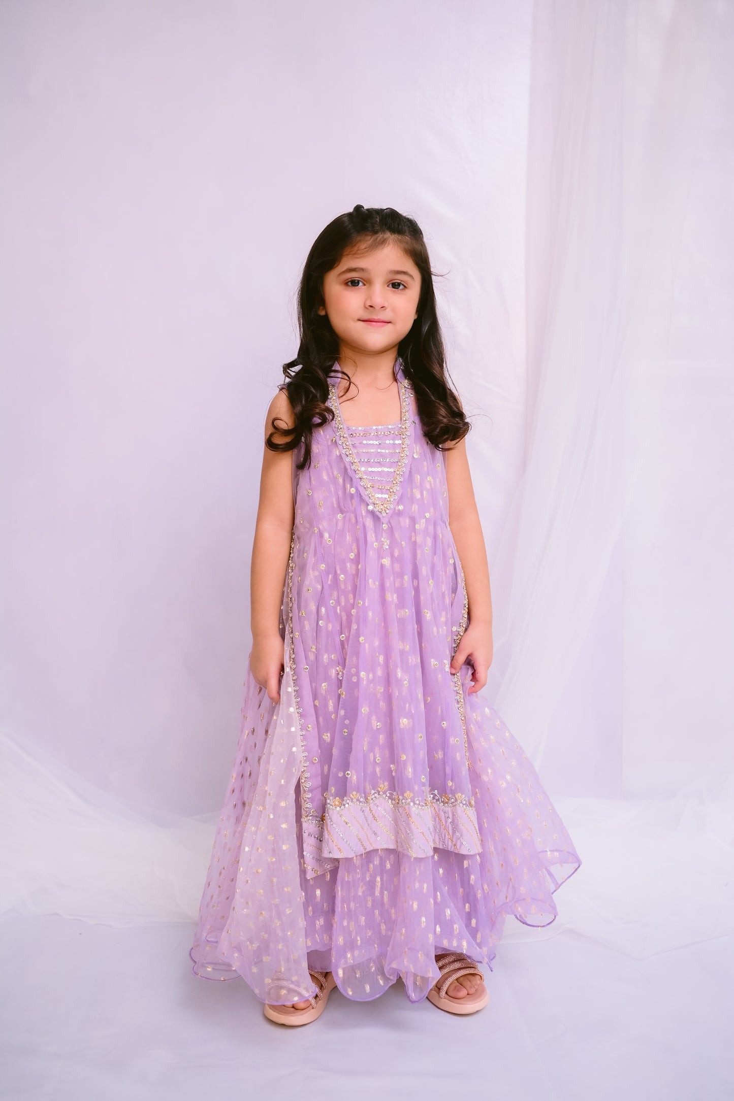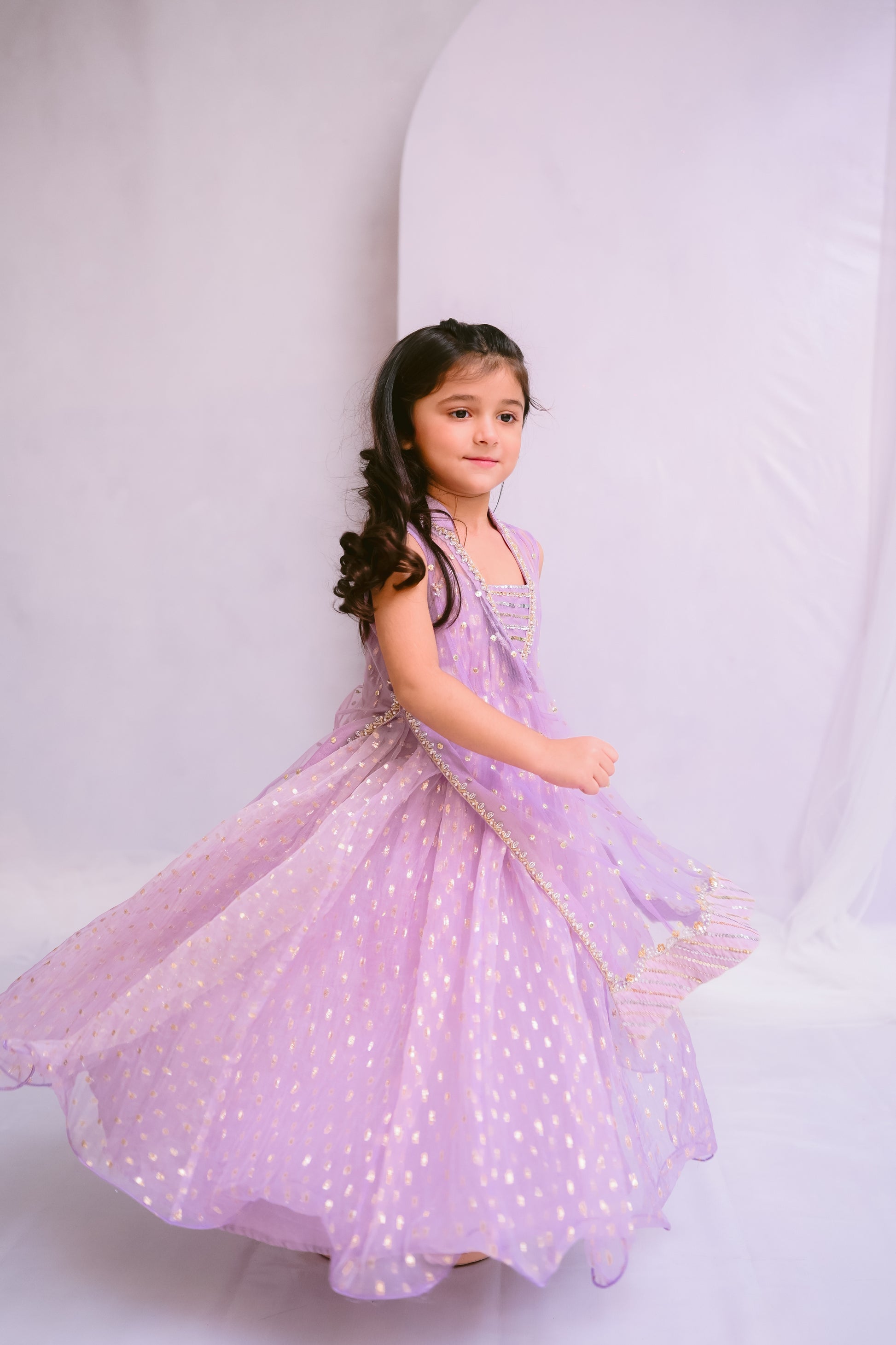 Make every occasion sparkle with this A-line long shirt for kids, featuring delicate handwork on net fabric and a charming Banarsi organza crushed inner. The perfect blend of elegance and fun for any special event.