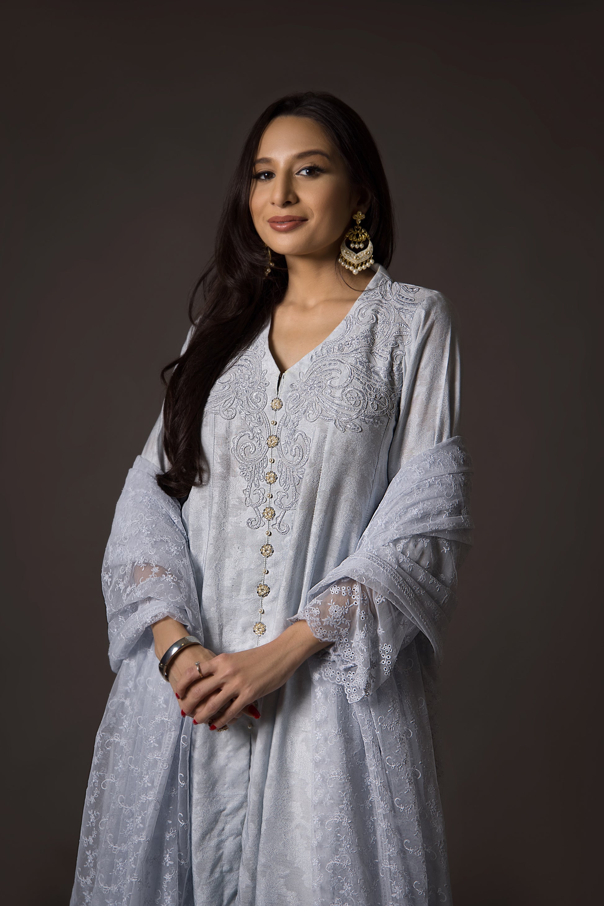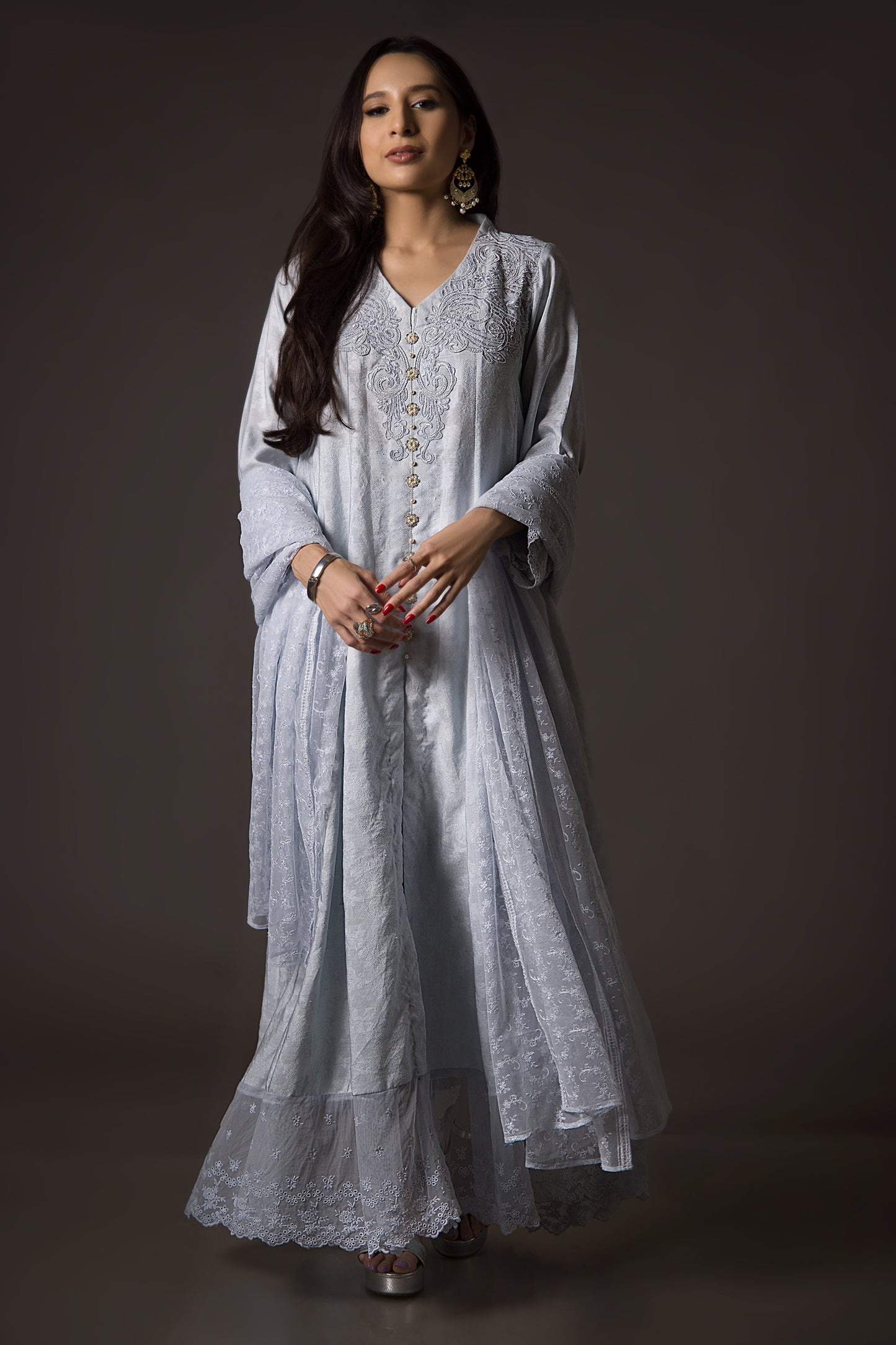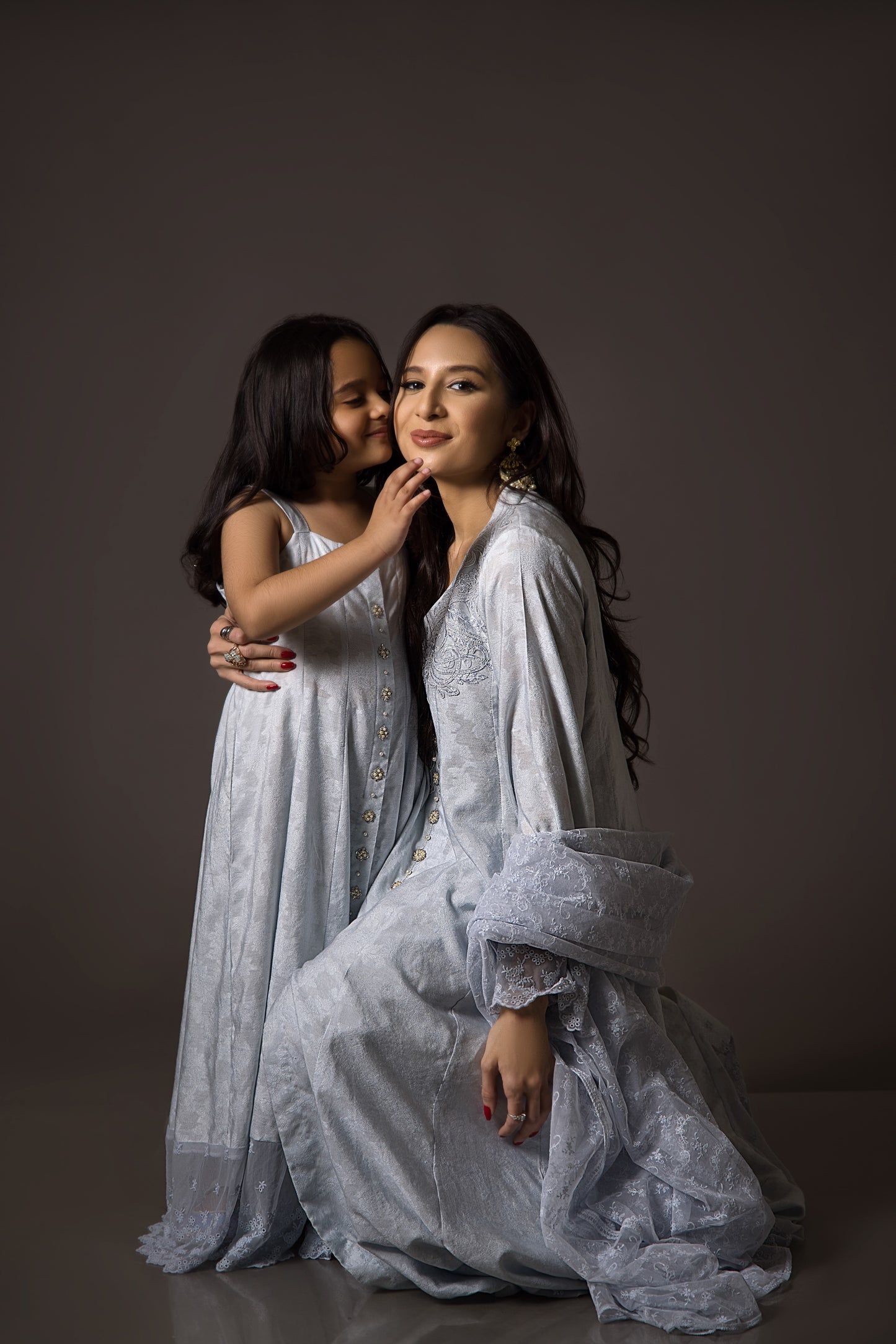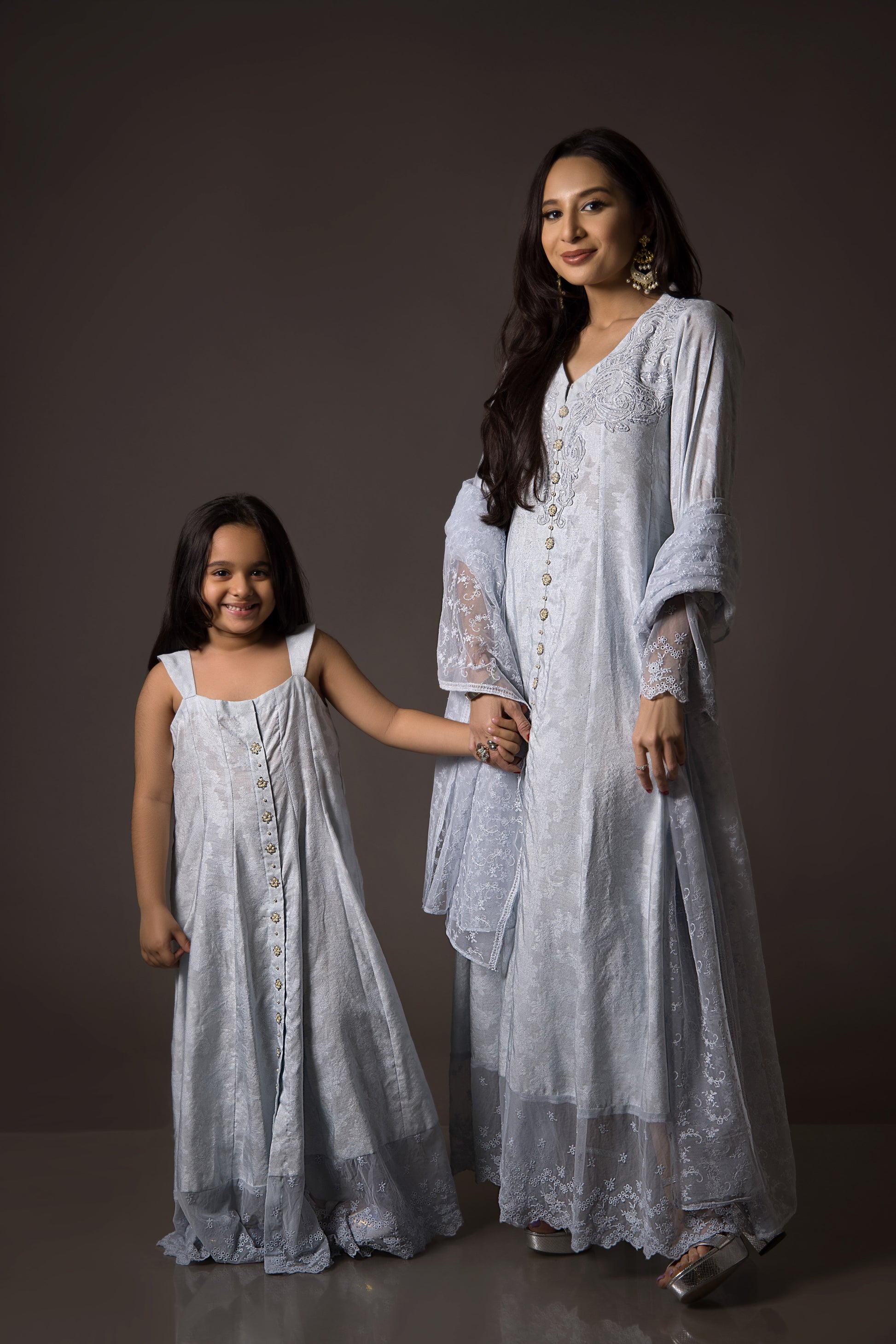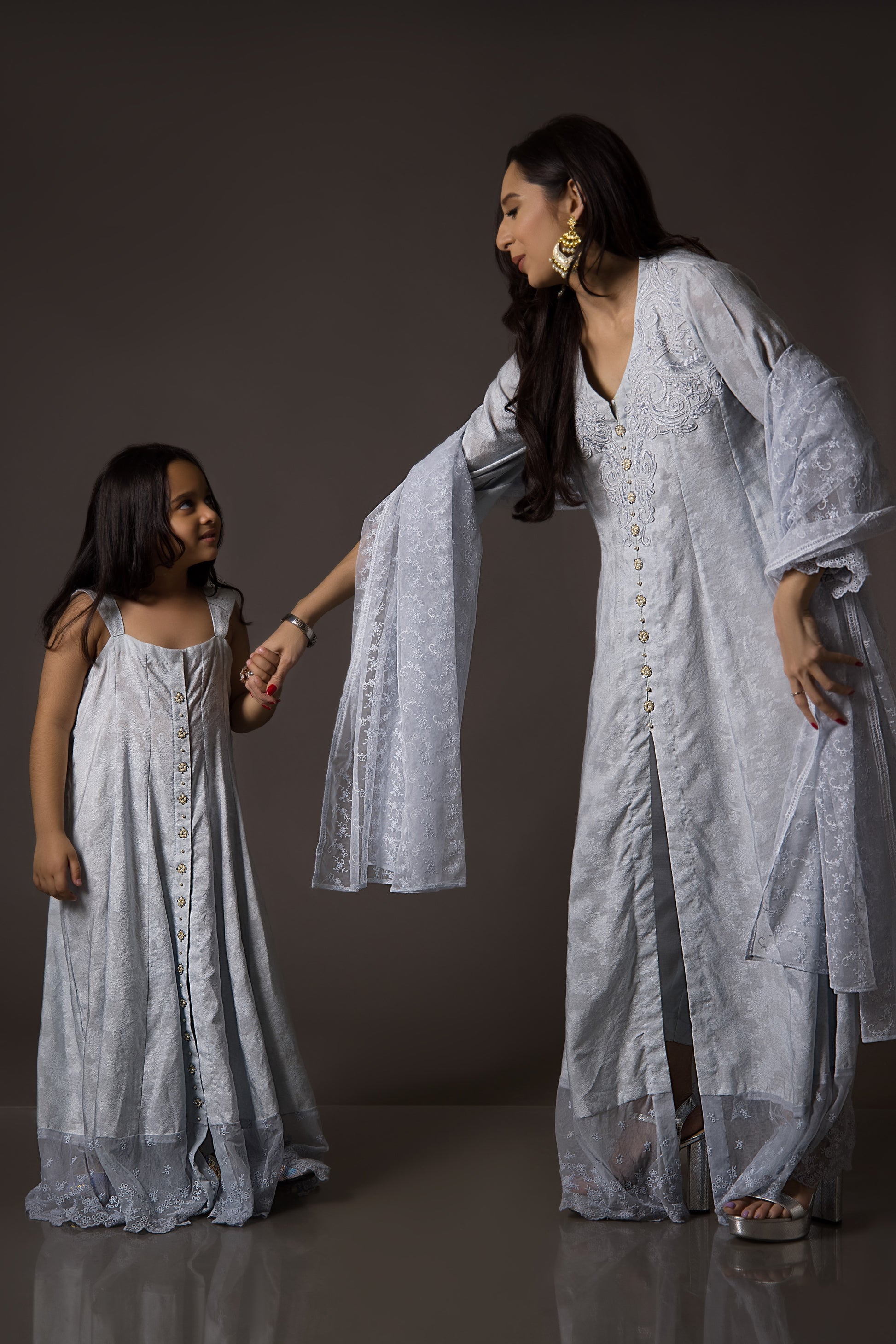 Step up your fashion game with this stunning self cotton net front open flair shirt, featuring delicate lace trimmings and a classy embroidered net dupatta. Complete the look with plain pants and turn heads with the exquisite Pearl and Swarovski trimmings on the neckline. Don't forget to grab the matching outfit for your little girl!
