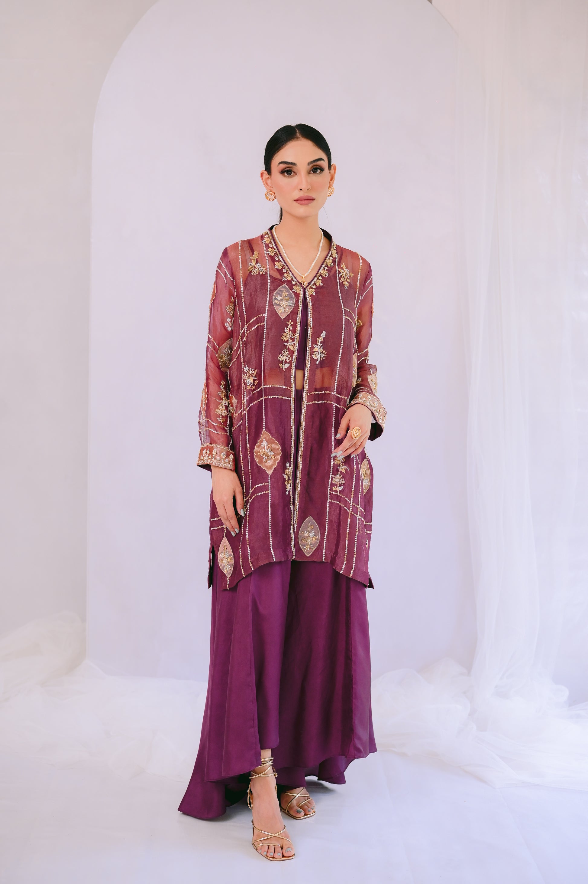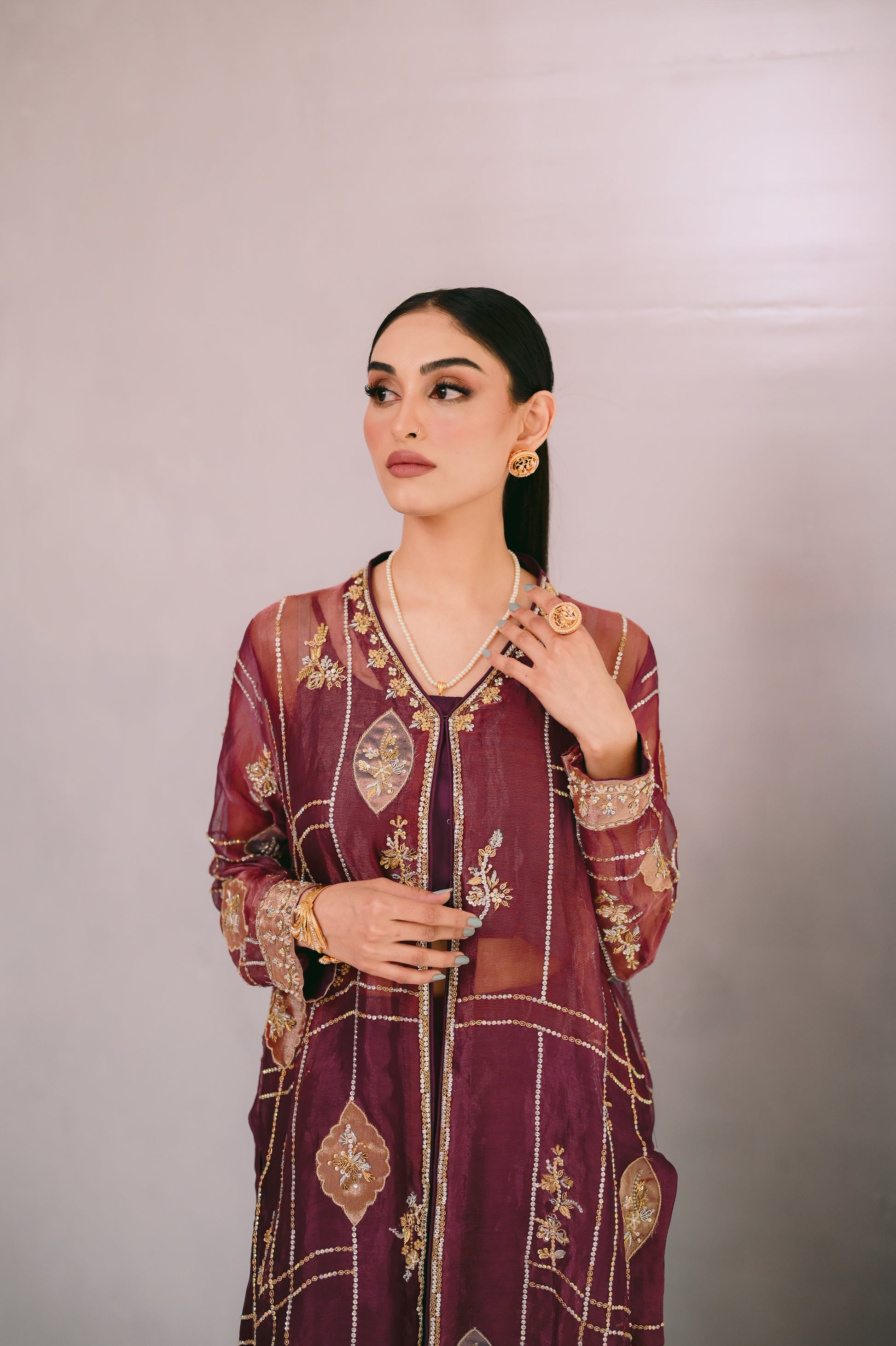 Transform your wardrobe with this pure tissue organza jacket, a masterpiece of appliqué and Zardozi artistry. Paired with refined silk Dhaka pants, it creates a stunning fusion of intricate detail and modern elegance, ensuring you make a statement at any event.