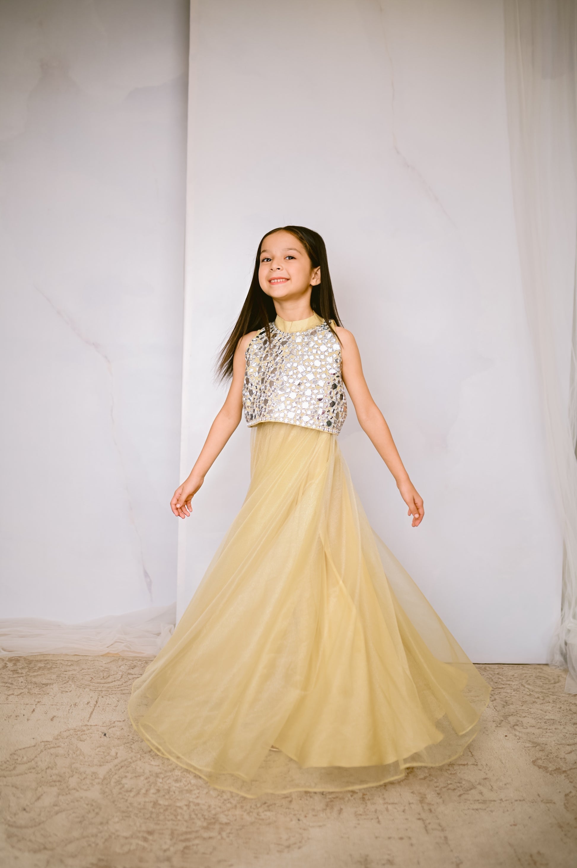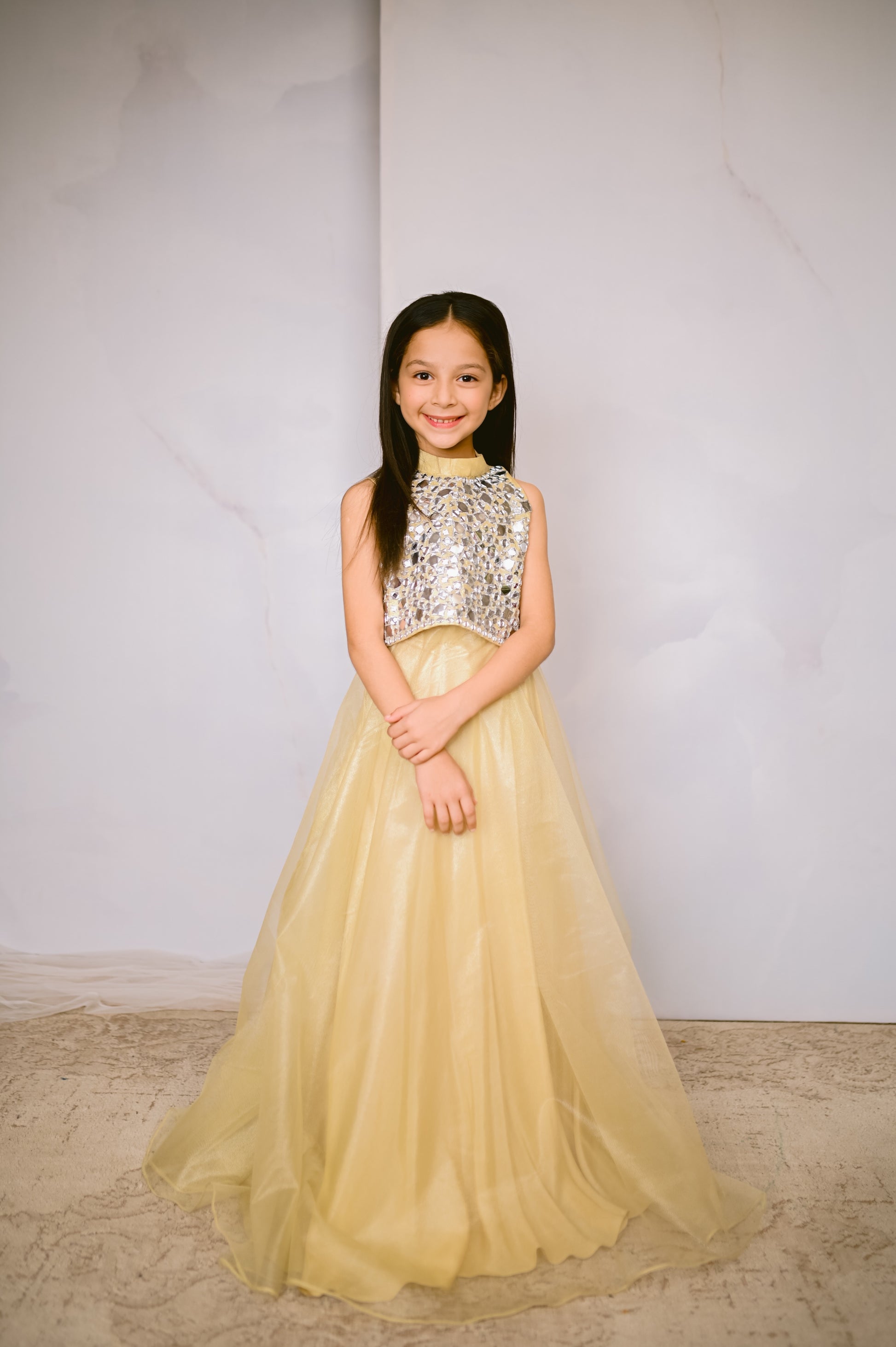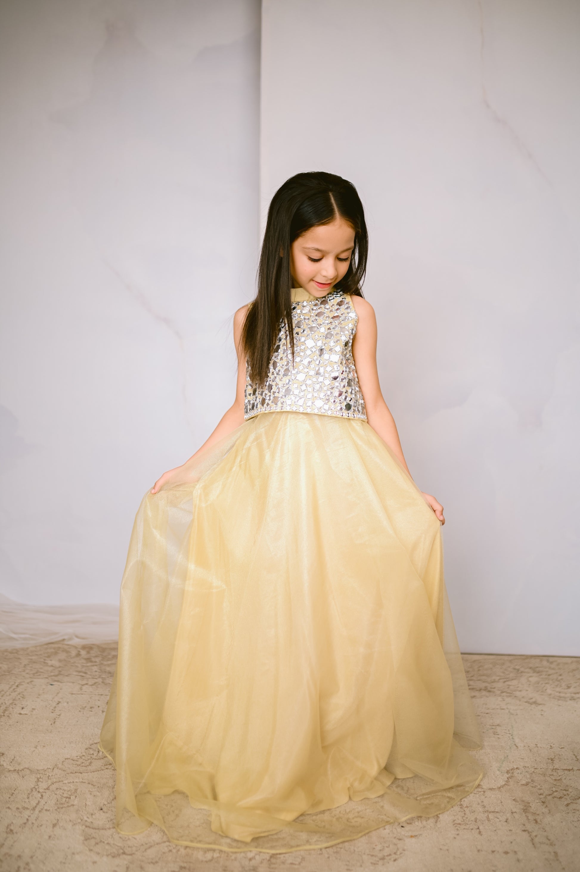 Watch as your child twinkles with enchantment in this adorable golden formal outfit. The golden hue, like rays of sunshine, adds a touch of magic to their innocence. The charming details and shimmering fabric make them feel like royalty on their special day. Whether it's a event, or a family gathering, this outfit brings out their inner princess with a golden touch.
