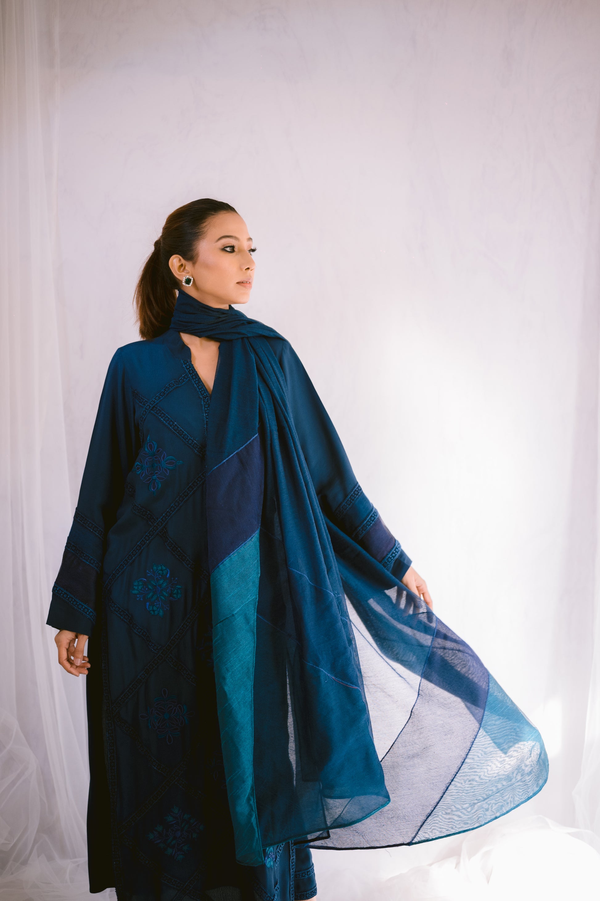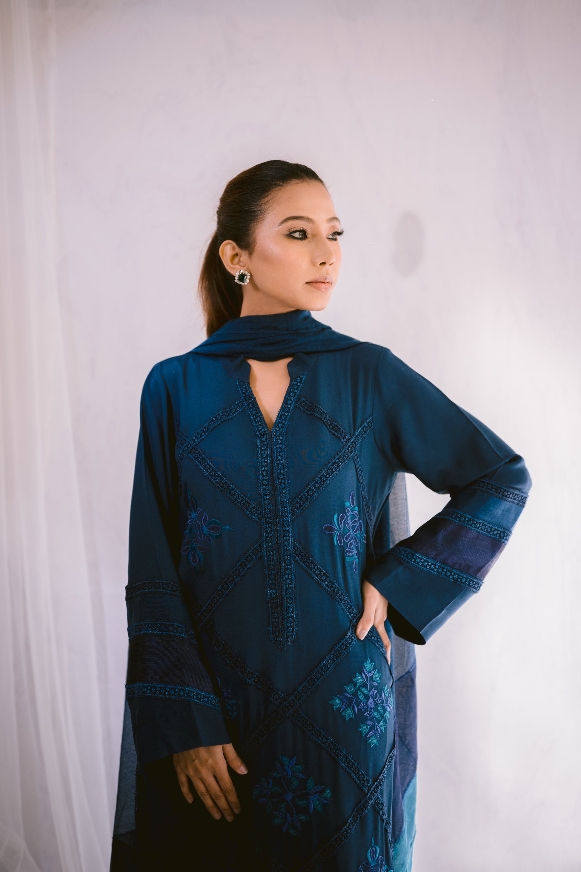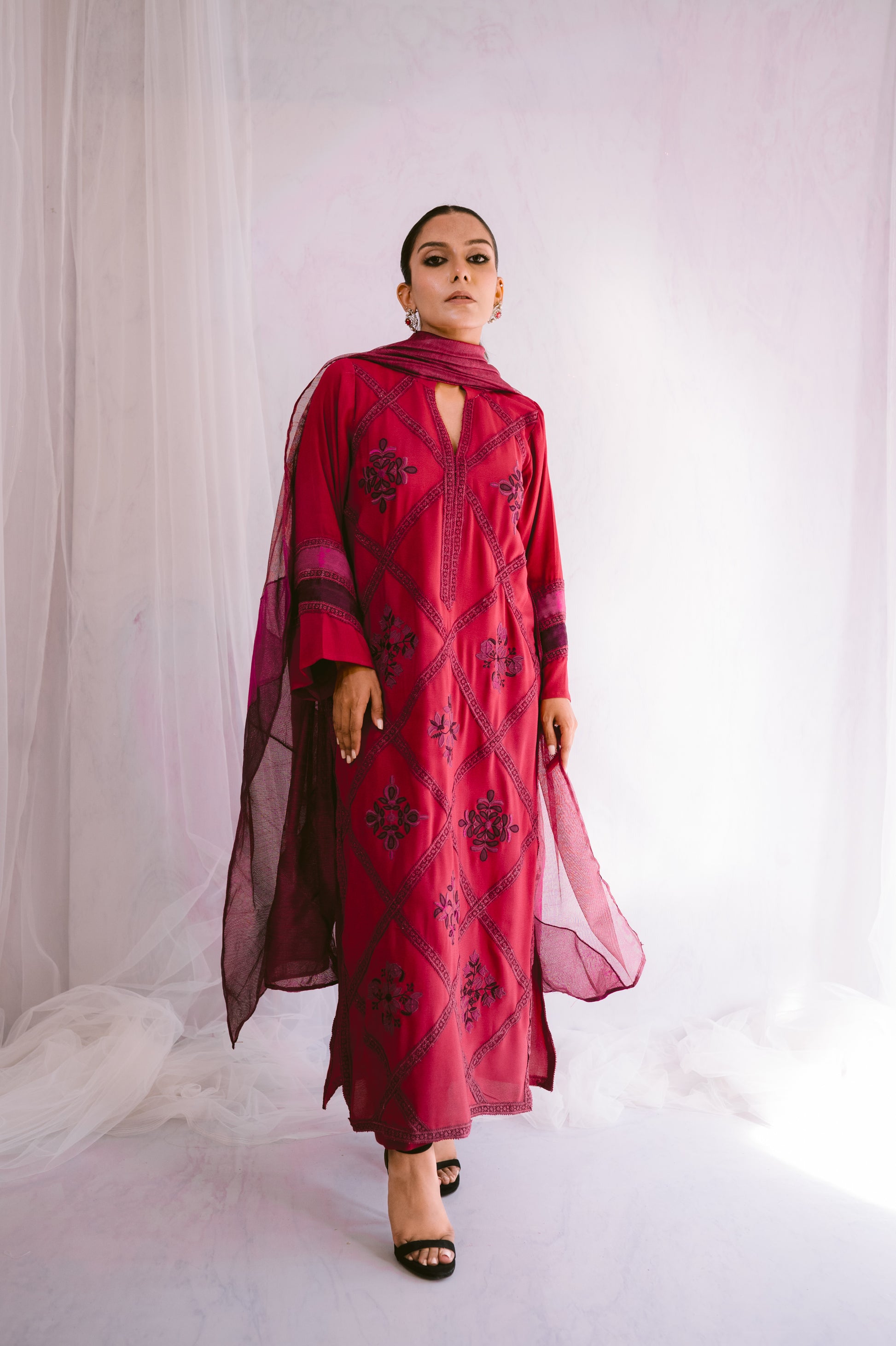 Indulge in exquisite elegance with this cotton crepe ensemble adorned with intricate appliqué work and embroidery, creating a mesmerizing effect throughout. Paired with a stunning color block dupatta, this ensemble effortlessly combines sophistication