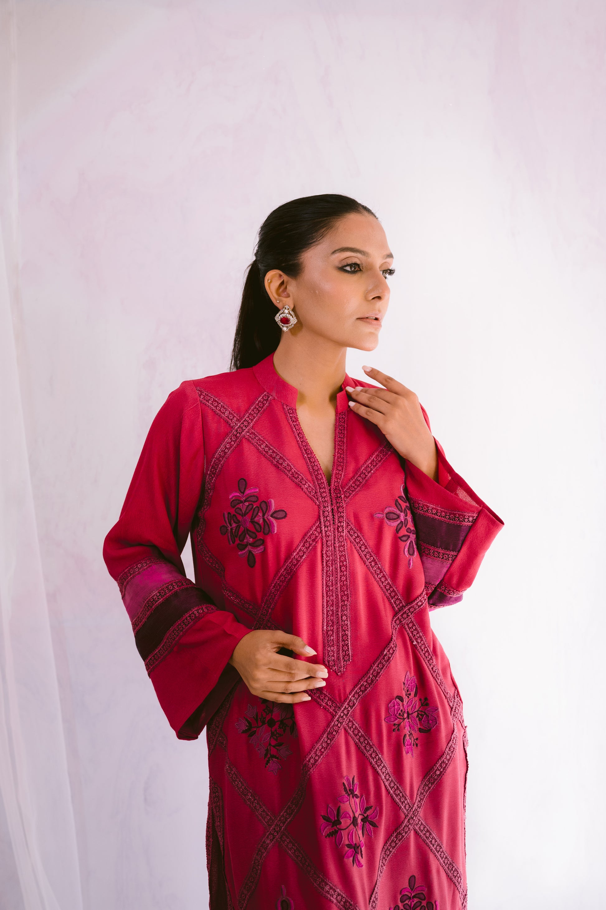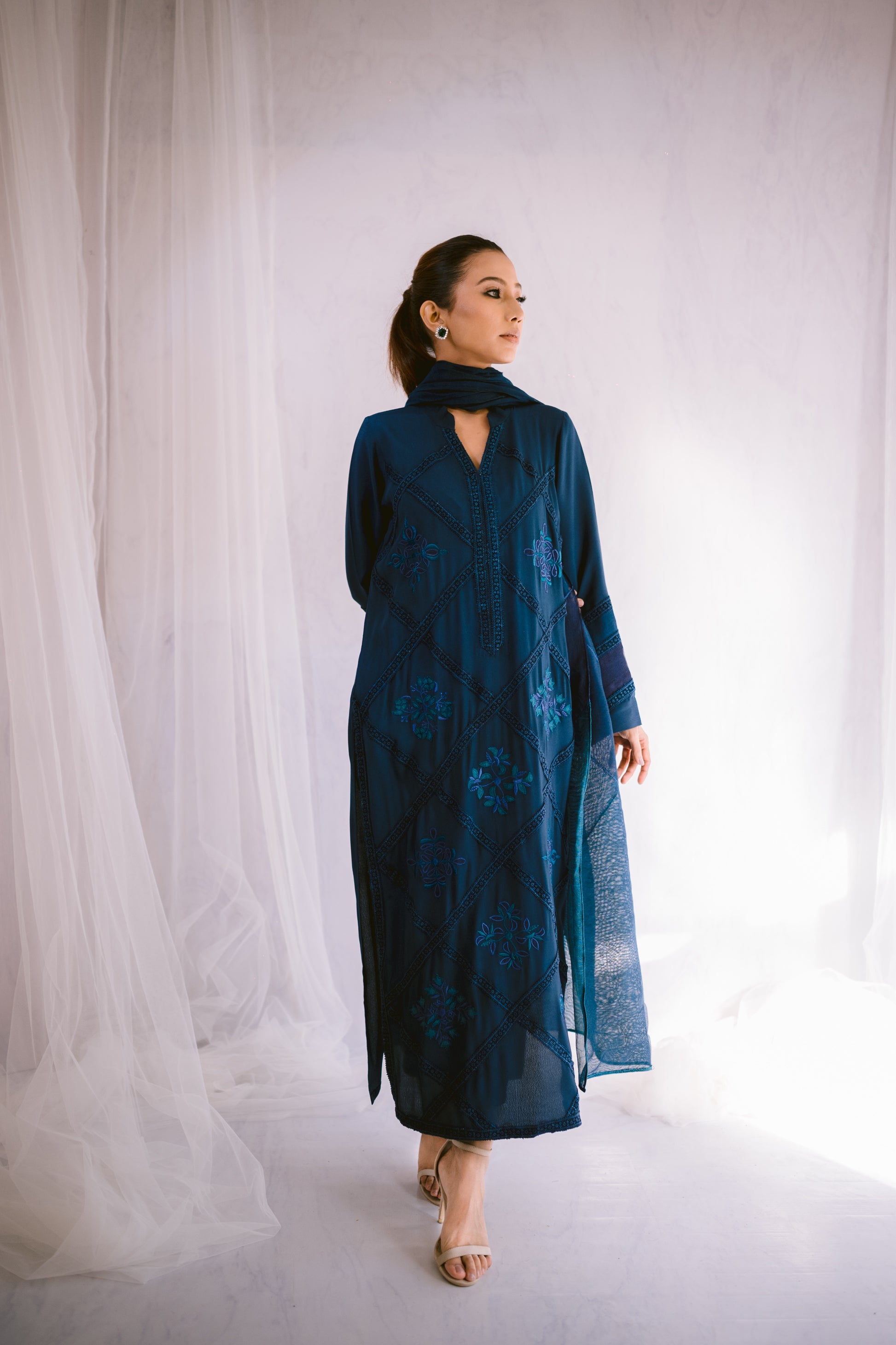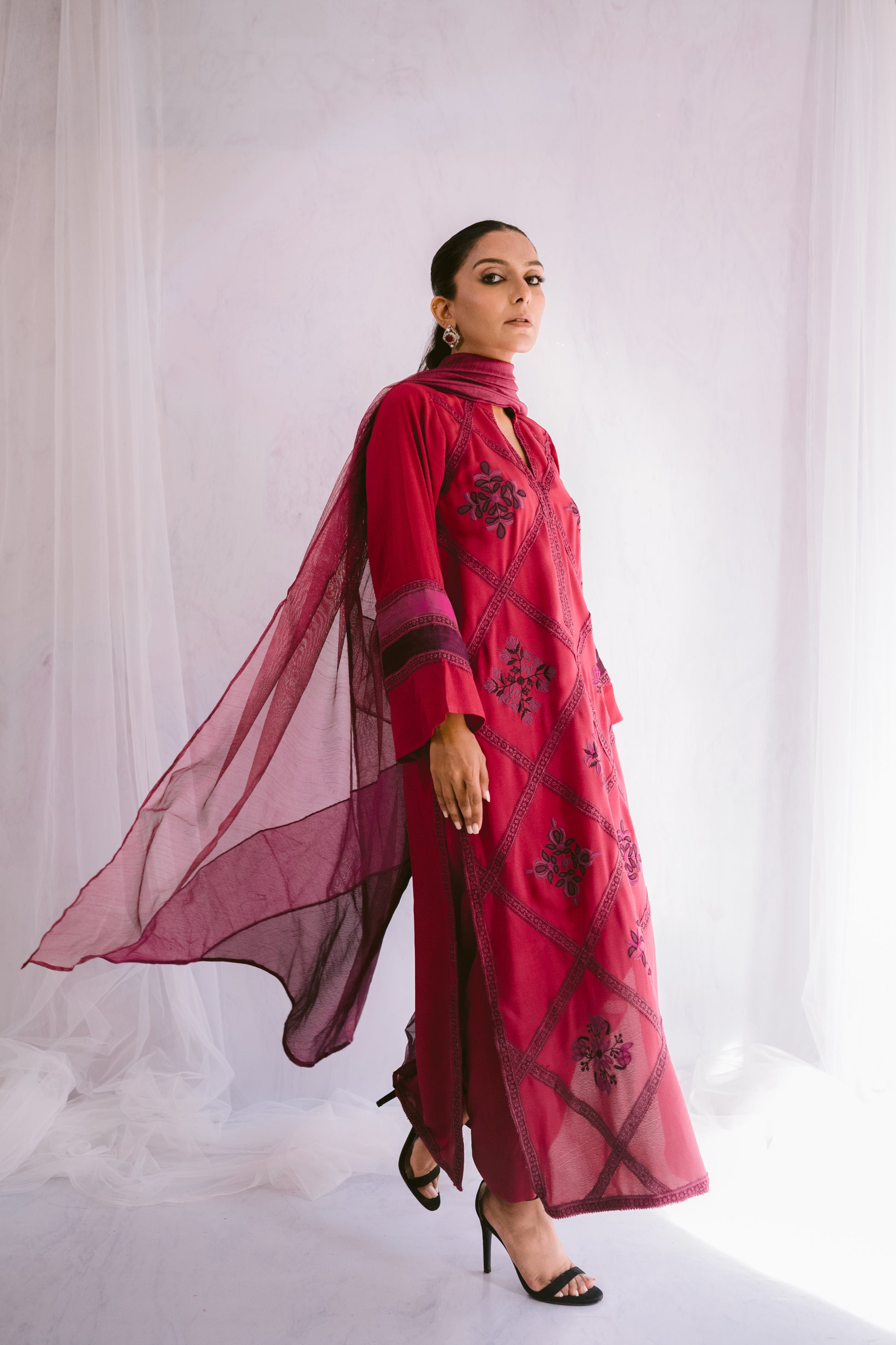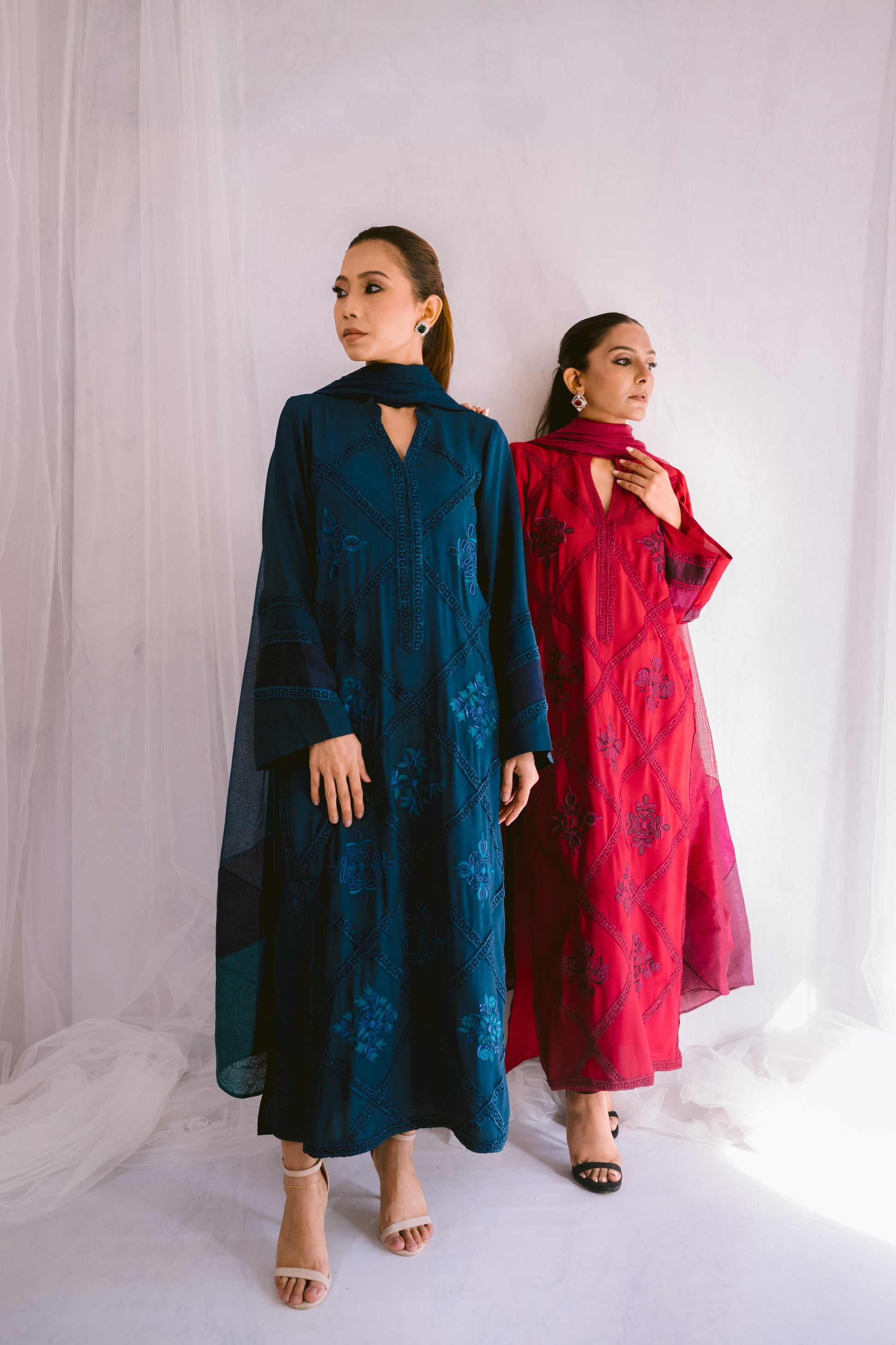 Indulge in exquisite elegance with this cotton crepe ensemble adorned with intricate appliqué work and embroidery, creating a mesmerizing effect throughout. Paired with a stunning color block dupatta, this ensemble effortlessly combines sophistication