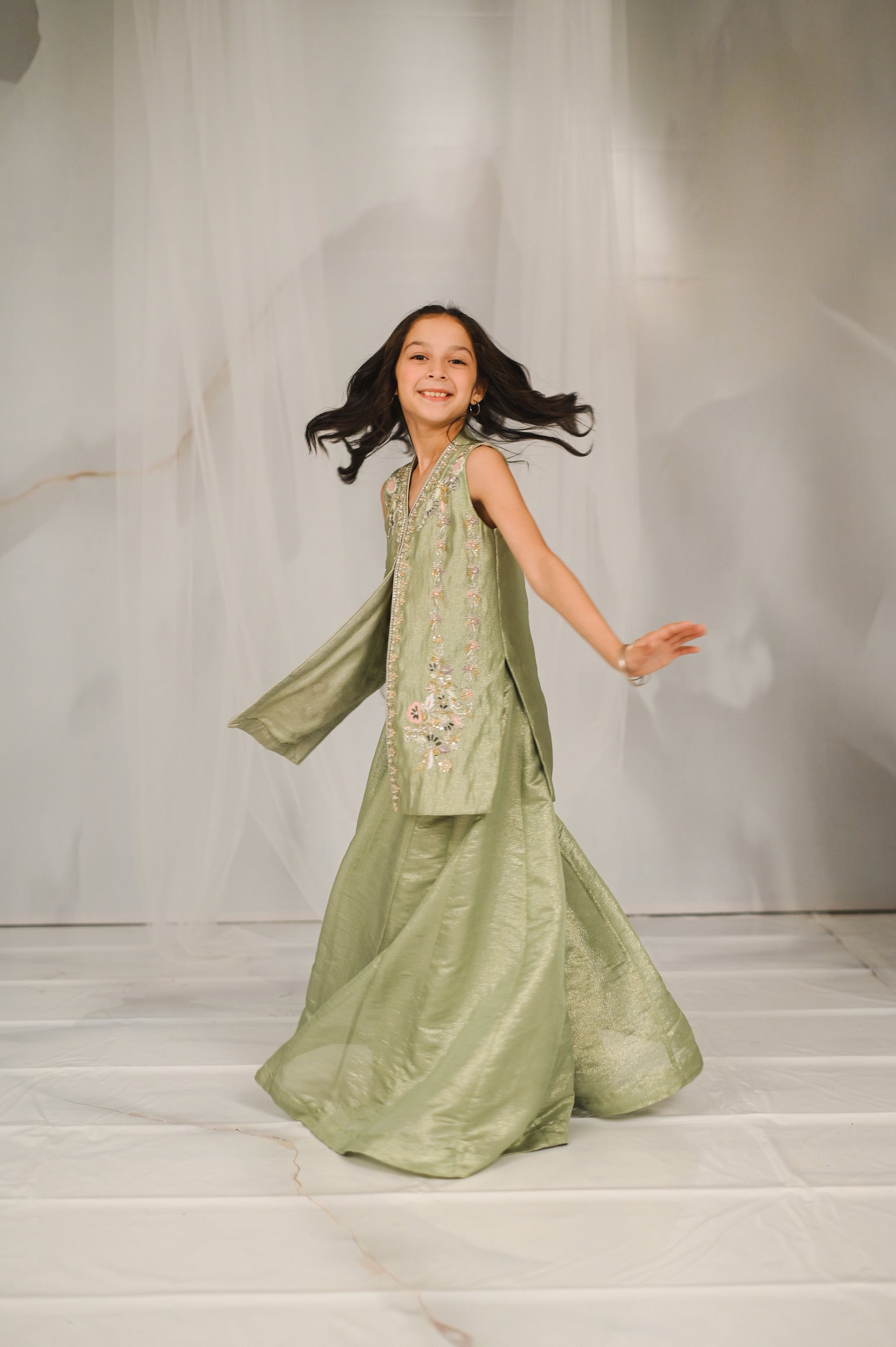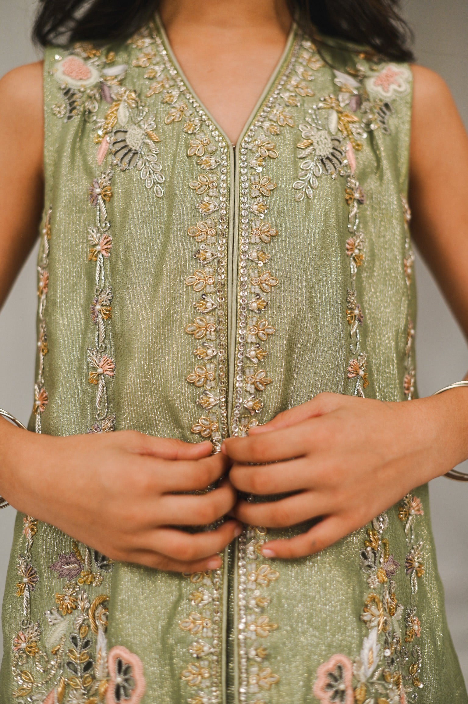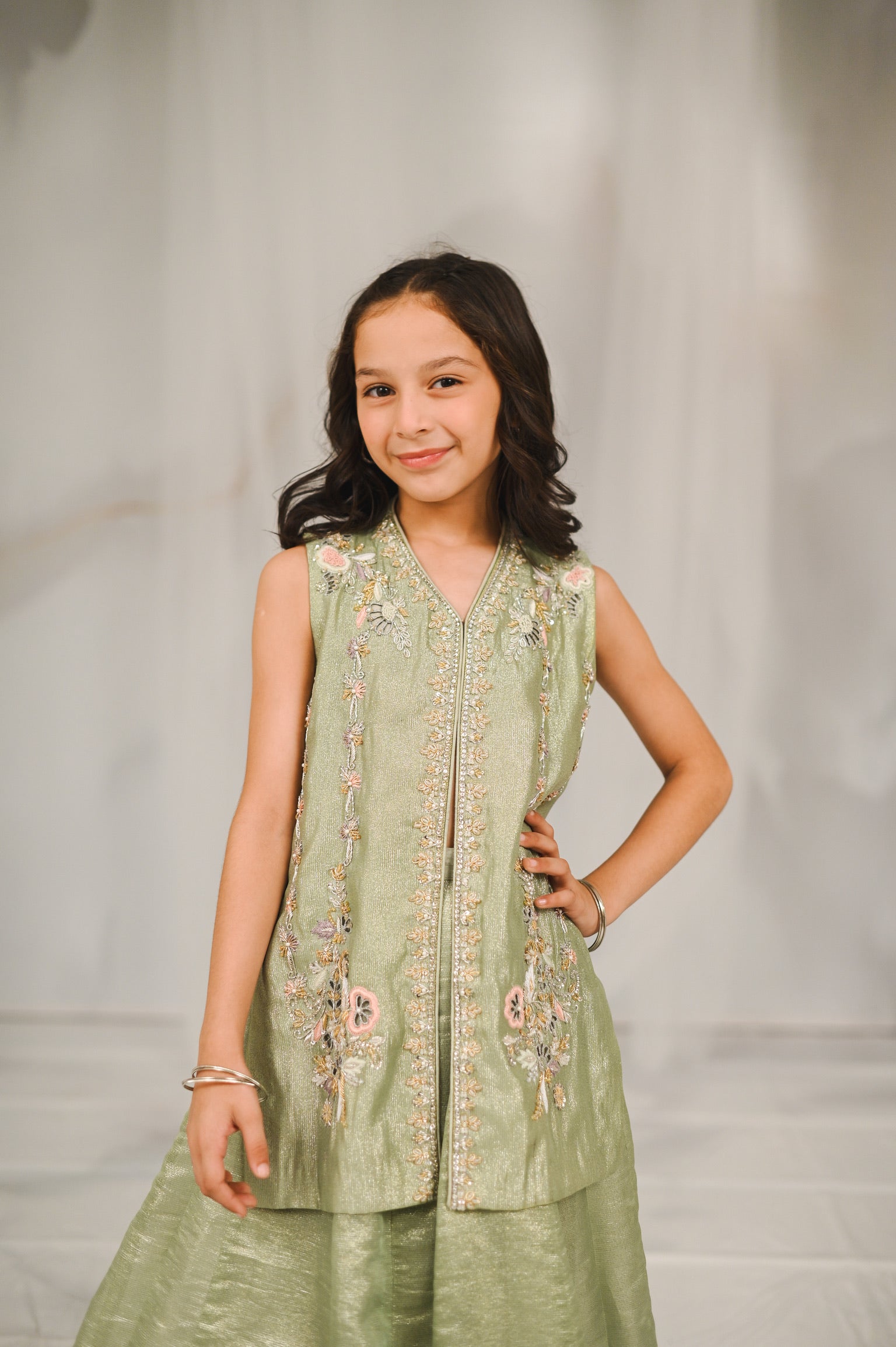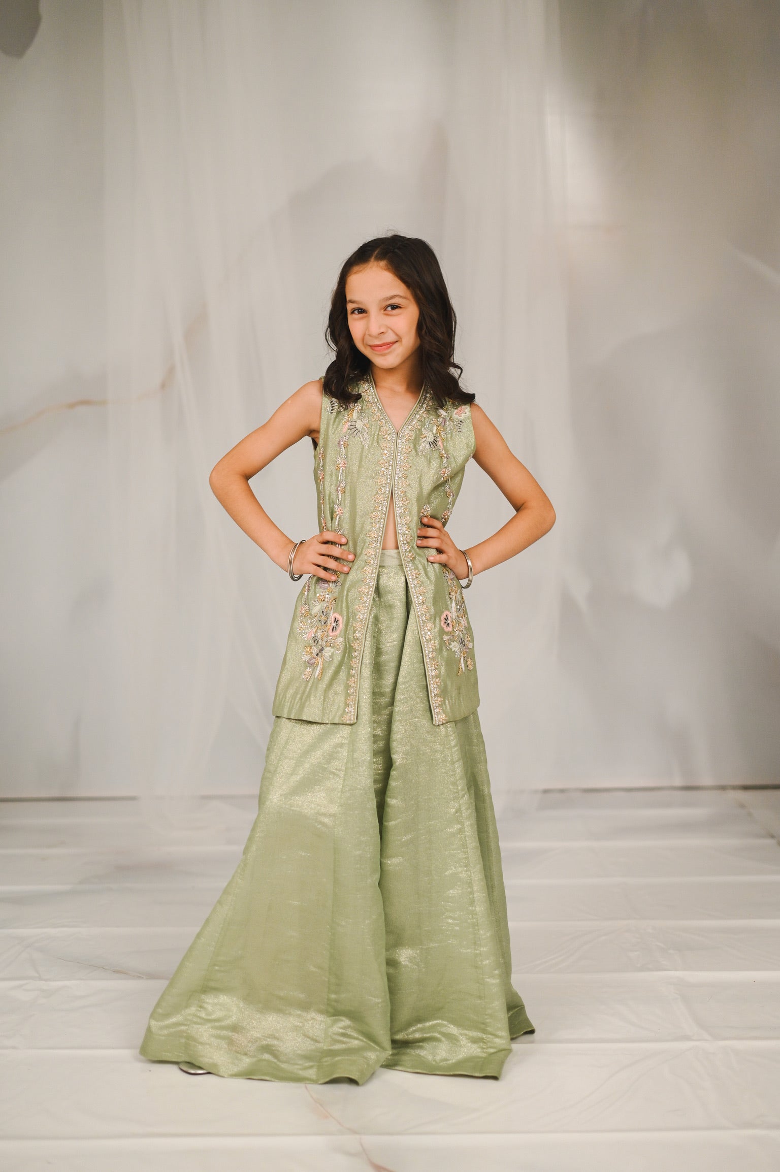 Discover our enchanting Eastern wedding wear designed especially for kids! Featuring a stunning green shimmer jacket adorned with intricate Zardozi work and multi-colored cutwork, this outfit is perfect for festive celebrations. Pair it with matching Dhaka pants for a complete look that exudes elegance and charm. Ideal for weddings, parties, or cultural events, this outfit promises to make your little one the center of attention. Shop now for the perfect blend of tradition and style!