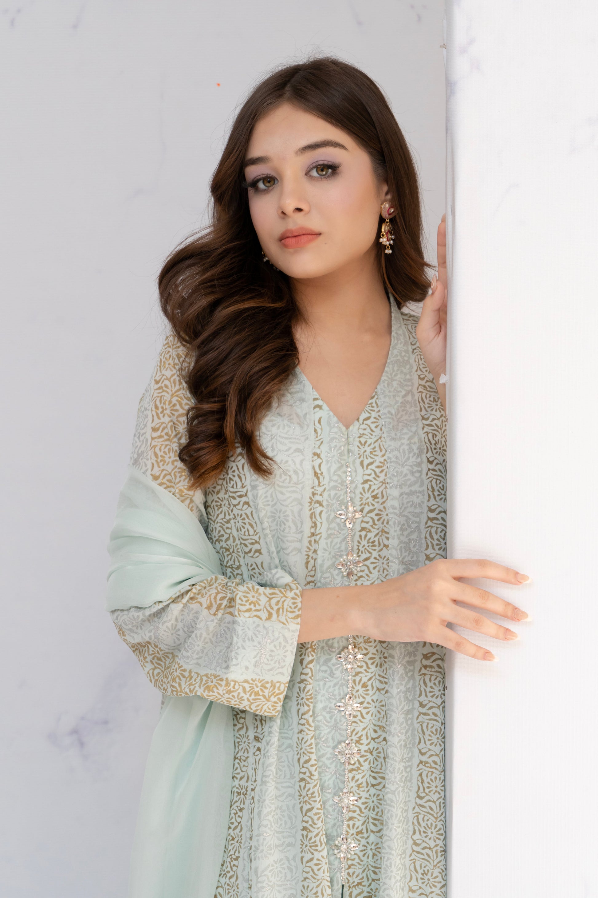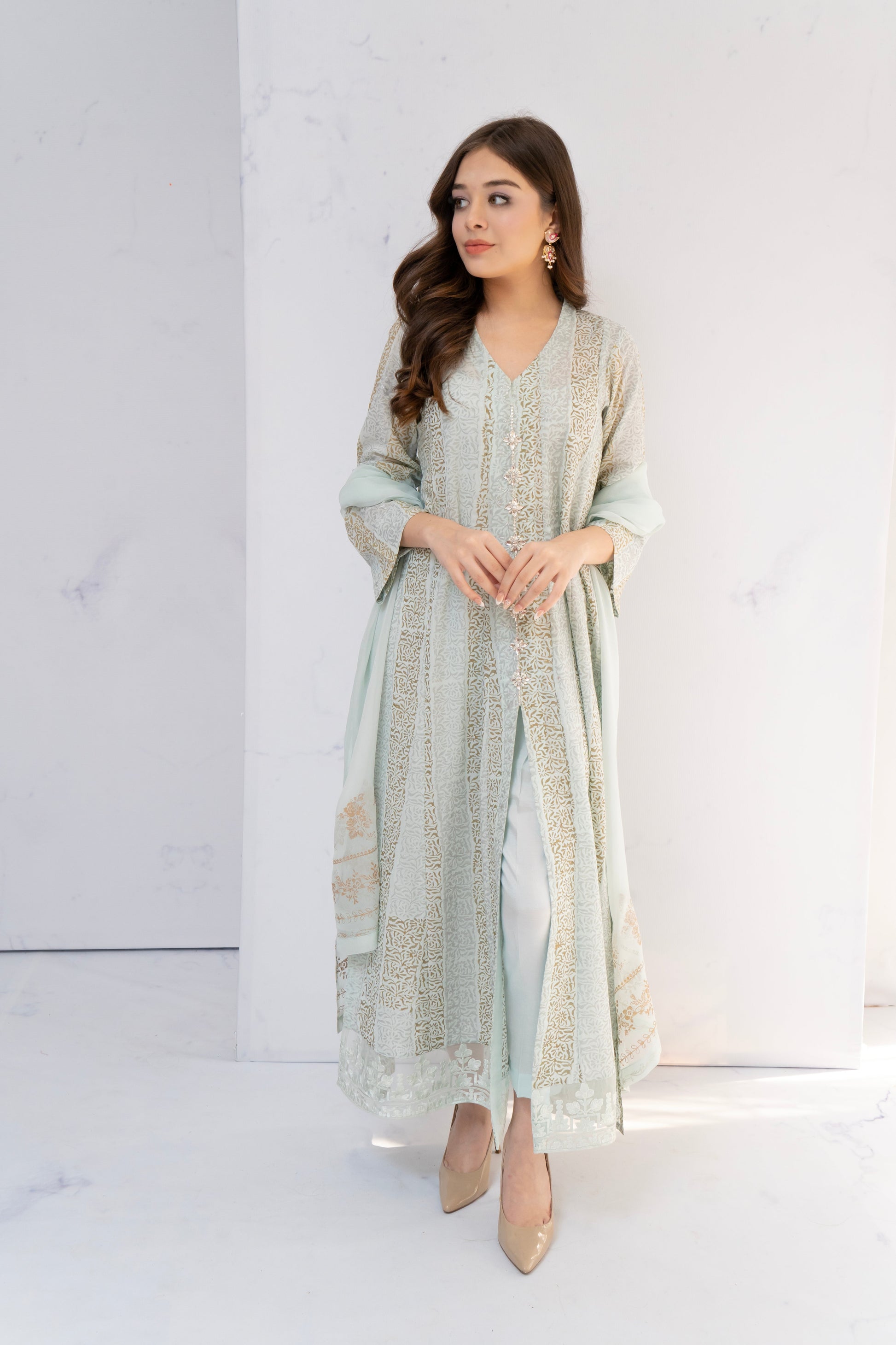 Elevate your style with this enchanting light blue article adorned with block print adding a touch of luxury and sophistication to the soft hue of blue, creating a mesmerizing ensemble that captivates the senses