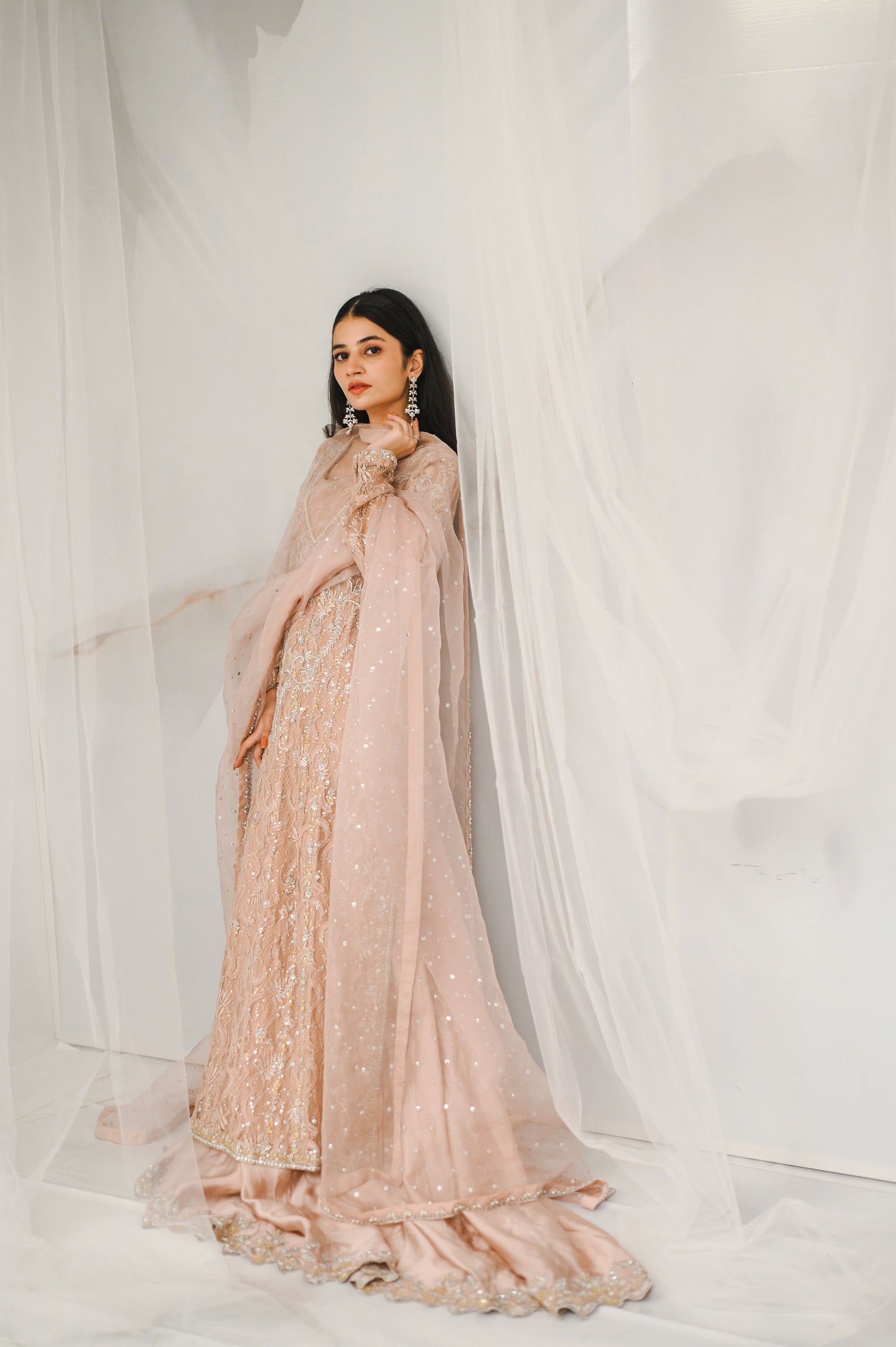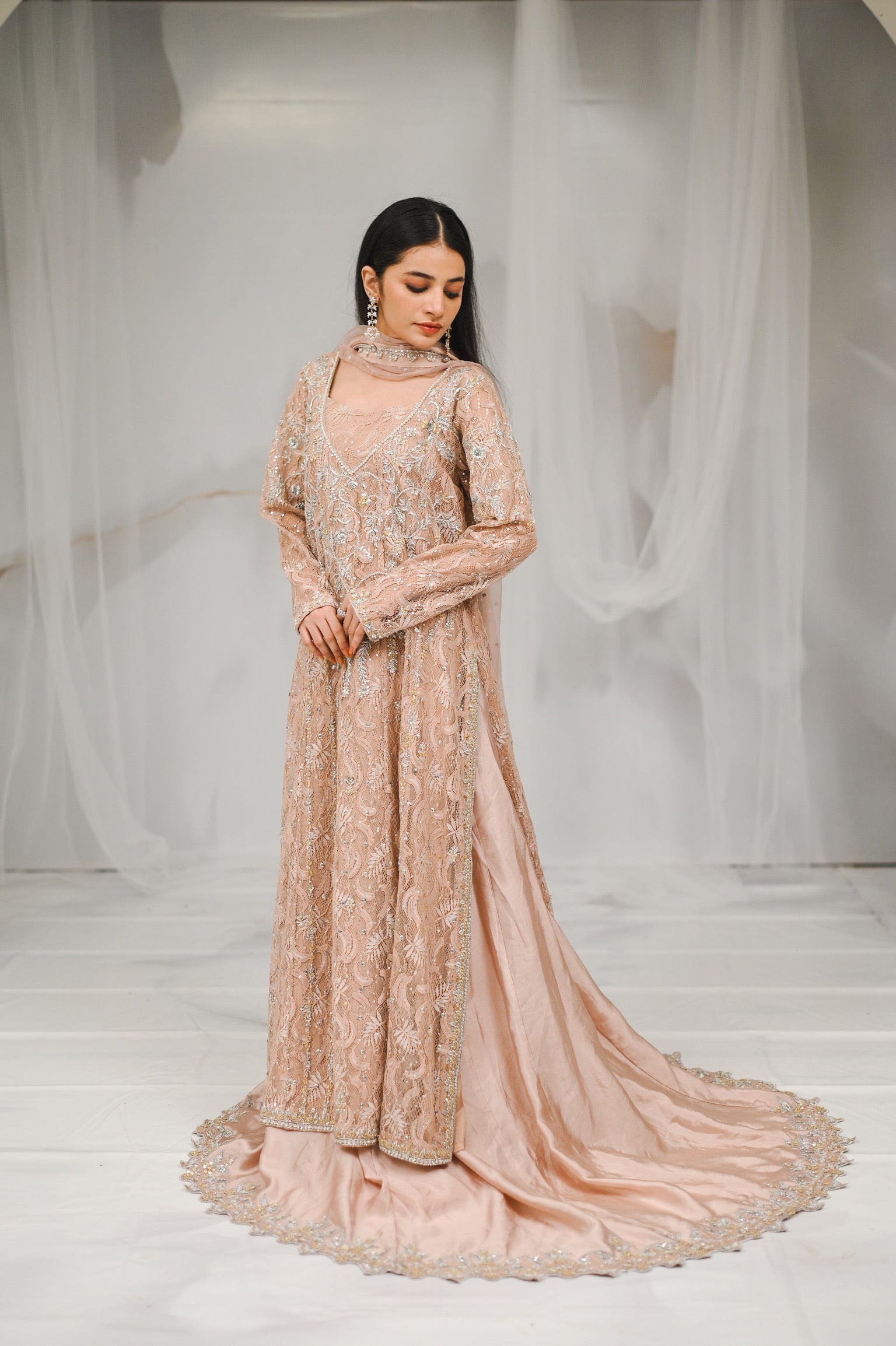 Elevate your ethnic wardrobe with our stunning pink net A-line shirt, embellished with intricate heavy handwork on the neckline and throughout. This exquisite piece pairs beautifully with a luxurious pure Sheesha silk lehenga featuring a trail, embroidered zari borders, and delicate sequins that catch the light. Completing the look is a graceful organza dupatta adorned with delightful Chan all over and a border for an added touch of elegance. Perfect for weddings and special occasions, this ensemble embodies timeless sophistication and intricate craftsmanship, making it a must-have for fashion-forward women. Shop now to make a lasting impression!