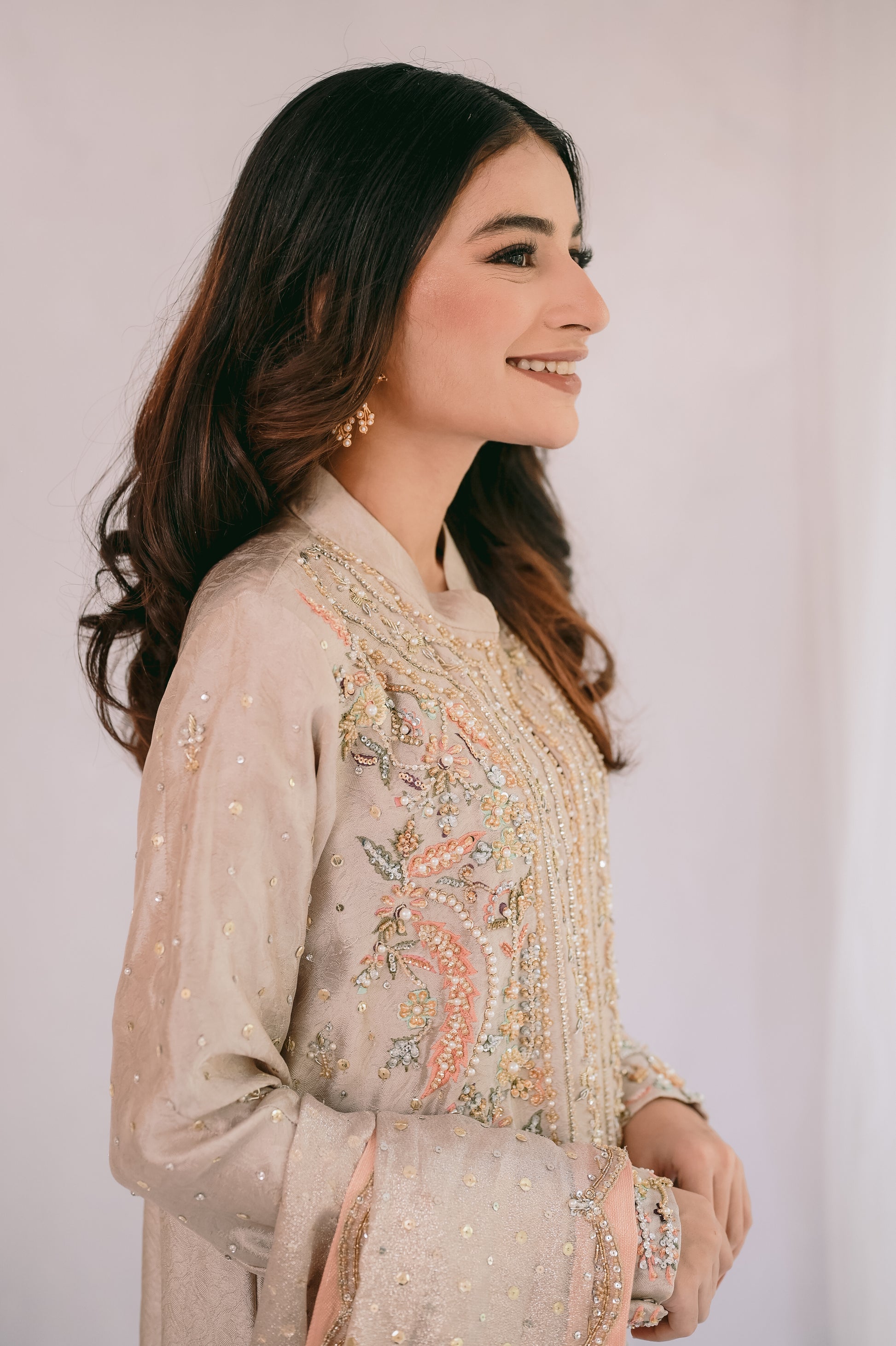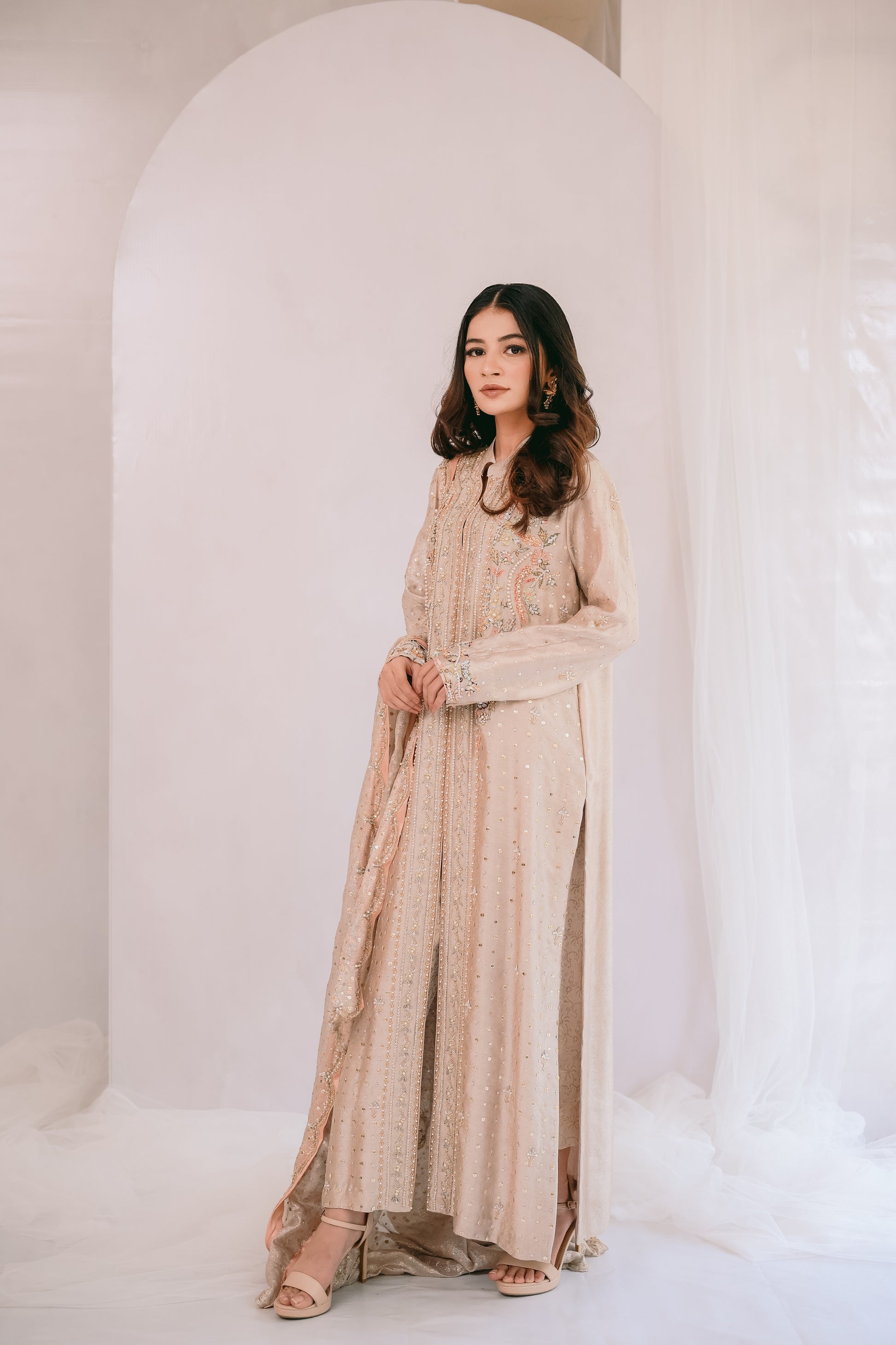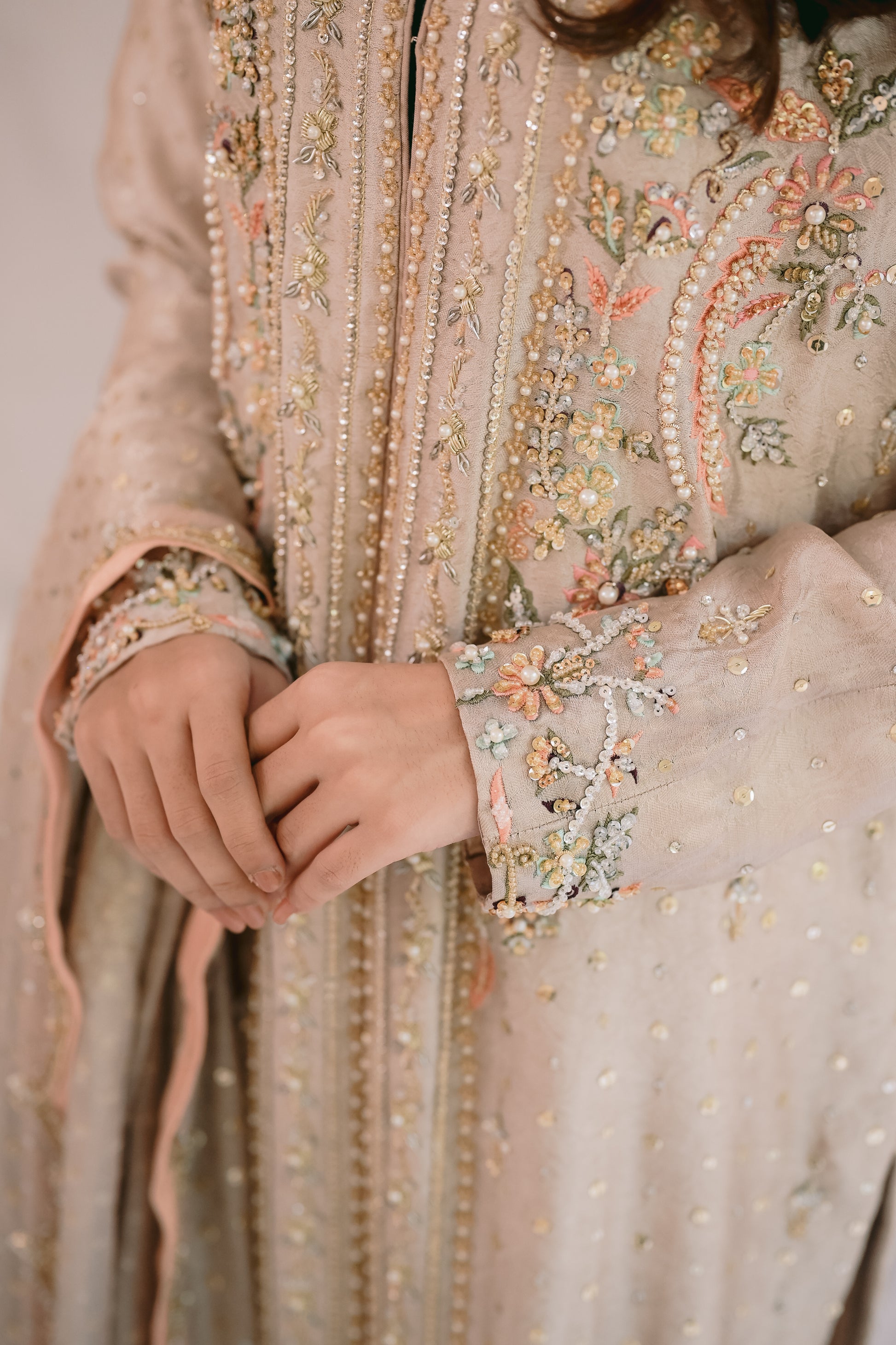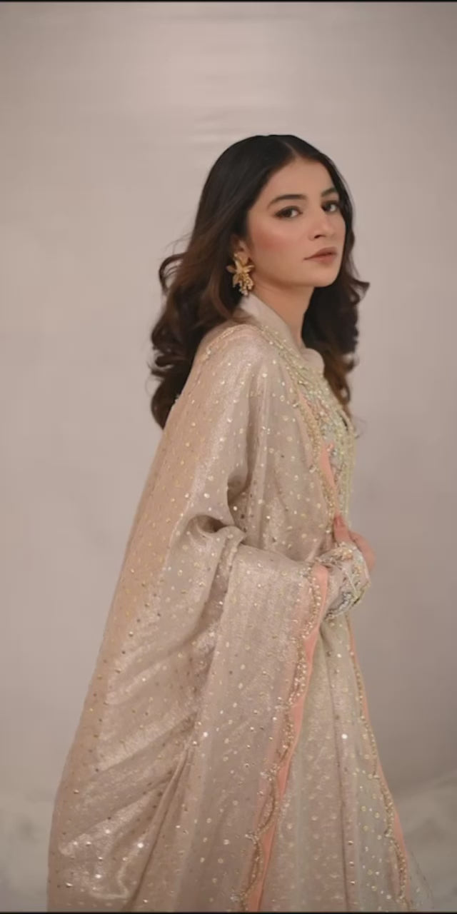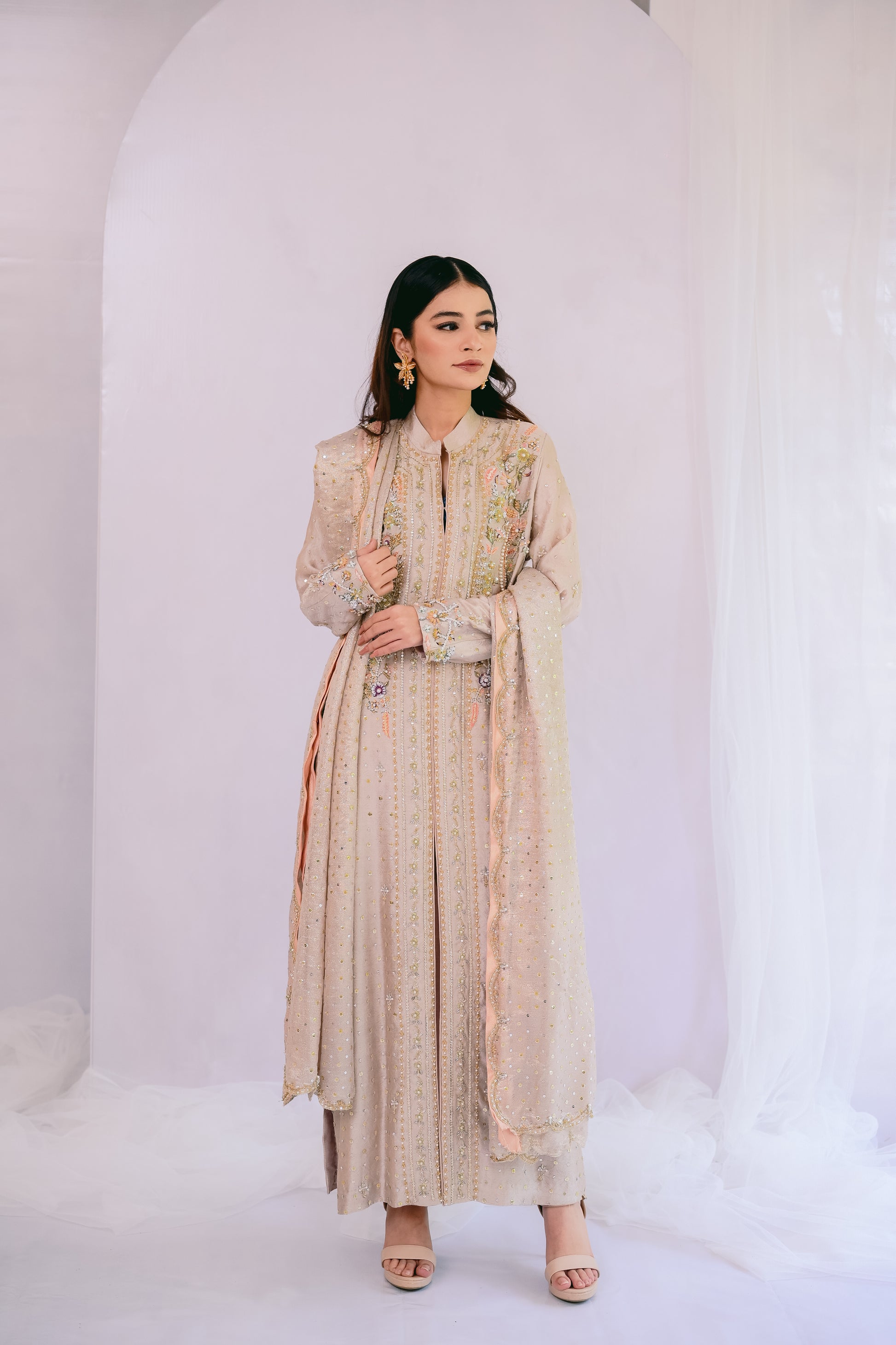 Discover elegance redefined with our pure Sheesha silk front open shirt, featuring exquisite thread, sequins, and dabka work. Paired with banarsi pants and a Chan pure Maisoori dupatta, this ensemble is perfect for luxurious celebrations