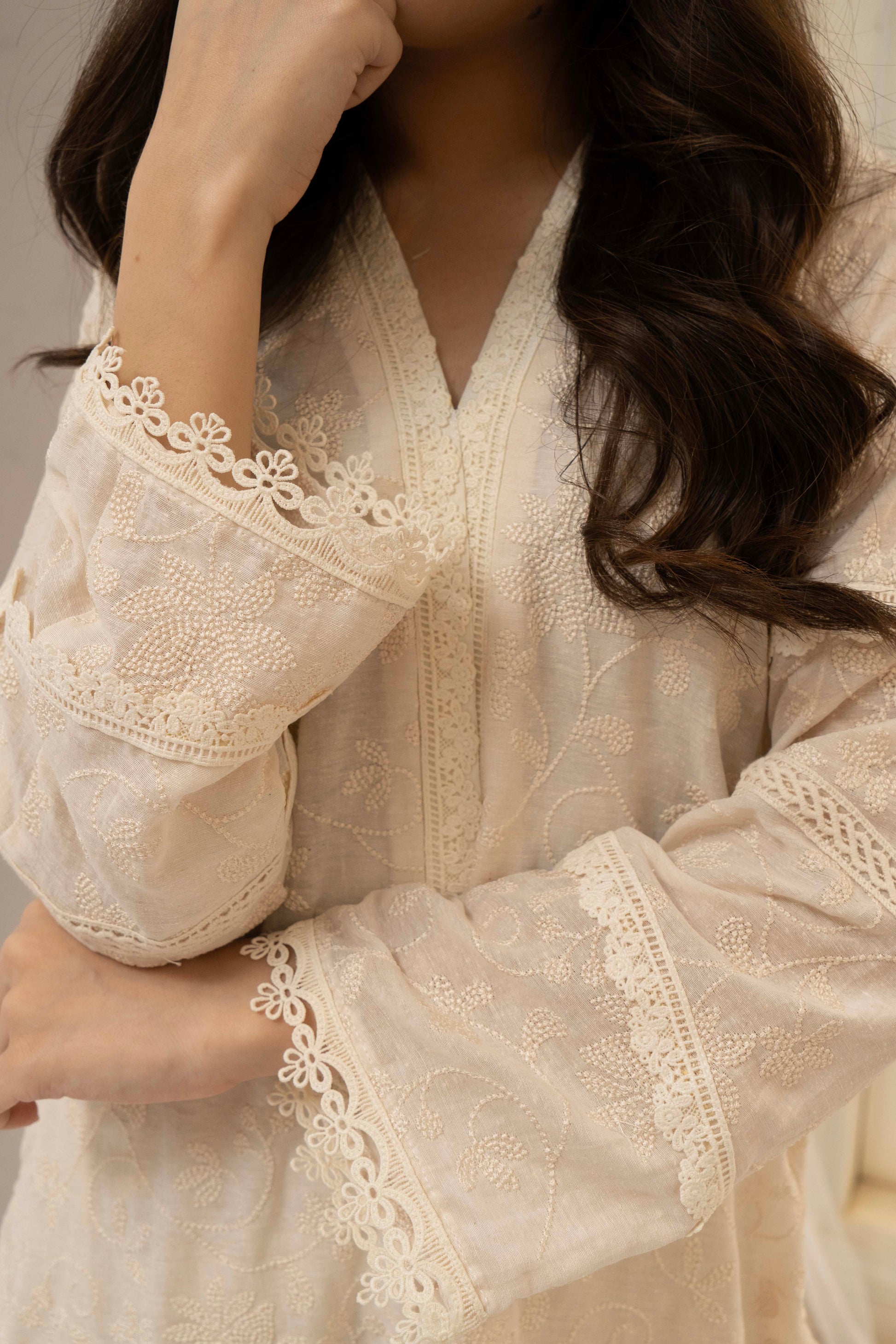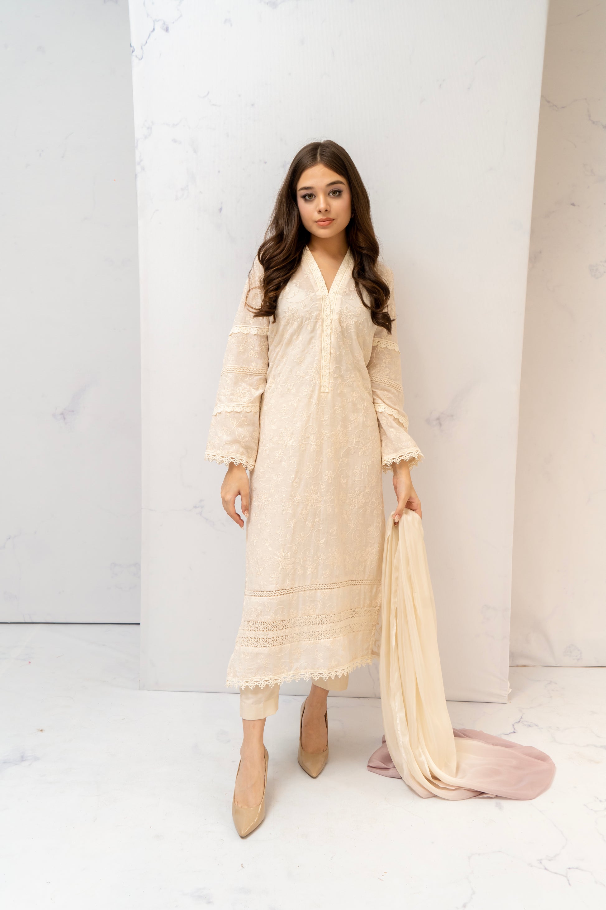 Embrace the timeless elegance of white adorned with a touch of lilac in this embroidered 3 piece in pure kurrendi. Perfect for any occasion, from daytime gatherings to evening soirées, let this ensemble be your canvas for expressing effortless style and timeless charm.