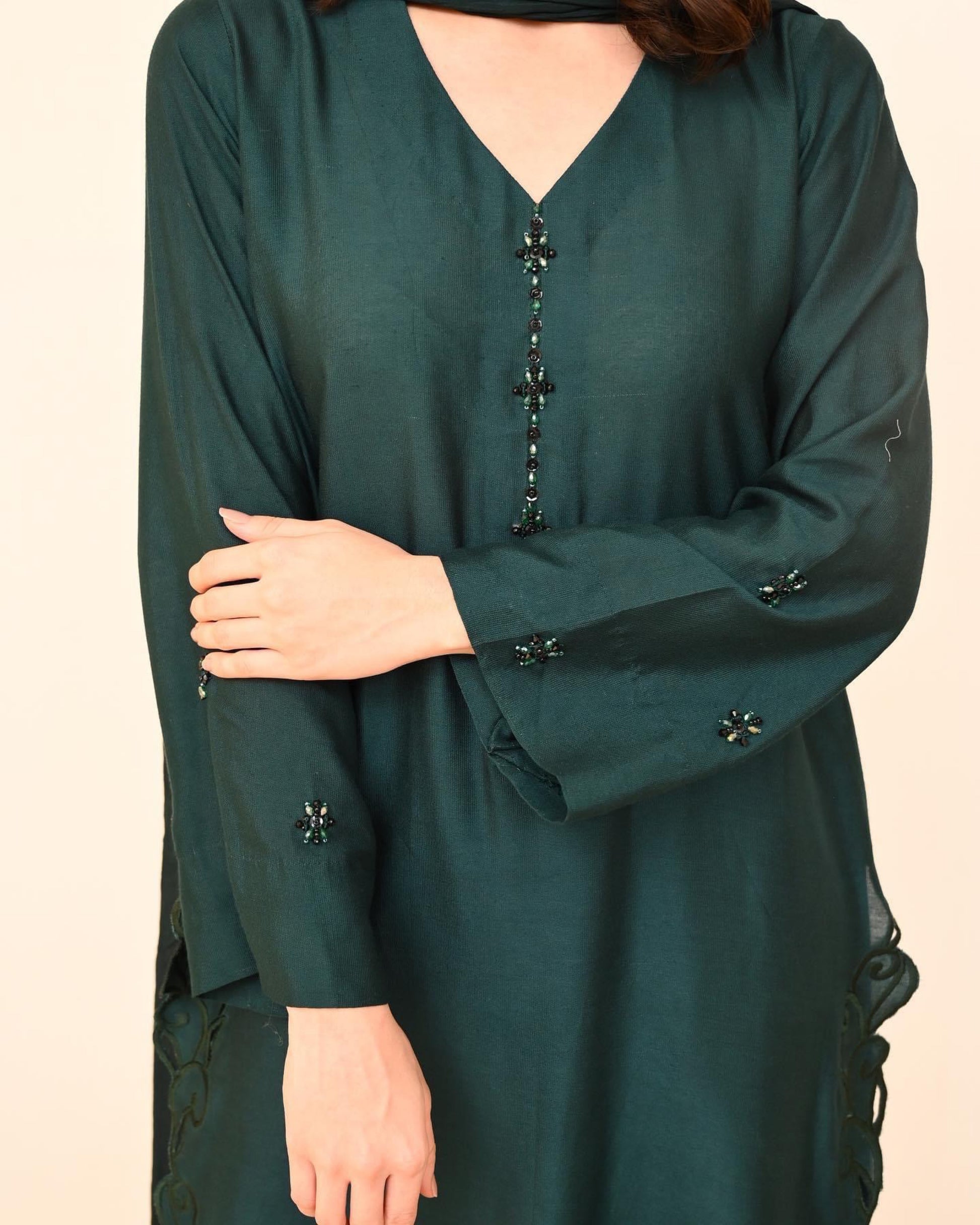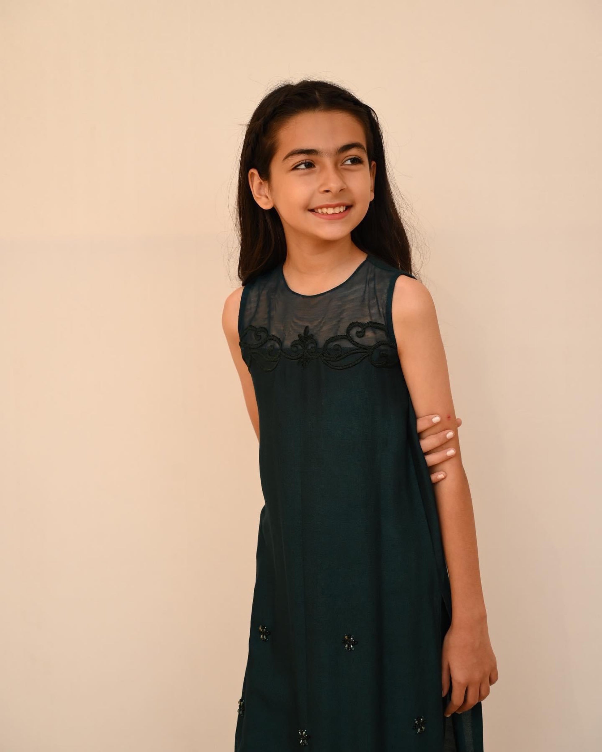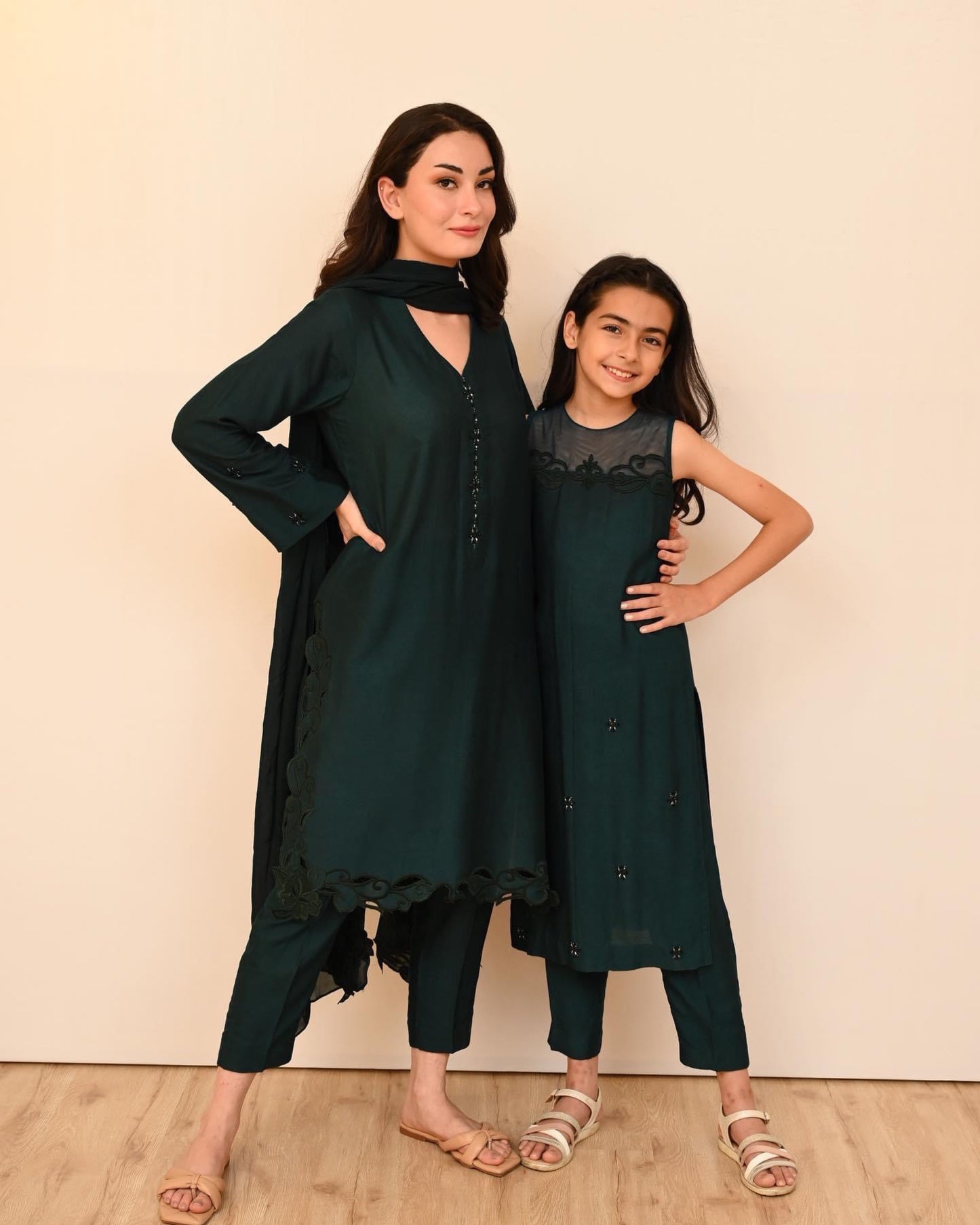 The emerald green khadi silk mommy and daughter matching set exudes elegance and style. The outfit features beautiful stone work on the sleeves and neckline, adding a touch of glamour. The cutwork embroidered border on the daman and chaak further enhances the intricate design. Paired with a silk dupatta in the same color, this ensemble is perfect for a special occasion or event. The matching set allows mothers and daughters to bond while looking effortlessly chic and sophisticated.