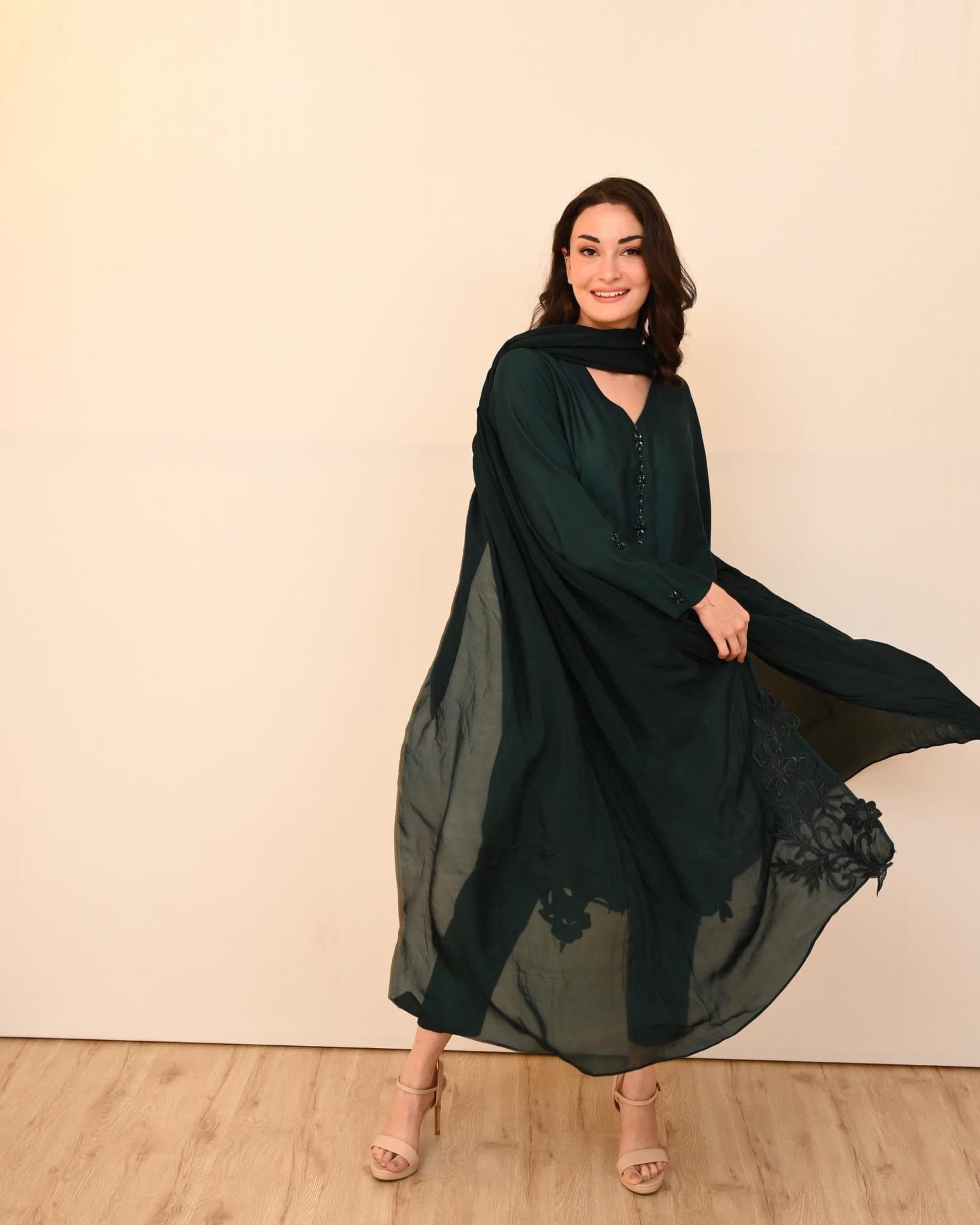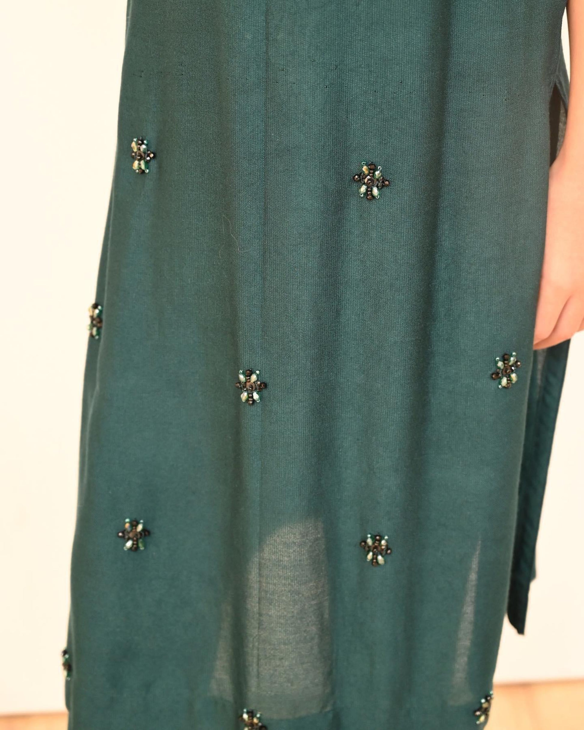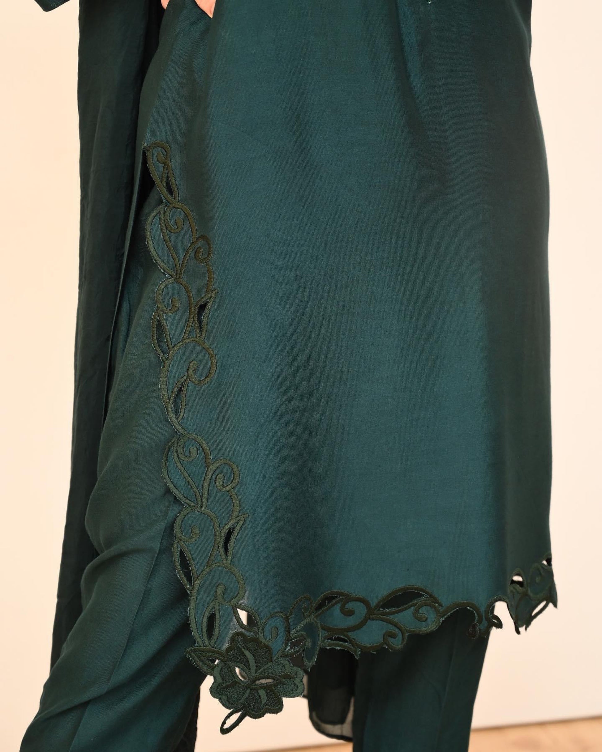 The emerald green khadi silk mommy and daughter matching set exudes elegance and style. The outfit features beautiful stone work on the sleeves and neckline, adding a touch of glamour. The cutwork embroidered border on the daman and chaak further enhances the intricate design. Paired with a silk dupatta in the same color, this ensemble is perfect for a special occasion or event. The matching set allows mothers and daughters to bond while looking effortlessly chic and sophisticated.