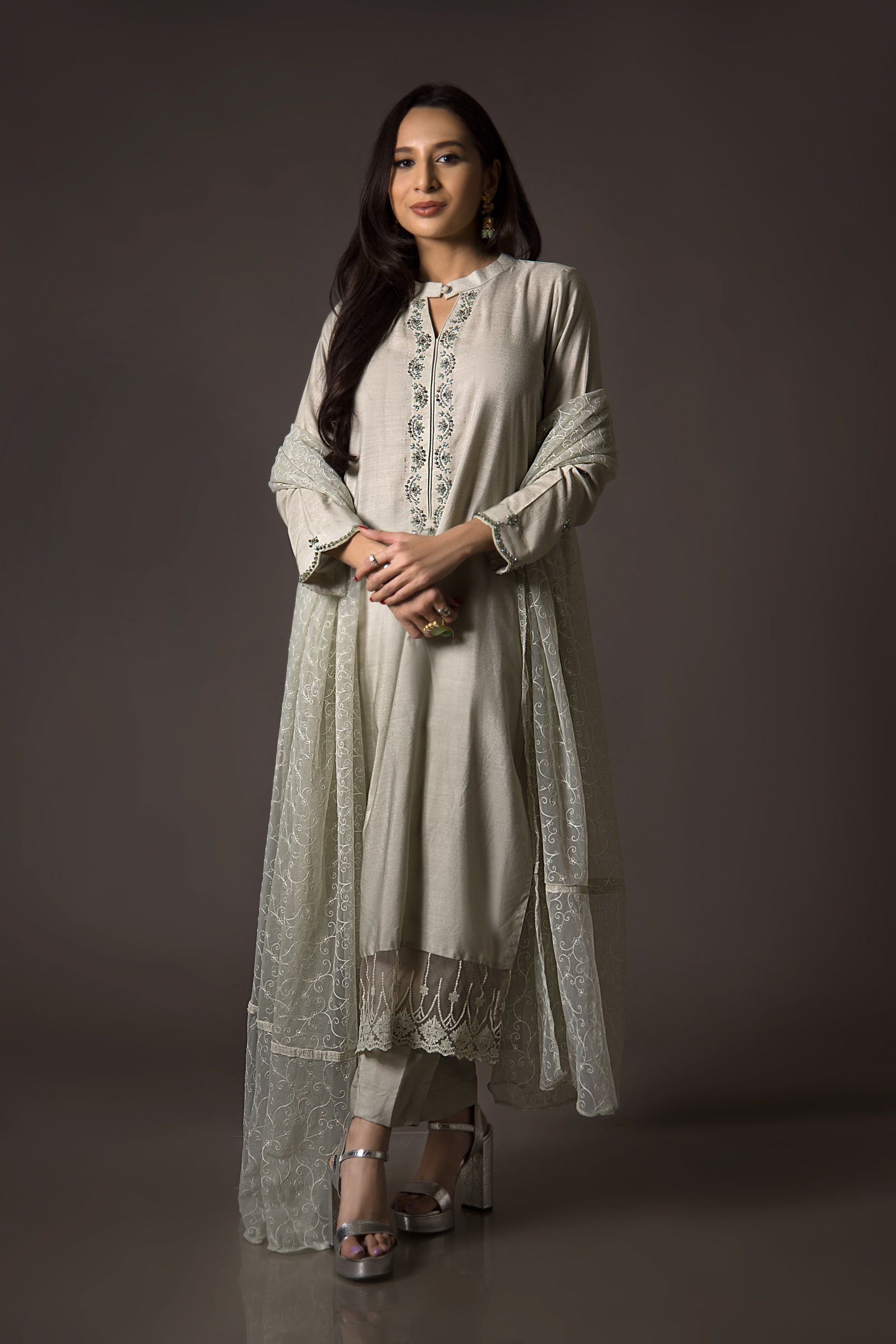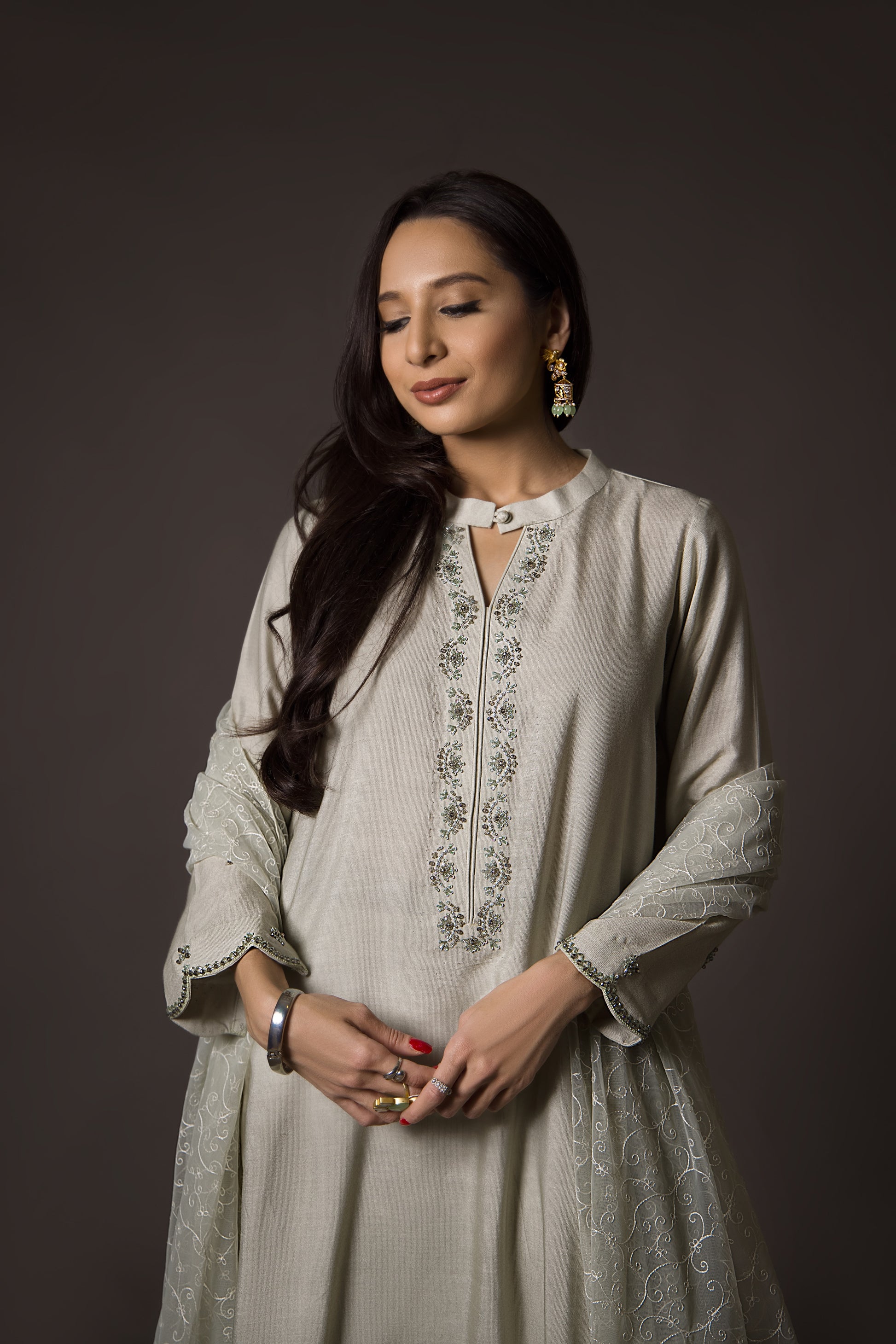This stunning mint green khadi silk matching set is adorned with beautiful stone work in the same color, adding a touch of elegance and glamour. Paired with a matching net dupatta, this outfit is perfect for any special occasion or celebration.