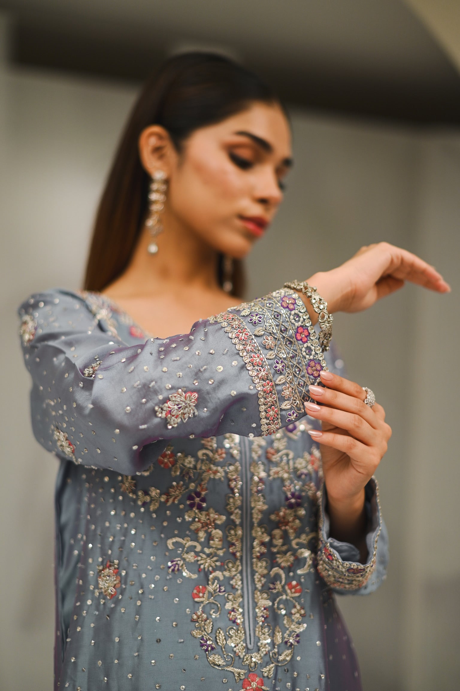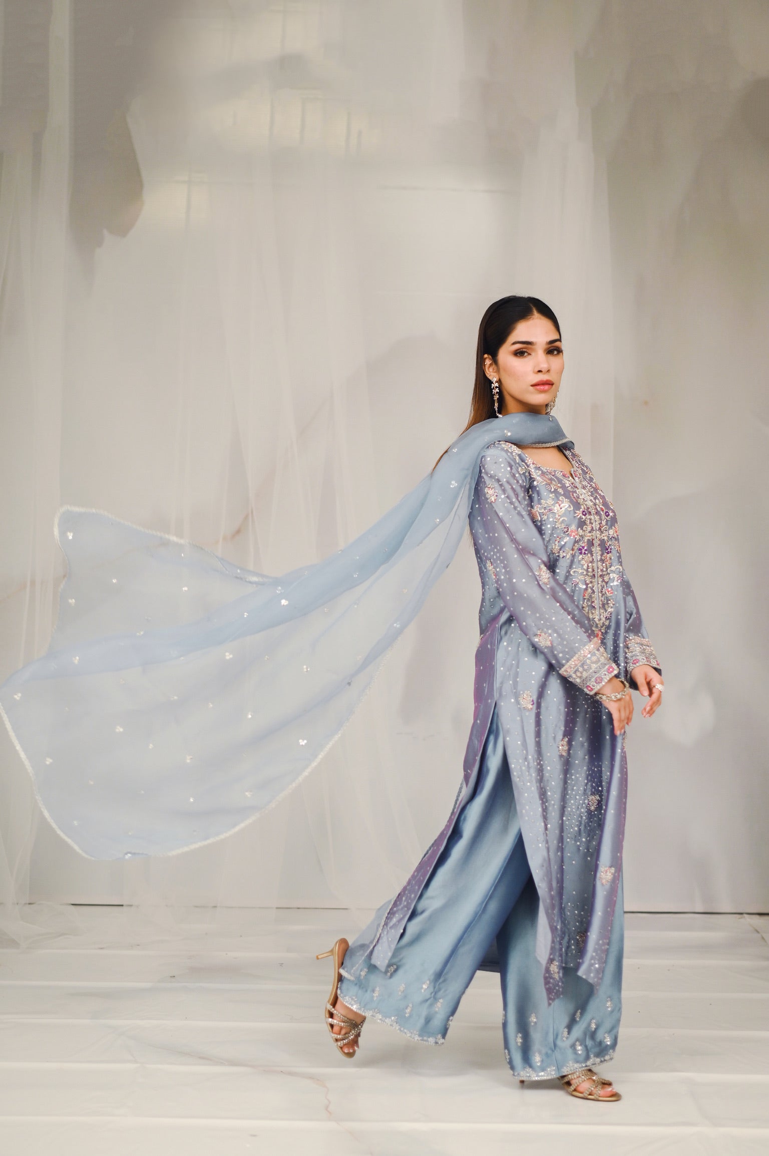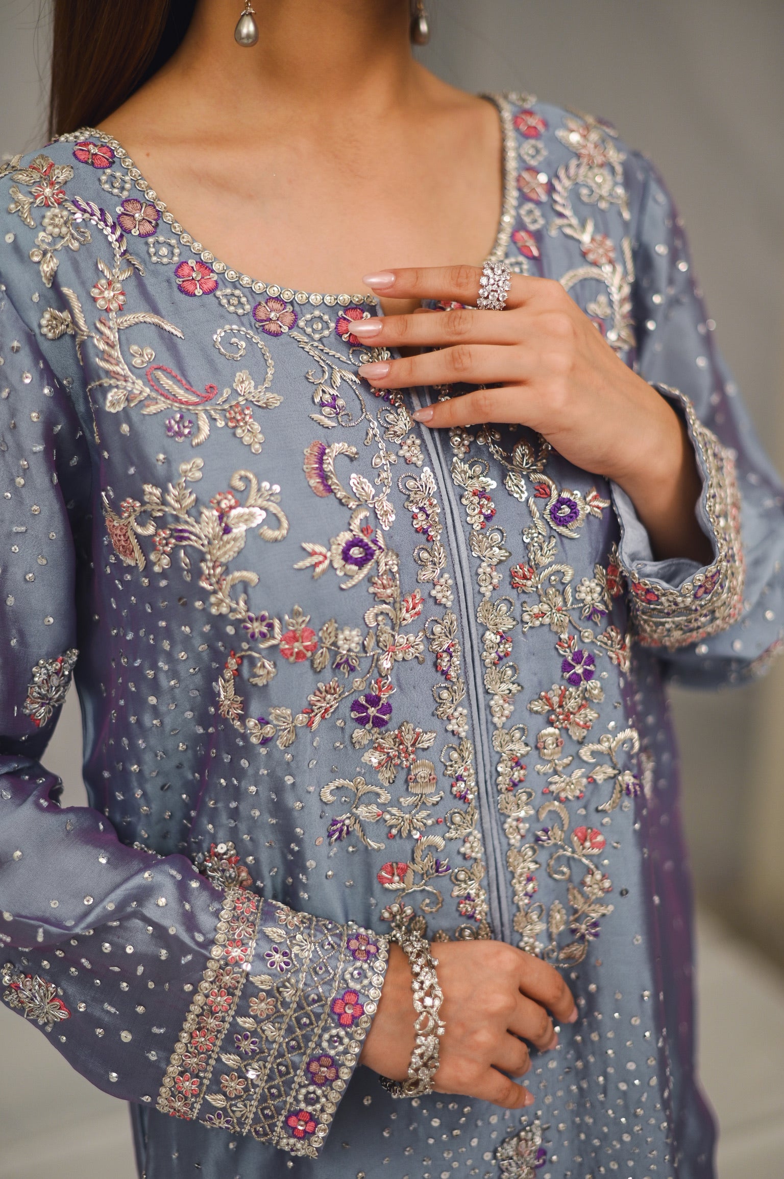 Discover the epitome of elegance with our stunning wedding formals featuring a meticulously crafted shirt embellished with intricate silver Zardozi work and a vibrant array of multi-colored thread work. Adorned with sequins, kora, dabka, and shimmering stone detailing, this masterpiece exudes sophistication and charm. The shirt is complemented by stylish culottes, showcasing exquisite hand-worked trimmings, and a luxurious pure organza dupatta embellished with delicate Chan. Perfect for making a statement at any wedding or festive occasion, this ensemble blends traditional artistry with modern elegance. Shop now and stand out in style!