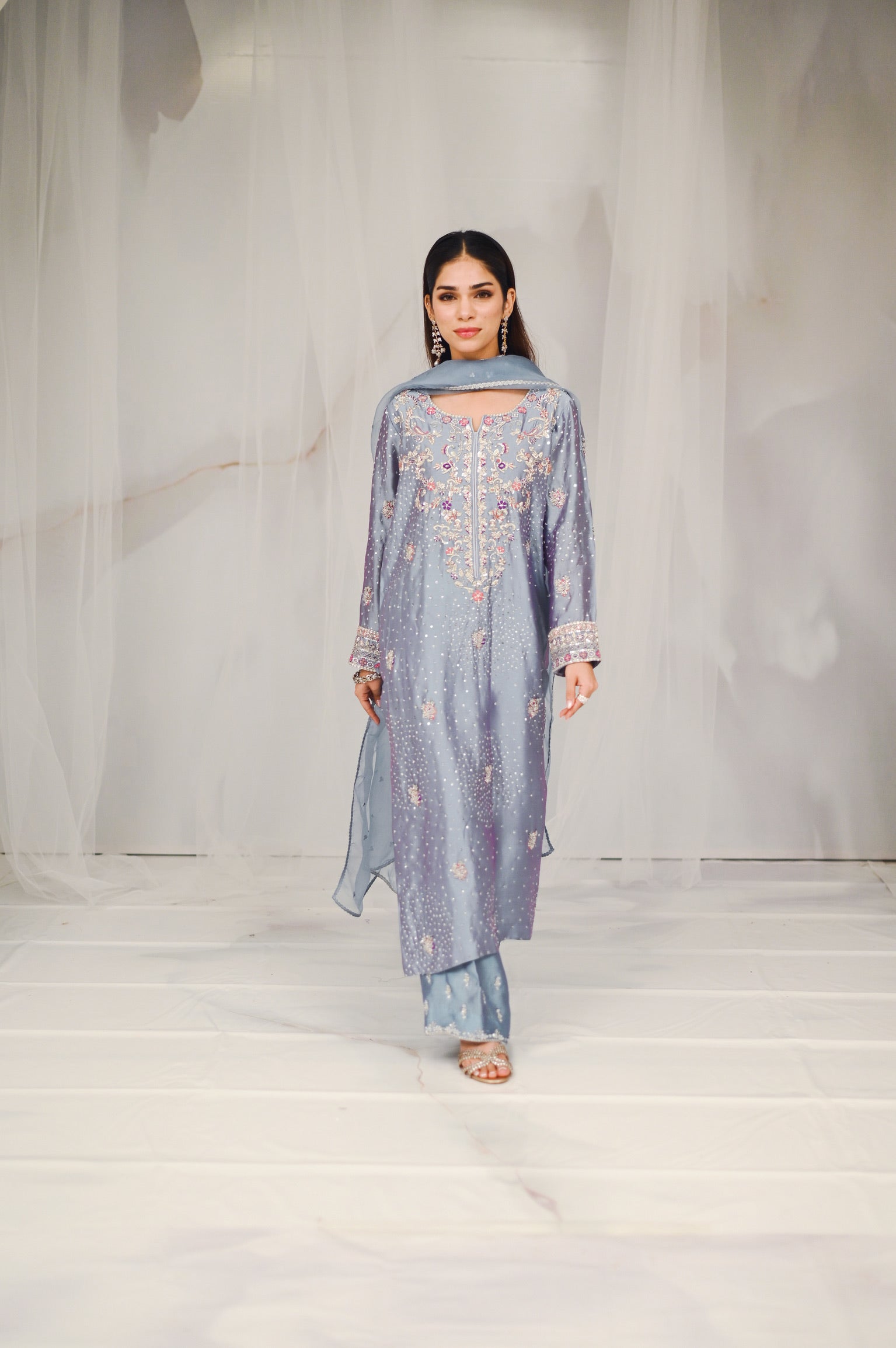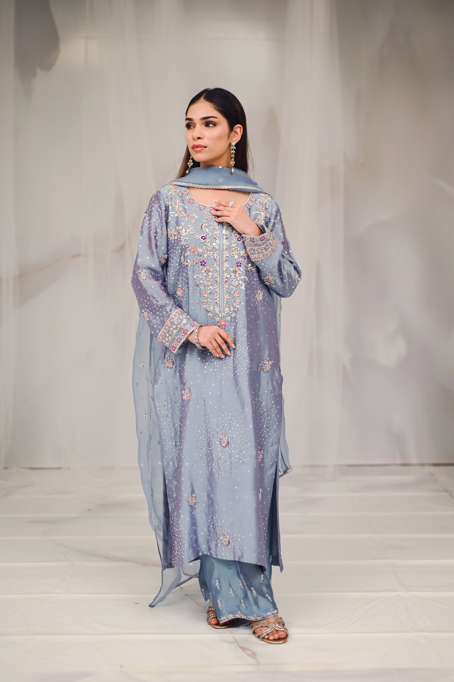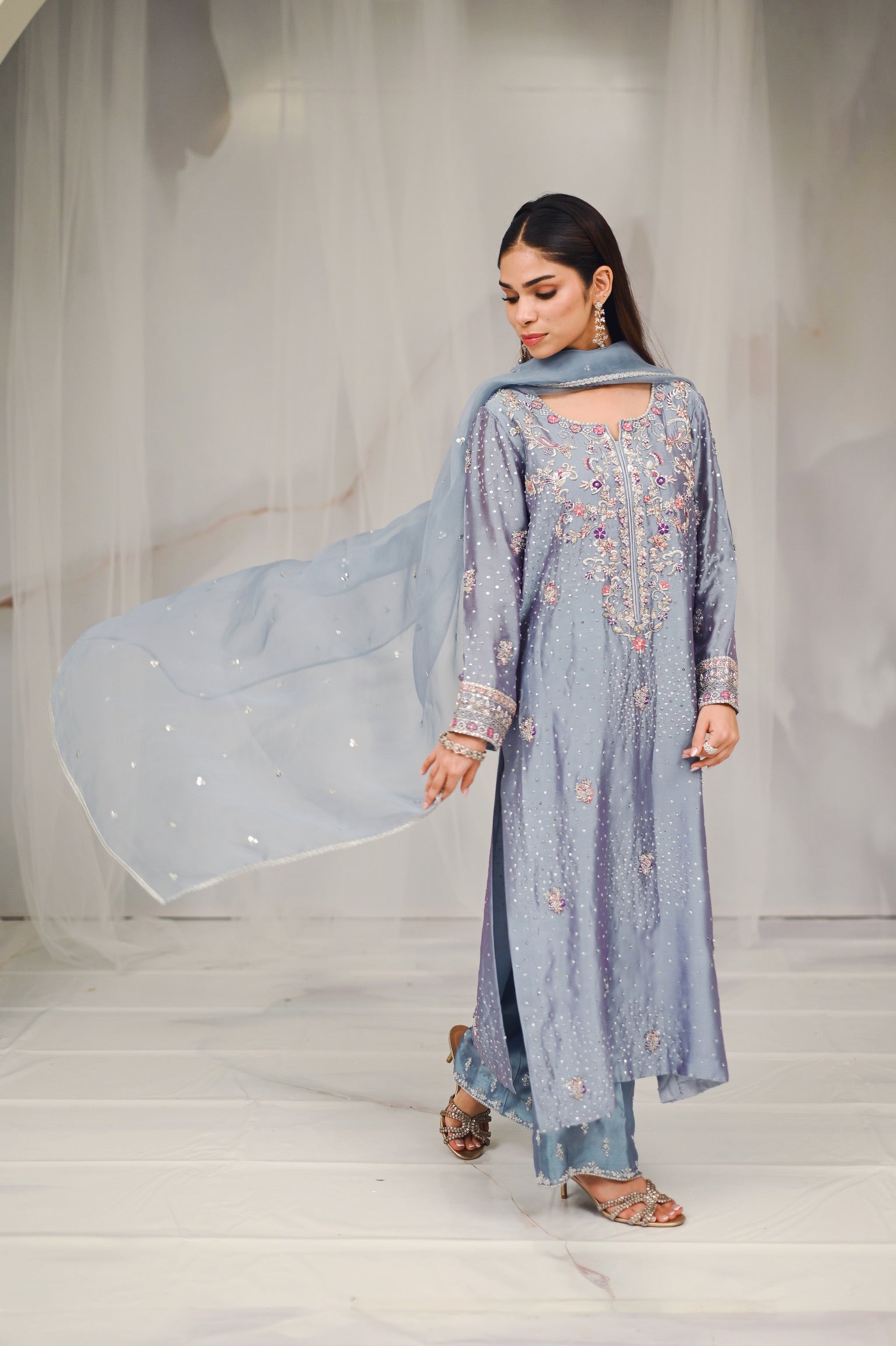 Discover the epitome of elegance with our stunning wedding formals featuring a meticulously crafted shirt embellished with intricate silver Zardozi work and a vibrant array of multi-colored thread work. Adorned with sequins, kora, dabka, and shimmering stone detailing, this masterpiece exudes sophistication and charm. The shirt is complemented by stylish culottes, showcasing exquisite hand-worked trimmings, and a luxurious pure organza dupatta embellished with delicate Chan. Perfect for making a statement at any wedding or festive occasion, this ensemble blends traditional artistry with modern elegance. Shop now and stand out in style!