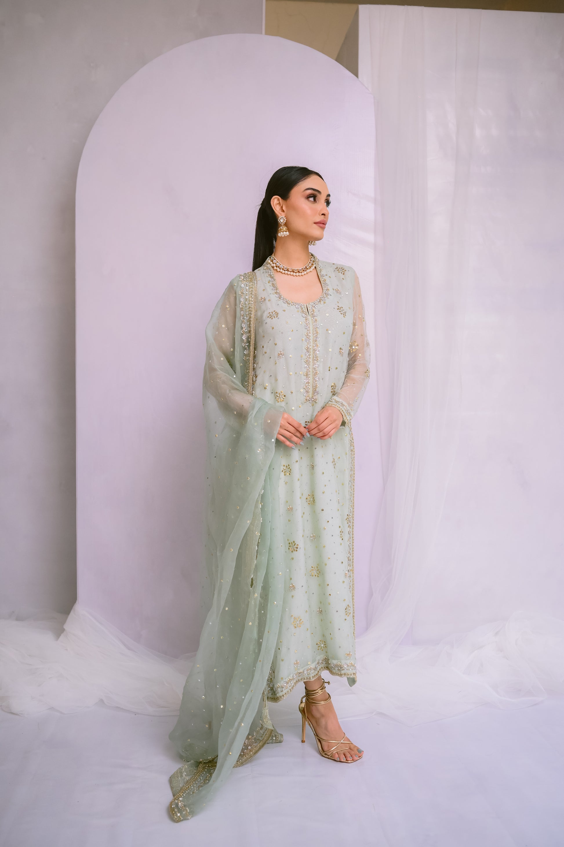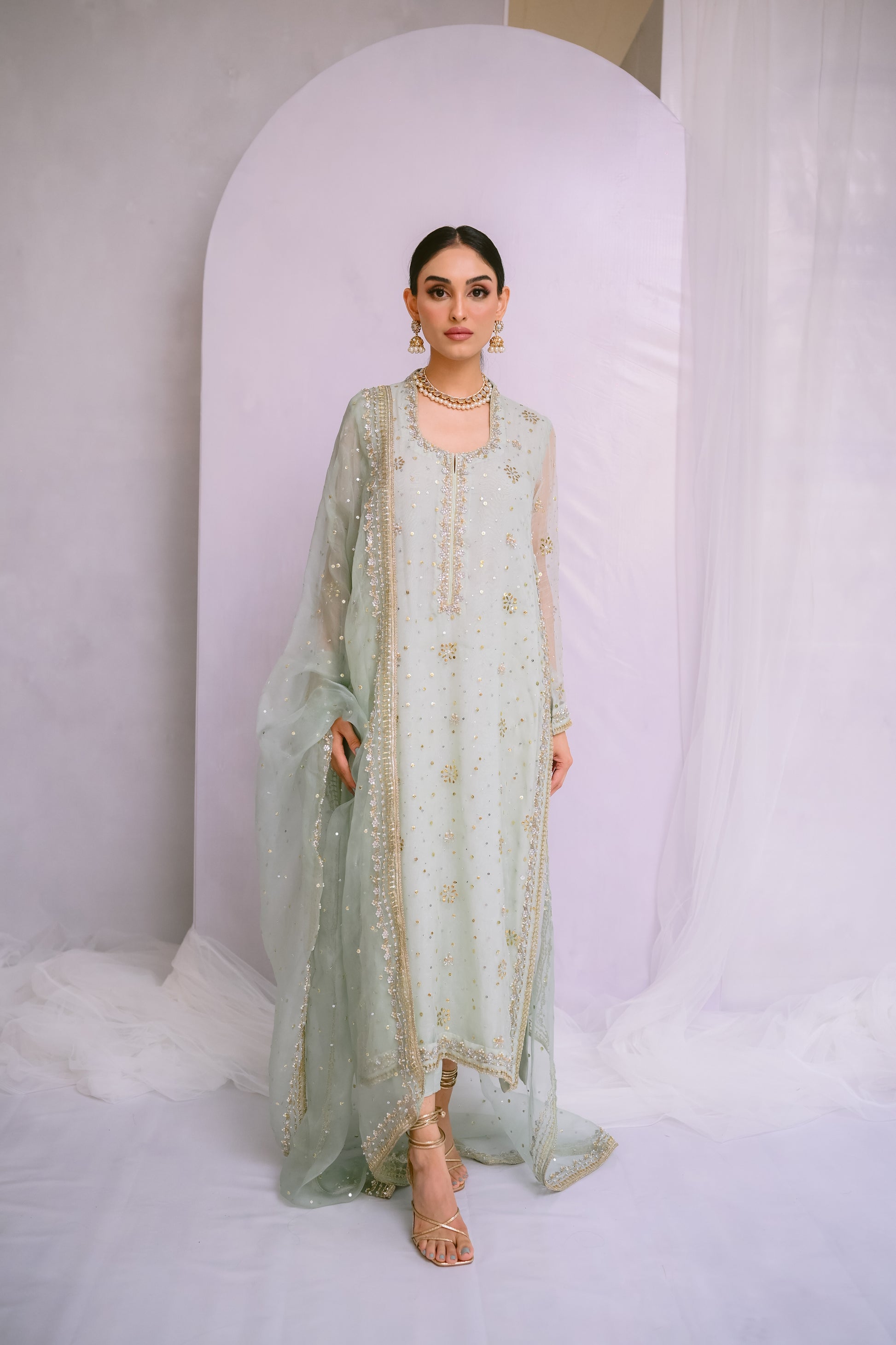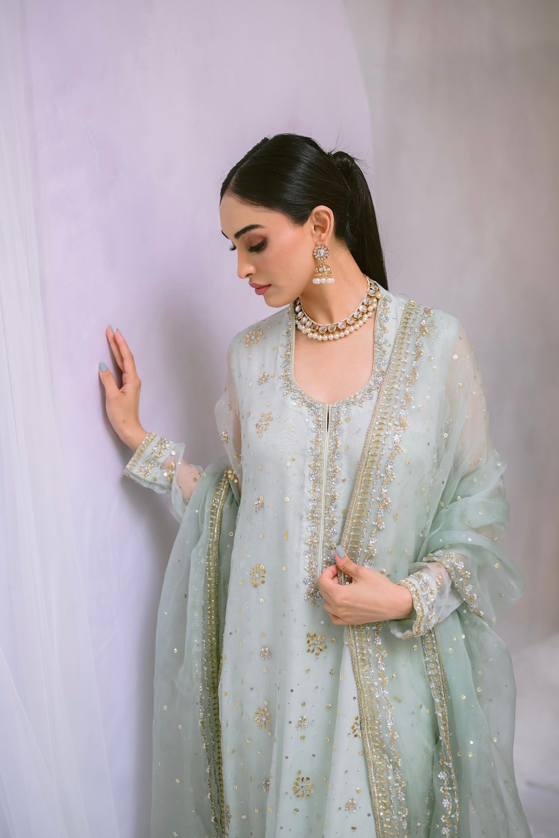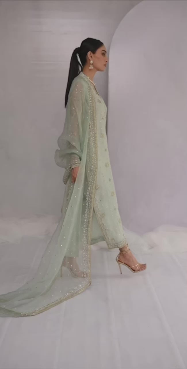 Step into refined elegance with this pure organza long shirt, adorned with exquisite Kamdani, sequins, dabka, and stone work. Complemented by a matching organza dupatta with intricately hand-worked borders, this ensemble embodies timeless grace and sophistication.