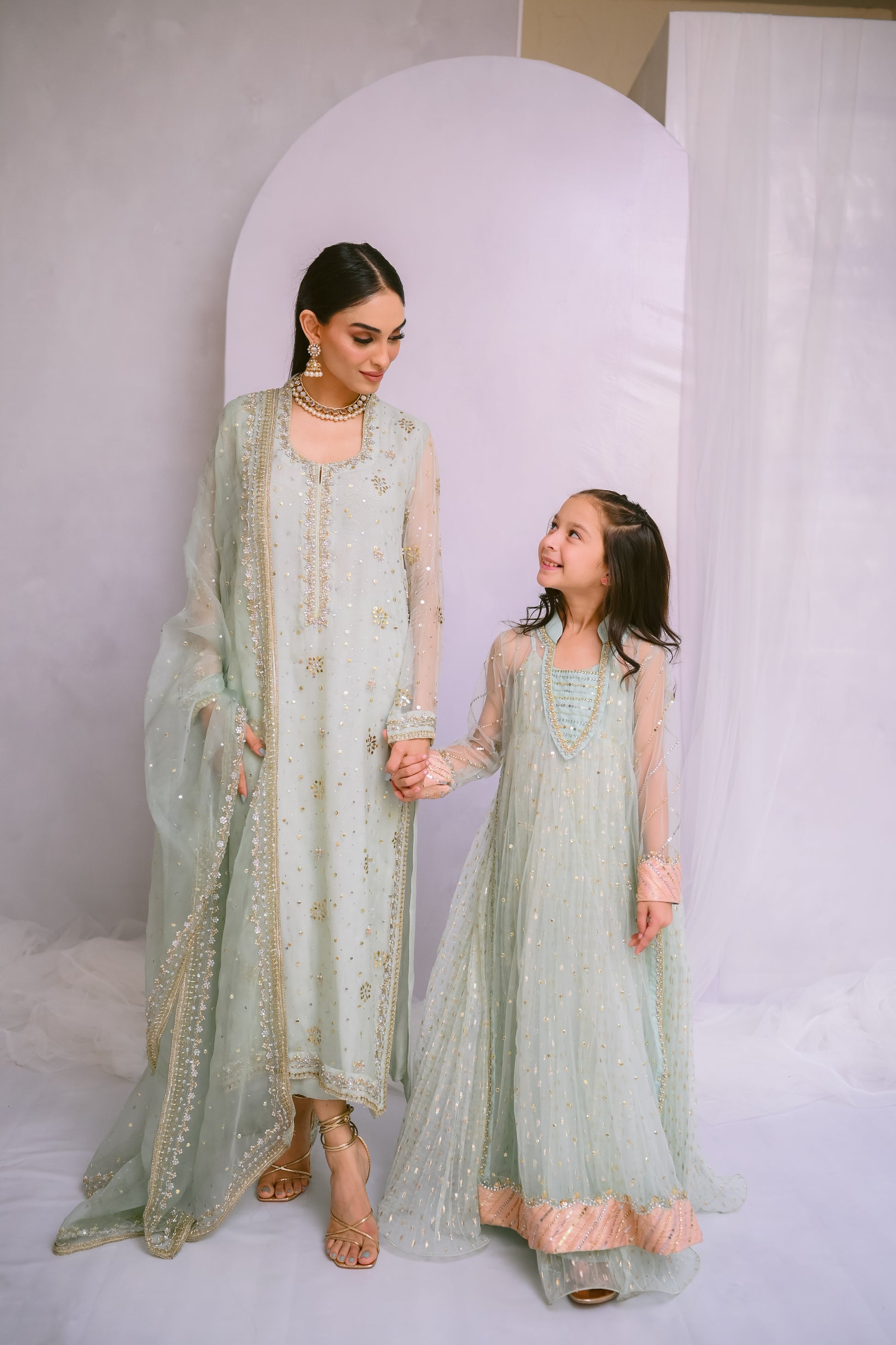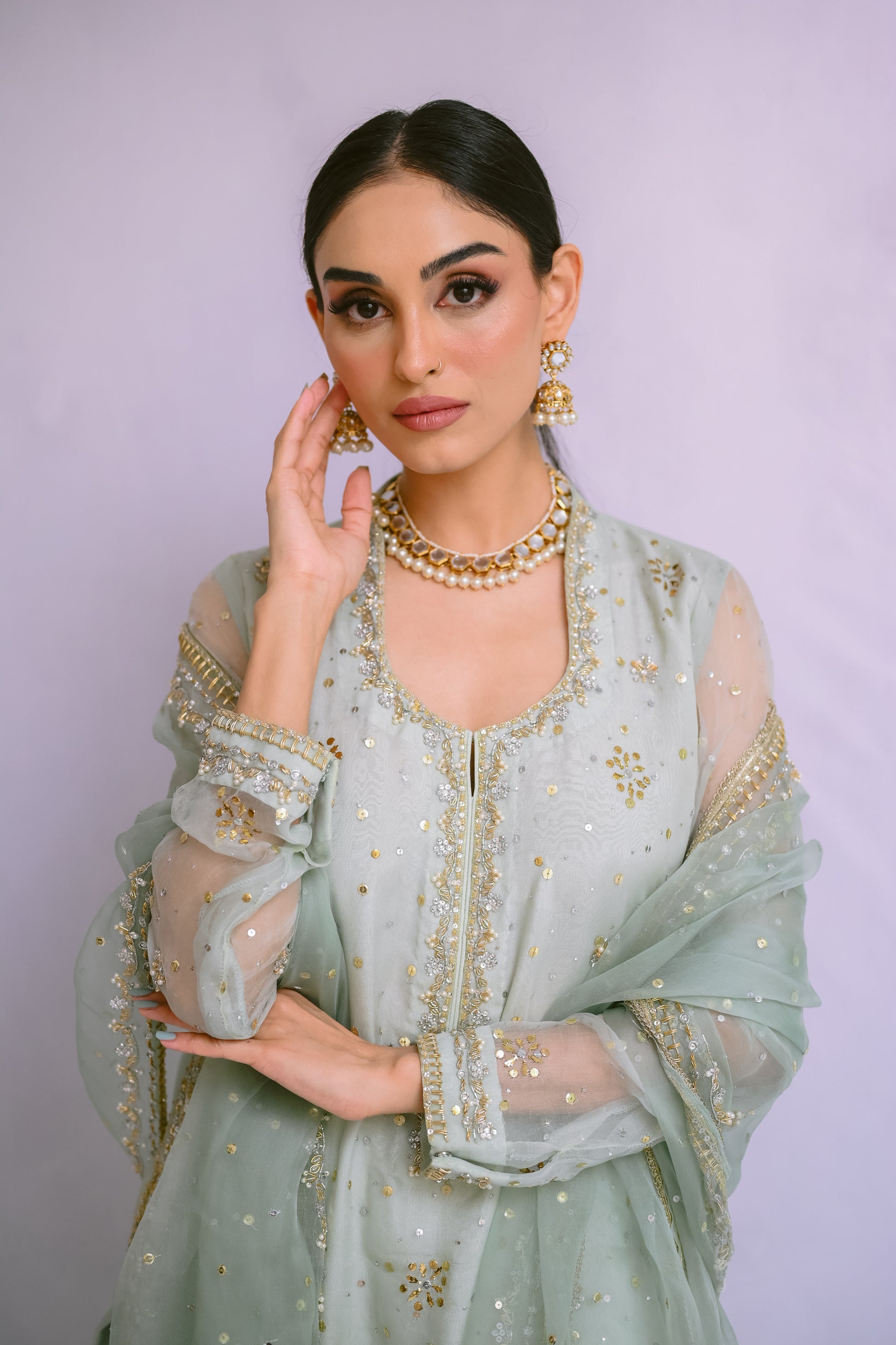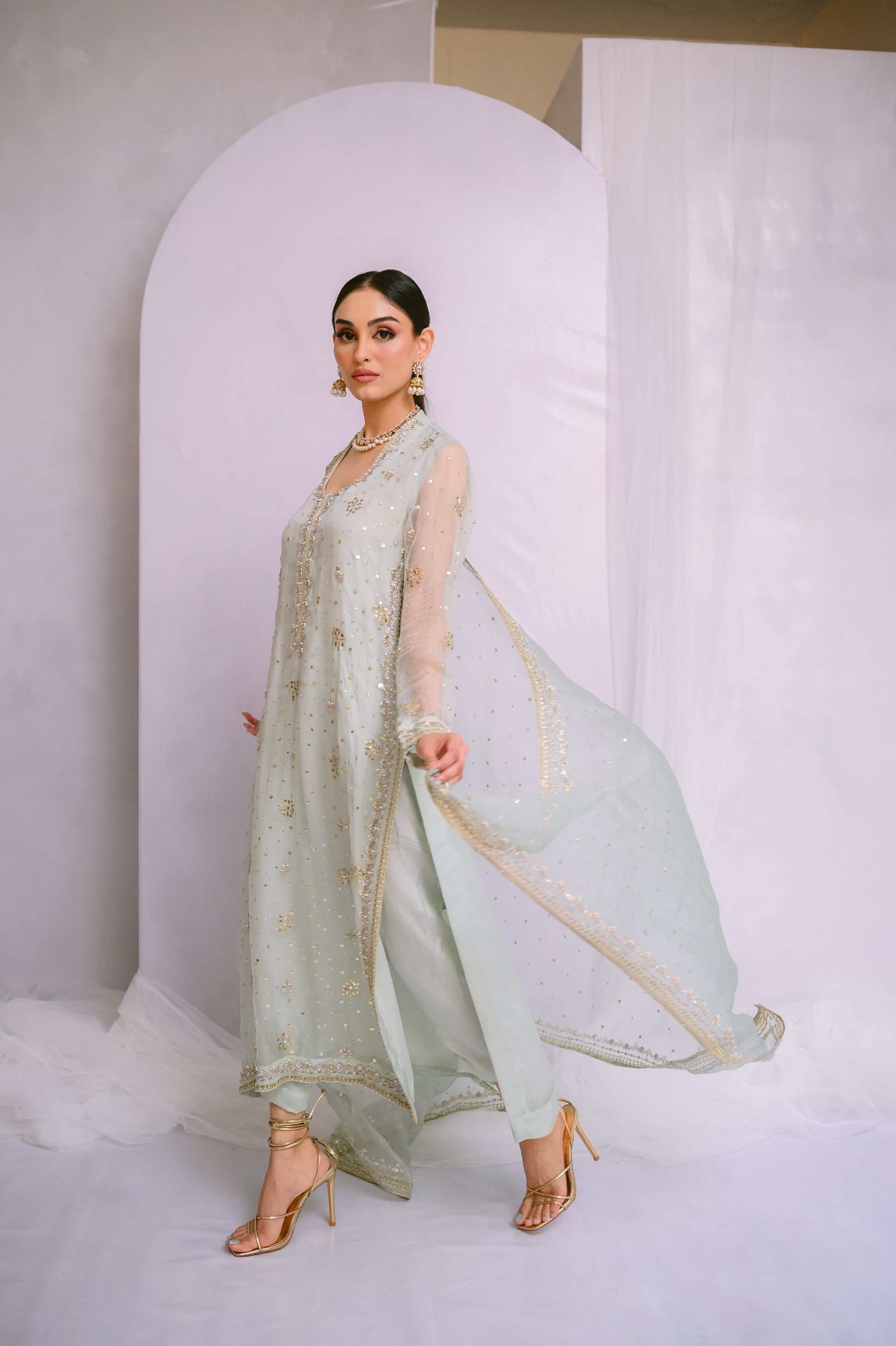 Step into refined elegance with this pure organza long shirt, adorned with exquisite Kamdani, sequins, dabka, and stone work. Complemented by a matching organza dupatta with intricately hand-worked borders, this ensemble embodies timeless grace and sophistication.