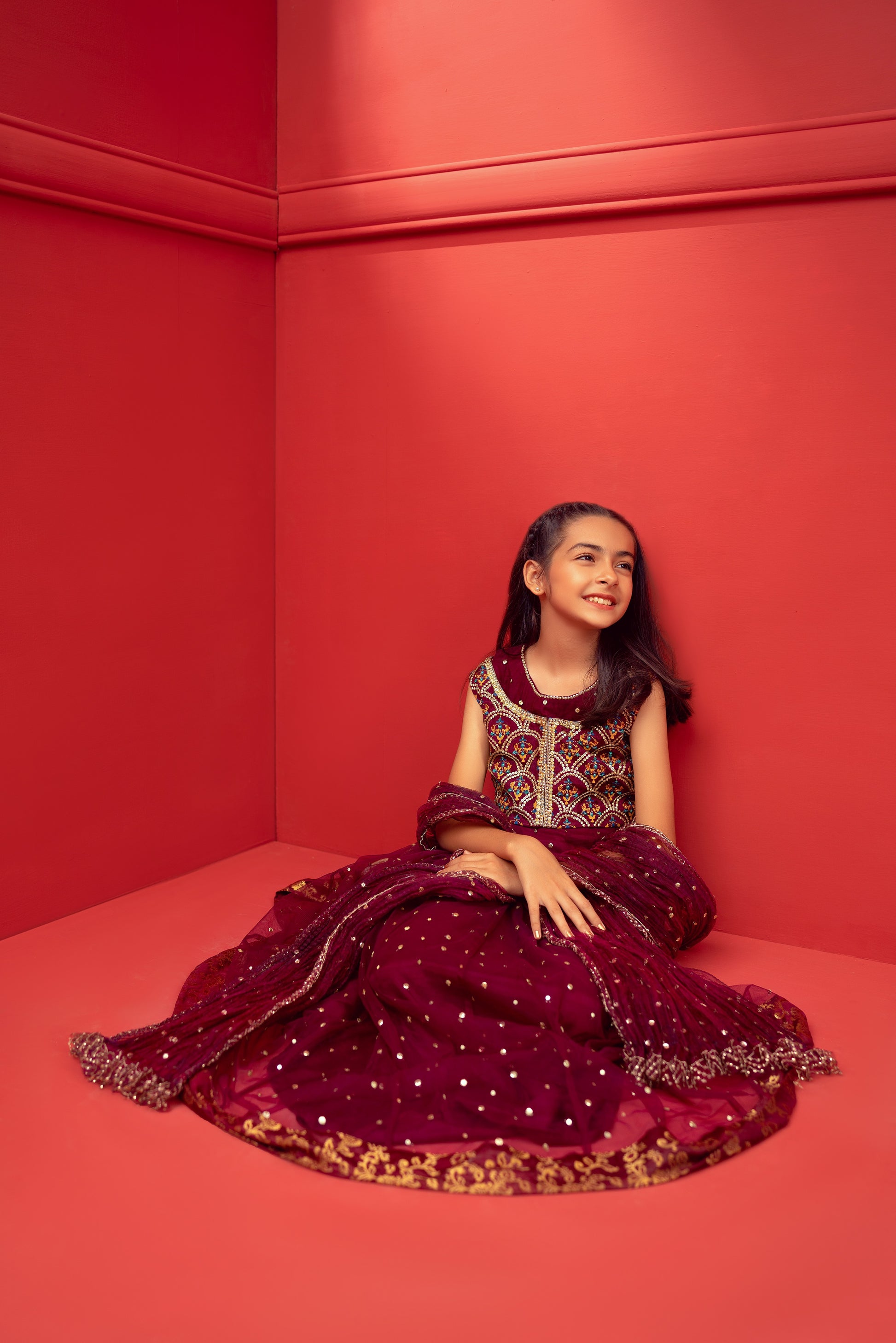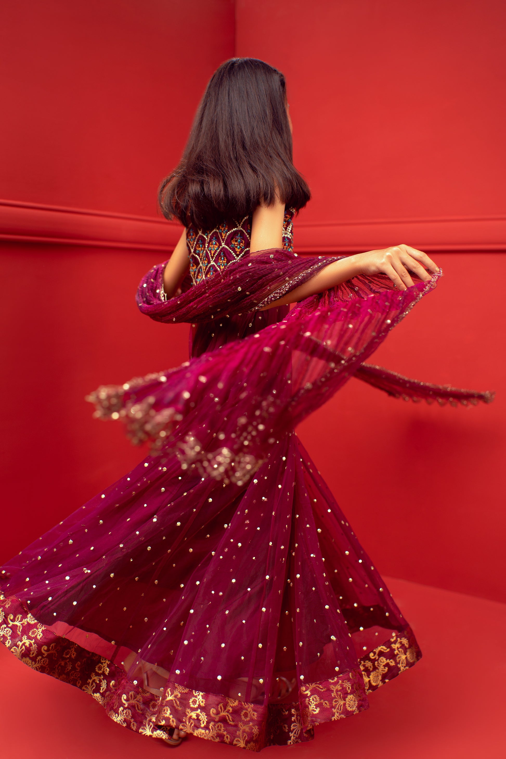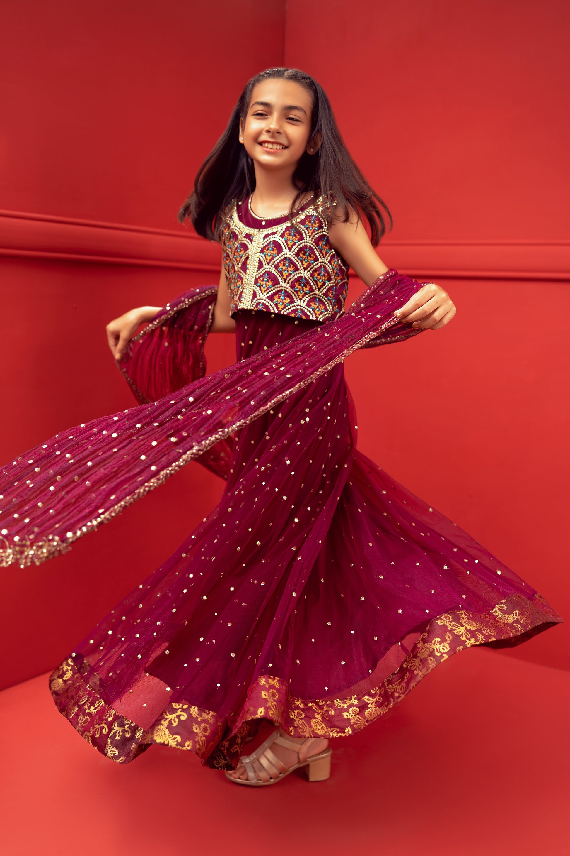 Embrace elegance with our mystic maroon net flair adorned with intricate sequins and finished with beautiful banarsi borders. Paired with a stunning block printed choli featuring heavy sequin work, this ensemble is sure to make heads turn. To complete the look, we have included an ethereal organza crush dupatta with charming Chan detailing. This outfit is perfect for girls who want to make a statement at any special occasion.