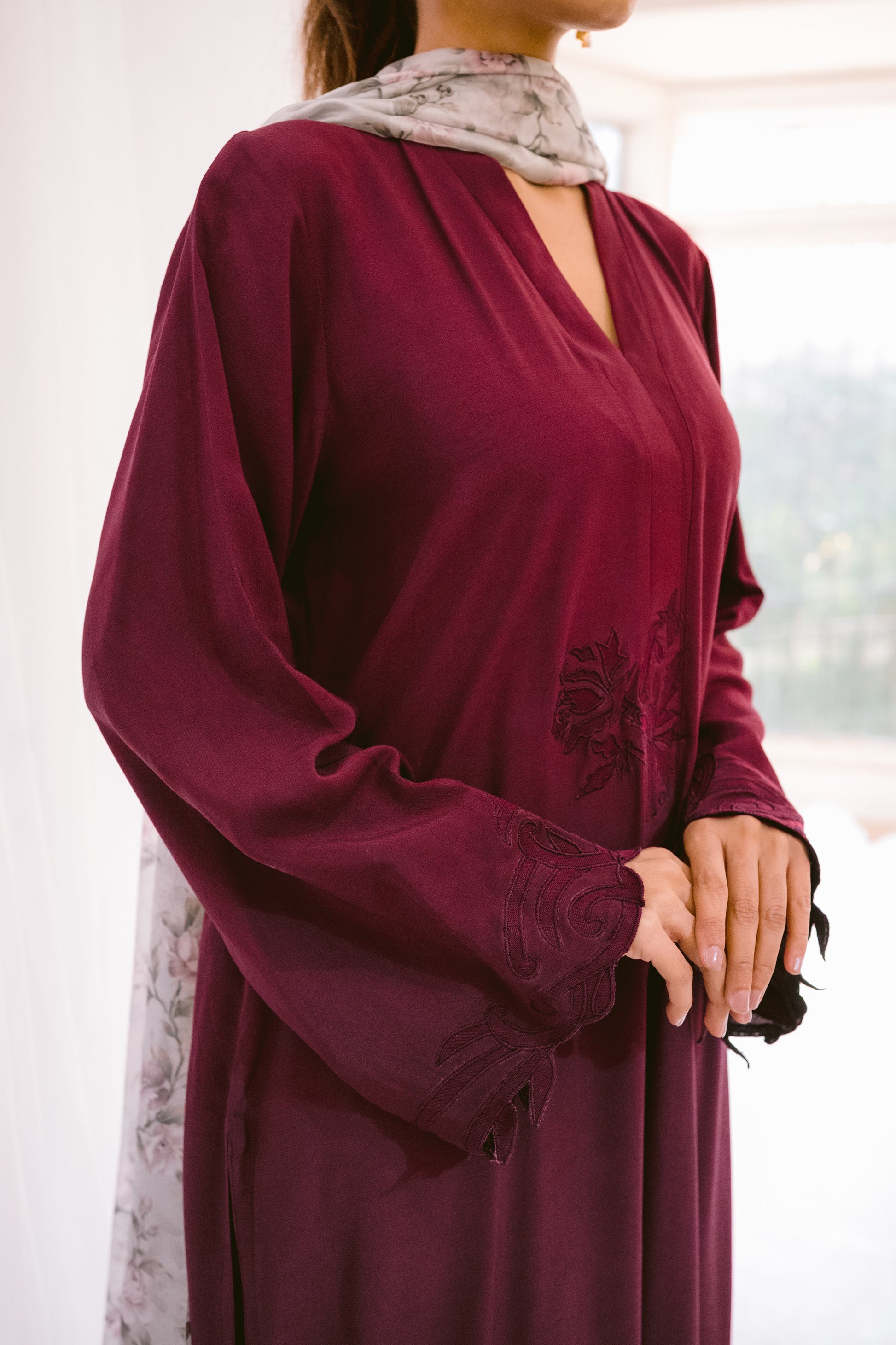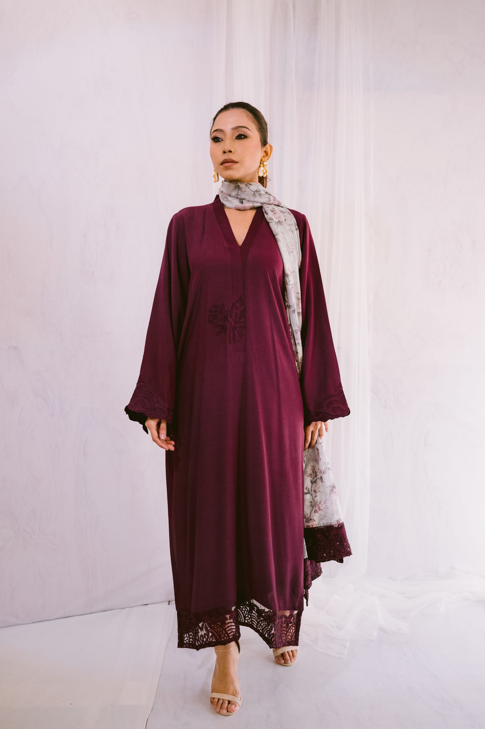 This elegant cotton crepe ensemble features intricate appliqué detailing on the sleeves, neckline, and back. It's paired with a printed silk dupatta, adding a touch of sophistication. Perfect for special occasions, this outfit blends traditional craftsmanship with modern style