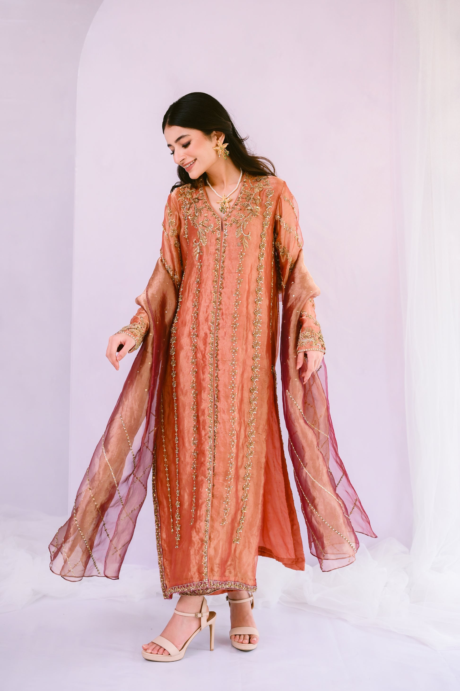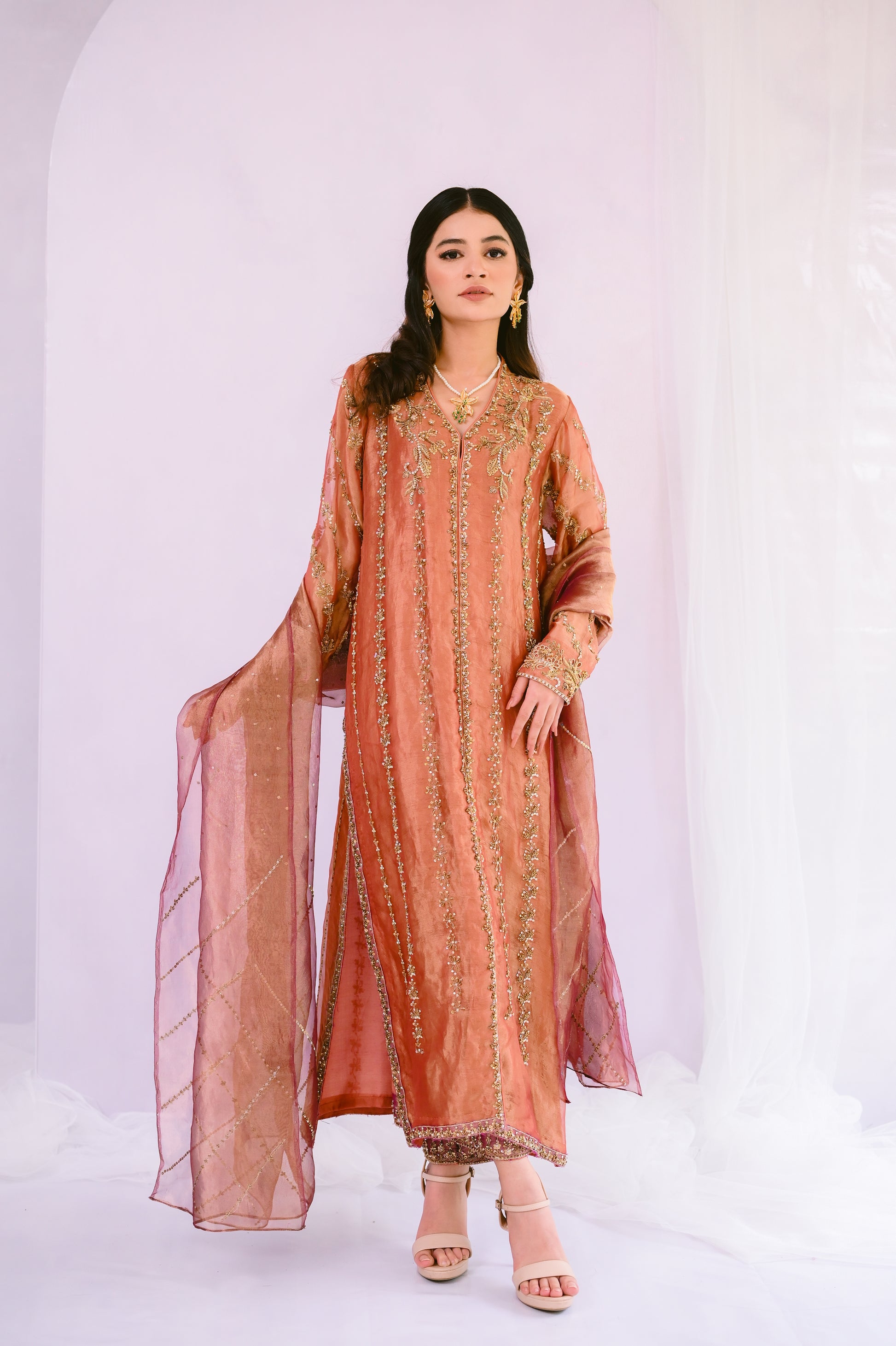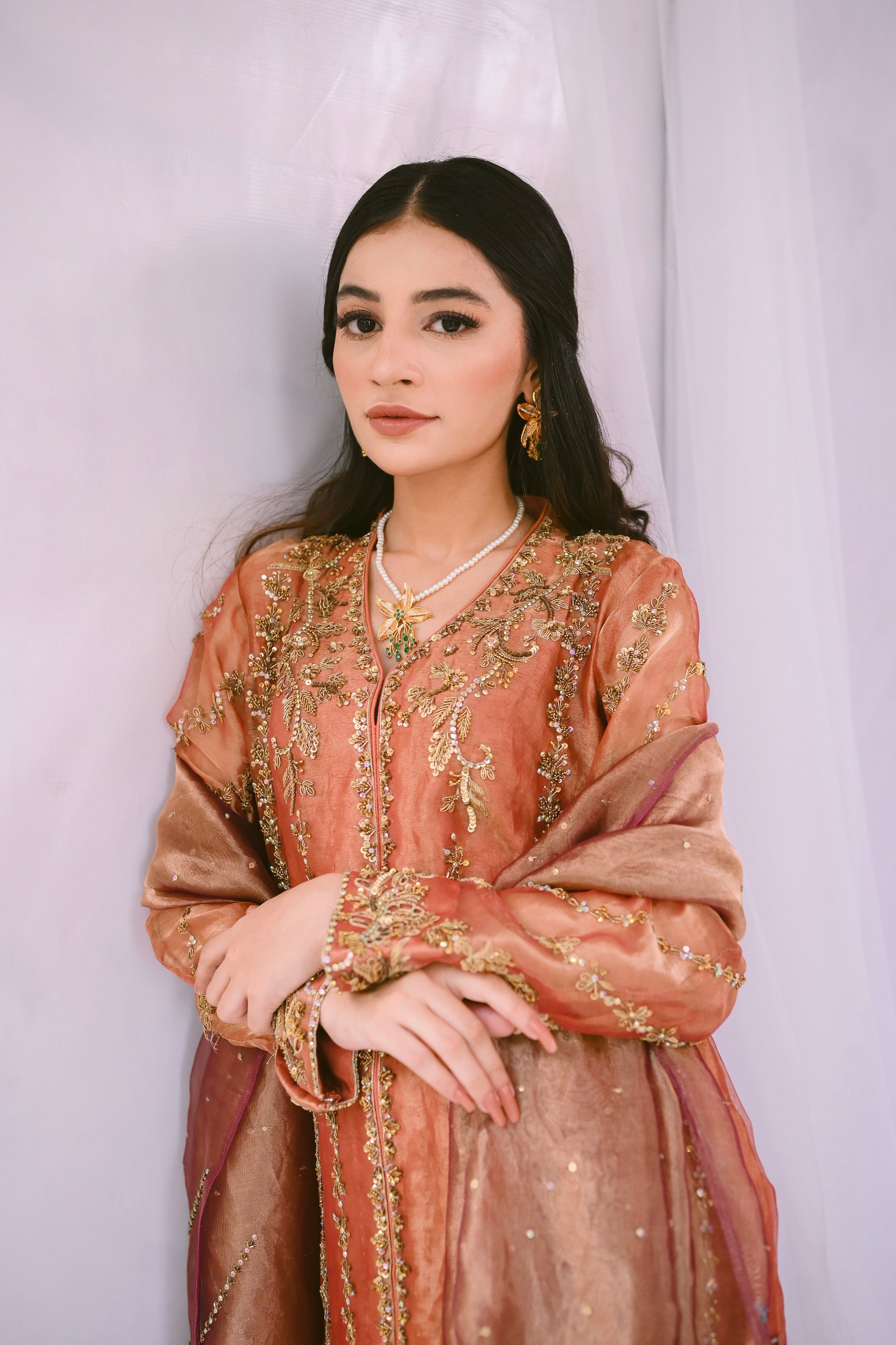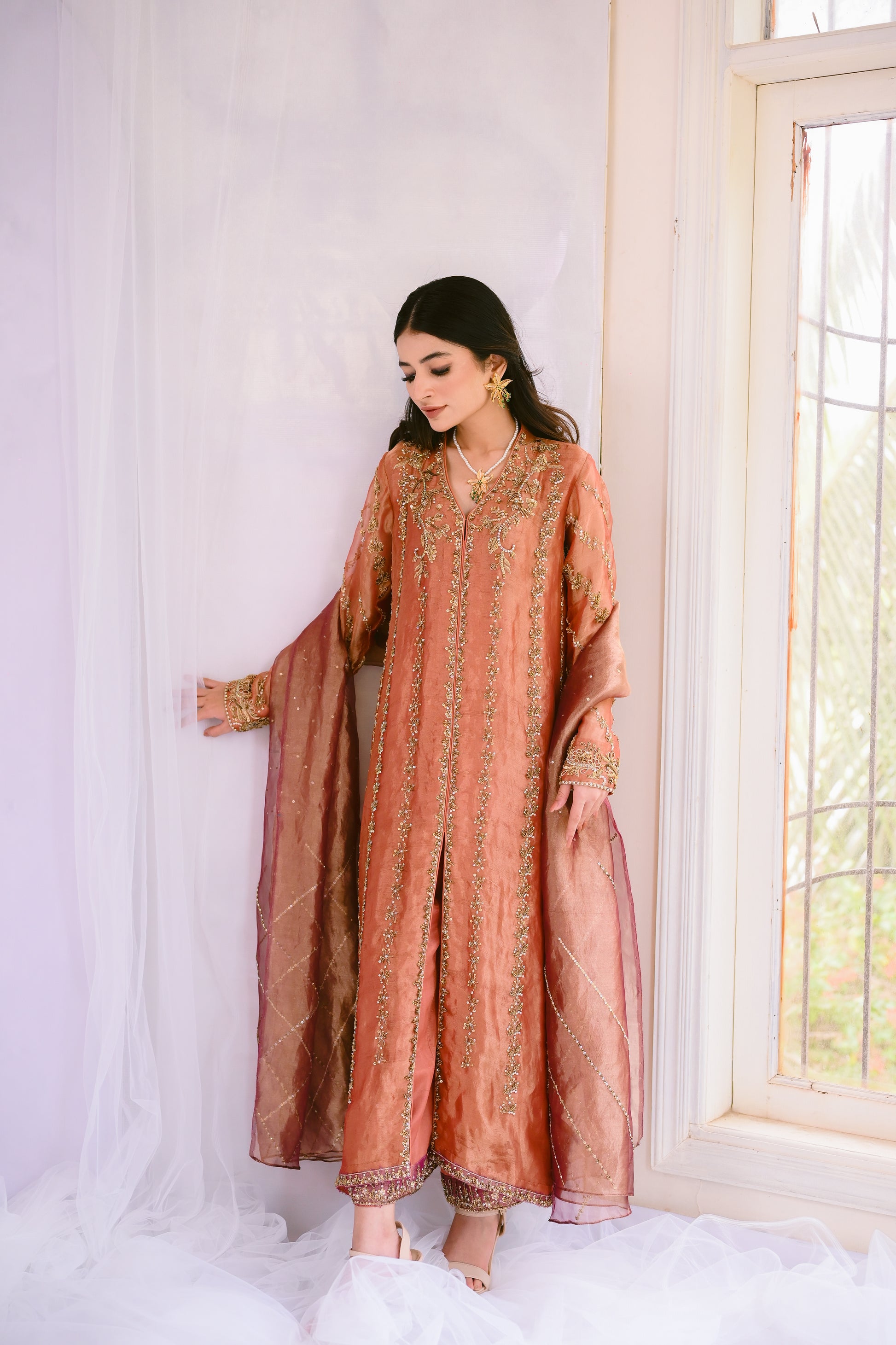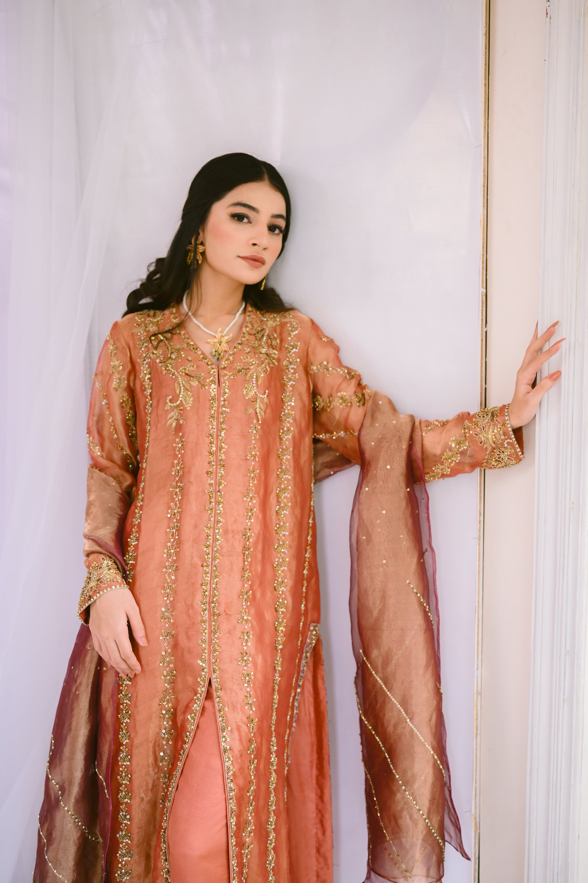This pure tissue organza front open shirt showcases elaborate Zardozi work for a touch of grandeur. Paired with a magenta pure tissue organza dupatta and silk culottes with hand work, it exudes both elegance and sophistication. Ideal for special occasions, it combines traditional artistry with modern luxury