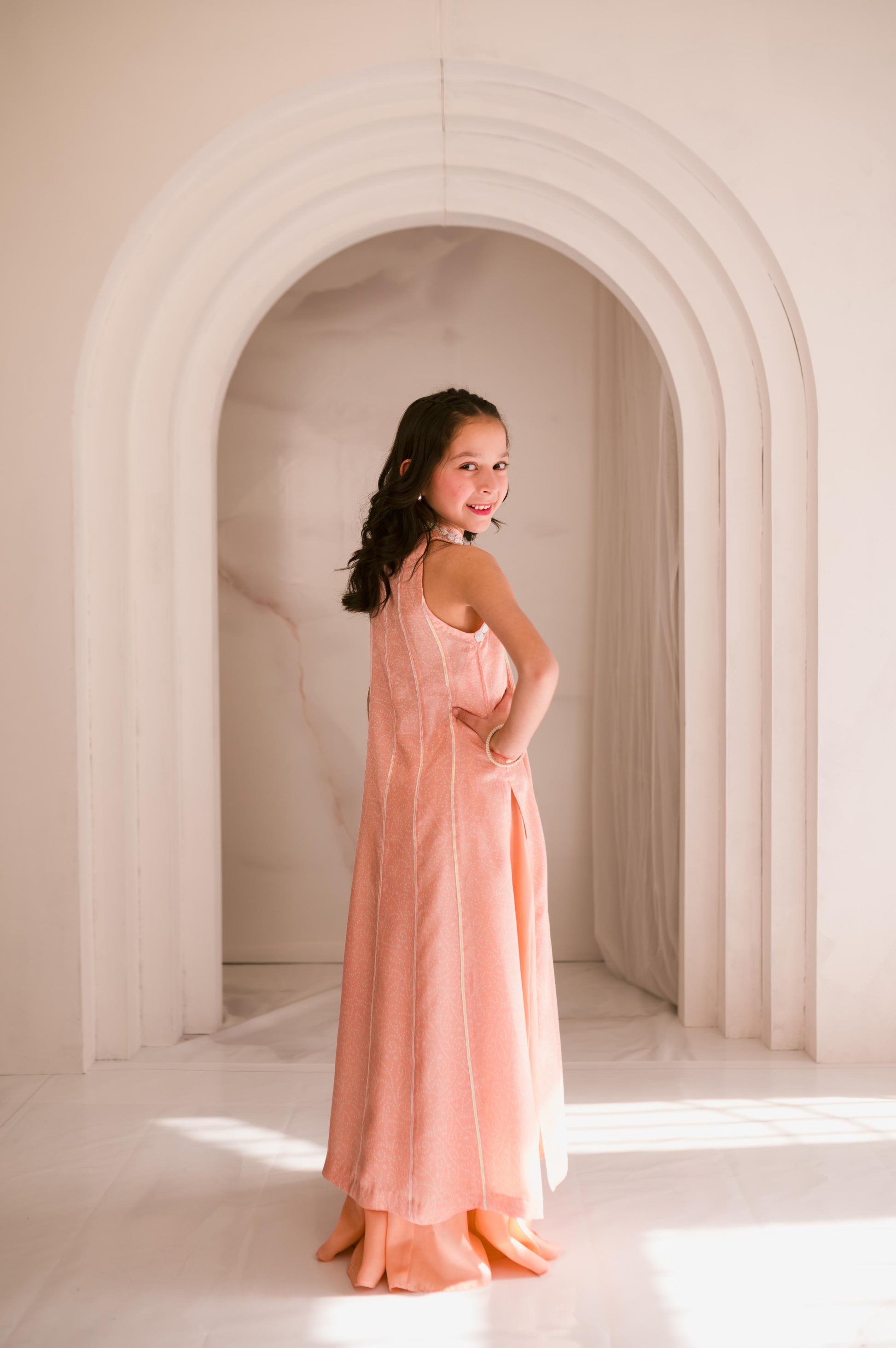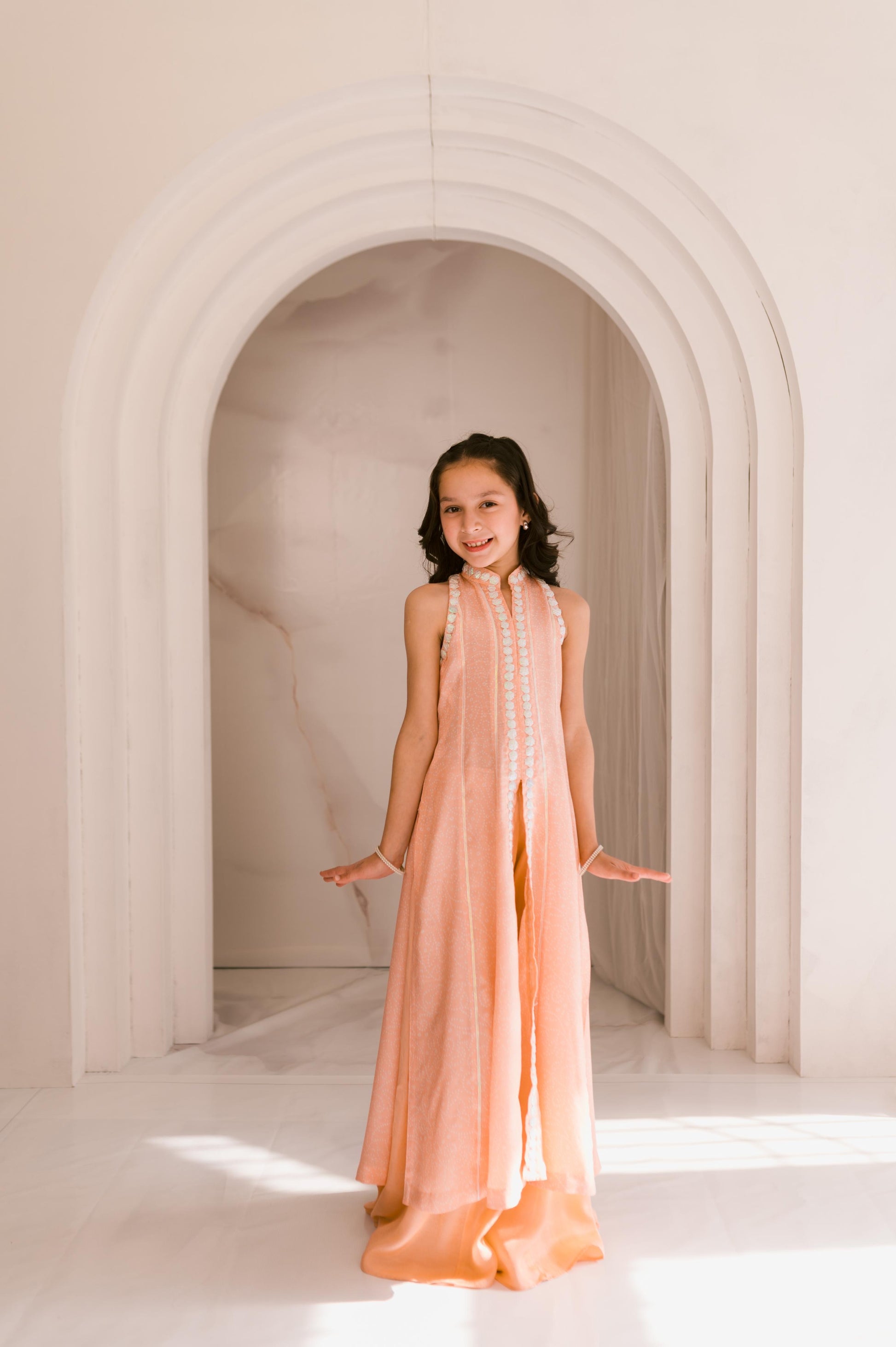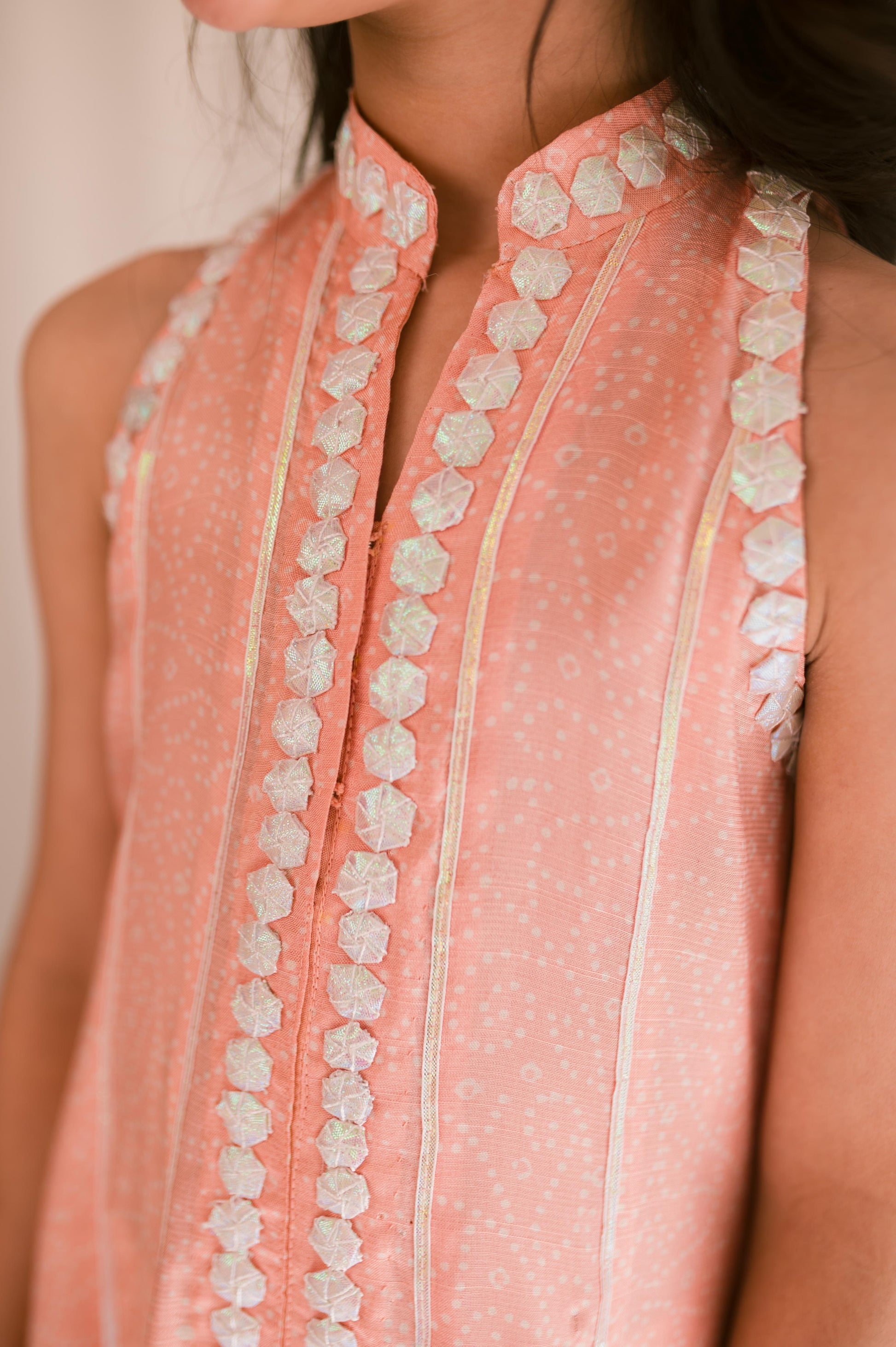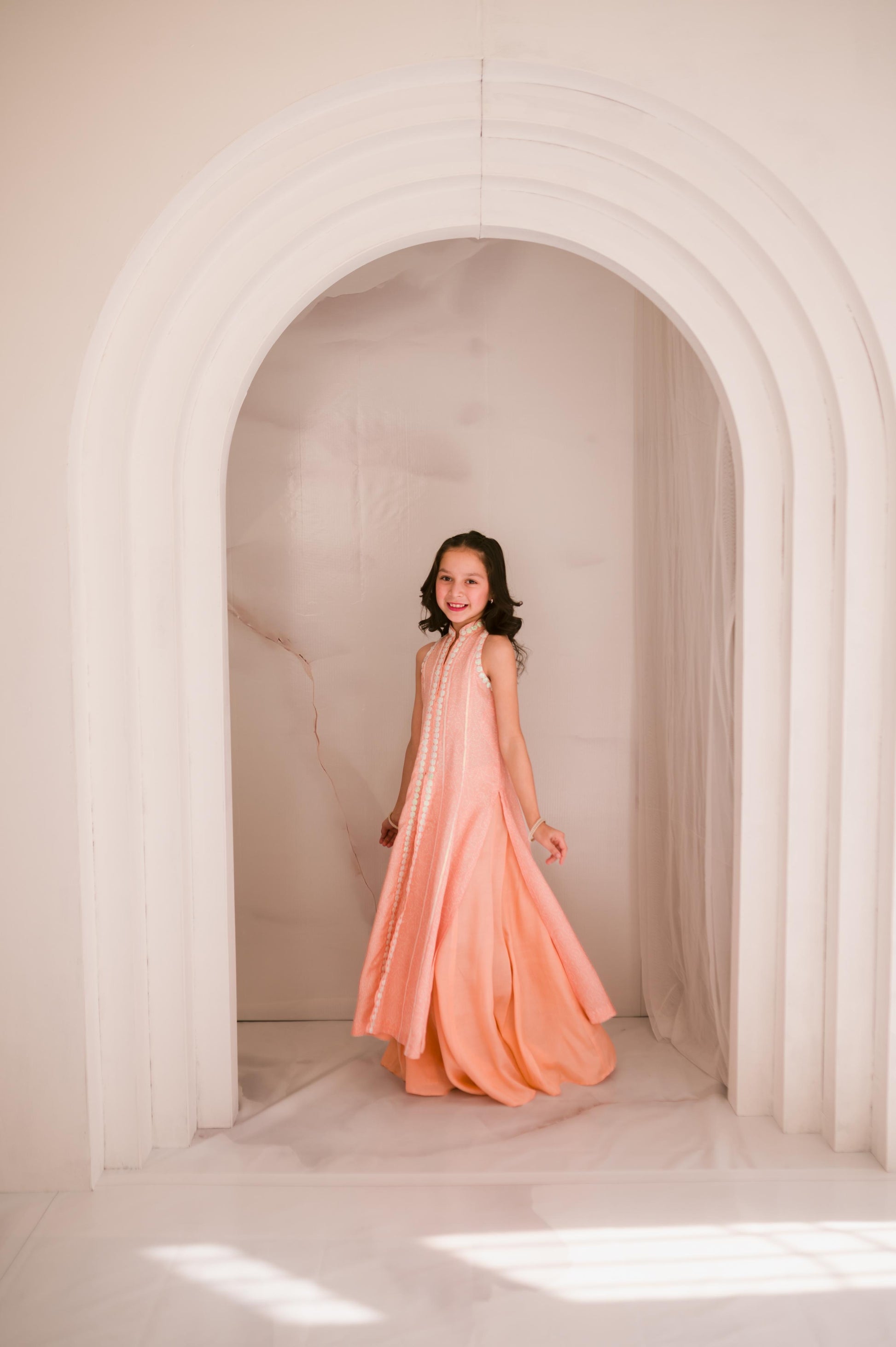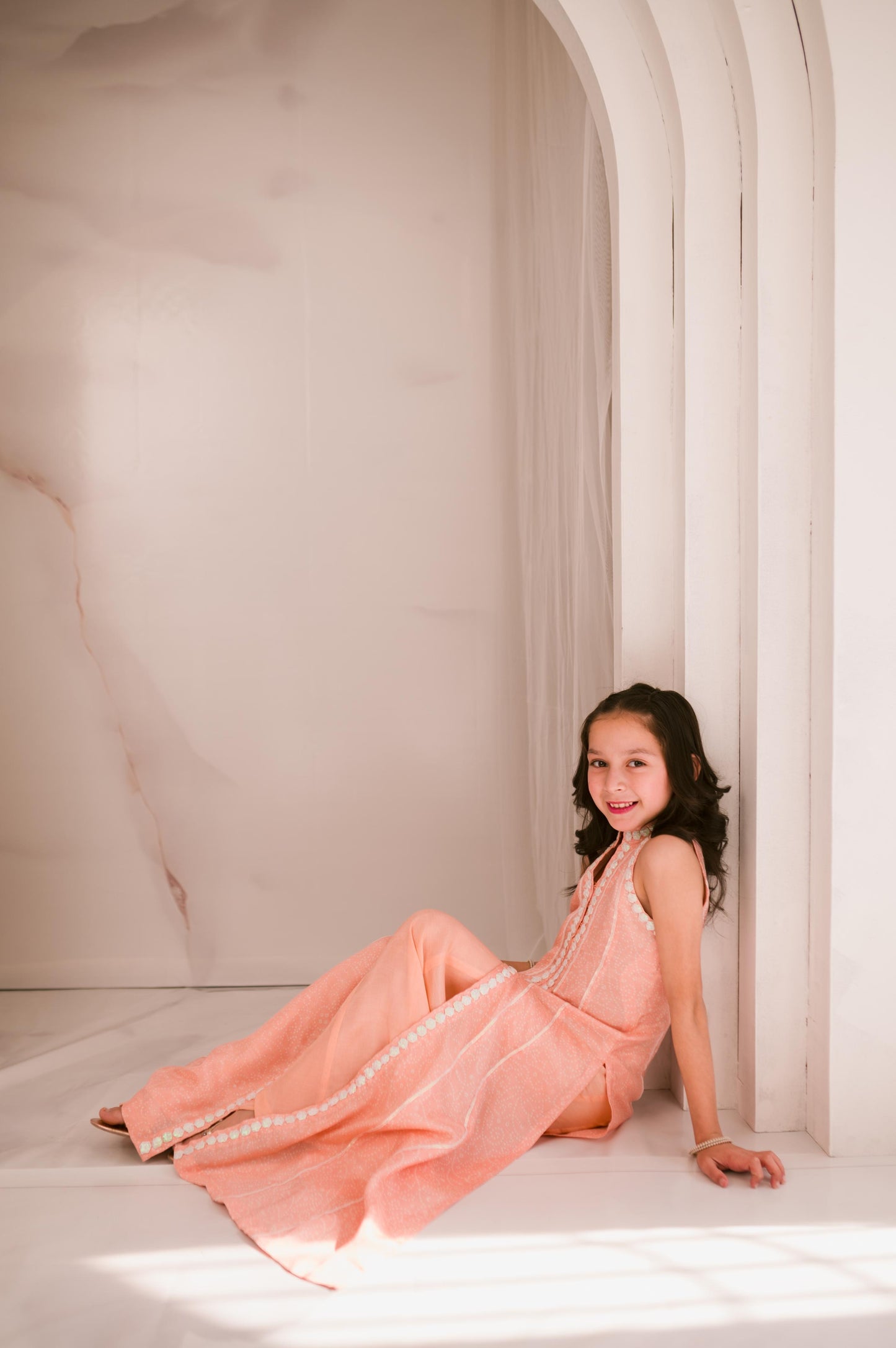 Elevate your Eid wardrobe with our enchanting block-printed silk front-open shirt, perfectly paired with stylish Dhaka pants. Crafted for comfort, this flowy and breathable ensemble features exquisite Gota work, adding a touch of elegance to any festive occasion. Ideal for young girls seeking a dreamy and sophisticated look, this outfit combines tradition with contemporary style for a memorable celebration.