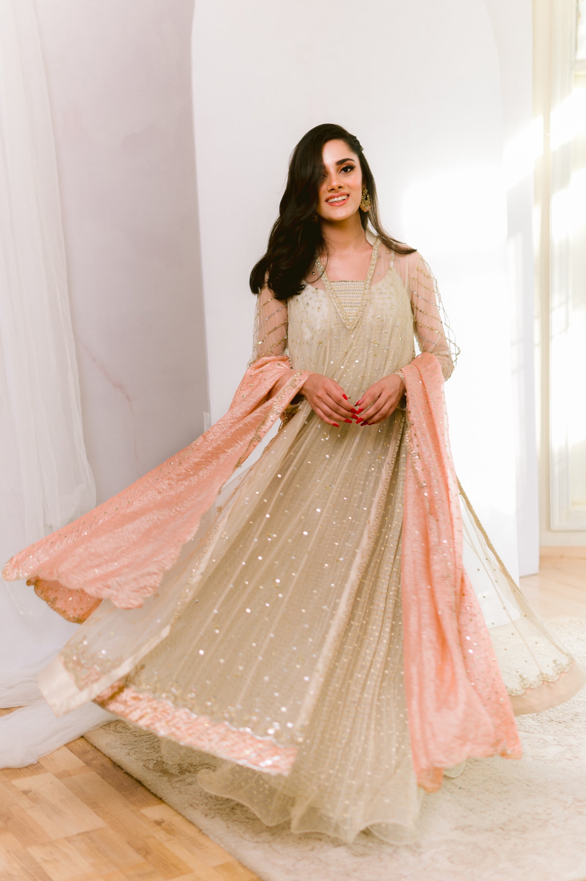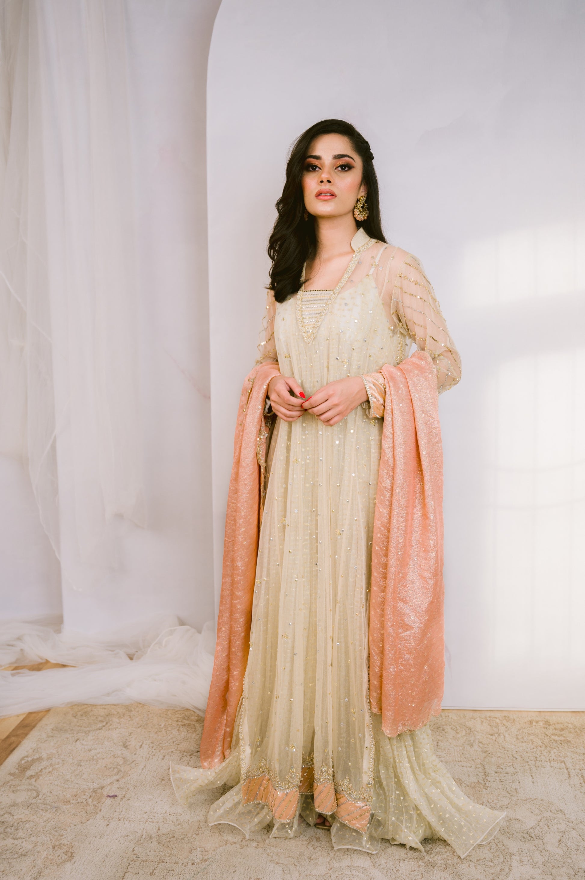 The outfit will be delivered in 5-6 weeks. For urgent delivery you can send us a request via email or WhatsApp. All purchases are non-refundable; there is no provision for returns if the product matches the picture.
