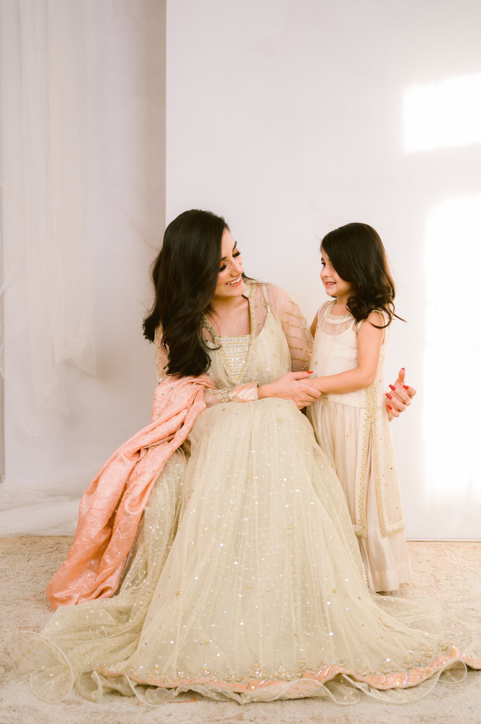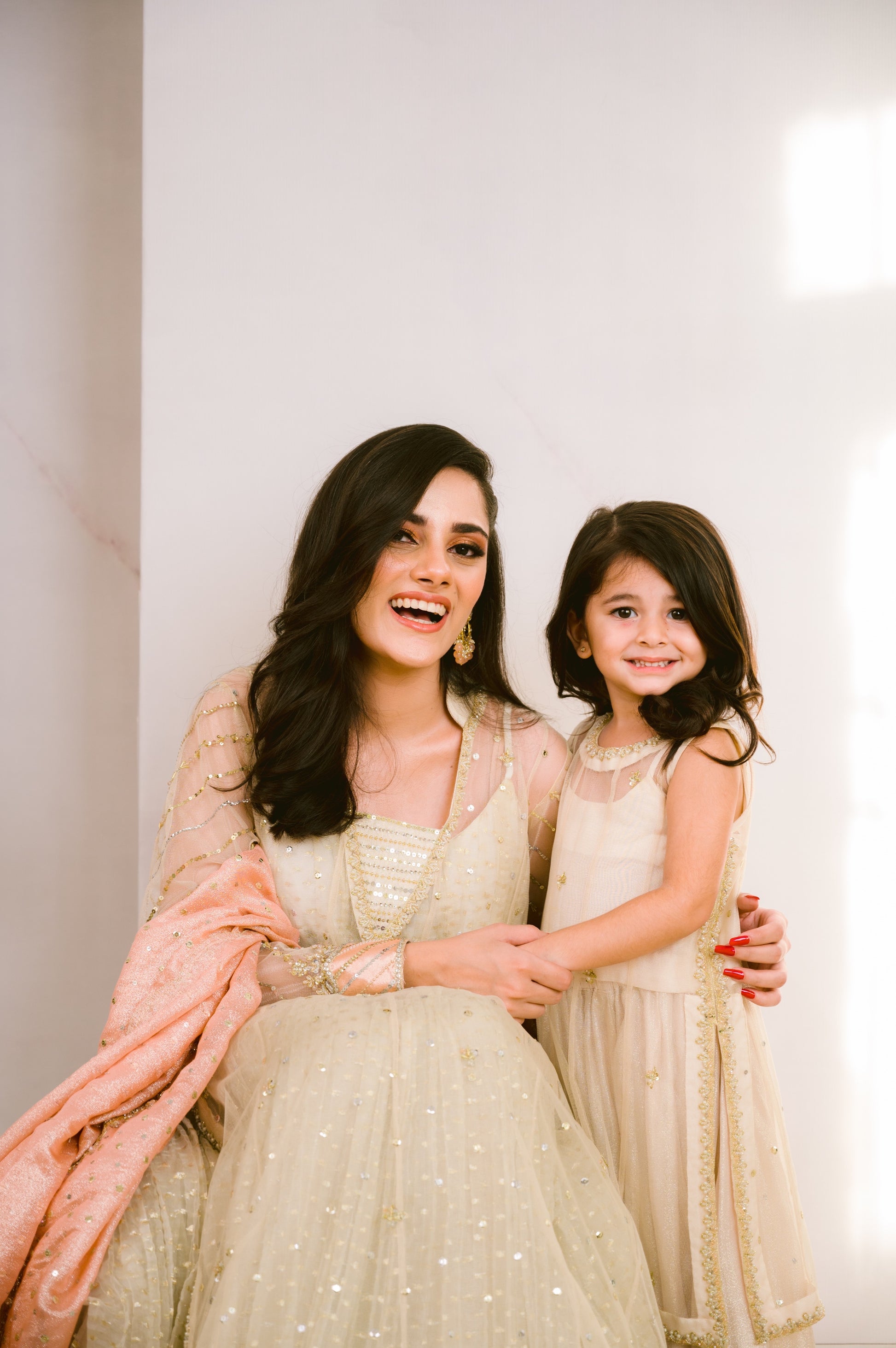 Beautiful and stylish Mommy and Me Off-White Net A-line Flair dresses with exquisite handwork details. Crafted with love and attention to detail, these dresses are perfect for creating unforgettable mother-daughter twinning moments. The delicate off-white net fabric adds an elegant touch, while the A-line flair design ensures a flattering fit for both mom and daughter. With intricate handwork embellishments, these dresses are sure to make both of you shine on any special occasion.