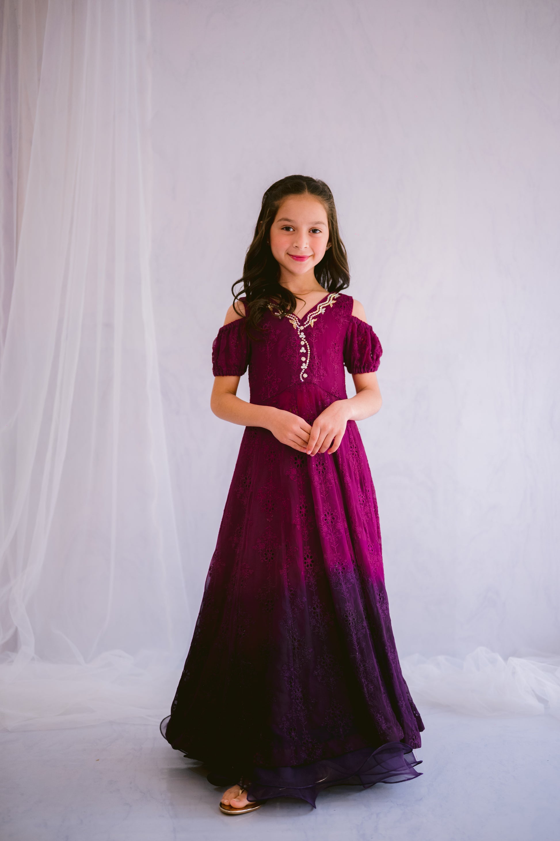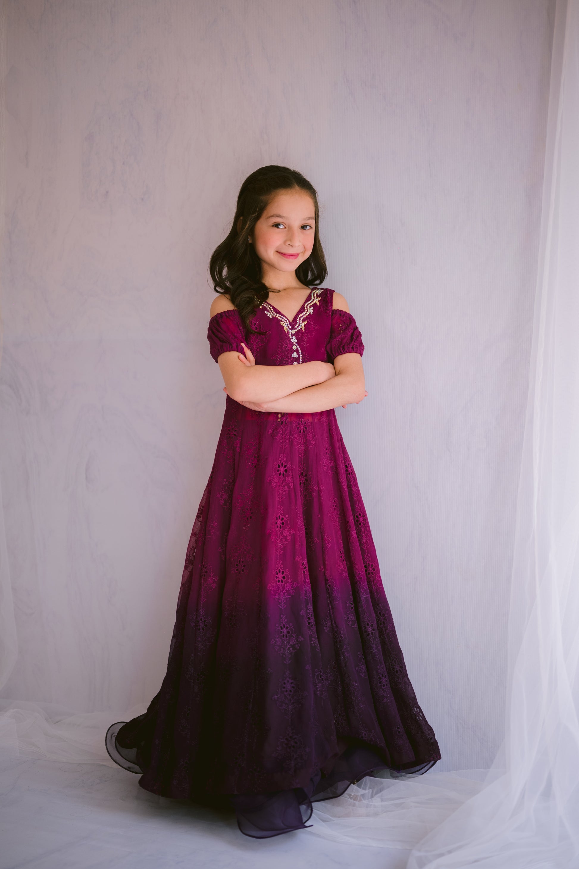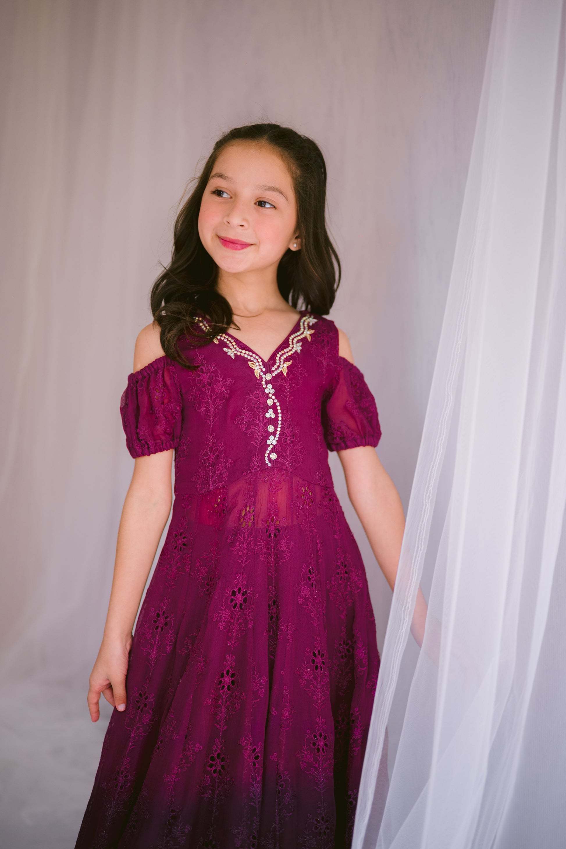 Indulge in sheer elegance with our chicken chiffon shaded flair ensemble, adorned with intricate handwork on the neckline and sleeves. Paired with silk sharara with frills.
