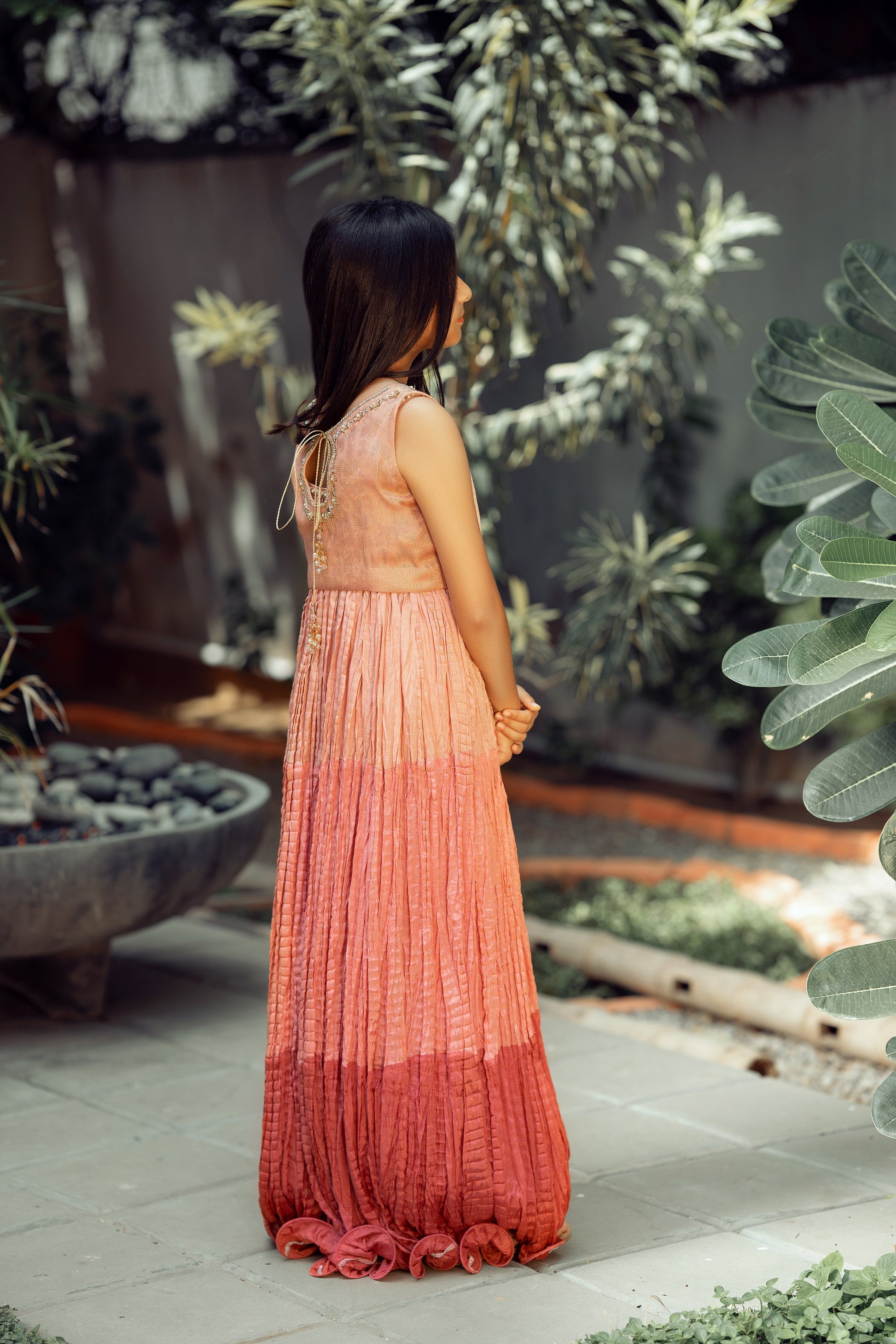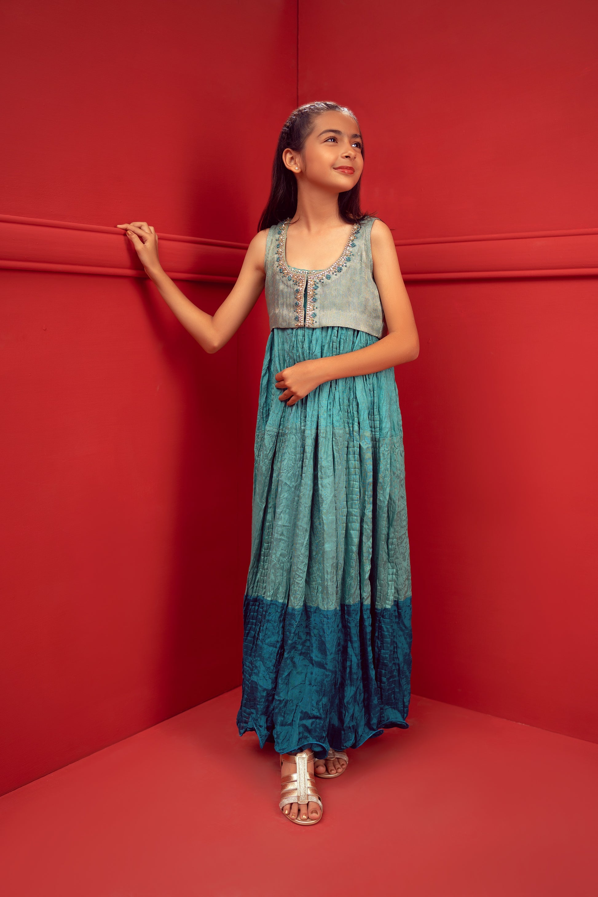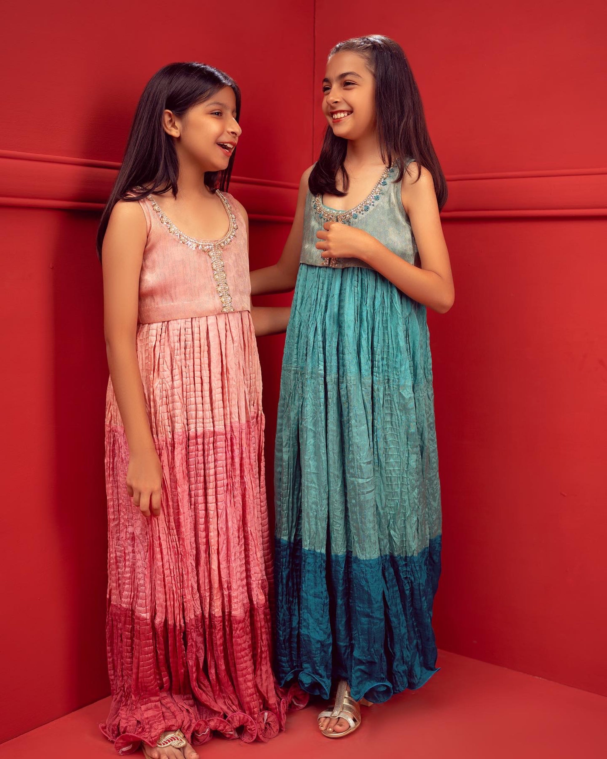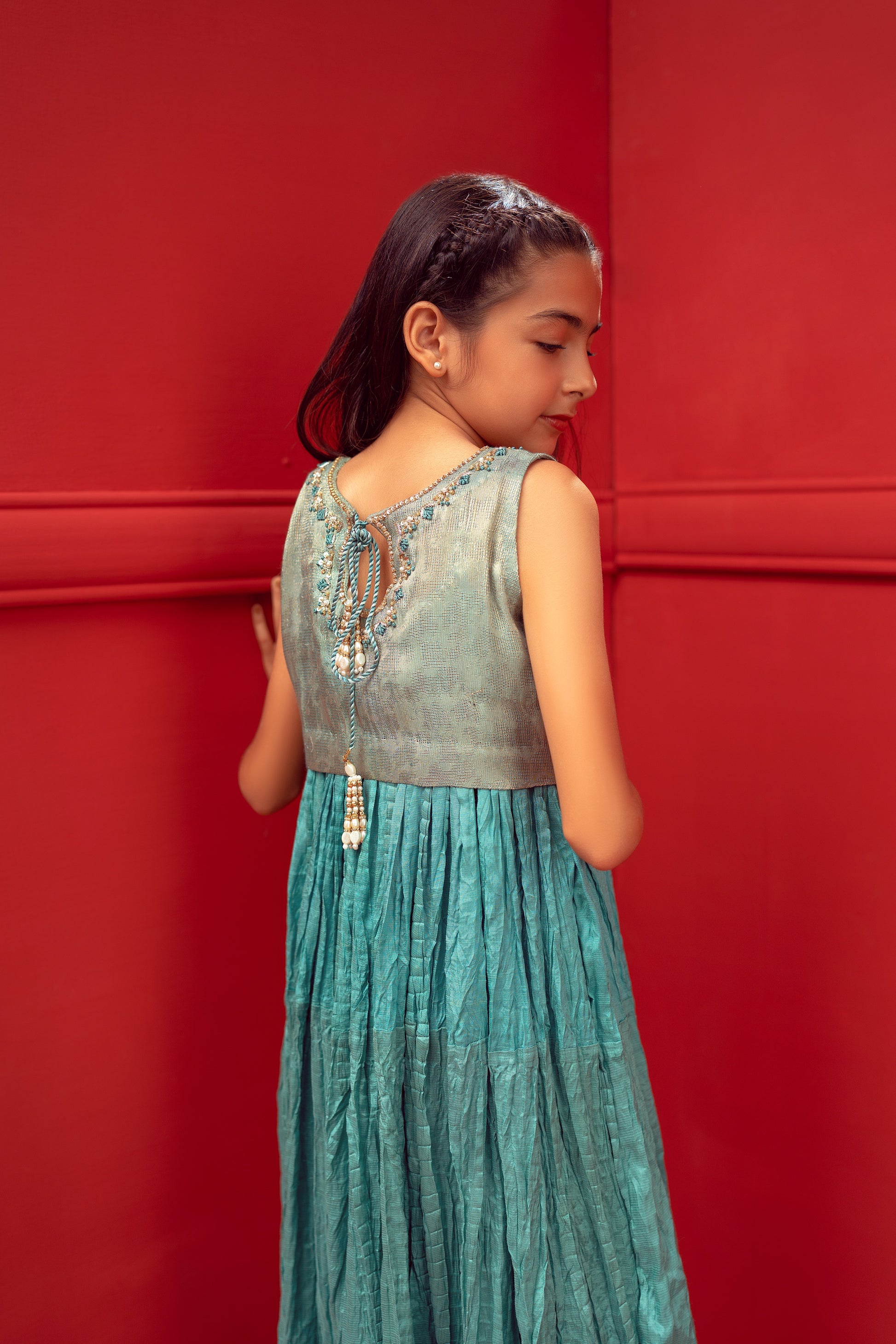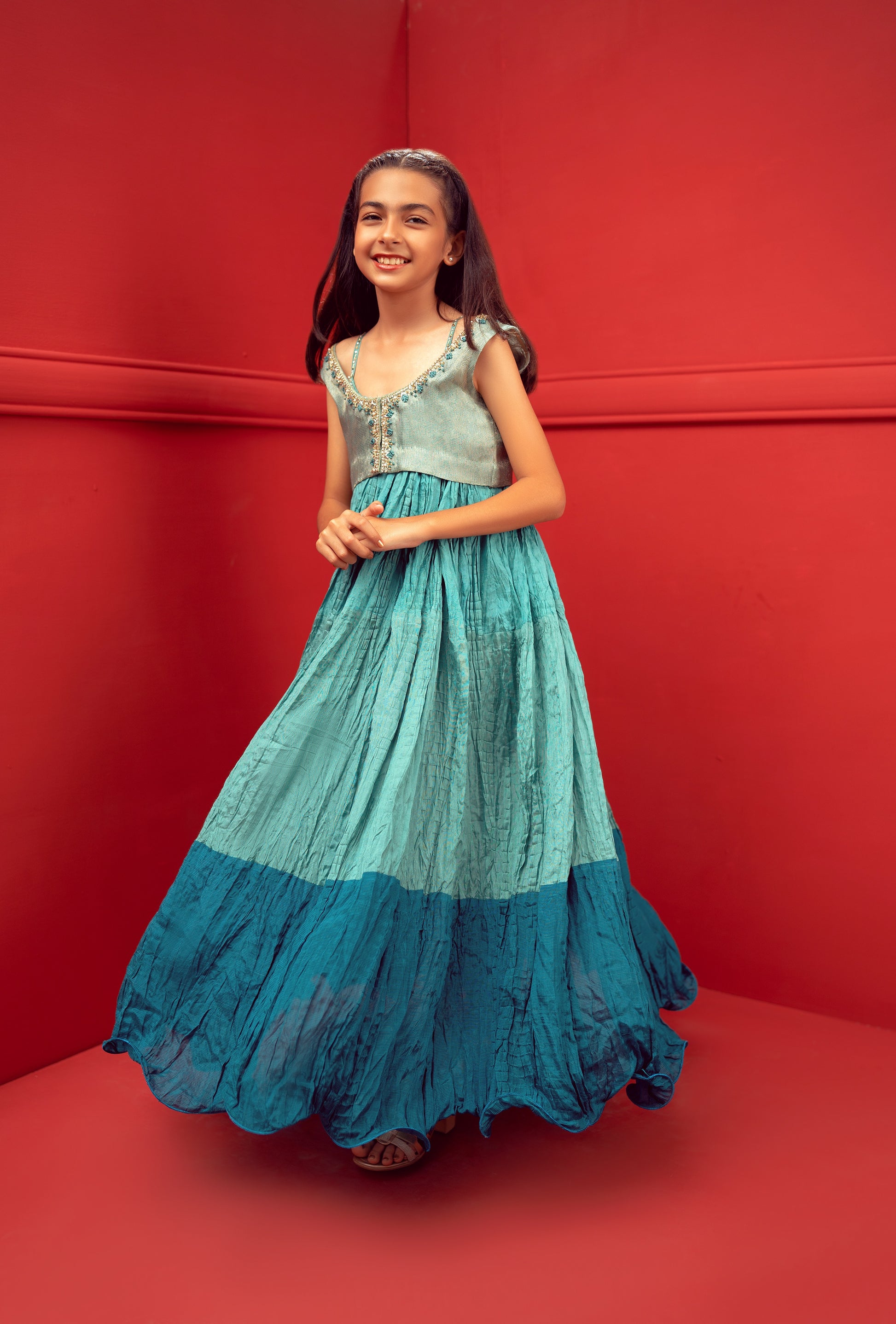 Stunning formal 3 tone crushed flair for girls! Made with textured maisoori fabric, this choli is perfect for special occasions and celebrations. The choli features beautiful handwork on the front and back, adding a touch of elegance to the overall look. The crushed flair design adds a unique and stylish twist, making the outfit stand out from the crowd. Perfect for young fashionistas who want to make a fashionable statement at any event!