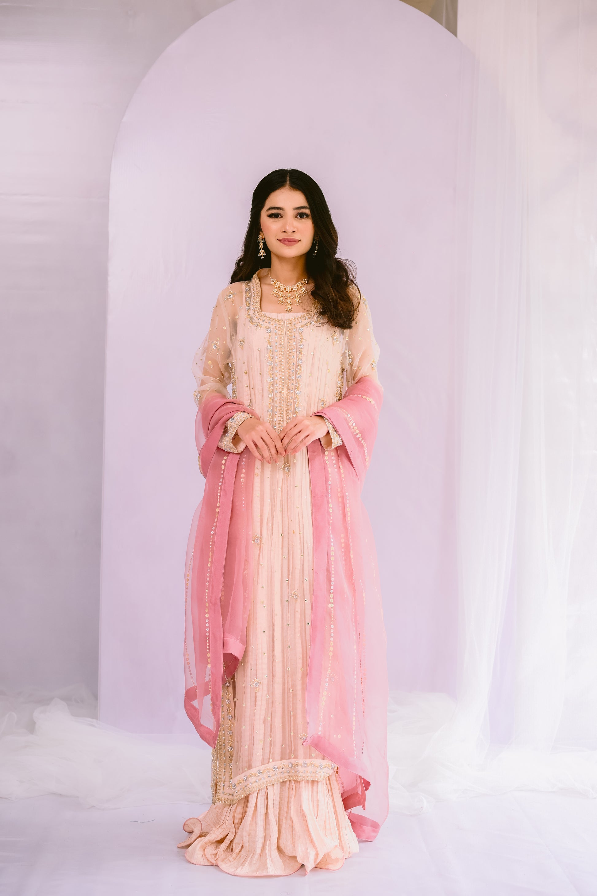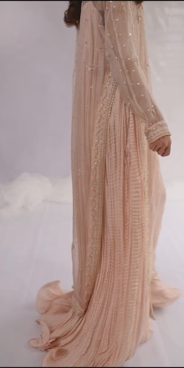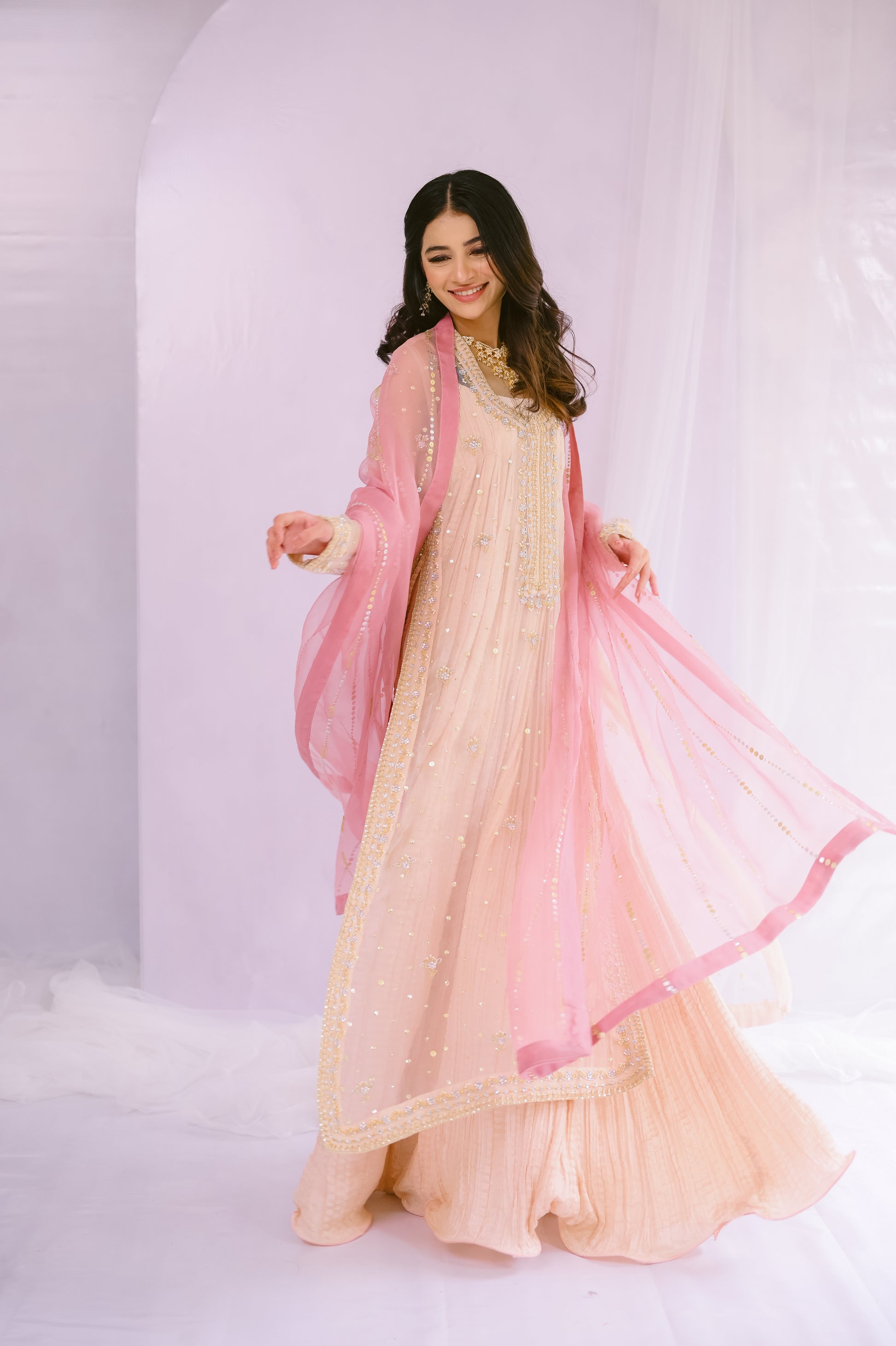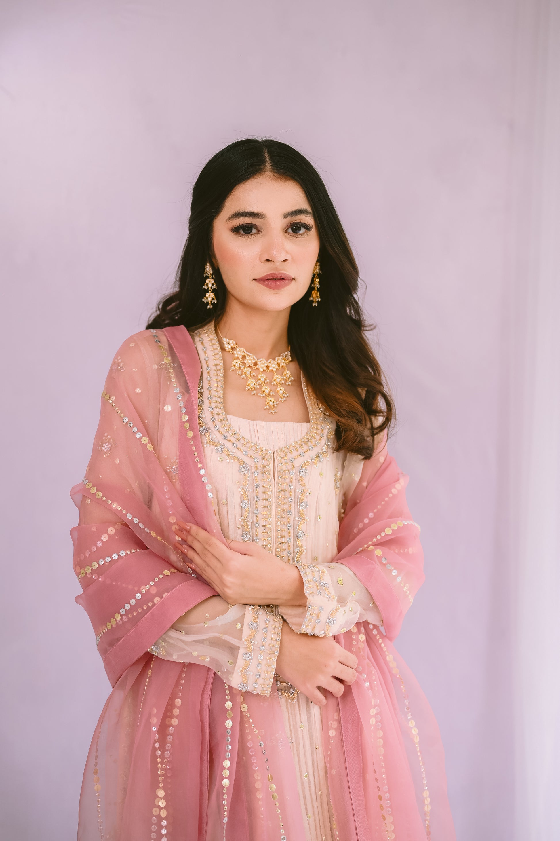 Step into sophistication with our Pure Organza Long Shirt, adorned with detailed Zardozi work. The contrast pure organza dupatta with sequins and a crushed silk inner complete this refined ensemble, ensuring you radiate elegance and grace
